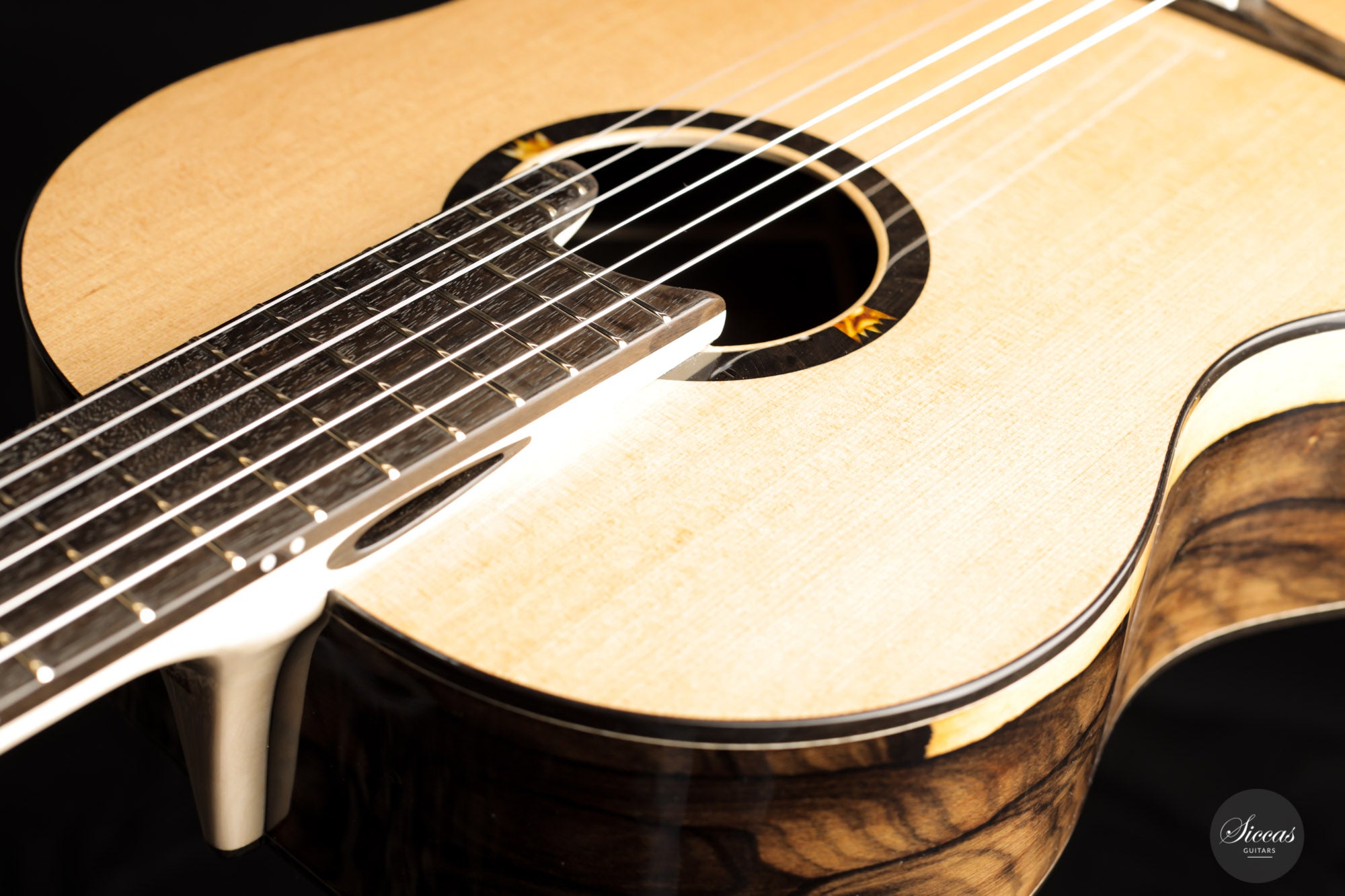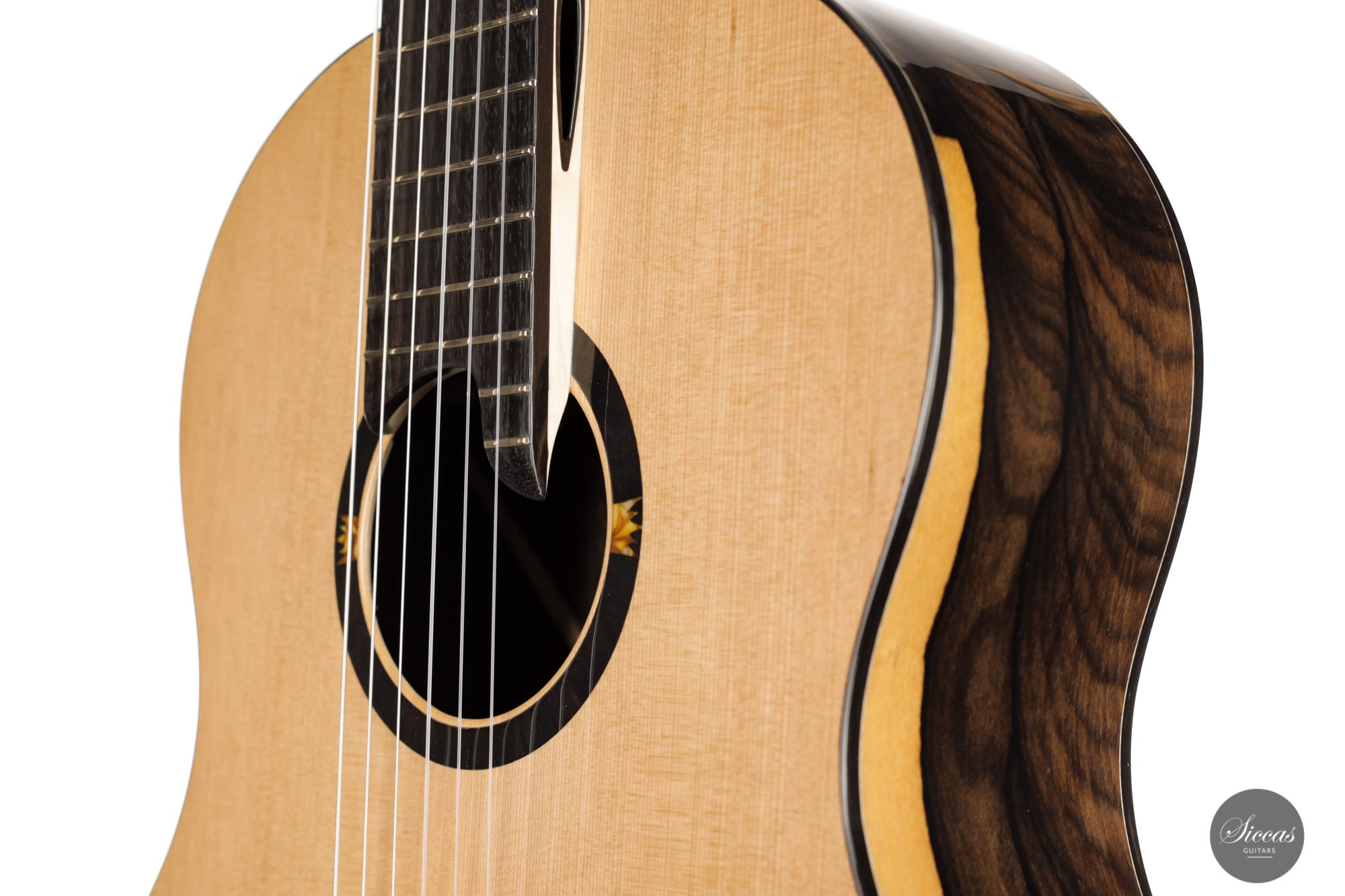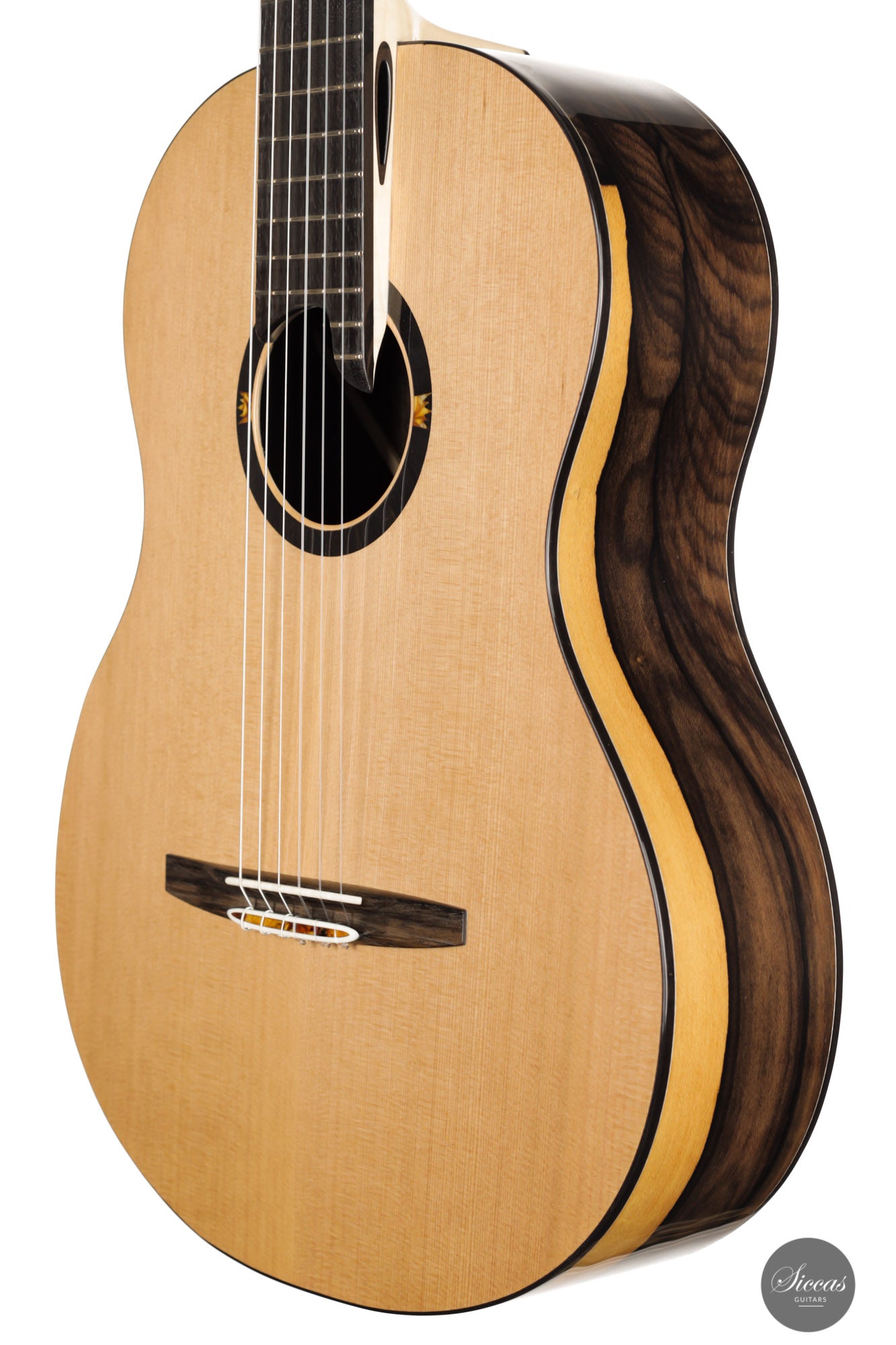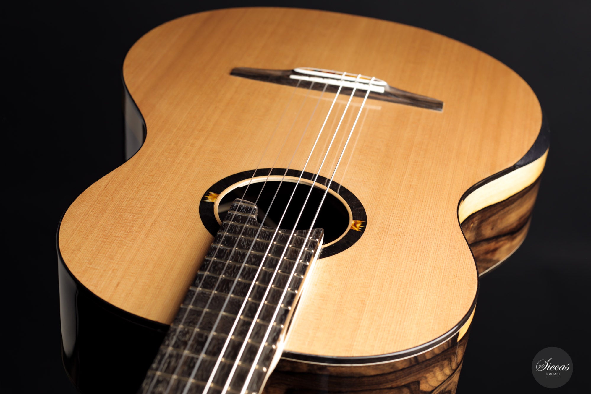 This wonderful instrument is really one of a kind. With a mesmerizing arched back made of Ziricote, giving center stage a wide light sapwood part in the middle, it really has a unique look. The cedar top has an outermost light lattice bracing reinforced with carbon fibre to give great responsiveness and lightness. Of course, this instrument features the famous “Acoustic tube” inside the neck, to give the latter a greater role in the overall resonance of the guitar.