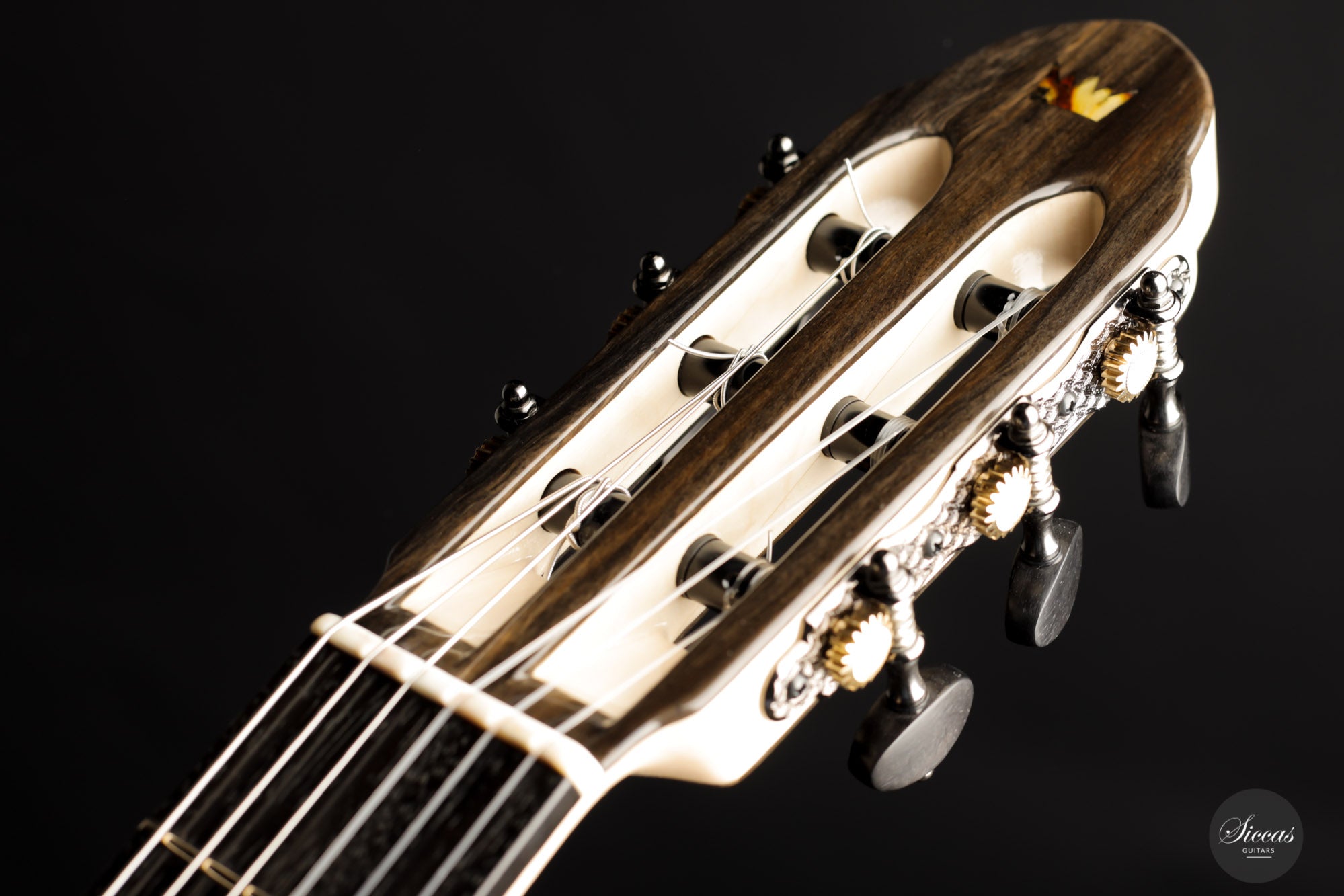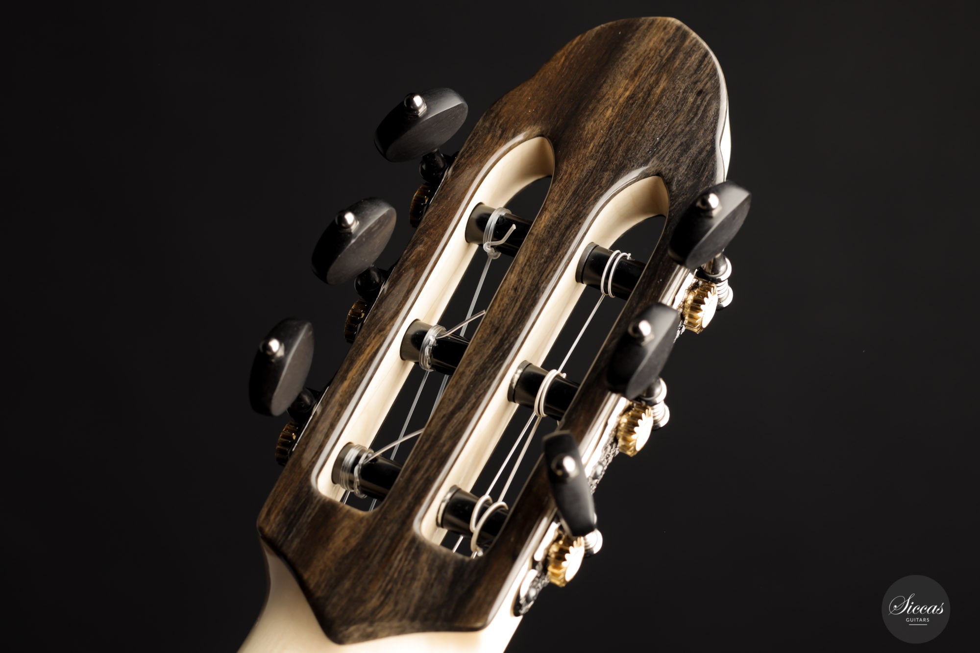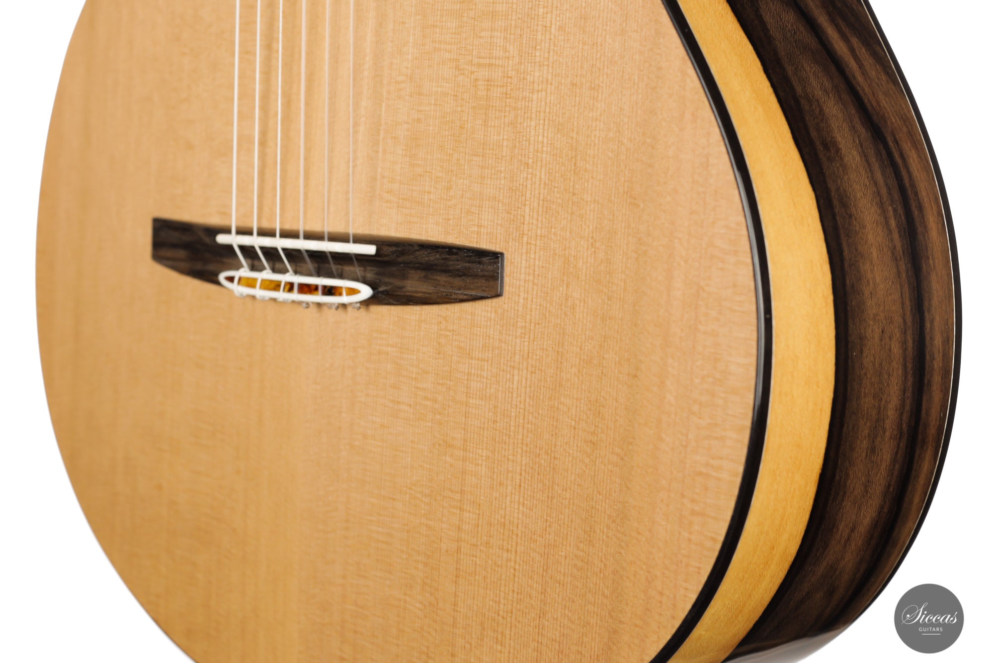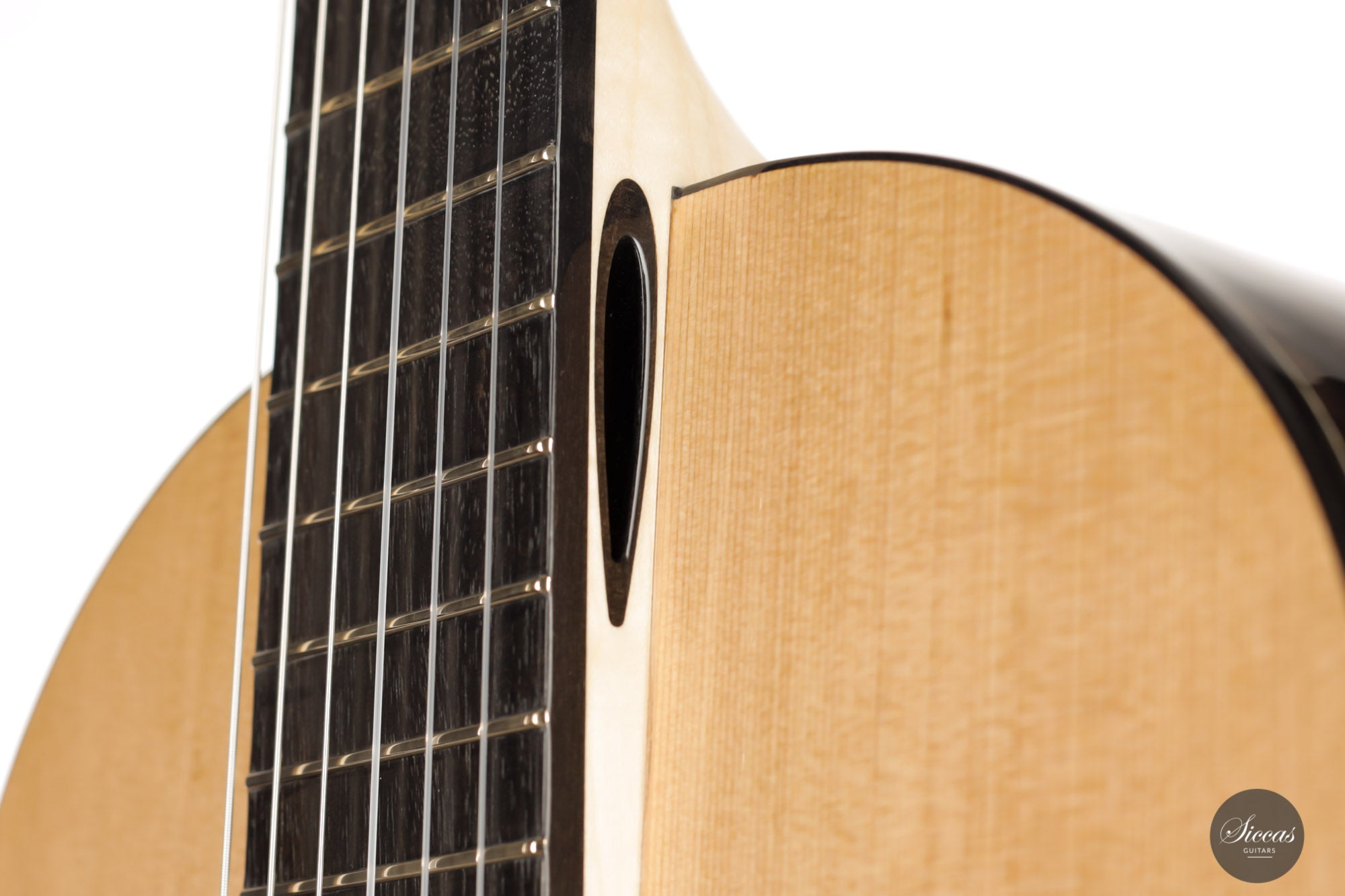 This wonderful instrument is really one of a kind. With a mesmerizing arched back made of Ziricote, giving center stage a wide light sapwood part in the middle, it really has a unique look. The cedar top has an outermost light lattice bracing reinforced with carbon fibre to give great responsiveness and lightness. Of course, this instrument features the famous “Acoustic tube” inside the neck, to give the latter a greater role in the overall resonance of the guitar.