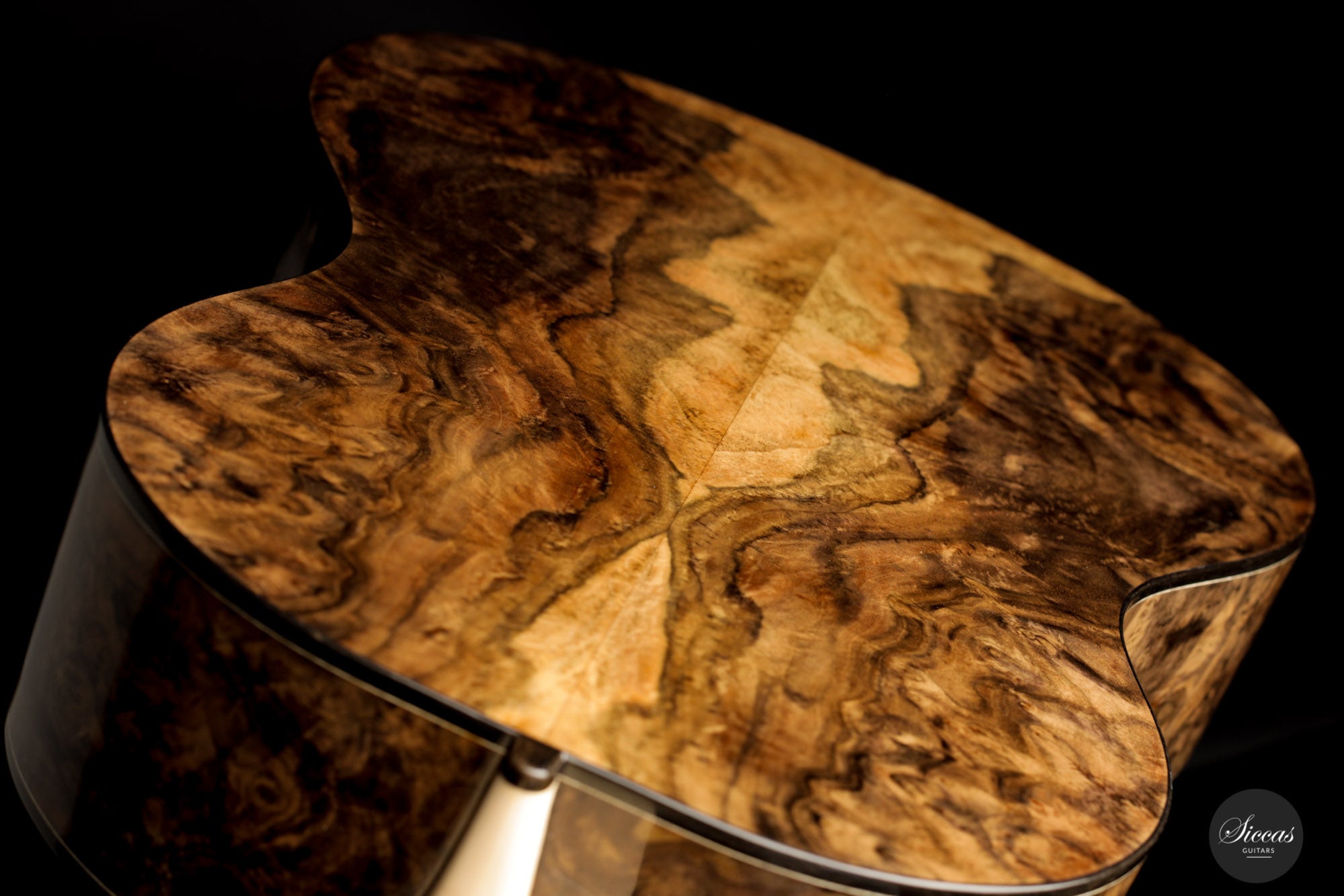 This wonderful instrument is a model "Queen of Guitars - black diamond" and is numbered 420. This exclusive guitar has a bewitching arched back made of highly figured California Walnut Burl, giving the center stage a light sapwood part in the middle. The cedar top has an outermost light lattice bracing reinforced with carbon fiber to provide excellent responsiveness and lightness. Of course, this instrument features the famous "Acoustic tube" inside the neck, to give the latter a more significant role in the overall resonance of the guitar.