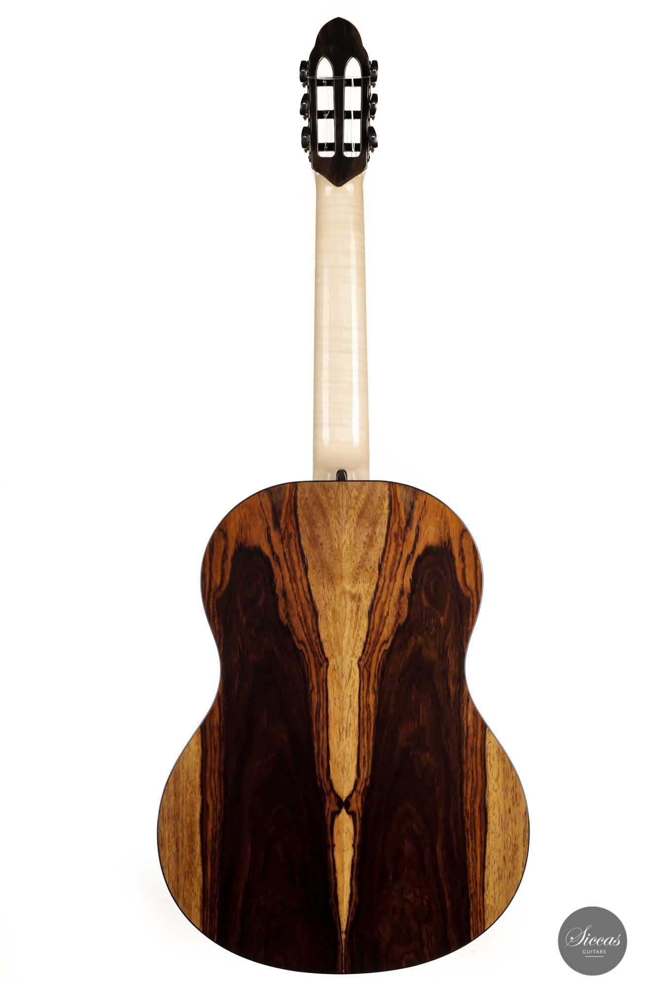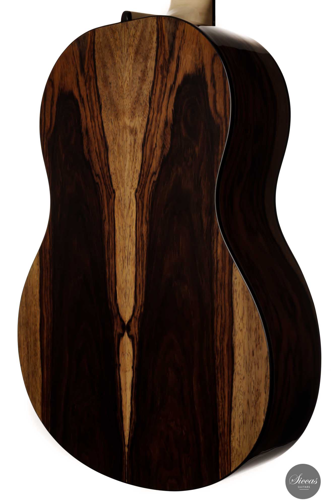 This wonderful instrument numbered 440 is really one of a kind. Due in no small part to the arched back of mesmerizingly figured cocobolo, displaying the extensive color palette of this exceptional tonewood, this guitar has a unique appearance. The cedar top has an outermost light lattice bracing reinforced with carbon fiber to give great responsiveness and lightness. Of course, this instrument features the famous “Acoustic tube” inside the neck to give the latter a greater role in the overall resonance of the guitar.