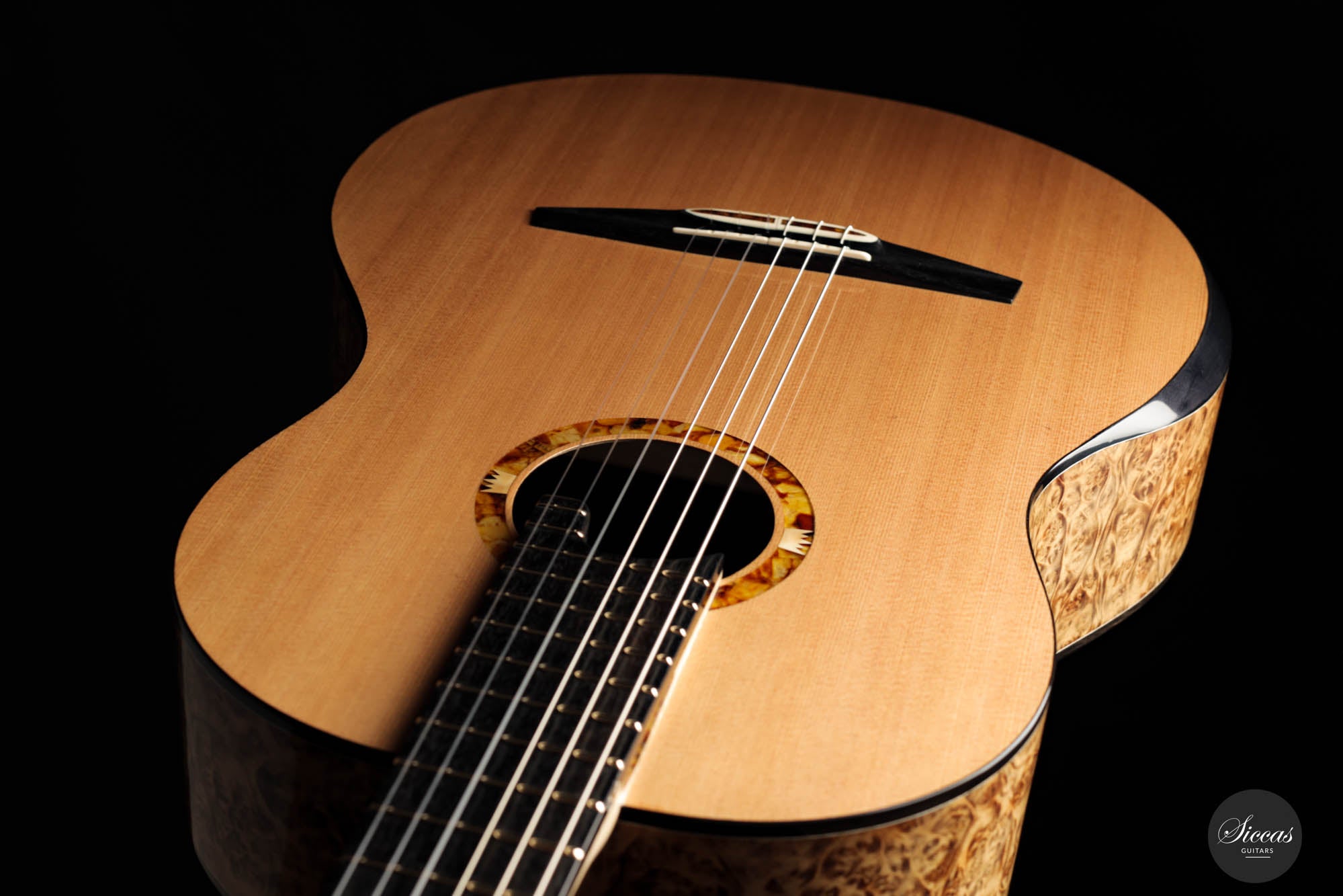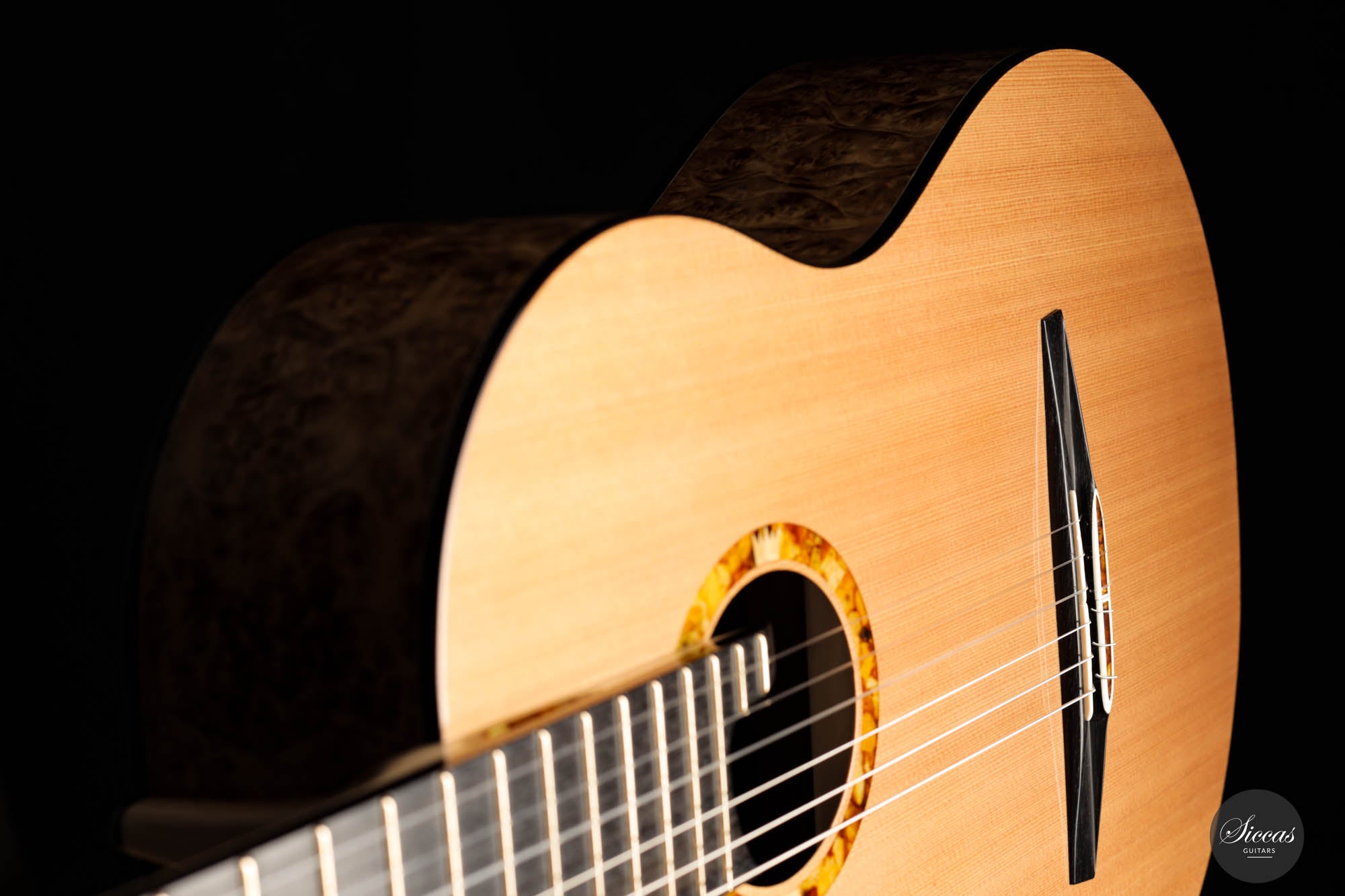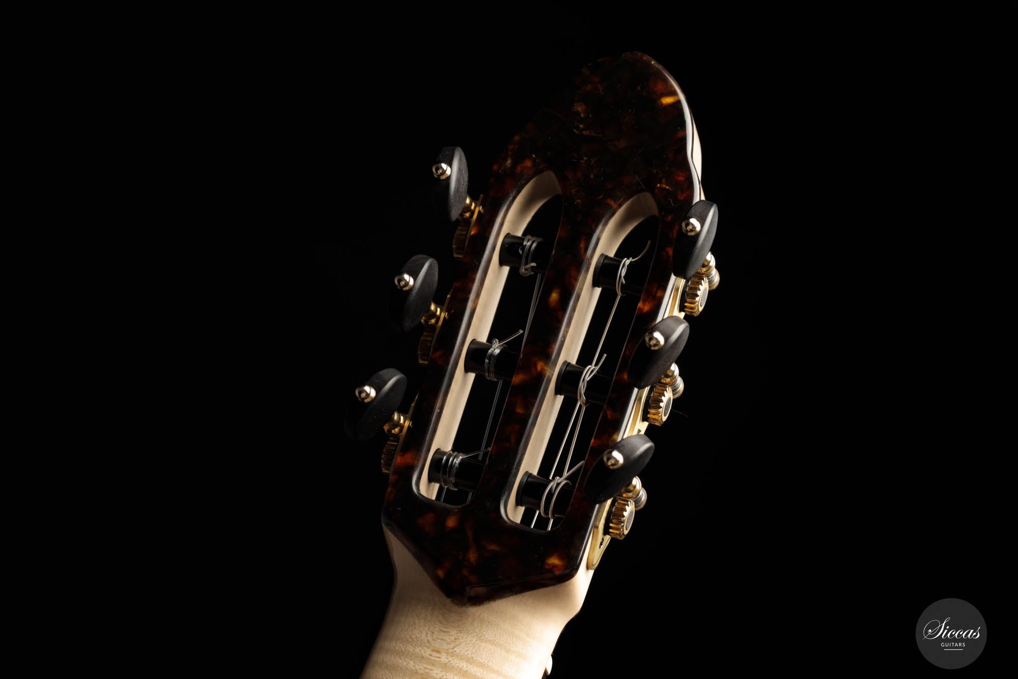 Die klassische Gitarre mit ihren weichen Nylonsaiten und ihrem charakteristischen Timbre ist zum Symbol der Kammermusik, der spanischen Tradition und des Konzertrepertoires geworden. Ihre moderne Form prägte Antonio de Torres im 19. Jahrhundert, indem er den Standard für Korpus, Fächerbeleistung und die 65-Zentimeter-Mensur setzte, die bis heute verwendet werden. Instrumente dieser Kategorie eröffnen eine reiche Palette von den feinen romantischen Miniaturen Tárregas bis zu den majestätischen Konzerten Rodrigos. Hier finden Sie Gitarren, die historische Kontinuität bewahren und zugleich zu neuen Interpretationen anregen.