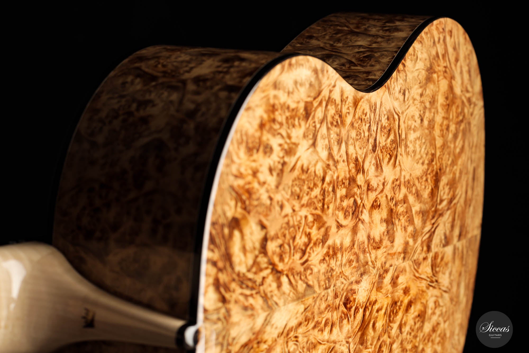 Diese "Königin der Gitarren - Schwarzer Diamant" Nr. 547 ist ein unglaubliches Instrument von Rafal Turkowiak, ein prägendes Modell von 2023, das die Kunst des Gitarrenbaus auf eine höhere Ebene hebt. Diese exklusive 64cm Gitarre zeigt einen auffälligen gewölbten Rücken aus außergewöhnlichem Vavona-Burl. Die sorgfältig gefertigte Fichtendecke, verstärkt mit Kohlefaser in einem leichten Lattice-Bracing-Muster, garantiert eine bemerkenswerte Ansprache und ein federleichtes Gewicht.