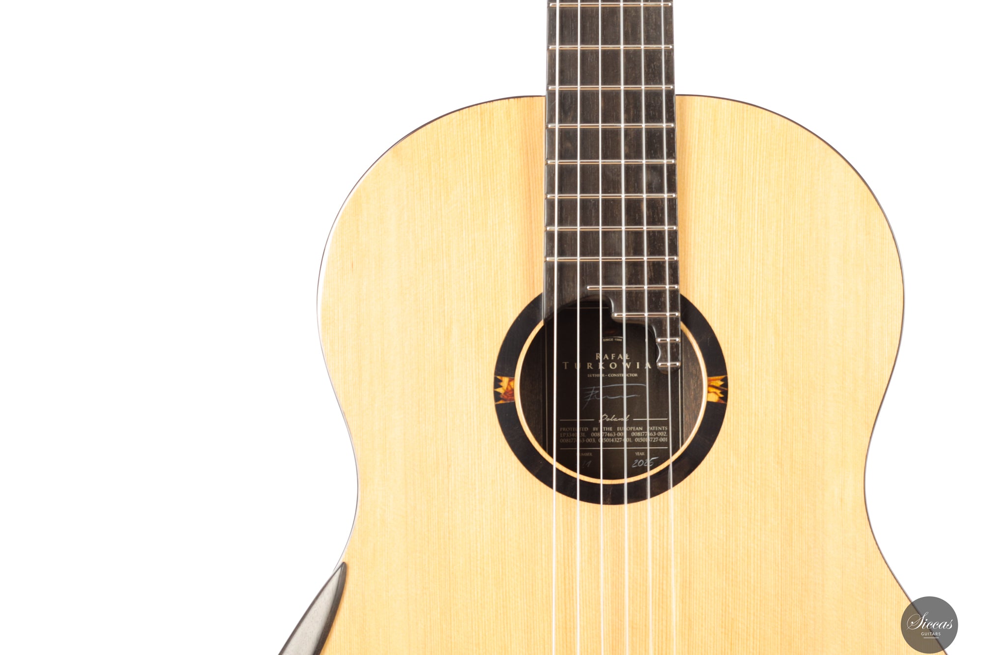 Ein zentrales Merkmal ist das von Turkowiak entwickelte „Acoustic Tube“-System im Hals, das die Resonanz verstärkt und einen vollen, raumfüllenden Klang unterstützt. Die Diskantsaiten klingen warm und süß, während die außergewöhnlich tiefe Eigenresonanz zwischen Dis und E dem Instrument eindrucksvolle Bässe und ein starkes Fundament in allen Lagen verleiht. Mit einem Gewicht von nur 1520 Gramm bleibt die Gitarre ausgesprochen reaktionsfreudig und dynamisch.