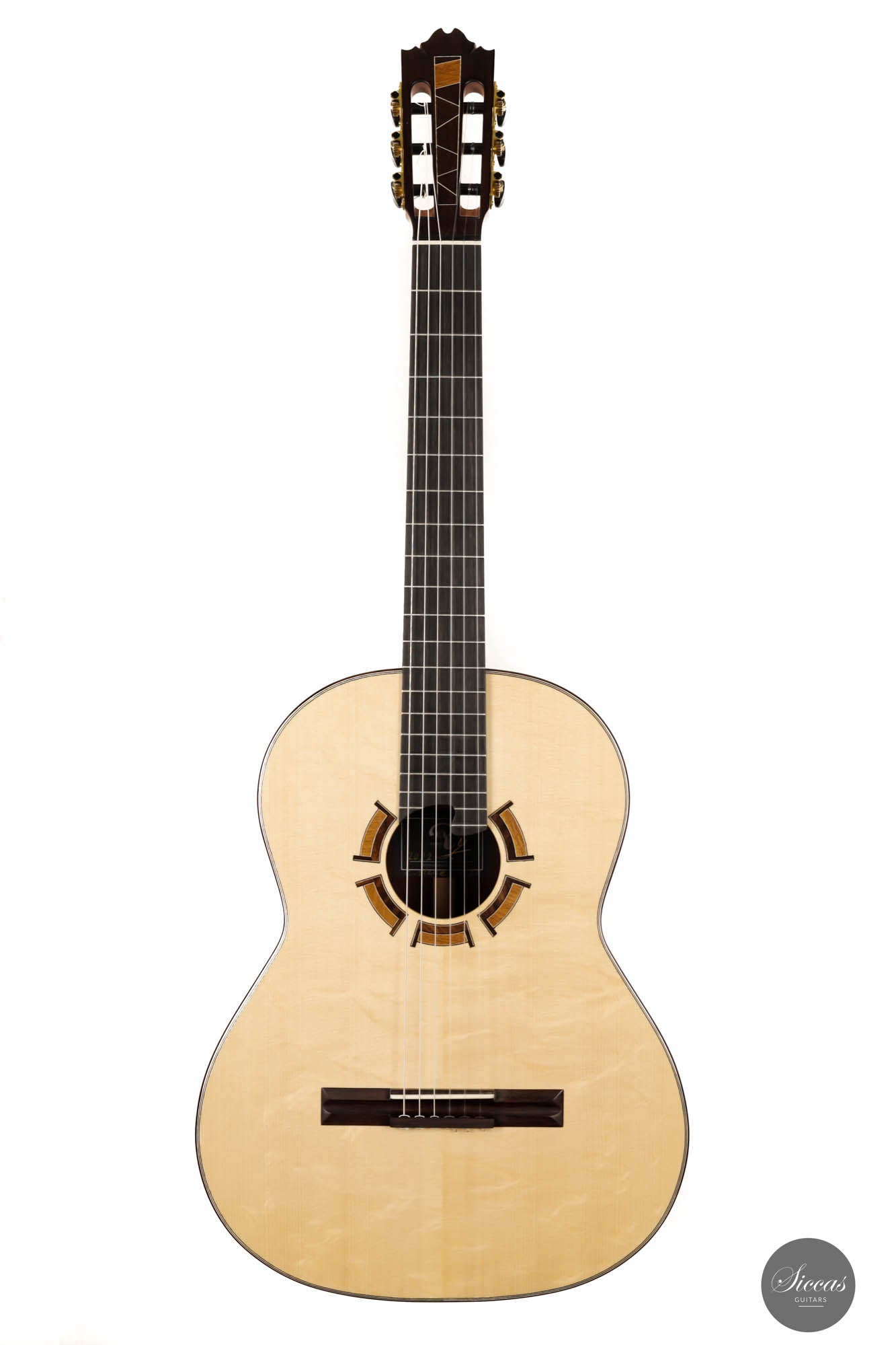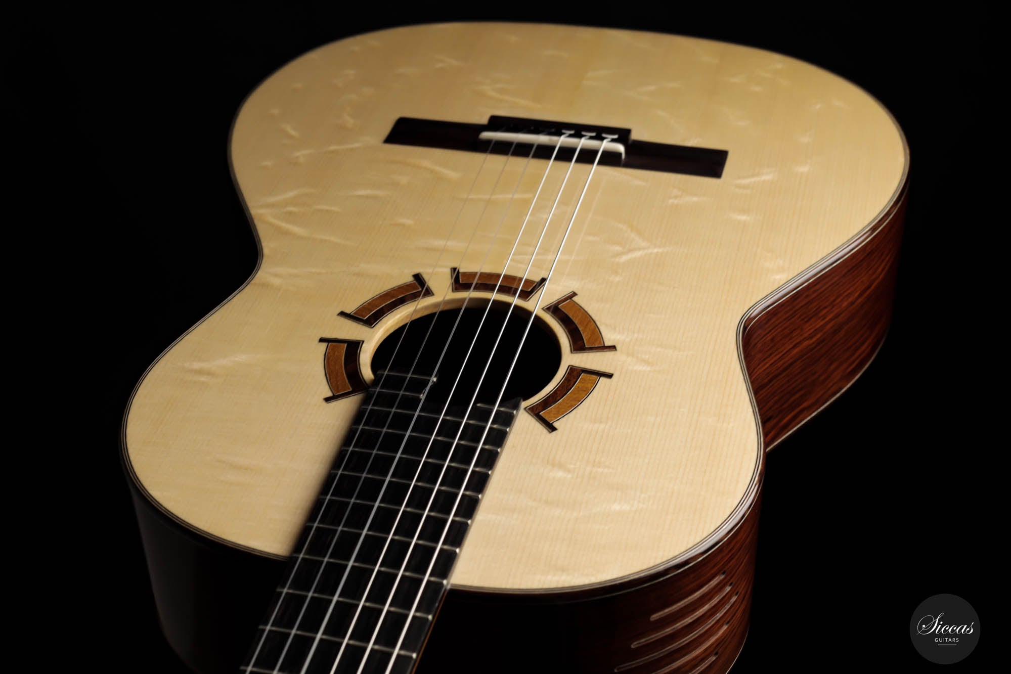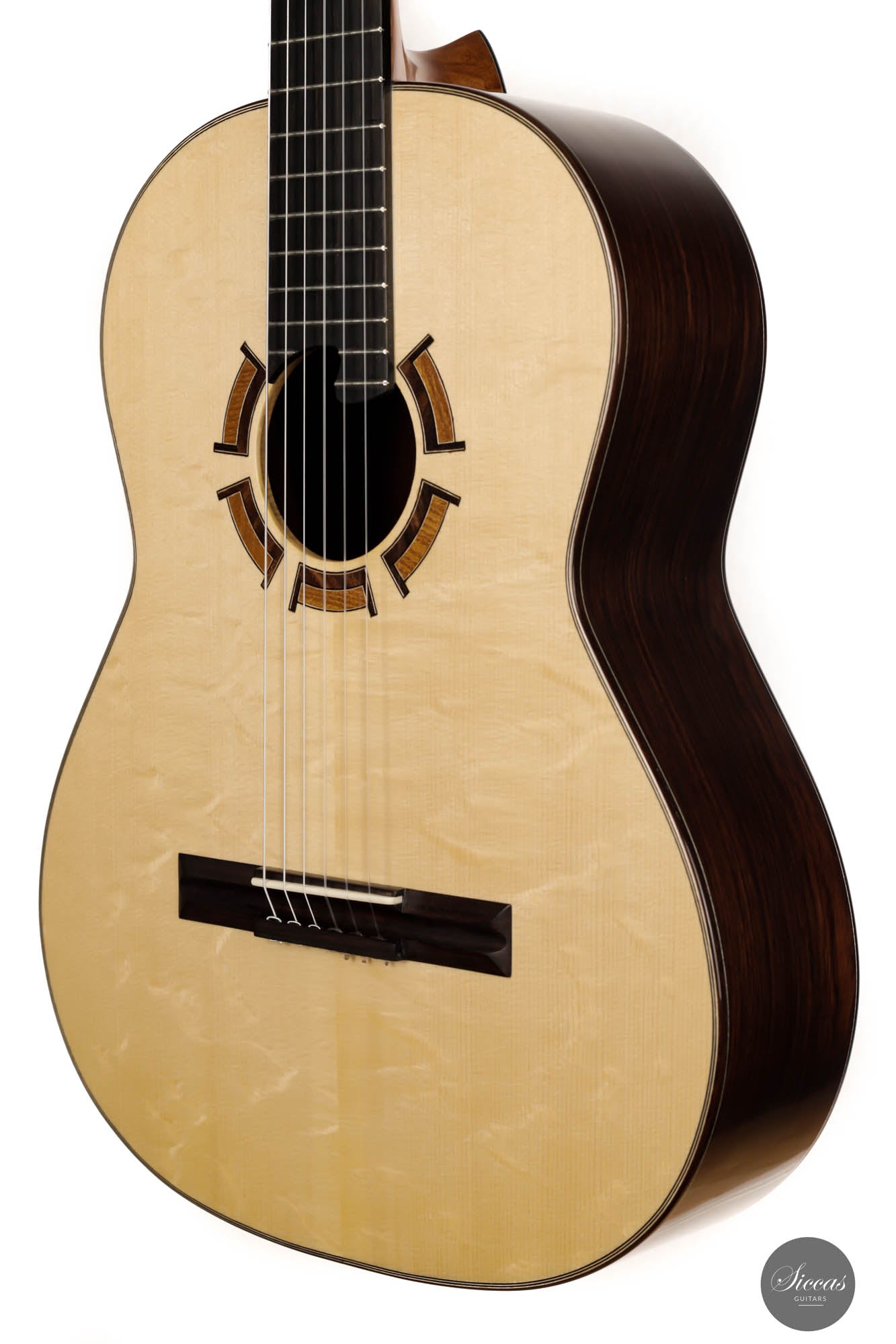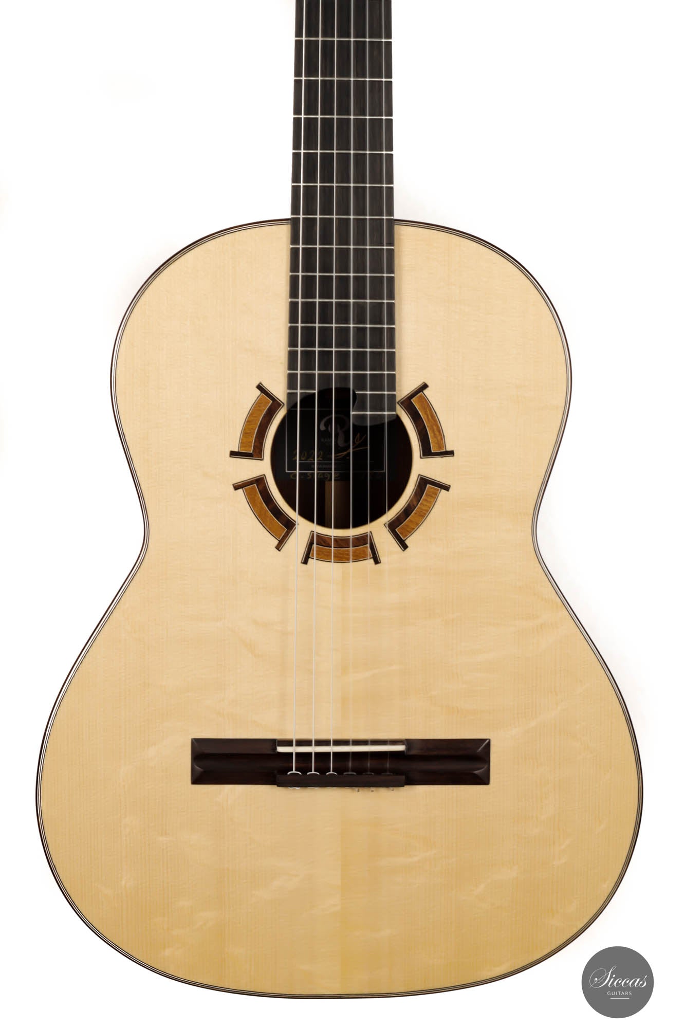 Diese Gitarre, Nr. 424 ist ein in jeder Hinsicht schön klingendes Instrument. Sie hat eine wunderschöne Decke aus Bearclaw-Fichte und einen Boden und Zargen aus edlem Amazonas-Palisander. Als traditionell gebautes Instrument hat es auch einige Vorteile eines modernen Konzertinstruments, wie z.B. eine einzigartige Design-Schalllochöffnung und ein hervorragendes Volumen, das die Bedürfnisse von Konzertinterpreten in jeder Situation leicht erfüllen wird. Darüber hinaus verfügt es über eine außergewöhnliche Ausgewogenheit zwischen den einzelnen Stimmen des Instruments. Die reaktionsschnellen Bässe überwältigen nicht die anderen Stimmen und umgekehrt. Diese Gitarre ist ein budgetfreundliches Instrument, das dem Gitarristen eine breite Palette an Möglichkeiten bietet, die er erkunden kann.