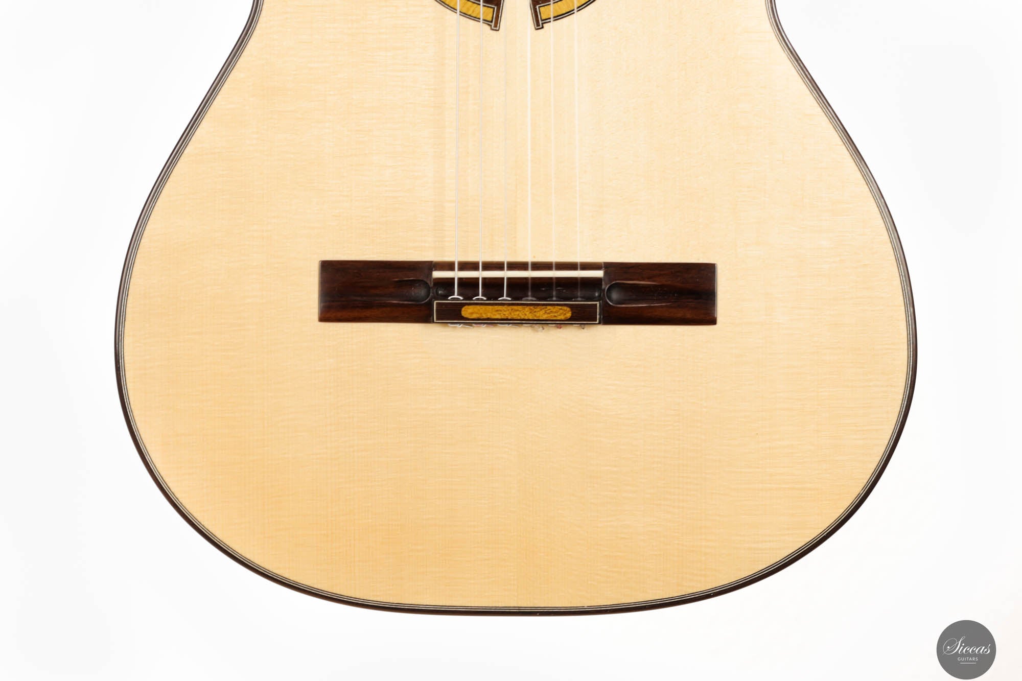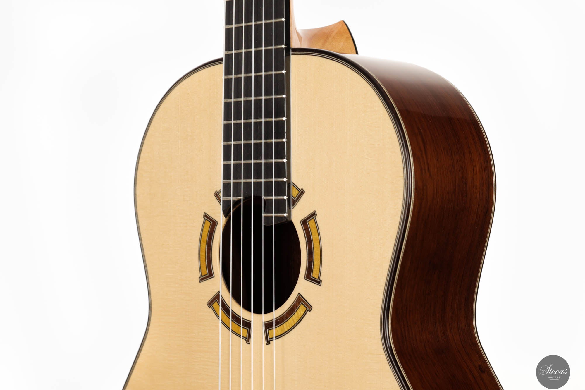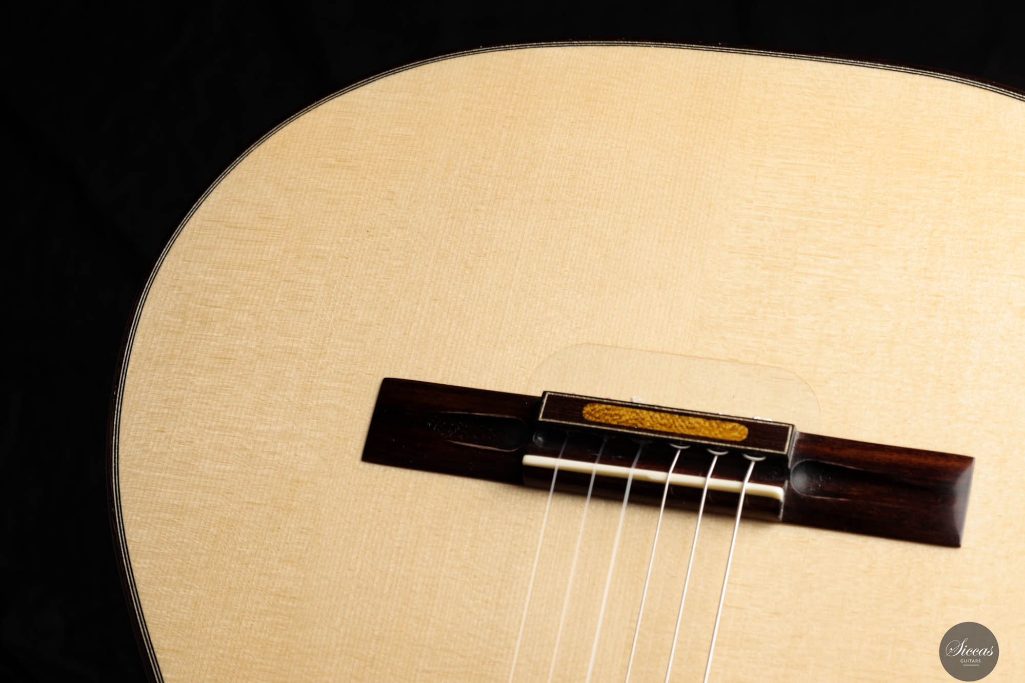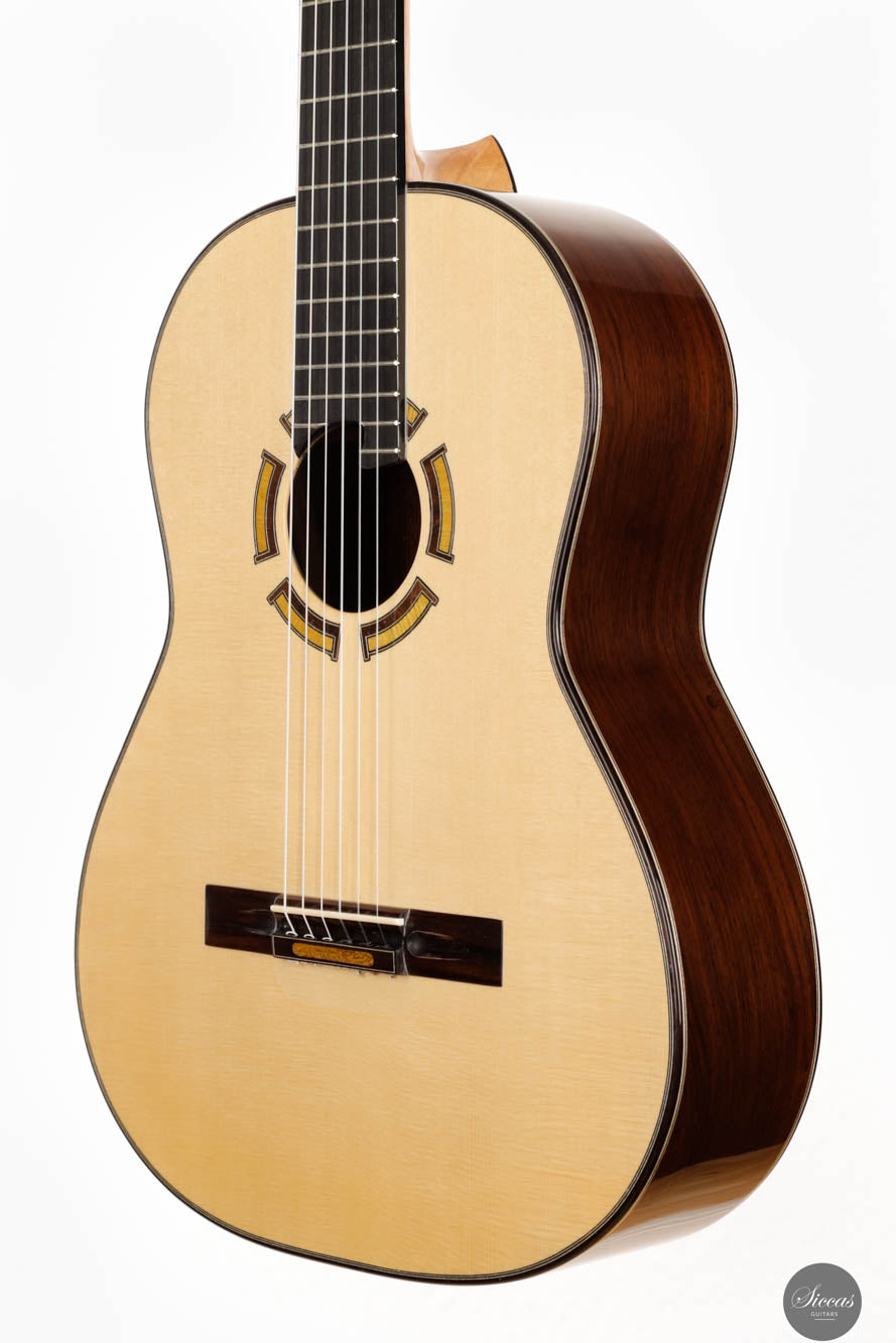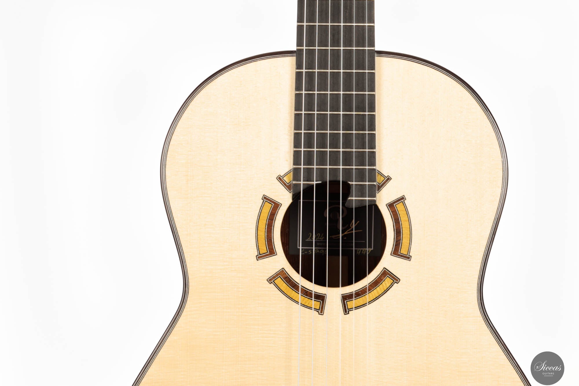 Die Gitarre Nr. 449 stellt eine bemerkenswerte Ergänzung in der Welt der klassischen Gitarren dar, indem sie traditionelles Handwerk mit den akustischen Fortschritten des zeitgenössischen Designs verbindet. Das Instrument prahlt mit einer sehr schönen Fichtendecke, gepaart mit optisch fesselndem Amazonas-Rosenholz für Rücken und Seiten, was es nicht nur zu einem Vergnügen macht, darauf zu spielen, sondern auch zu einem prächtigen Stück zum Ansehen. Diese Gitarre beinhaltet moderne Merkmale wie einen einzigartig gestalteten Schallloch, der ihr Volumen und Projektion verstärkt, um den Anforderungen von Konzertaufführungen in verschiedenen Umgebungen gerecht zu werden. Ihre Konstruktion spricht für eine Hingabe an Qualität und stellt sicher, dass sie als vielseitige Option für Musiker hervorsticht, die die Reichhaltigkeit eines traditionellen Instruments mit den Vorteilen moderner Verbesserungen suchen.