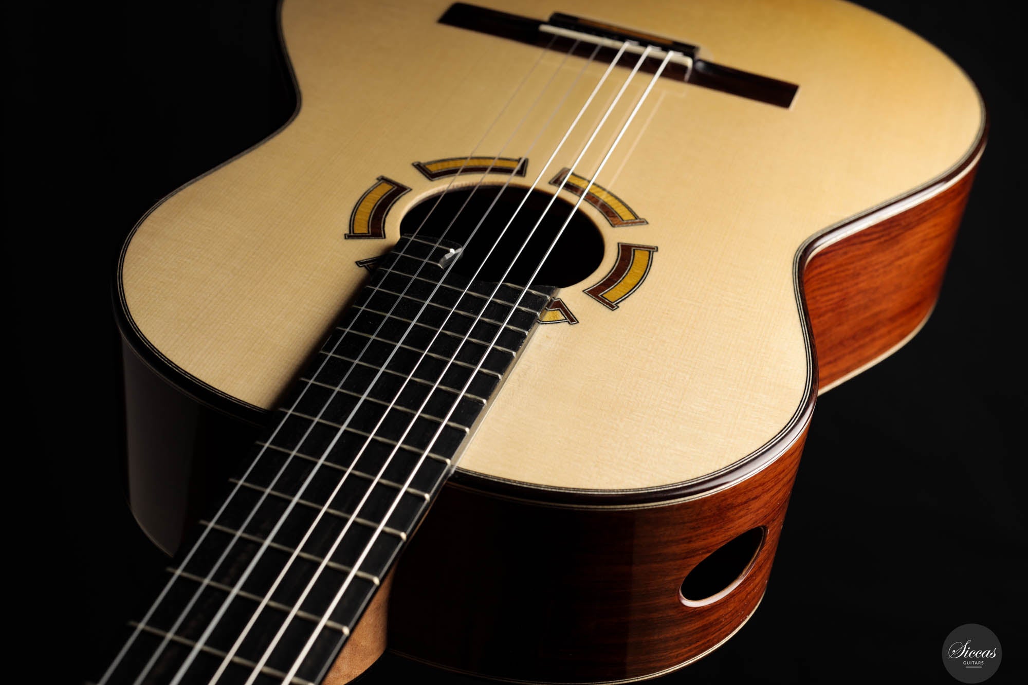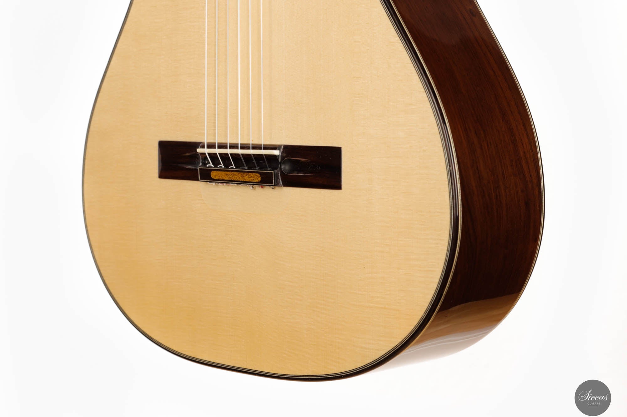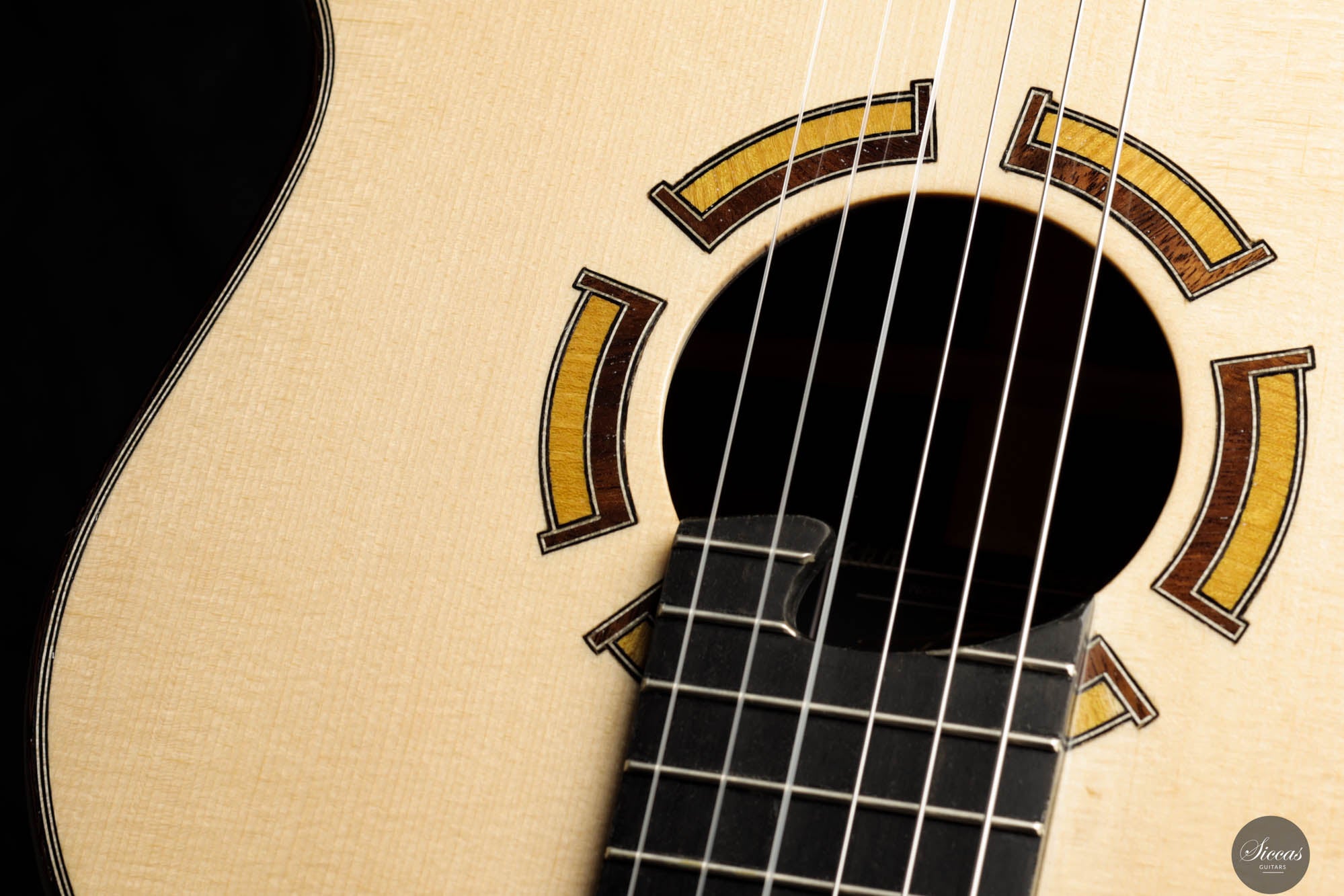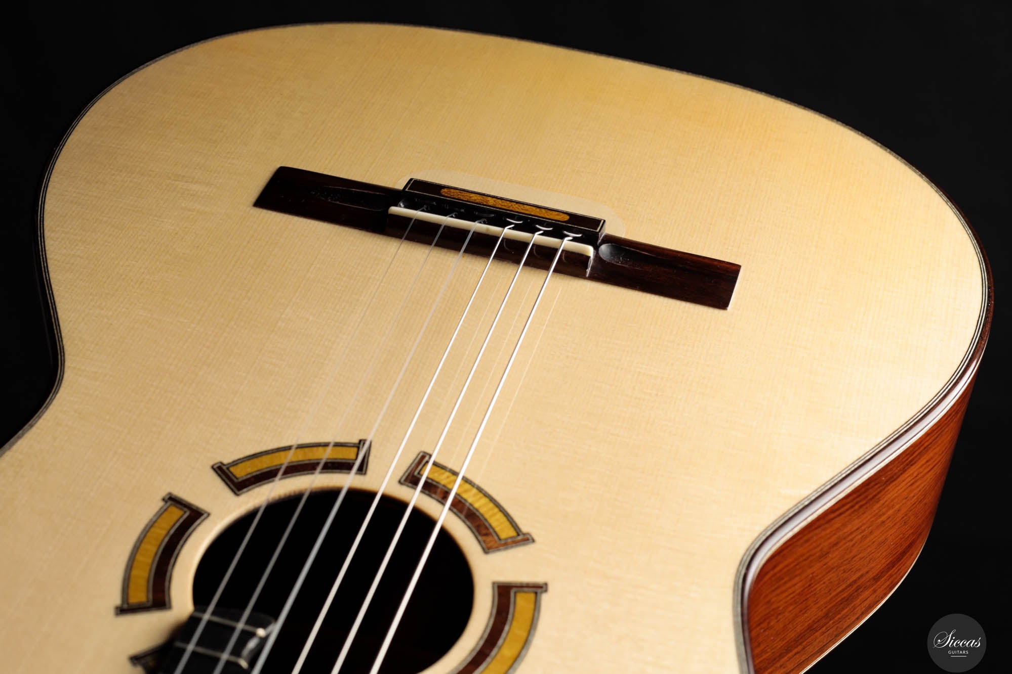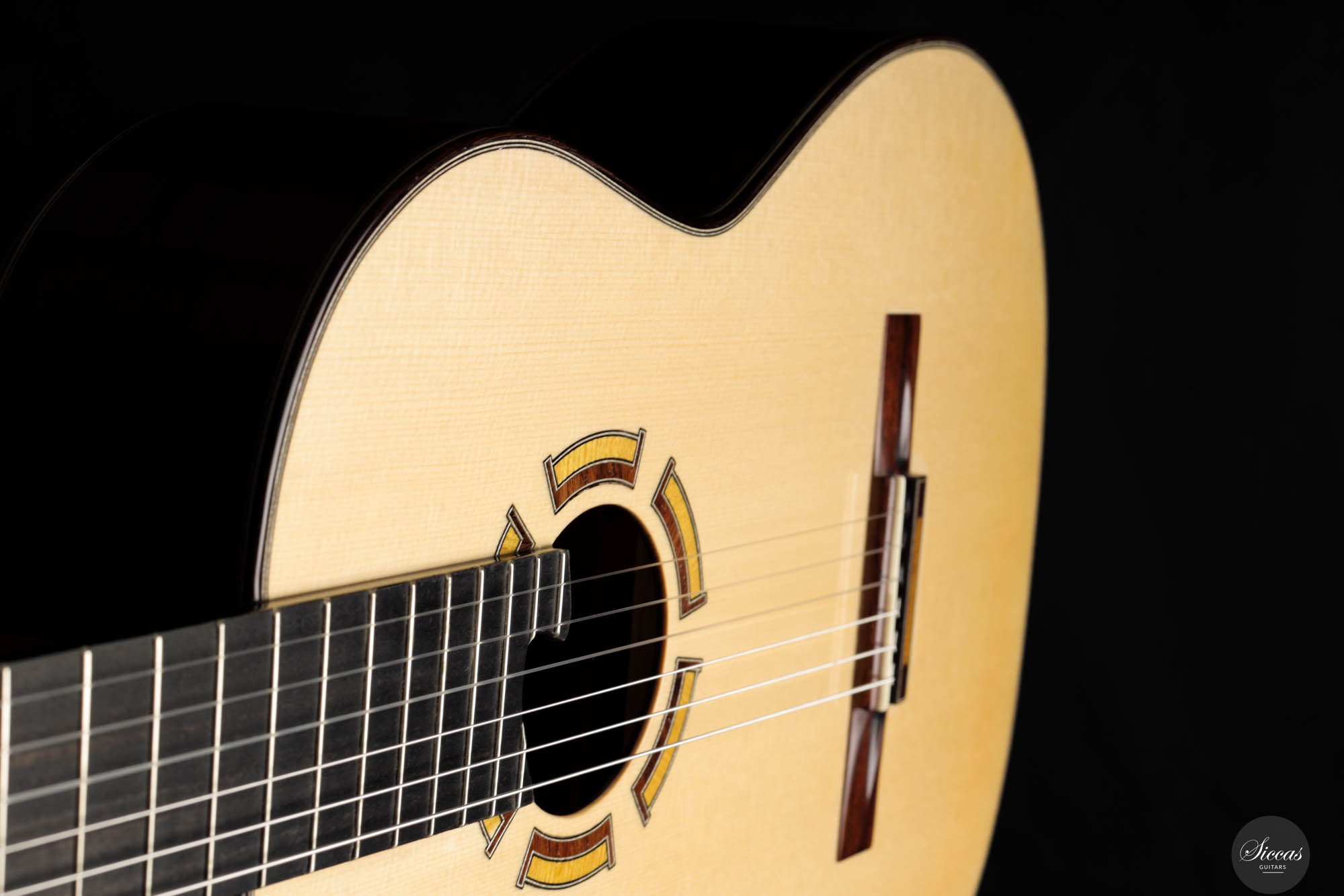 Die Gitarre Nr. 449 stellt eine bemerkenswerte Ergänzung in der Welt der klassischen Gitarren dar, indem sie traditionelles Handwerk mit den akustischen Fortschritten des zeitgenössischen Designs verbindet. Das Instrument prahlt mit einer sehr schönen Fichtendecke, gepaart mit optisch fesselndem Amazonas-Rosenholz für Rücken und Seiten, was es nicht nur zu einem Vergnügen macht, darauf zu spielen, sondern auch zu einem prächtigen Stück zum Ansehen. Diese Gitarre beinhaltet moderne Merkmale wie einen einzigartig gestalteten Schallloch, der ihr Volumen und Projektion verstärkt, um den Anforderungen von Konzertaufführungen in verschiedenen Umgebungen gerecht zu werden. Ihre Konstruktion spricht für eine Hingabe an Qualität und stellt sicher, dass sie als vielseitige Option für Musiker hervorsticht, die die Reichhaltigkeit eines traditionellen Instruments mit den Vorteilen moderner Verbesserungen suchen.