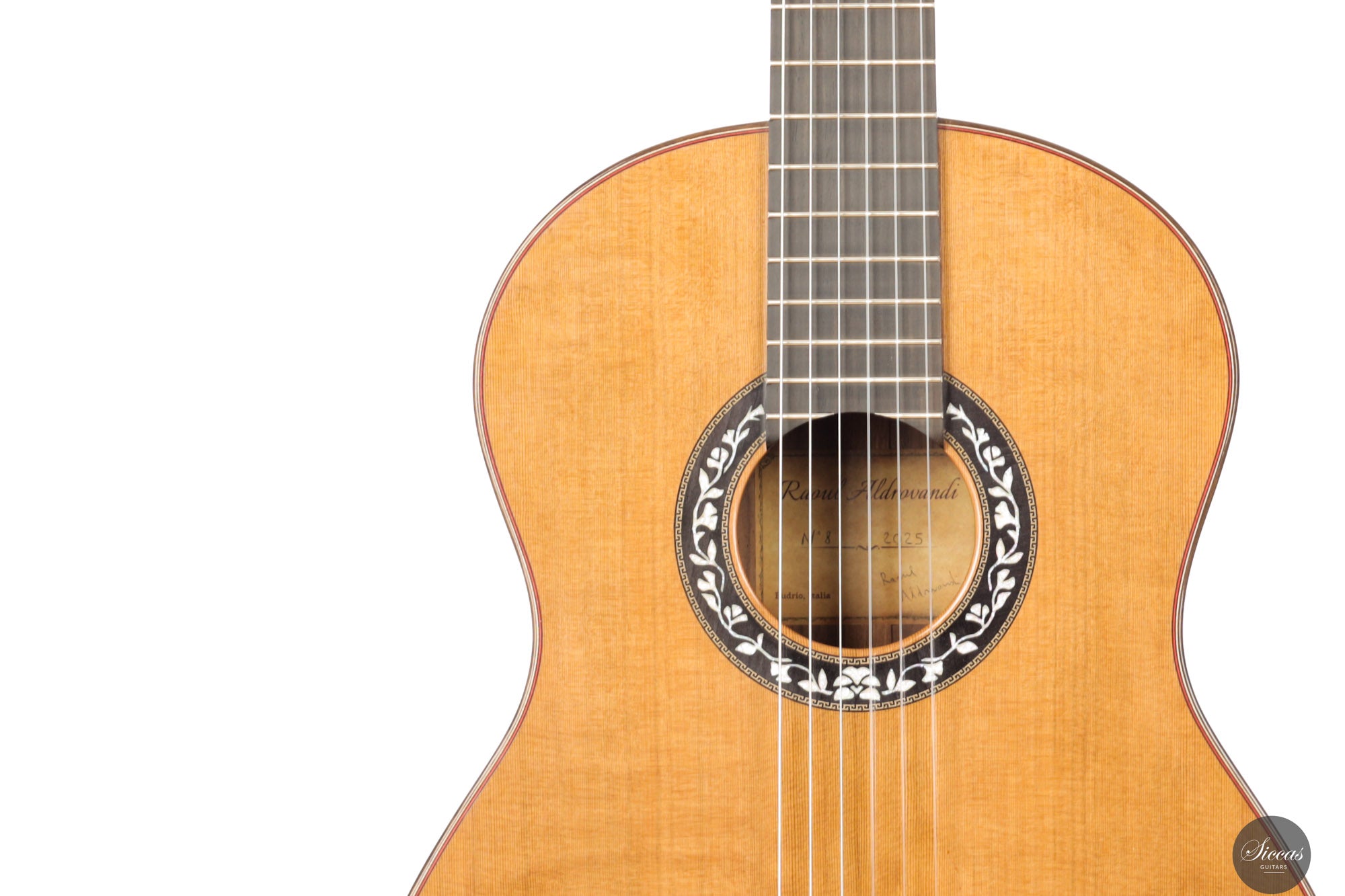Die Idee zu diesem Instrument, Nr. 8 „Ambra“, entstand während eines Besuchs in der Werkstatt von Paolo Coriani. Im Gespräch über Beleistungssysteme, Materialien und Bauweisen überreichte ihm Coriani ein altes, hervorragend abgelagertes Zederntonholz aus seinem beeindruckenden Bestand. Obwohl Aldrovandi häufig mit Fichte arbeitet, schätzt er die Zeder sehr, da der Wechsel zwischen beiden Hölzern seine Sensibilität als Gitarrenbauer deutlich geschärft hat. Diese Gitarre versteht er als Hommage an dieses besondere Tonholz.
