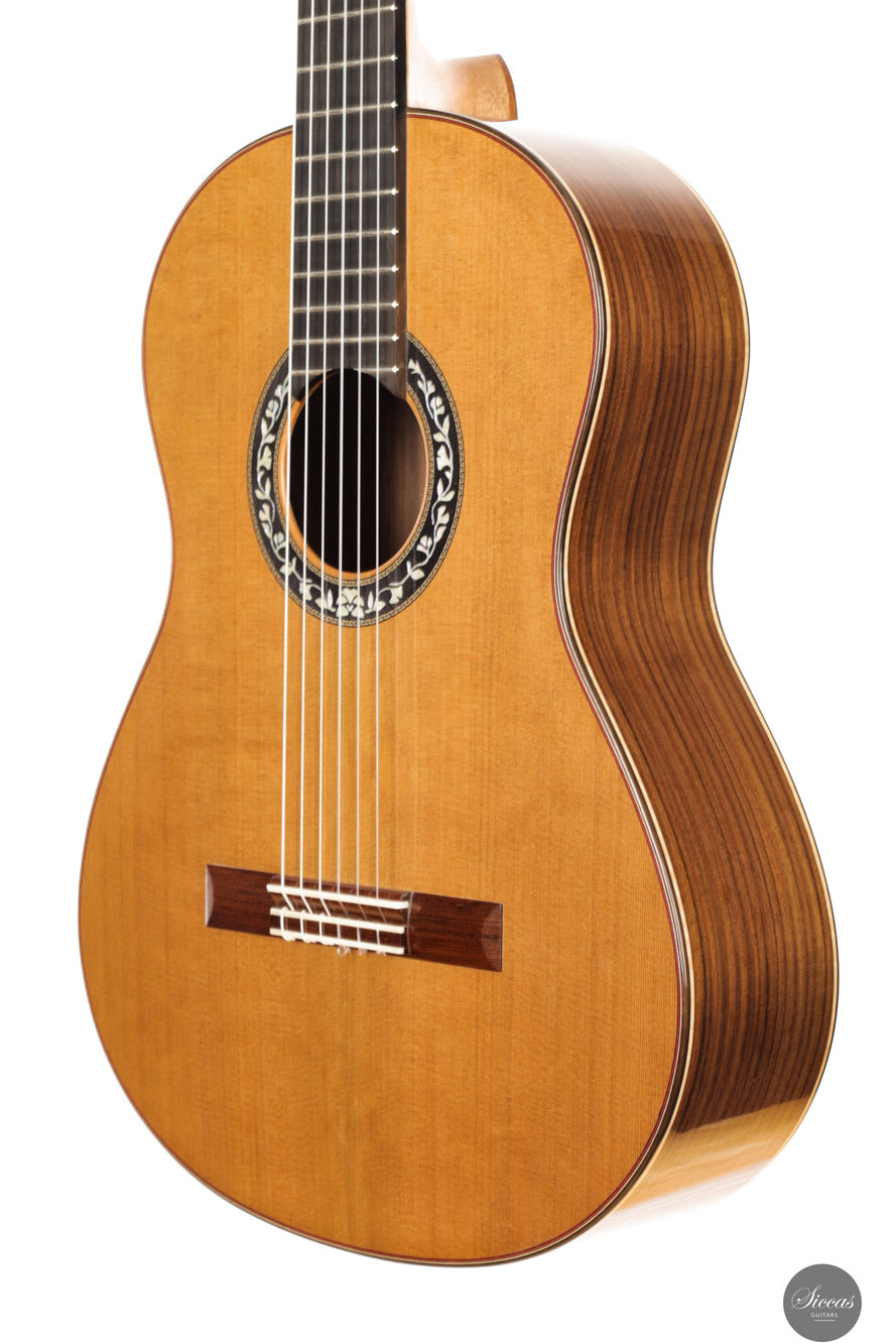 Die Decke wurde nach seiner eigenen Interpretation des Fächerbeleistungssystems gebaut, wobei auch Anregungen aus dem Gespräch mit Coriani eingeflossen sind. Eine florale Rosette mit Mosaikrahmung verleiht dem Instrument ein elegantes, feines Erscheinungsbild. Für die Stegeinlage wählte er ein besonders schönes Stück Madagaskar-Palisander, inspiriert von den klanglichen Eigenschaften dieses Holzes. Der Boden aus ostindischem Palisander wurde gezielt auf bestimmte Schwingungsmodi abgestimmt. Mit einer Eigenresonanz zwischen Fis und G bietet die Gitarre einen ausgewogenen, reaktionsfreudigen Klang mit klaren, tragenden Höhen und tiefen, wohlgeformten Bässen.