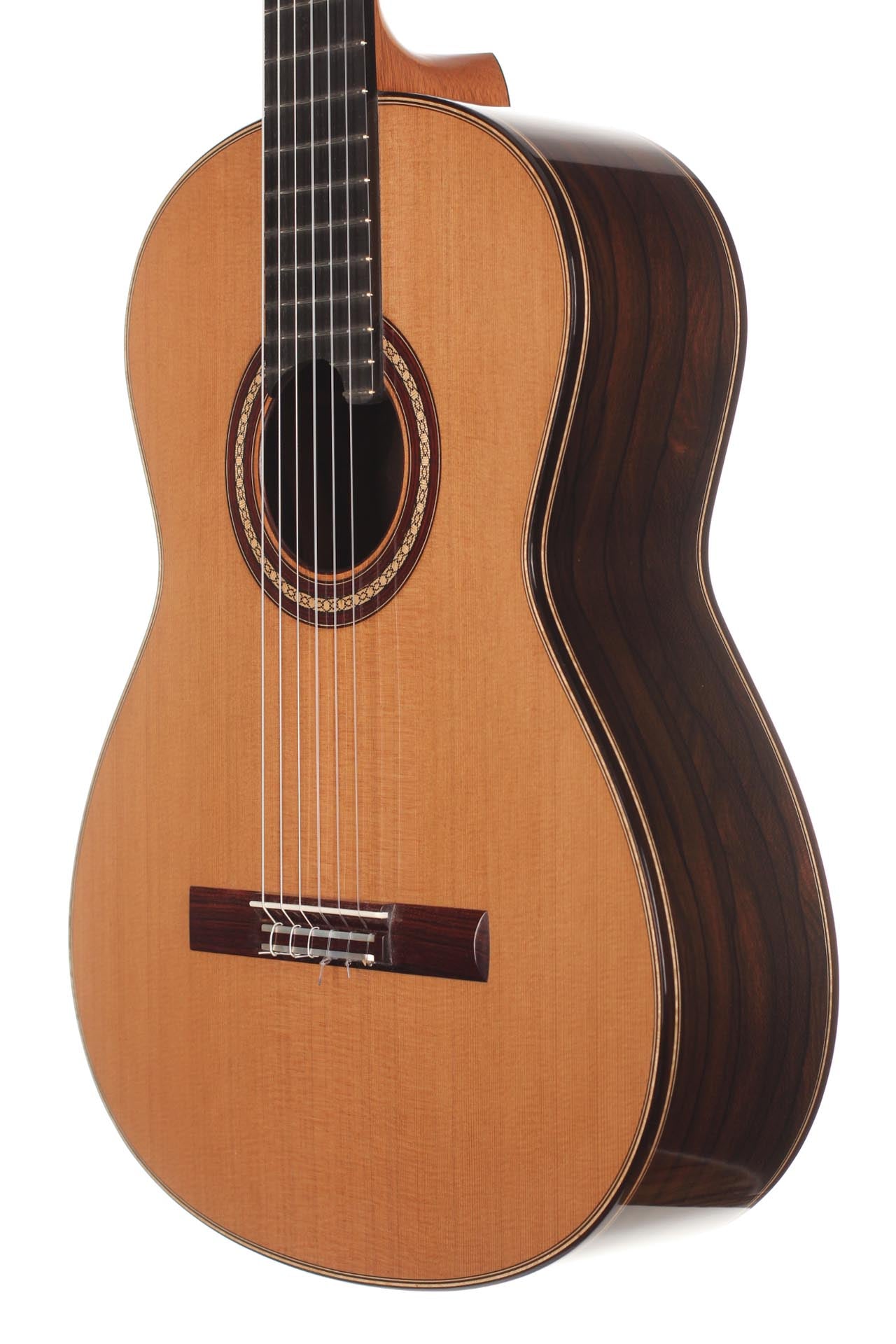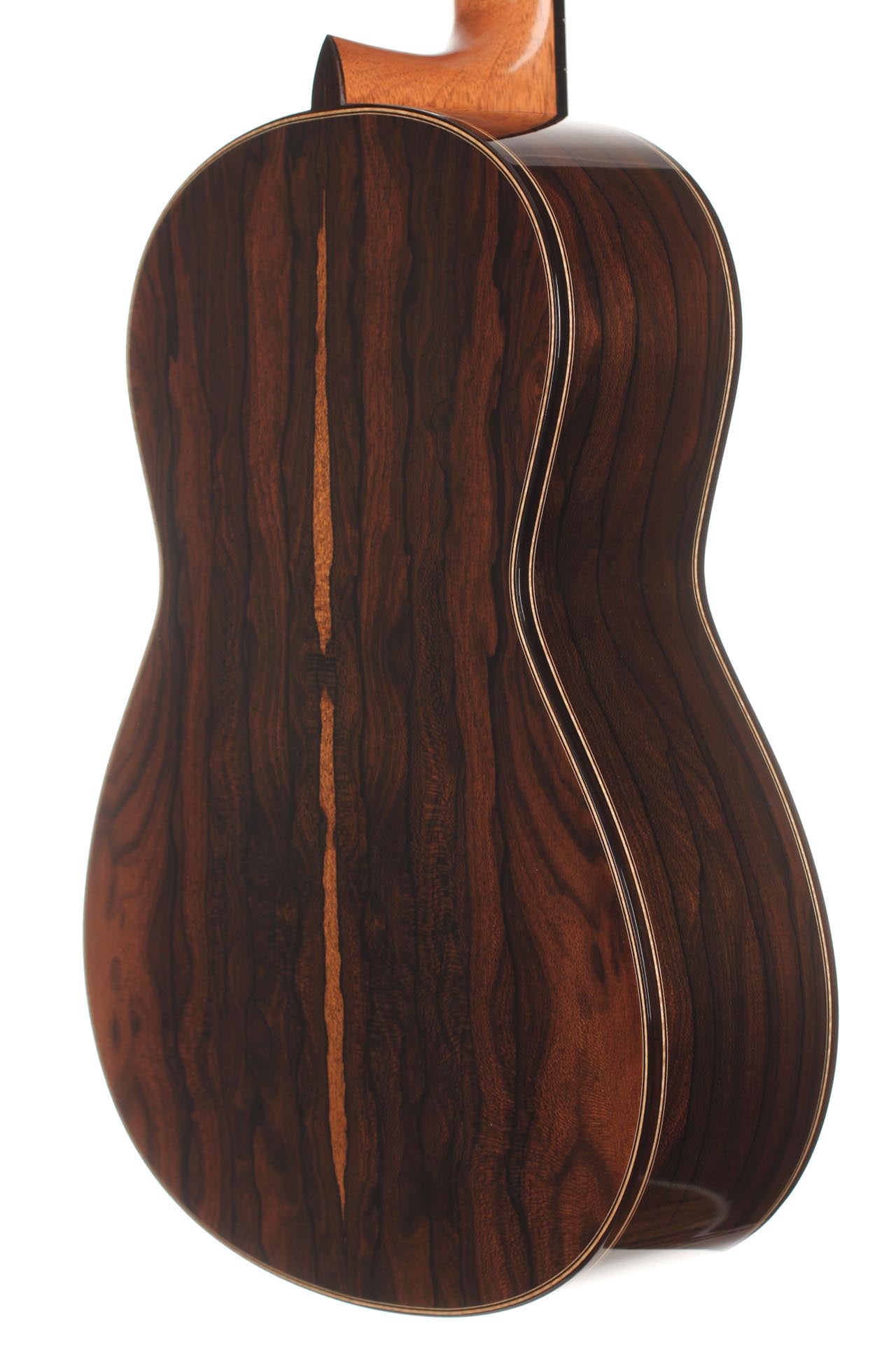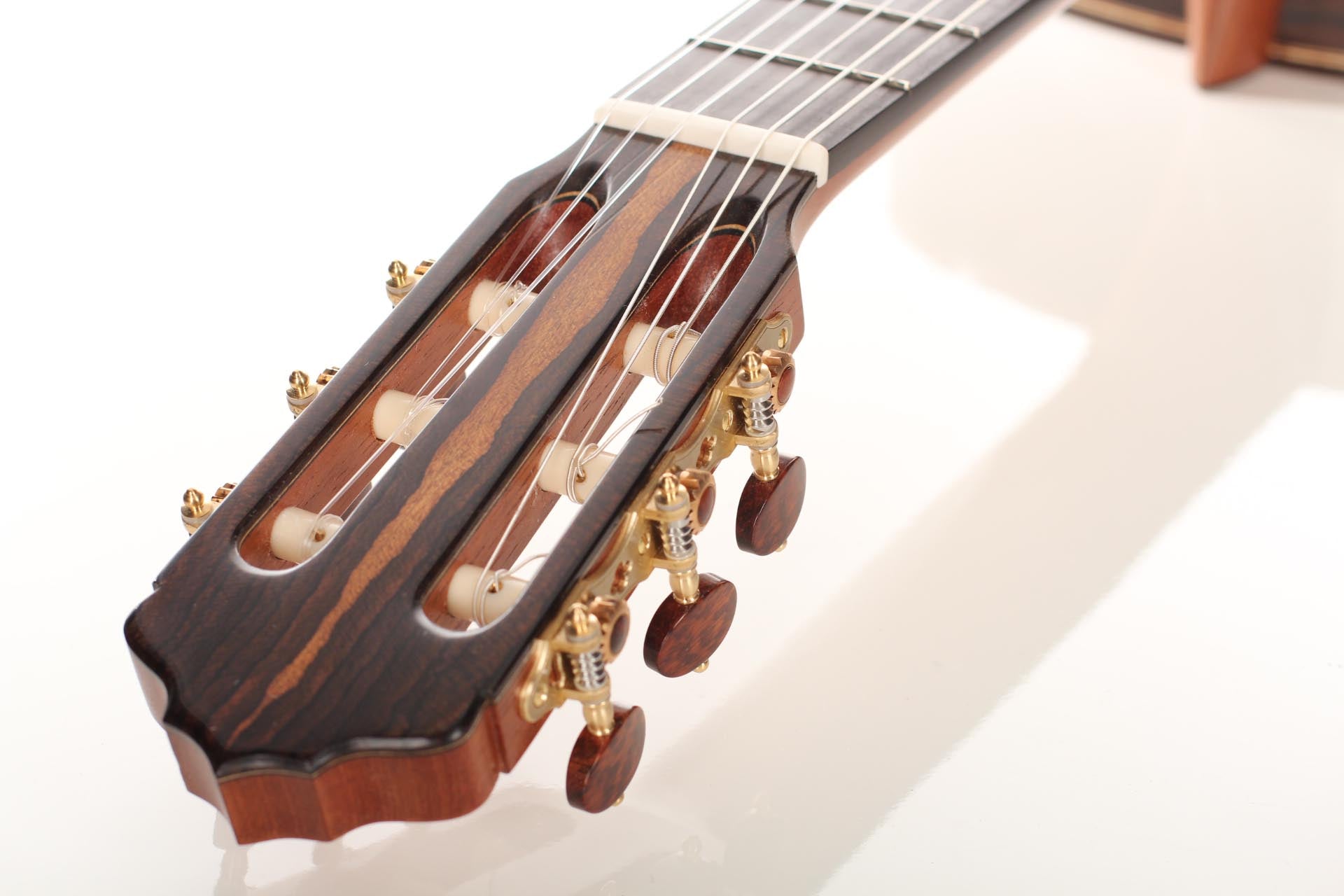 The wood he uses to build his guitars is selected thouroughly, giving a special attention to the drying time and the age of the wood. This new guitar has a cedar top and Ziricote back and sides. The tuning machines are made by Alessi. As well as being a very appealing instrument, the richness and depth of its tone are very special. It is a really complex instrument that allows a great sound research and invites to a colourfull and dynamic playing. Included is a Hiscox Pro II case.