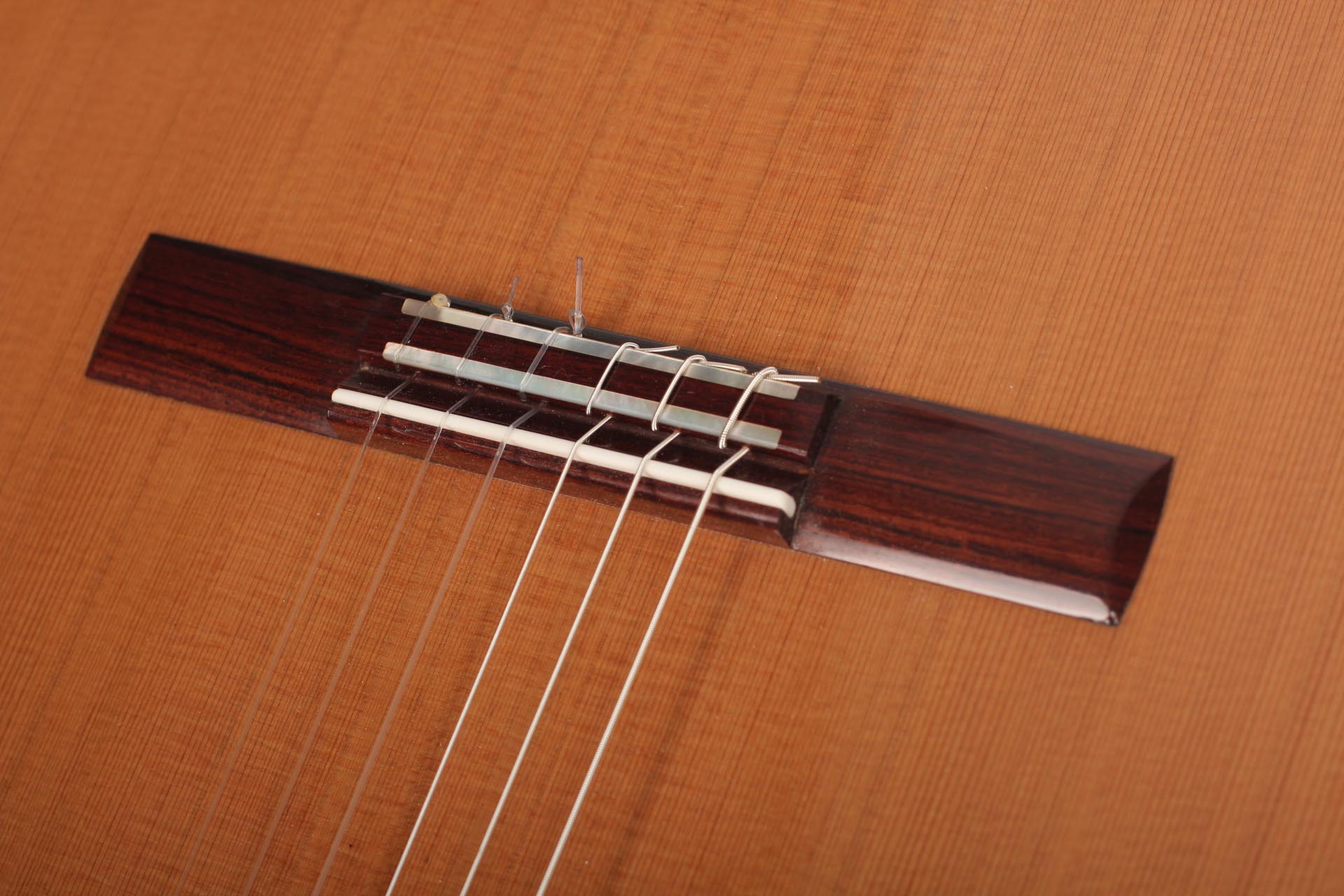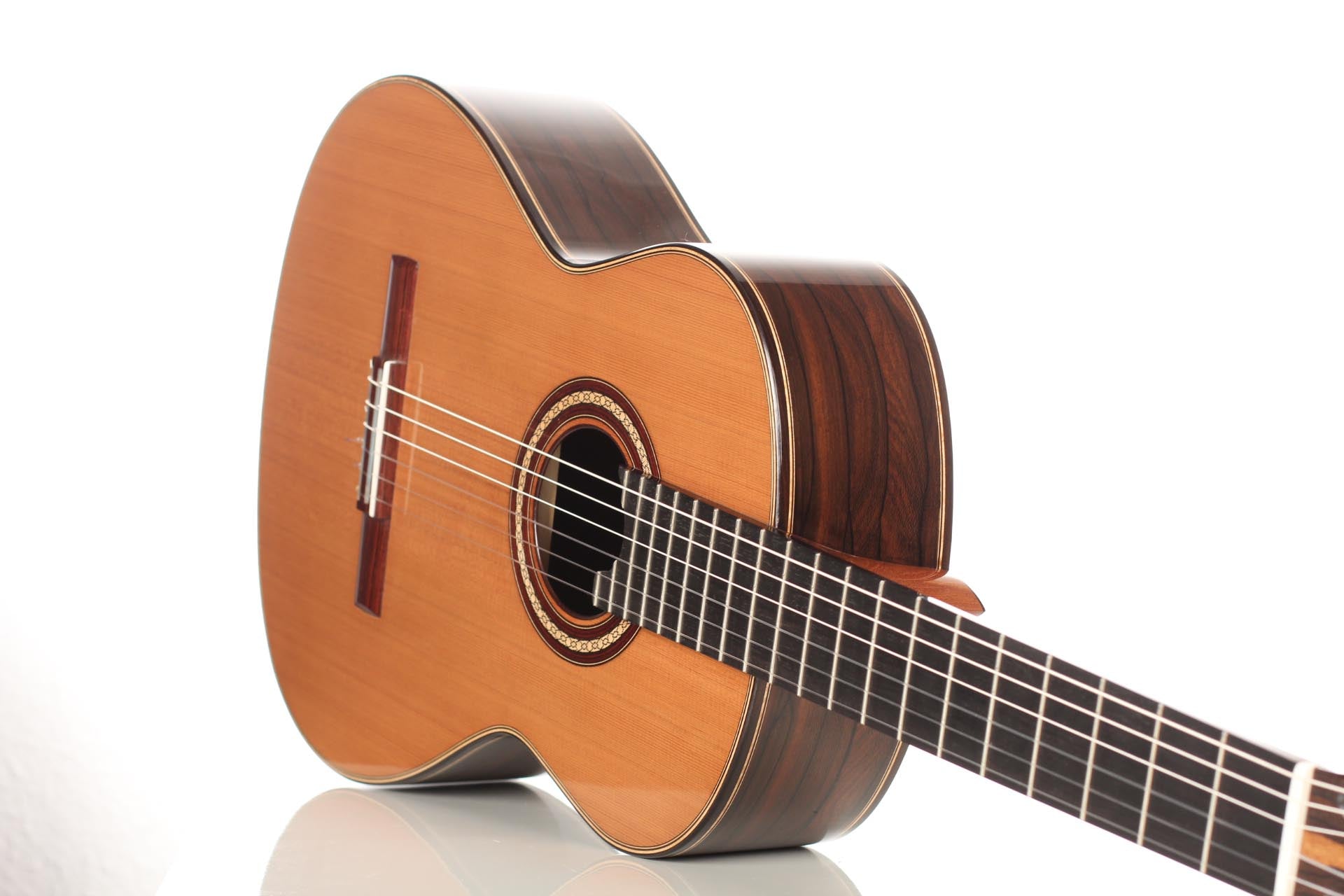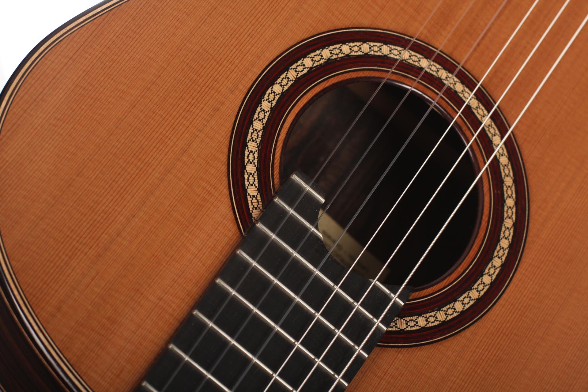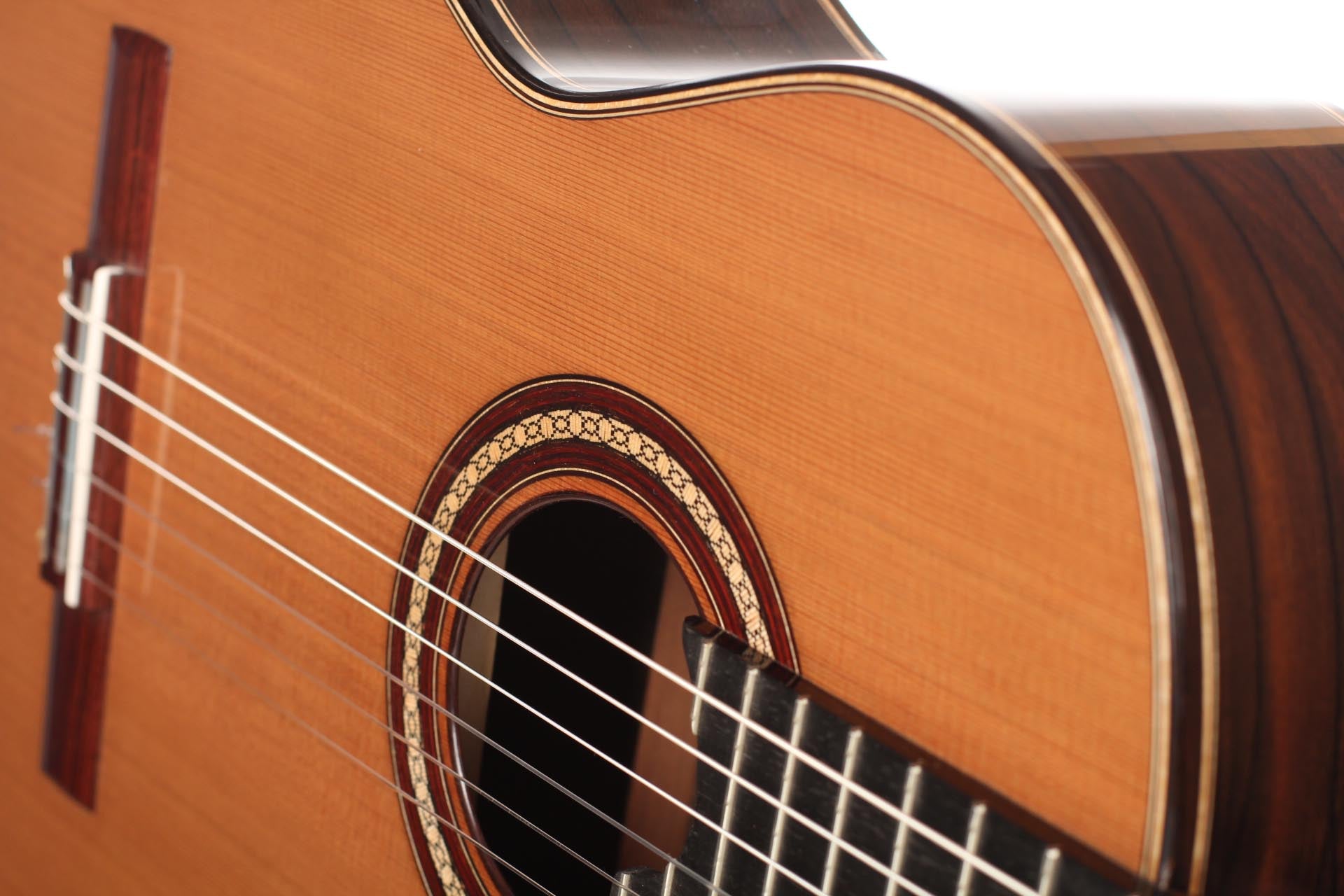 The wood he uses to build his guitars is selected thouroughly, giving a special attention to the drying time and the age of the wood. This new guitar has a cedar top and Ziricote back and sides. The tuning machines are made by Alessi. As well as being a very appealing instrument, the richness and depth of its tone are very special. It is a really complex instrument that allows a great sound research and invites to a colourfull and dynamic playing. Included is a Hiscox Pro II case.