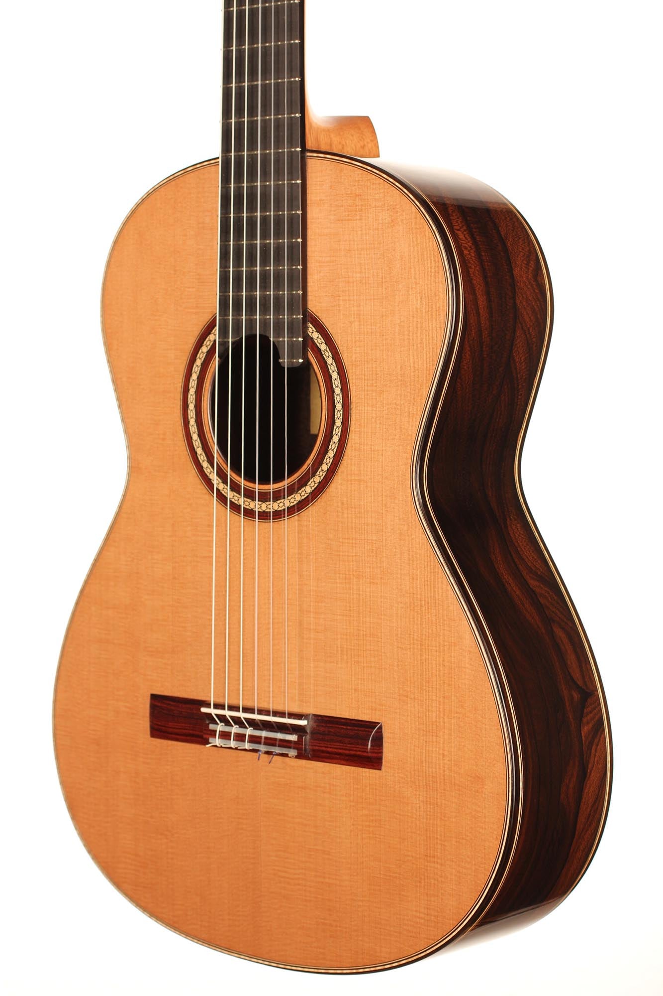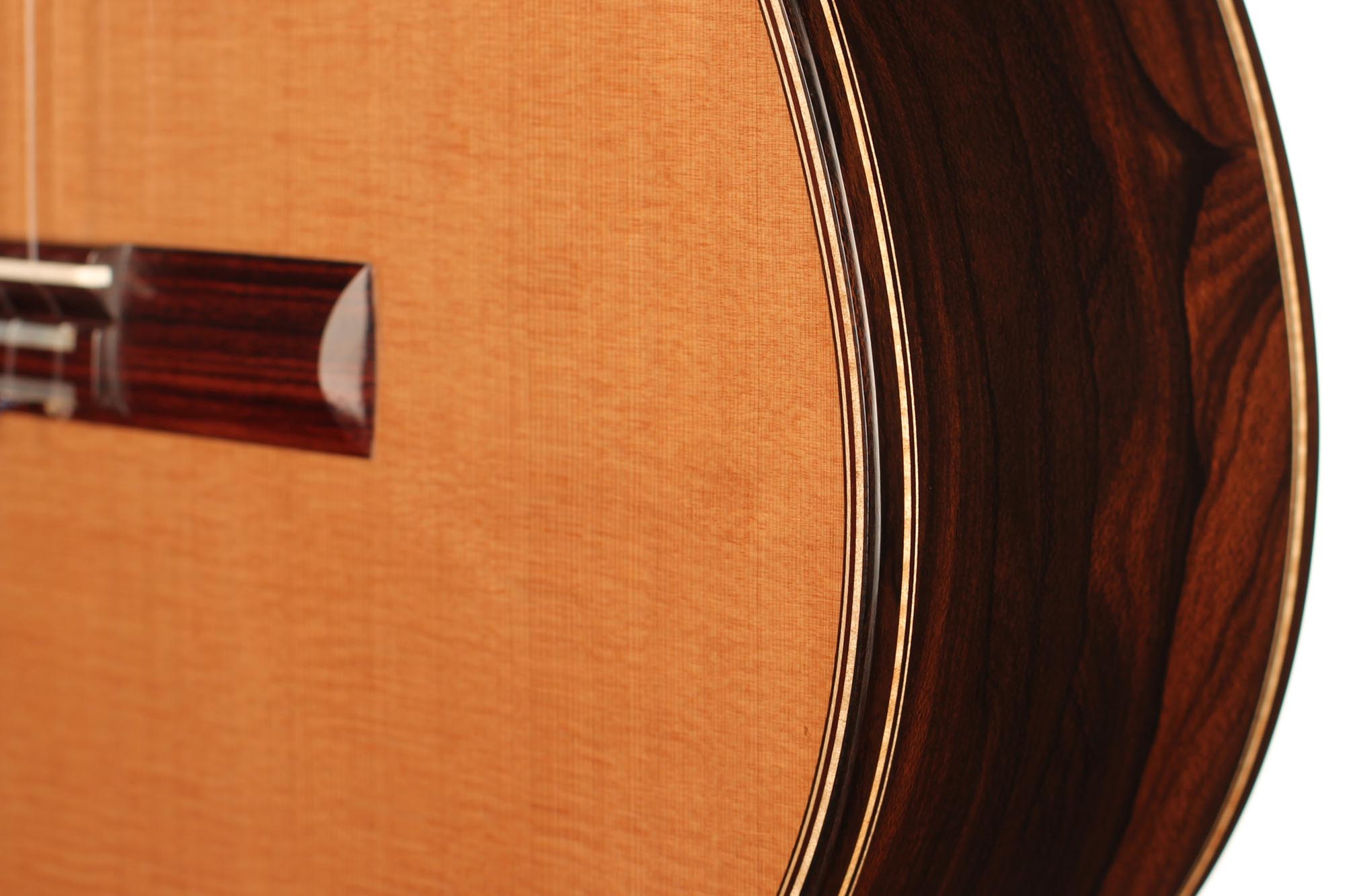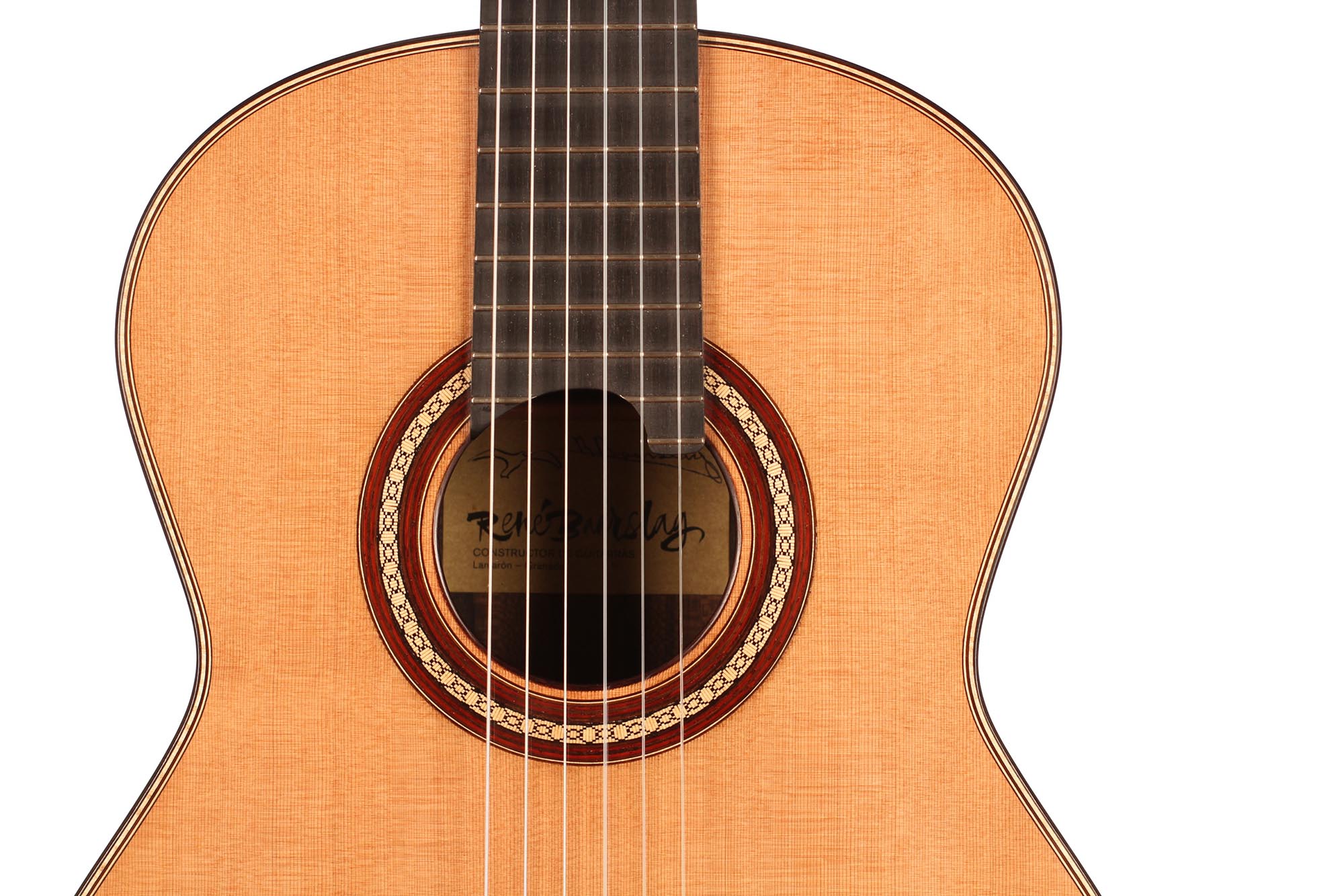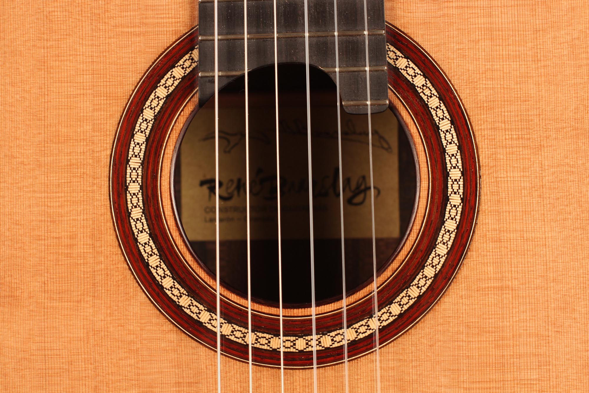 Für seine Gitarren verwendet René nur die besten Hölzer, welche mindestens zehn Jahre lang gelagert sind. Diese Gitarre wurde 2018 gebaut und hat eine Zederndecke. Boden und Zargen sind aus Ziricote. Die Mechaniken sind von Alessi. Dieses Instrument weist einige Spielspuren auf, ist aber in sehr gutem Zustand. Ein Hiscox Pro II Koffer ist inklusive.
