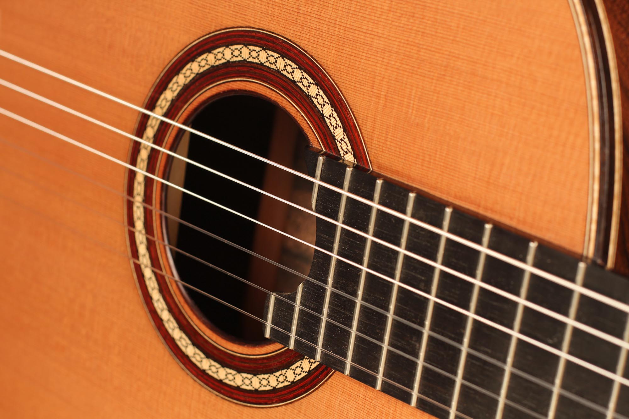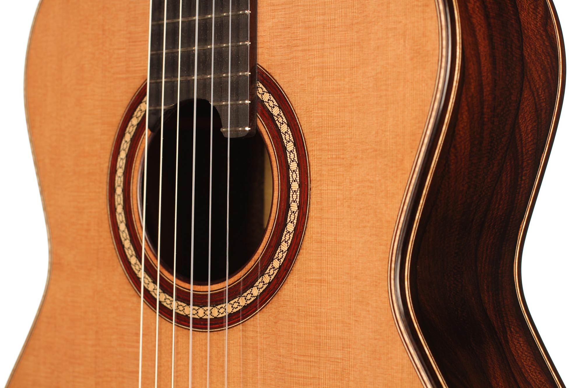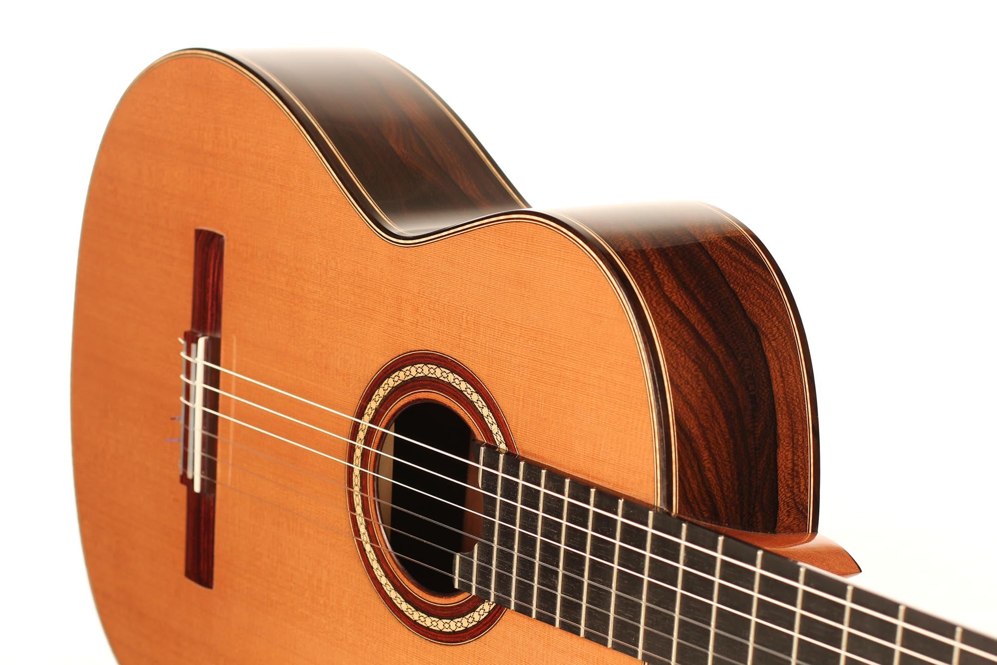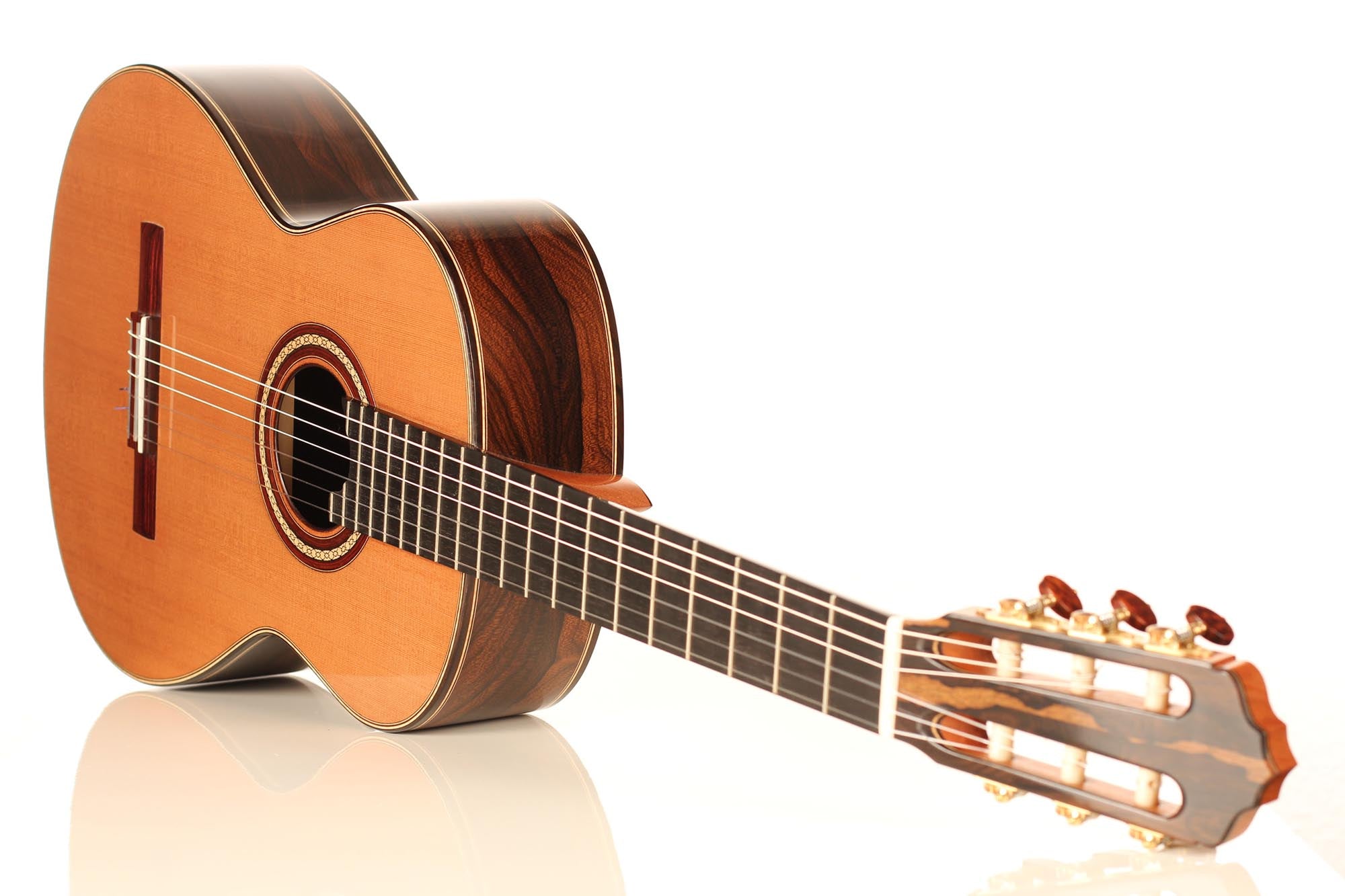 Für seine Gitarren verwendet René nur die besten Hölzer, welche mindestens zehn Jahre lang gelagert sind. Diese Gitarre wurde 2018 gebaut und hat eine Zederndecke. Boden und Zargen sind aus Ziricote. Die Mechaniken sind von Alessi. Dieses Instrument weist einige Spielspuren auf, ist aber in sehr gutem Zustand. Ein Hiscox Pro II Koffer ist inklusive.