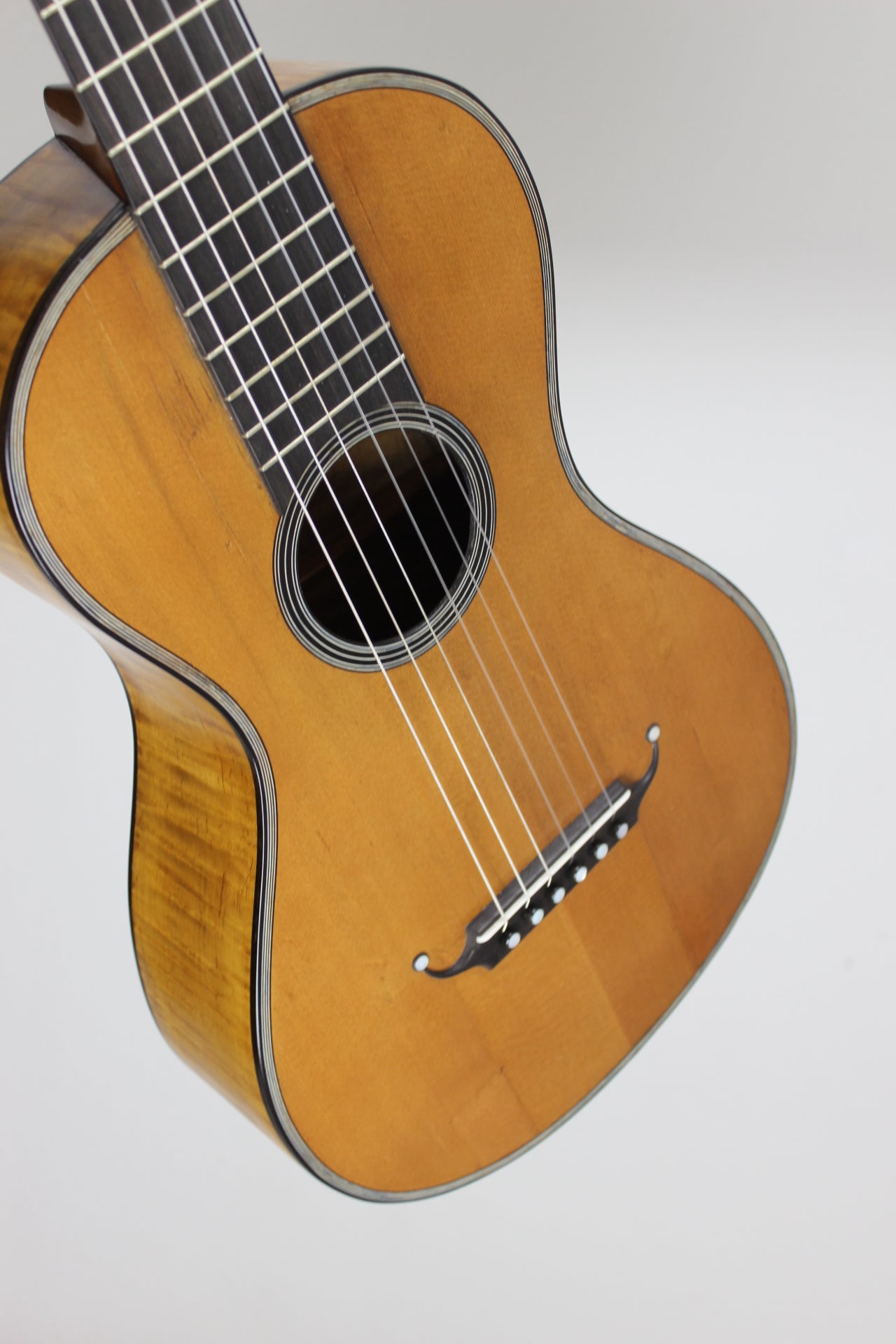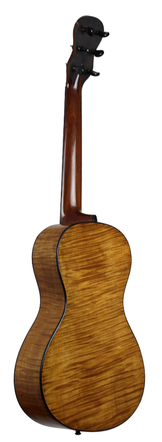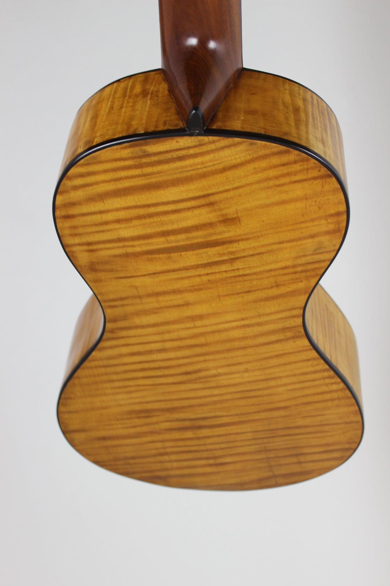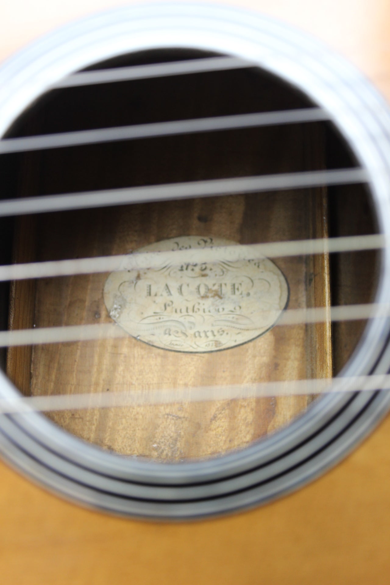Lacôte was always sensitive to the needs of musicians and composers, the best known of whom reigned at that time over the “musical life” of Paris, and he made his instruments trying to meet their desires. Lacôte carried on his work at various addresses, in the same quarter as his violin-maker colleagues Vuillaume, Chanot and Gand, very close to the Music Conservatory. He used at least three successive brands; he won awards in 1839 and 1844 during the Great National Exhibitions. His working life may be summed up as follows: Before 1818 he worked for Pons. In about 1819 he was in rue Montmartre, where he took over the workshop from his colleague Martin. In about 1823 he was in rue Neuve St-Eustache. In about 1823 he was in Place des Victoires, where he remained until 15th April 1829; then he moved to rue de Richelieu. In about 1832 he was in rue de Gramont. In about 1834 he was in rue de Louvois. In about 1843 he was still in rue de Louvois; also managing a shop in Ebury Street (London), starting the company “Lacôte & Cie”. In about 1850 he was in rue des Martyrs where he worked untill 1868 at least. This guitar has maple back back and sides. The neck ist made of solid mahogany. The machine-heads were replaced during the restoration but are like the original ones. Near the bridge two pieces of the top were replaced by Bernhard Kresse. Also the headplate was replaced. This Lacôte is full palyable and is in very good condition.