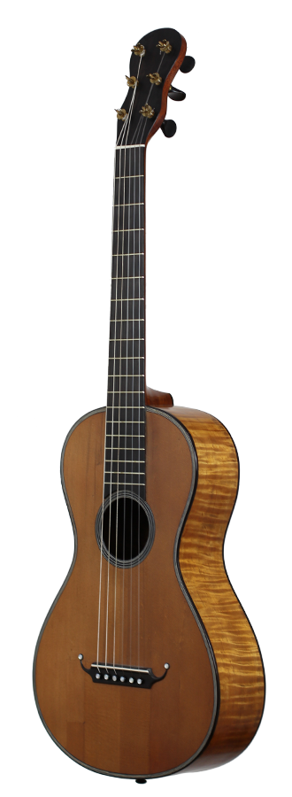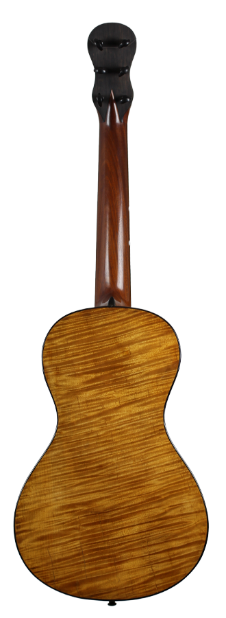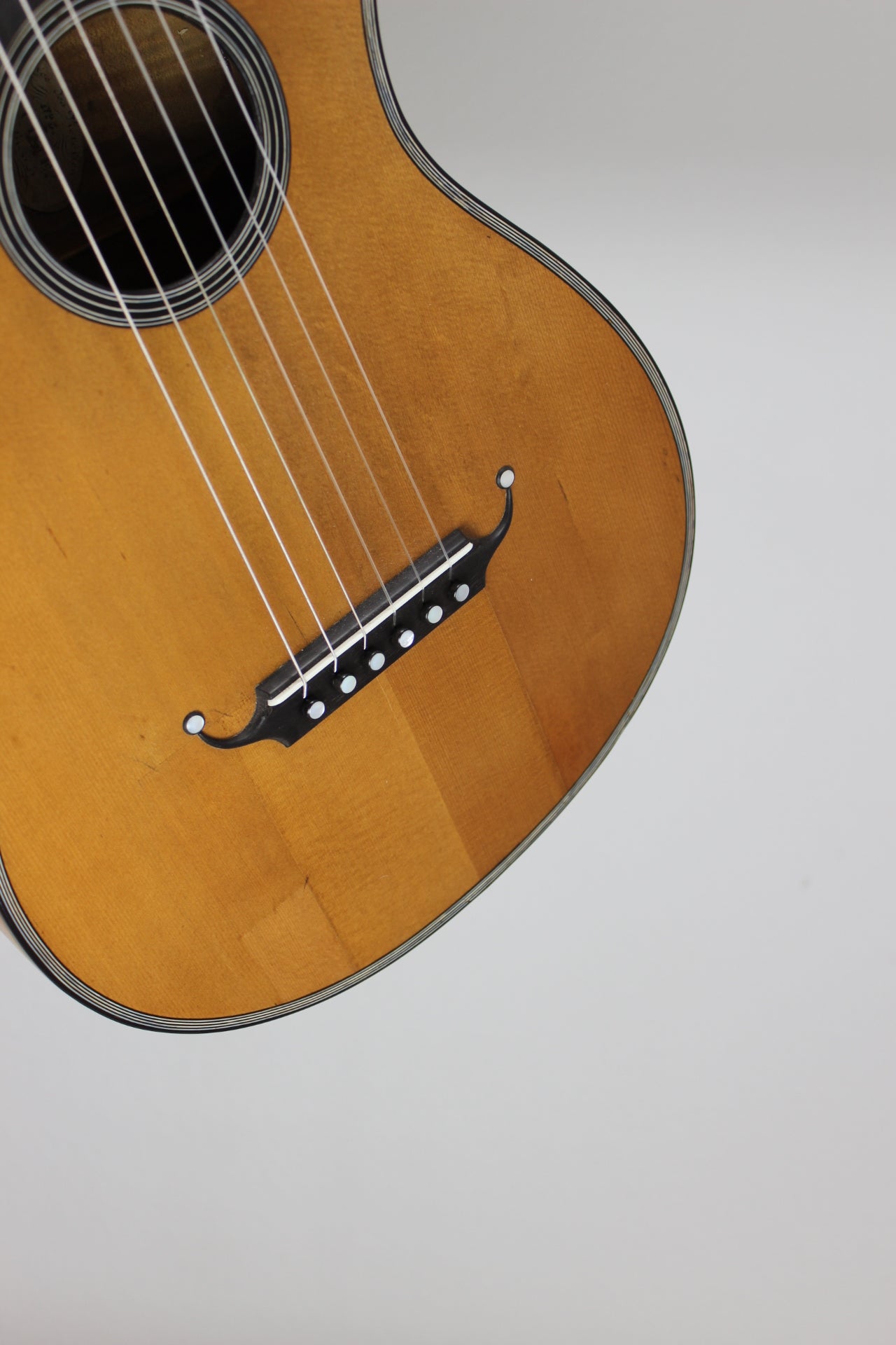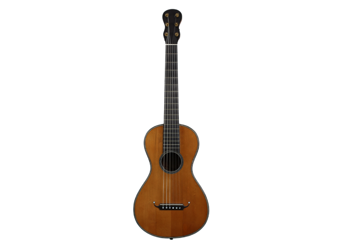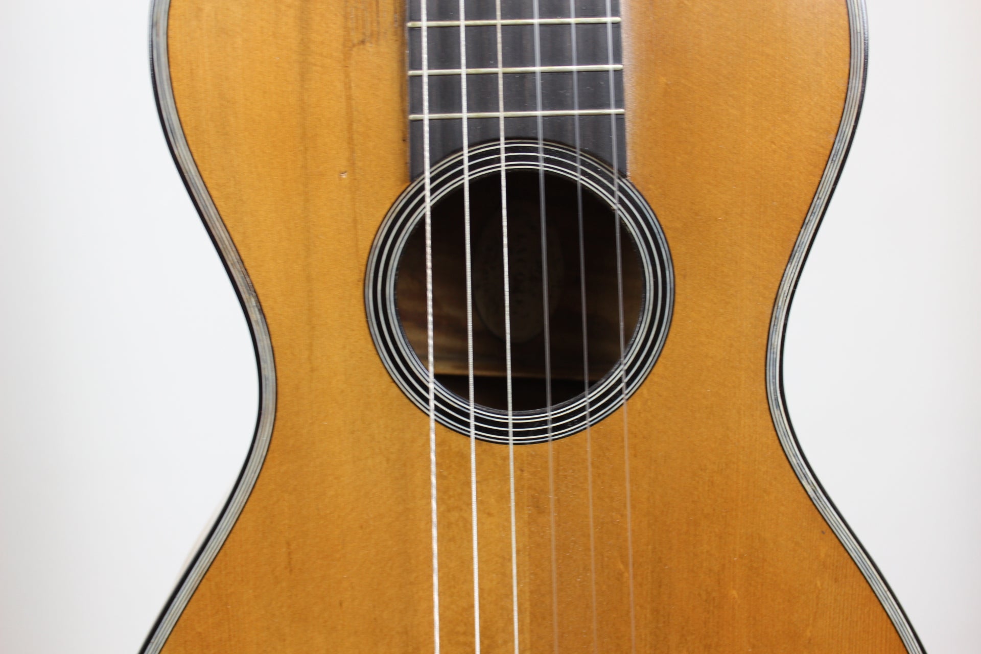 Lacôte was always sensitive to the needs of musicians and composers, the best known of whom reigned at that time over the “musical life” of Paris, and he made his instruments trying to meet their desires. Lacôte carried on his work at various addresses, in the same quarter as his violin-maker colleagues Vuillaume, Chanot and Gand, very close to the Music Conservatory. He used at least three successive brands; he won awards in 1839 and 1844 during the Great National Exhibitions. His working life may be summed up as follows: Before 1818 he worked for Pons. In about 1819 he was in rue Montmartre, where he took over the workshop from his colleague Martin. In about 1823 he was in rue Neuve St-Eustache. In about 1823 he was in Place des Victoires, where he remained until 15th April 1829; then he moved to rue de Richelieu. In about 1832 he was in rue de Gramont. In about 1834 he was in rue de Louvois. In about 1843 he was still in rue de Louvois; also managing a shop in Ebury Street (London), starting the company “Lacôte & Cie”. In about 1850 he was in rue des Martyrs where he worked untill 1868 at least. This guitar has maple back back and sides. The neck ist made of solid mahogany. The machine-heads were replaced during the restoration but are like the original ones. Near the bridge two pieces of the top were replaced by Bernhard Kresse. Also the headplate was replaced. This Lacôte is full palyable and is in very good condition.