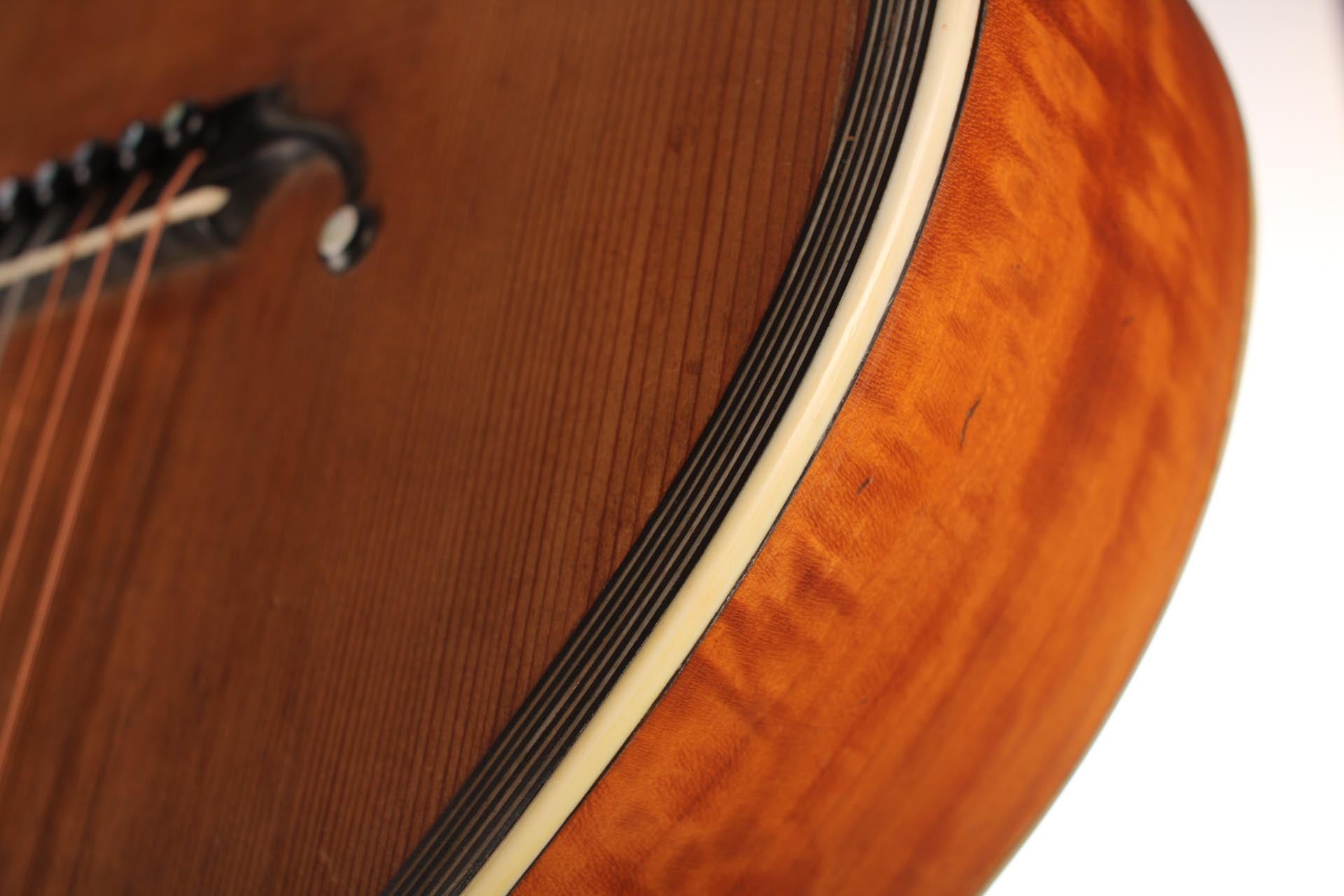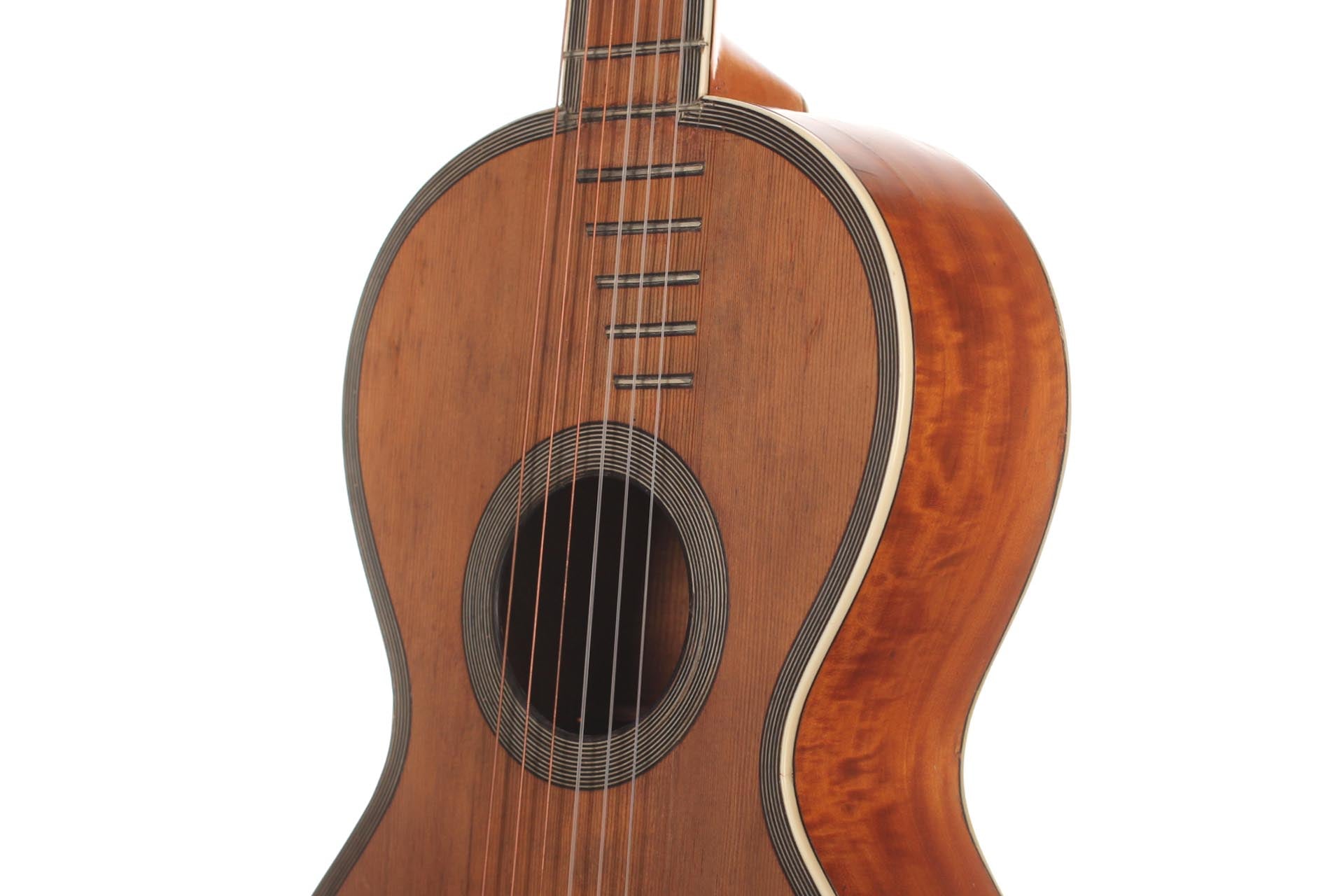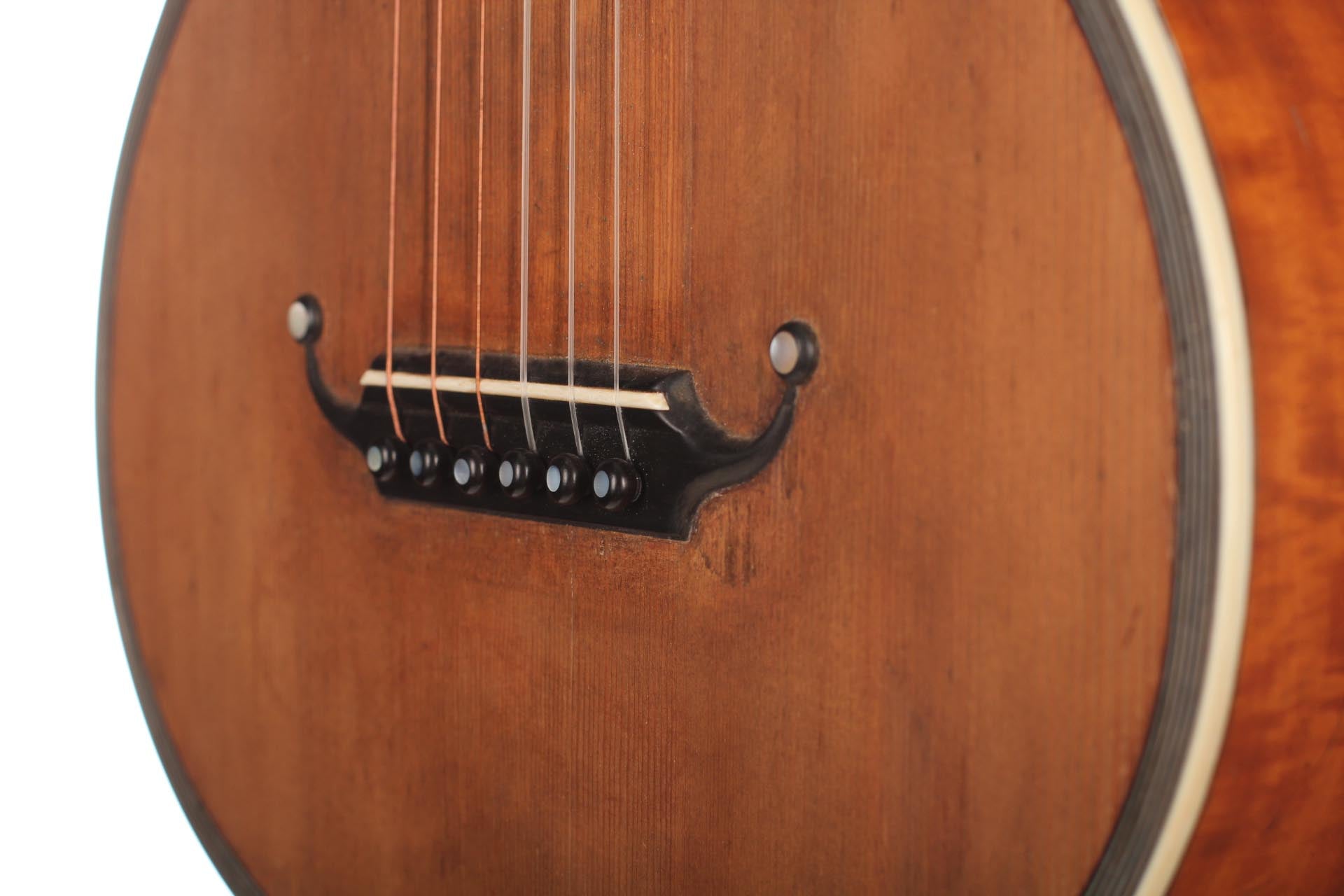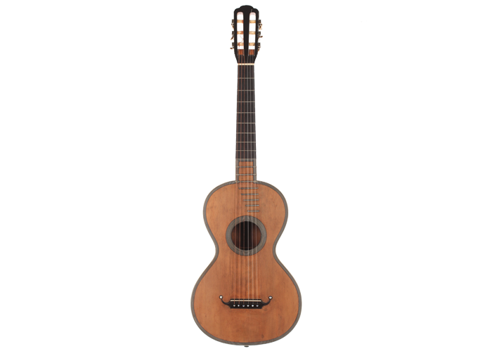 Seine Verbesserungen fanden durch intensive Kollaborationen mit berühmten Gitarristen wie Sor, Aguado, Carulli, Giuliani e Coste, statt. Im Jahr 1839 und 1844 gewann Lacôte Preise für seine Gitarren bei den "Expositions Universelles de Paris". Mit seiner Werkstatt war er öfters an verschiedene Orte umgezogen, aber immer im gleichen Viertel wo auch seine Kollegen arbeiteten und wo sich auch das Konservatorium befand. Um 1819 übernahm er die Werkstatt seines Kollegen Martin. Um 1823 arbeitete er in der "Rue Neuve St-Eustache" und um 1833 in der "Place des Victoires" wo er bis zum 15. April 1829 verblieb um danach in die "Rue de Richelieu" umzuziehen. Weitere Adressen lauten: - Rue de Gramont (ca. 1832) - Rue de Louvois (ca.1834) - Rue des Martyrs (ca. 1850-1868). Diese Gitarre von René Lacôte wurde für den Händler Bernardel im Jahre 1840 gebaut. Der Boden besteht aus Satinwood and ist mit Fichte laminiert. Die Zargen sind aus massivem Zitronenholz. Der Hals besteht aus massivem Ahorn. Die Meachniken sind aus der selben Zeit wurden jedoch ersetzt. Insgesamt befindet sich die Gitarre in sehr gutem Zustand.