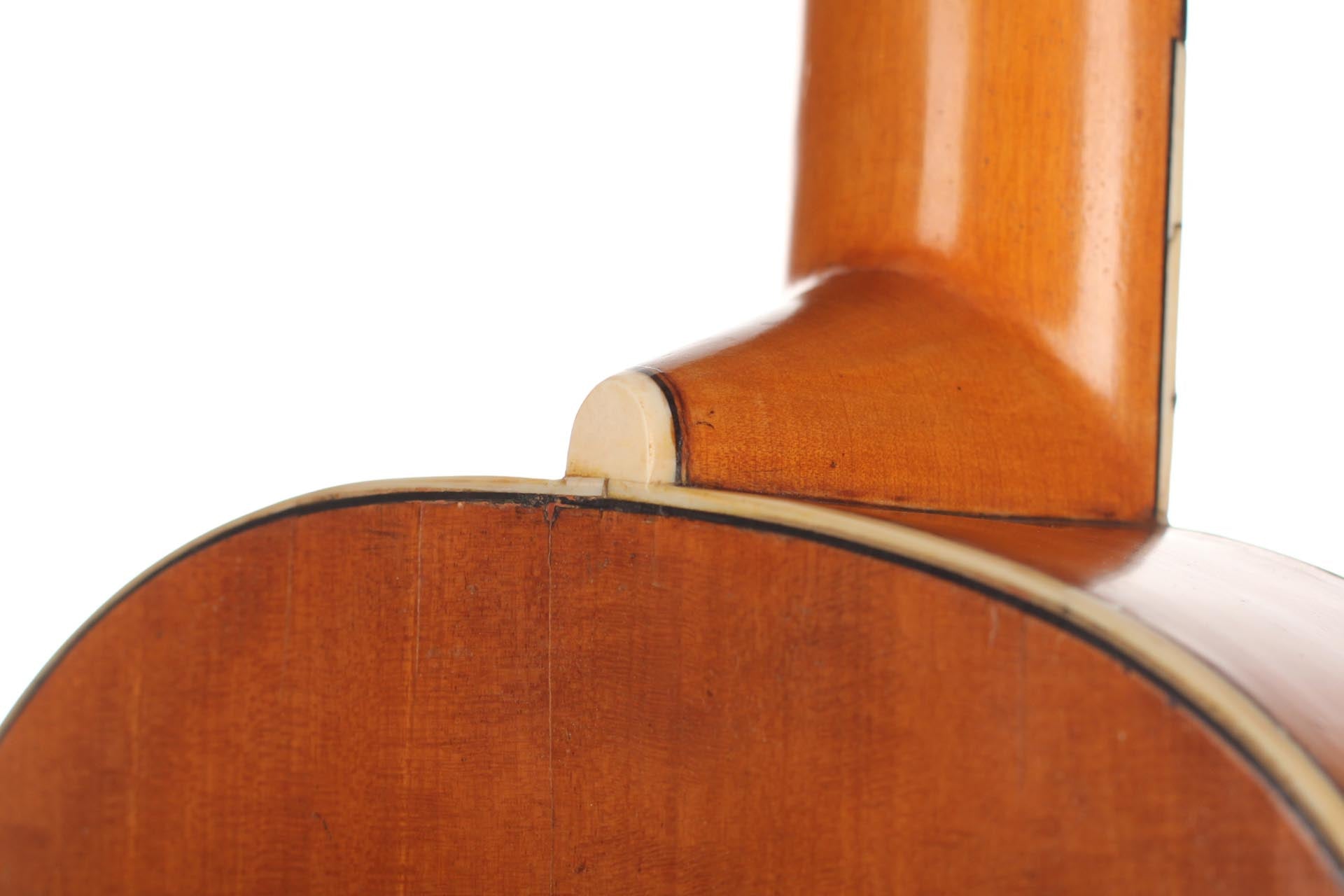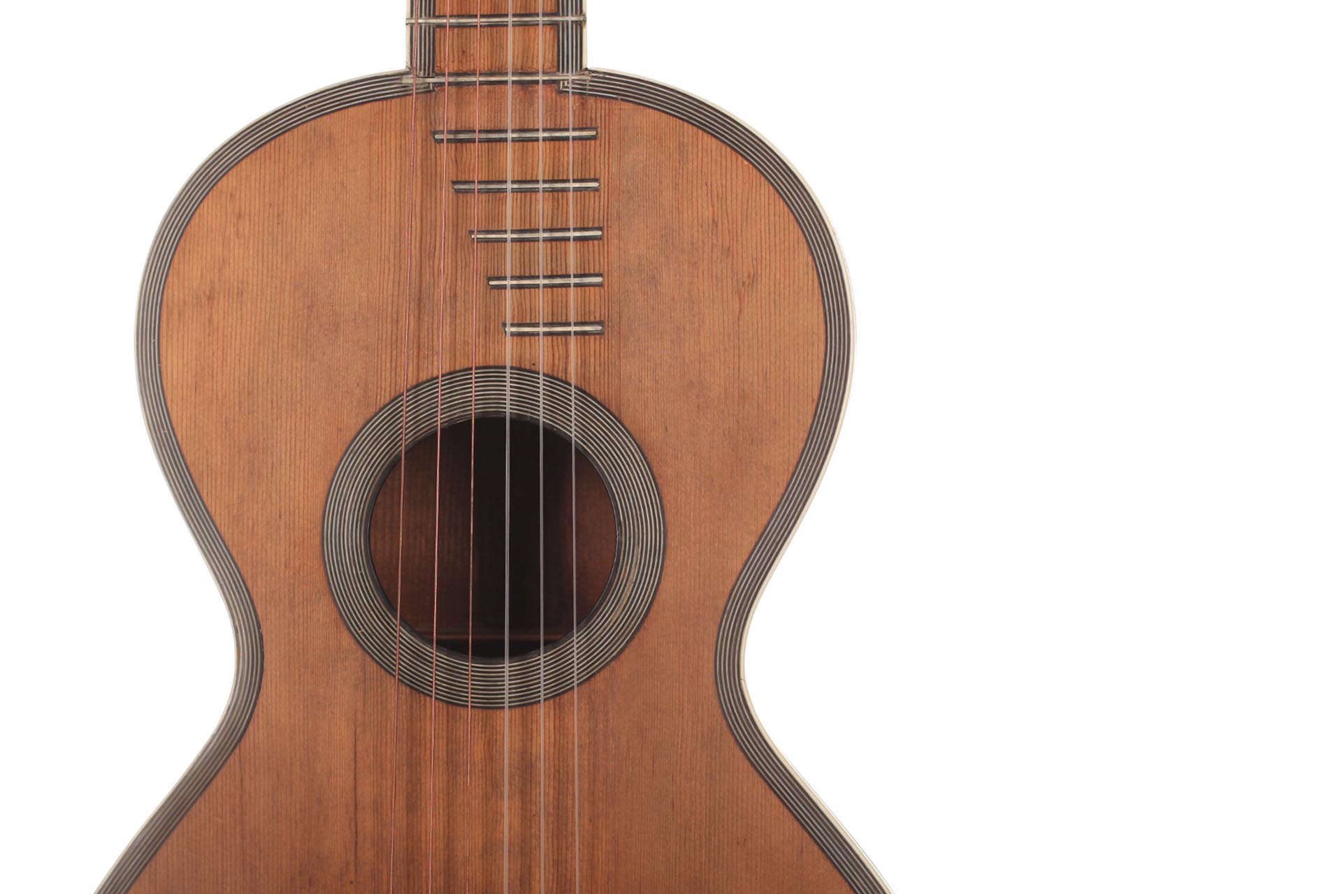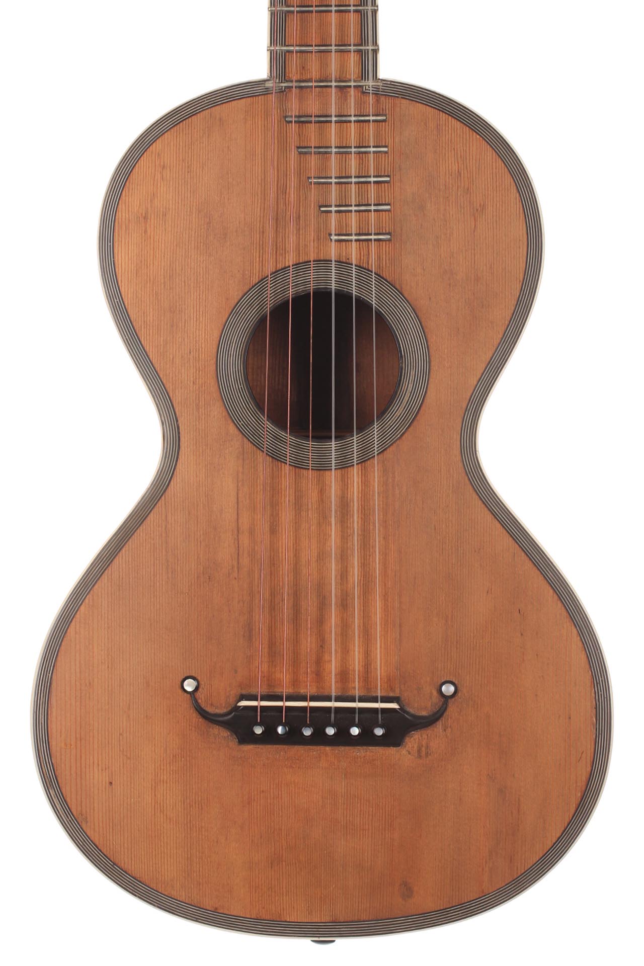 Seine Verbesserungen fanden durch intensive Kollaborationen mit berühmten Gitarristen wie Sor, Aguado, Carulli, Giuliani e Coste, statt. Im Jahr 1839 und 1844 gewann Lacôte Preise für seine Gitarren bei den "Expositions Universelles de Paris". Mit seiner Werkstatt war er öfters an verschiedene Orte umgezogen, aber immer im gleichen Viertel wo auch seine Kollegen arbeiteten und wo sich auch das Konservatorium befand. Um 1819 übernahm er die Werkstatt seines Kollegen Martin. Um 1823 arbeitete er in der "Rue Neuve St-Eustache" und um 1833 in der "Place des Victoires" wo er bis zum 15. April 1829 verblieb um danach in die "Rue de Richelieu" umzuziehen. Weitere Adressen lauten: - Rue de Gramont (ca. 1832) - Rue de Louvois (ca.1834) - Rue des Martyrs (ca. 1850-1868). Diese Gitarre von René Lacôte wurde für den Händler Bernardel im Jahre 1840 gebaut. Der Boden besteht aus Satinwood and ist mit Fichte laminiert. Die Zargen sind aus massivem Zitronenholz. Der Hals besteht aus massivem Ahorn. Die Meachniken sind aus der selben Zeit wurden jedoch ersetzt. Insgesamt befindet sich die Gitarre in sehr gutem Zustand.