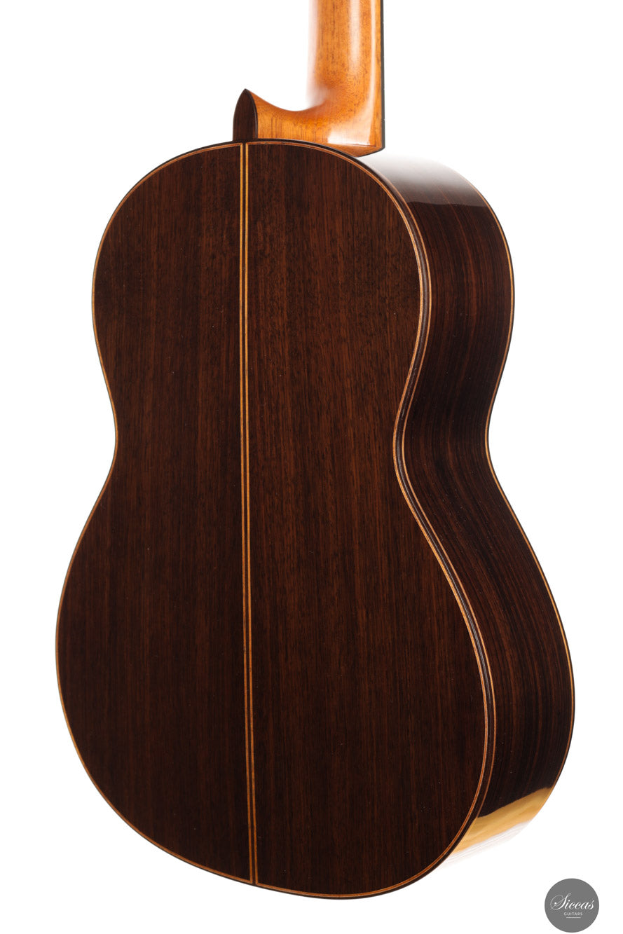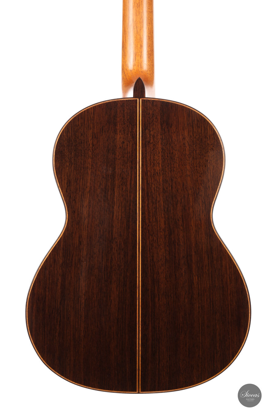 Dieses Doubletop-Modell von Reza Safavian aus dem Jahr 2025 verkörpert seinen ausgereiften und eigenständigen Ansatz im modernen Konzertgitarrenbau. Mit einer Decke aus Zeder sowie Boden und Zargen aus indischem Palisander vereint die Gitarre alle charakteristischen Merkmale einer erstklassigen Doppeldeckenkonstruktion, darunter geringes Gewicht, hervorragende akustische Effizienz und fein abgestimmte Ansprache. Die klangliche Balance ist beeindruckend: Die Bässe sind tief und klar definiert, während die Höhen artikuliert und zugleich warm und brillant erklingen. Jeder Ton trägt ein vollmundiges Sustain und einen edlen Klangcharakter, der zu ausdrucksstarker Phrasierung über den gesamten Tonumfang einlädt. Besonders hervorzuheben ist die polyphone Klarheit, die komplexe harmonische Strukturen präzise und transparent abbildet.