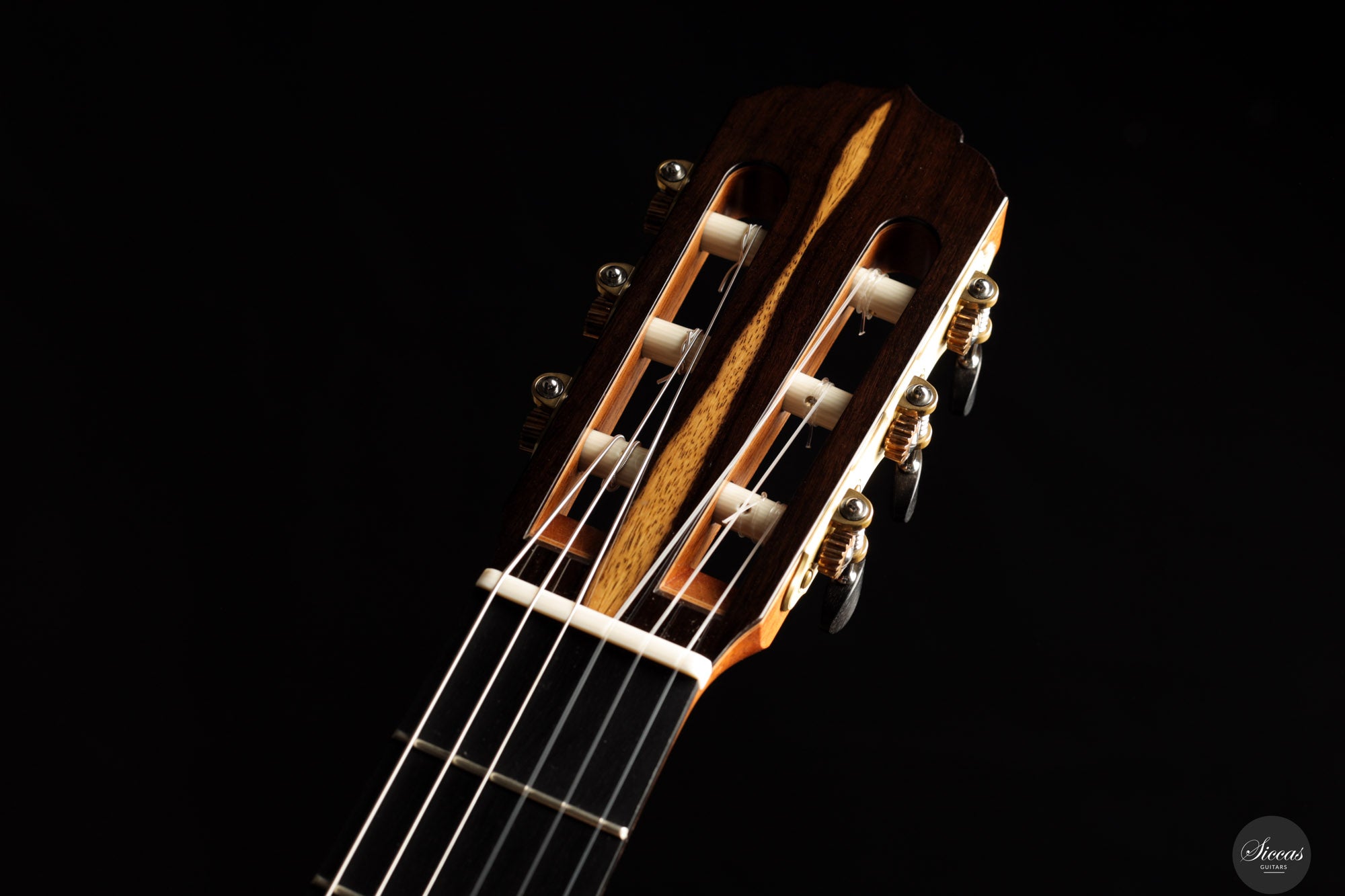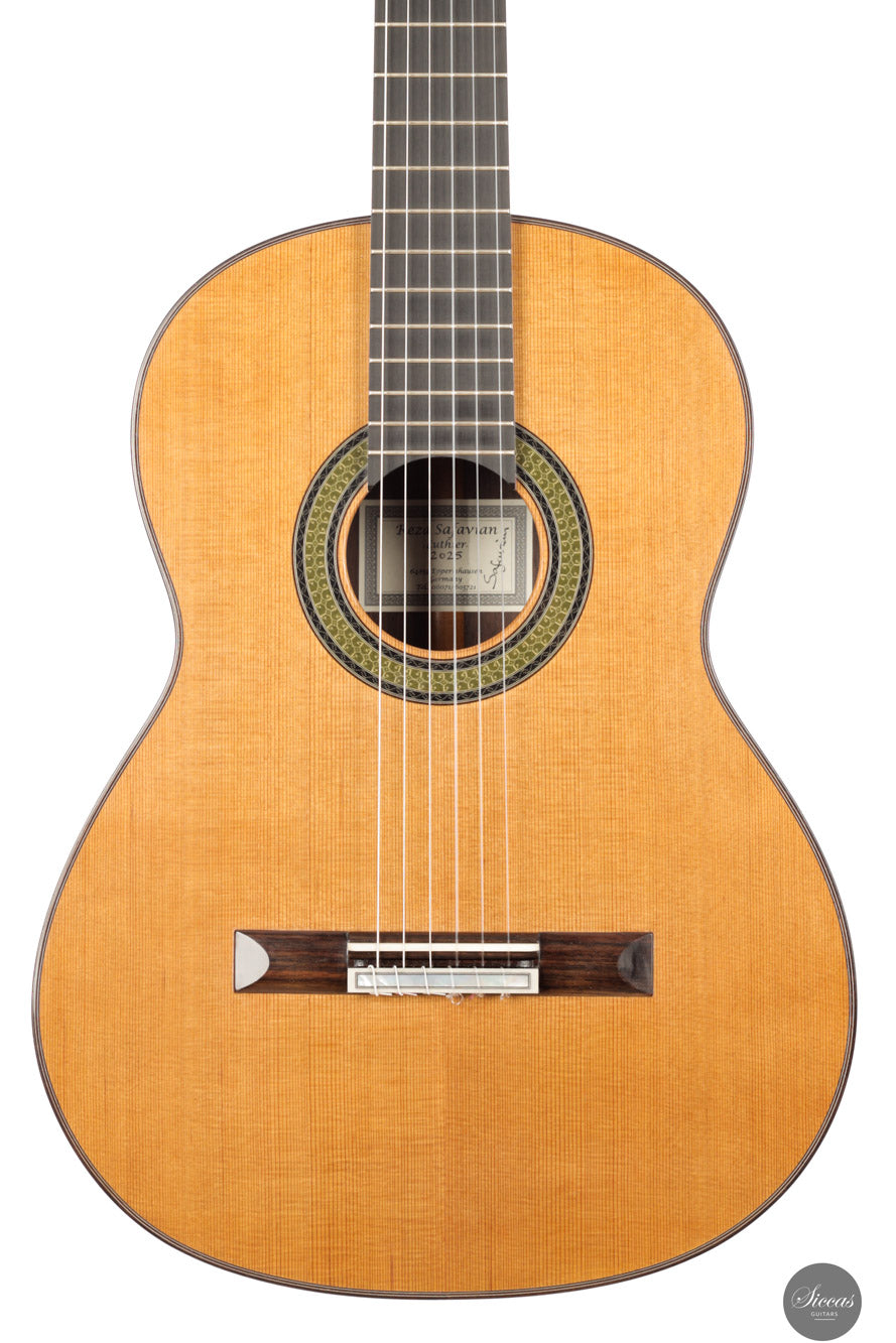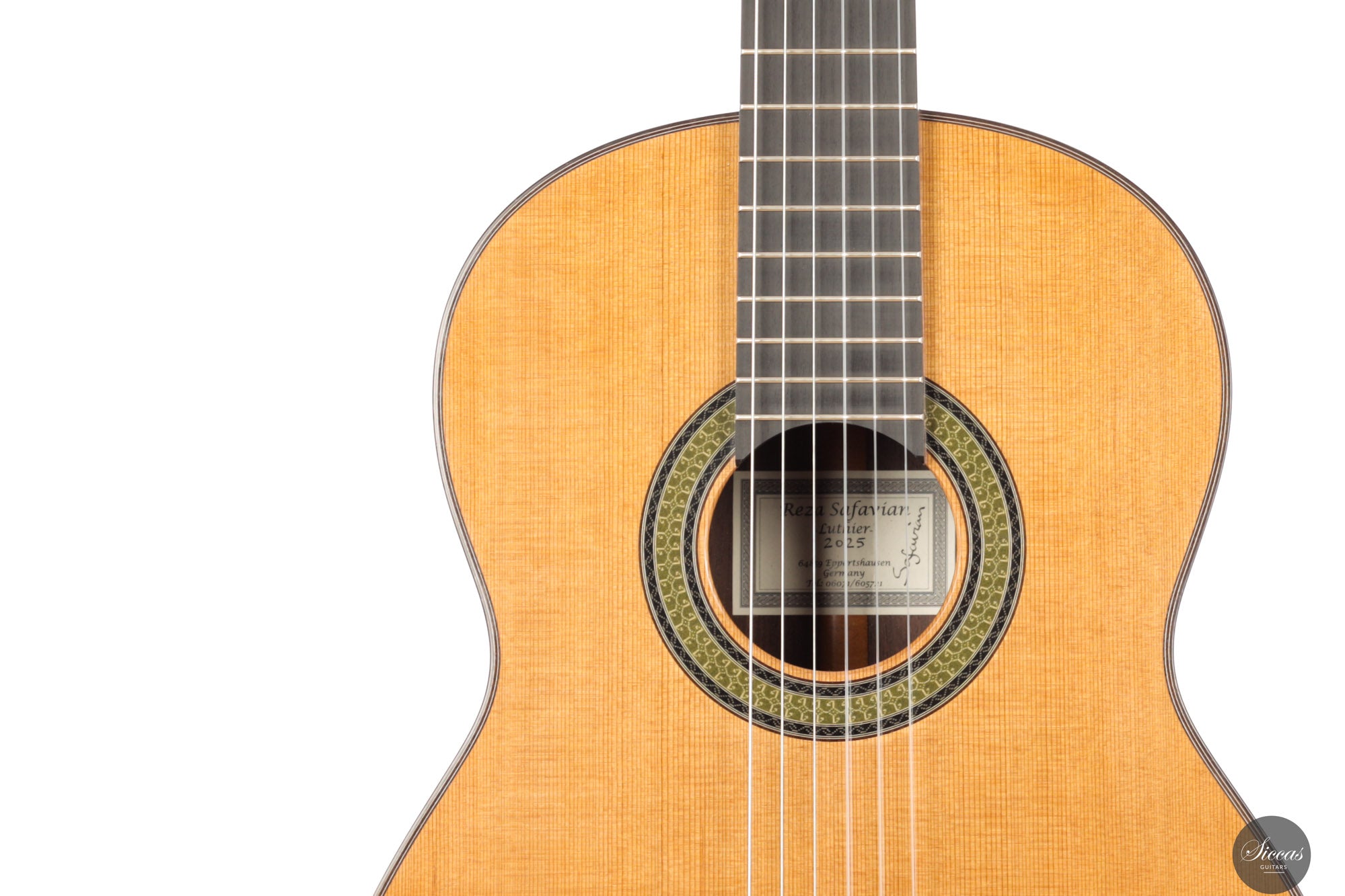 Reza Safavian is a German luthier of Iranian descent whose reputation has grown steadily within the world of elite double-top concert guitars. Born in Iran and based in France since the early 1980s, Safavian originally trained as a classical guitarist. A televised concert by Wilfried Halter had a lasting impact on him, prompting his move to Germany to study with Halter at the Frankfurt Conservatory of Music (Dr. Hoch’s Konservatorium). Alongside his musical career, Safavian developed a strong interest in luthiery, especially after struggling to find guitars that met his tonal expectations. He met Matthias Dammann in 1996, purchased one of his guitars, and soon began building his own. His first classical guitar with a double-top soundboard was completed in 2001, and by 2003, he had begun constructing guitars full-time. Today, he lives and works in Eppsteinhausen, a small town near Frankfurt am Main, where he produces a limited number of guitars each year, placing strong emphasis on wood selection, tonal balance, and projection. His collaboration and friendship with Dammann continue to influence his work, and the two even share the same tonewood supplier. Aesthetically, his guitars are classically styled but marked by subtle personal touches such as rosettes inspired by antique Persian motifs and carefully matched decorative veneers. Safavian’s instruments are built for concert use and reflect a clear focus on tonal sophistication and acoustic control. Their responsiveness and projection allow players to explore a wide dynamic range without losing clarity or richness. Reza’s guitars have found a growing audience among musicians who value their ability to deliver both power and nuance with equal refinement.About the guitar