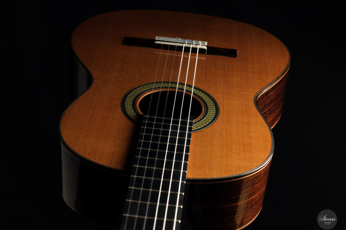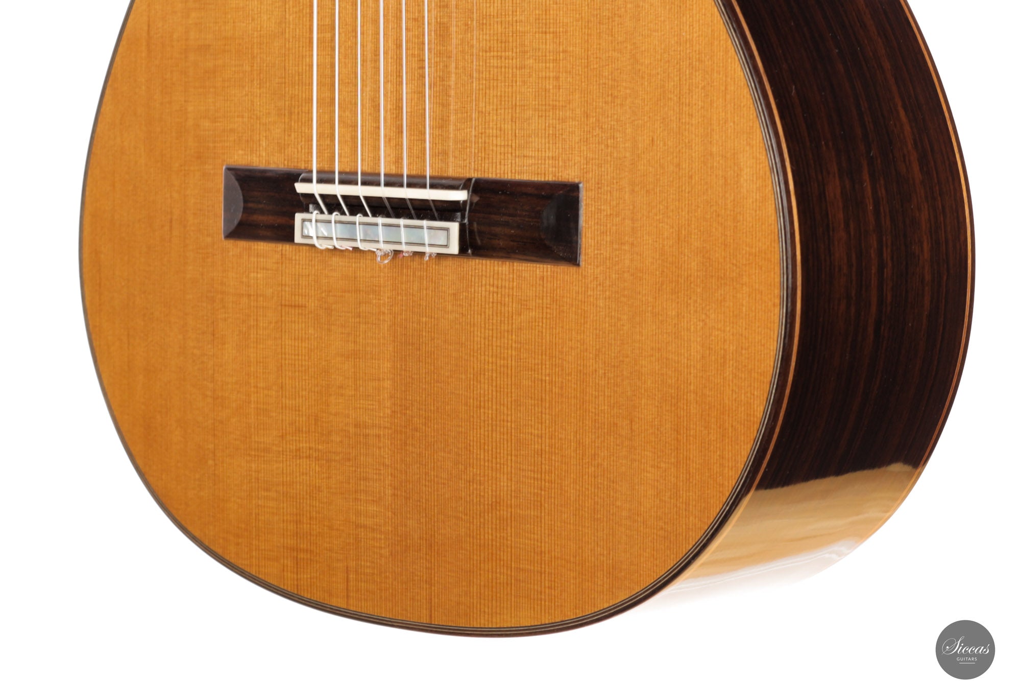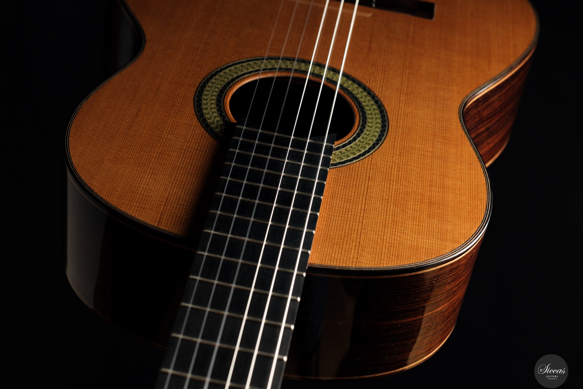 This 2025 double-top model by Reza Safavian exemplifies his mature and distinctive approach to modern concert guitar building. Featuring a cedar top and Indian rosewood back and sides, the guitar integrates the hallmark attributes of a world-class double-top, including lightweight construction, excellent acoustic efficiency, and finely tuned dynamic response. The tonal balance is impressive: the basses are deep and clearly defined, while the trebles are articulate, projecting with both brilliance and warmth. Each note carries full-bodied sustain and a refined timbre that invites expressive phrasing across the entire register. Polyphonic clarity is particularly notable, supporting complex harmonies without loss of detail. Whether at home, in solo performance, or chamber contexts, this highly refined guitar is ideally suited for players seeking projection without sacrificing nuance.