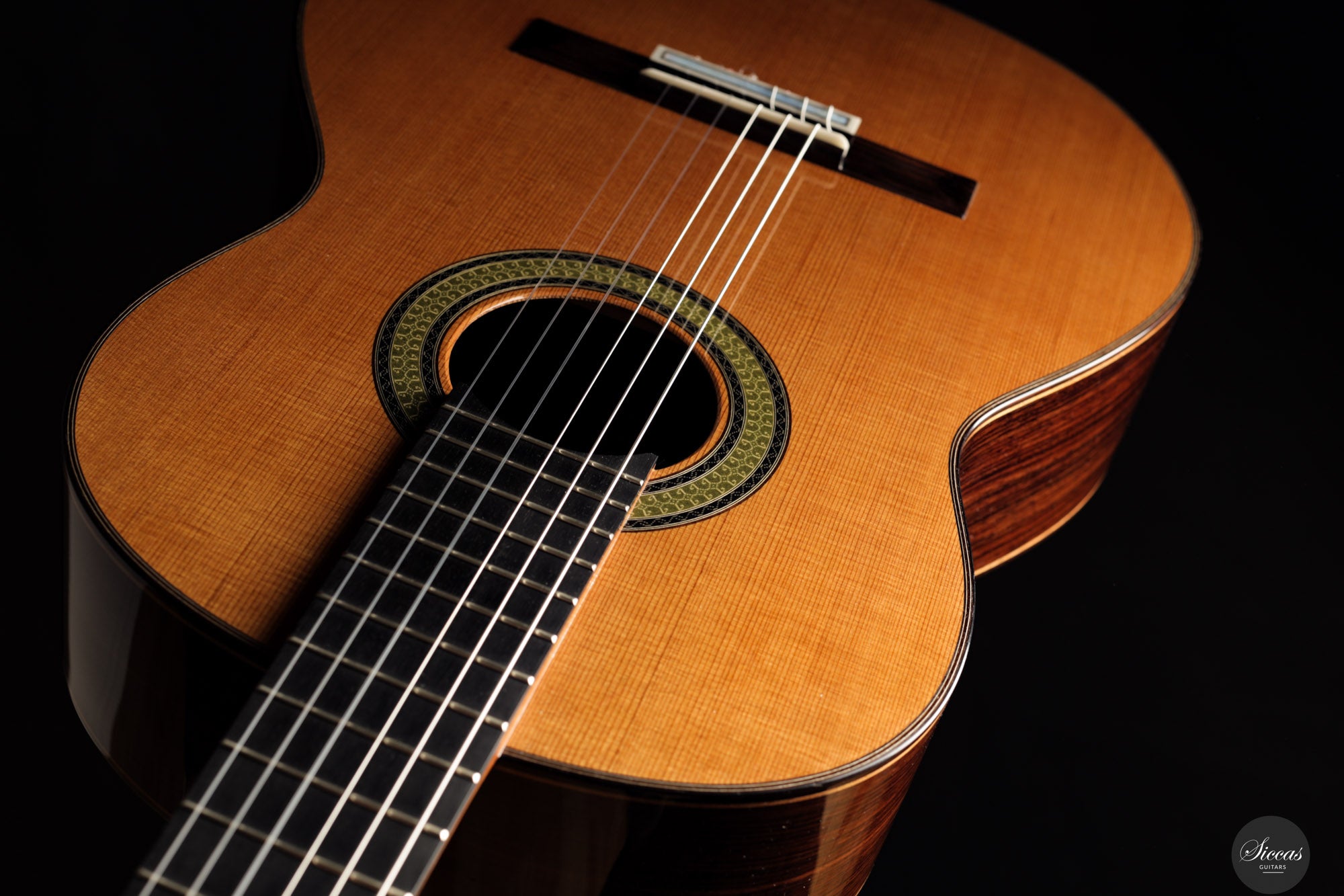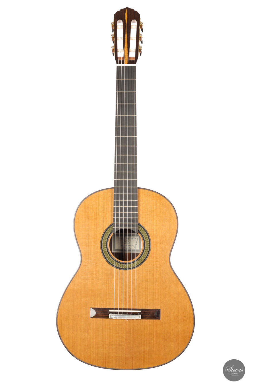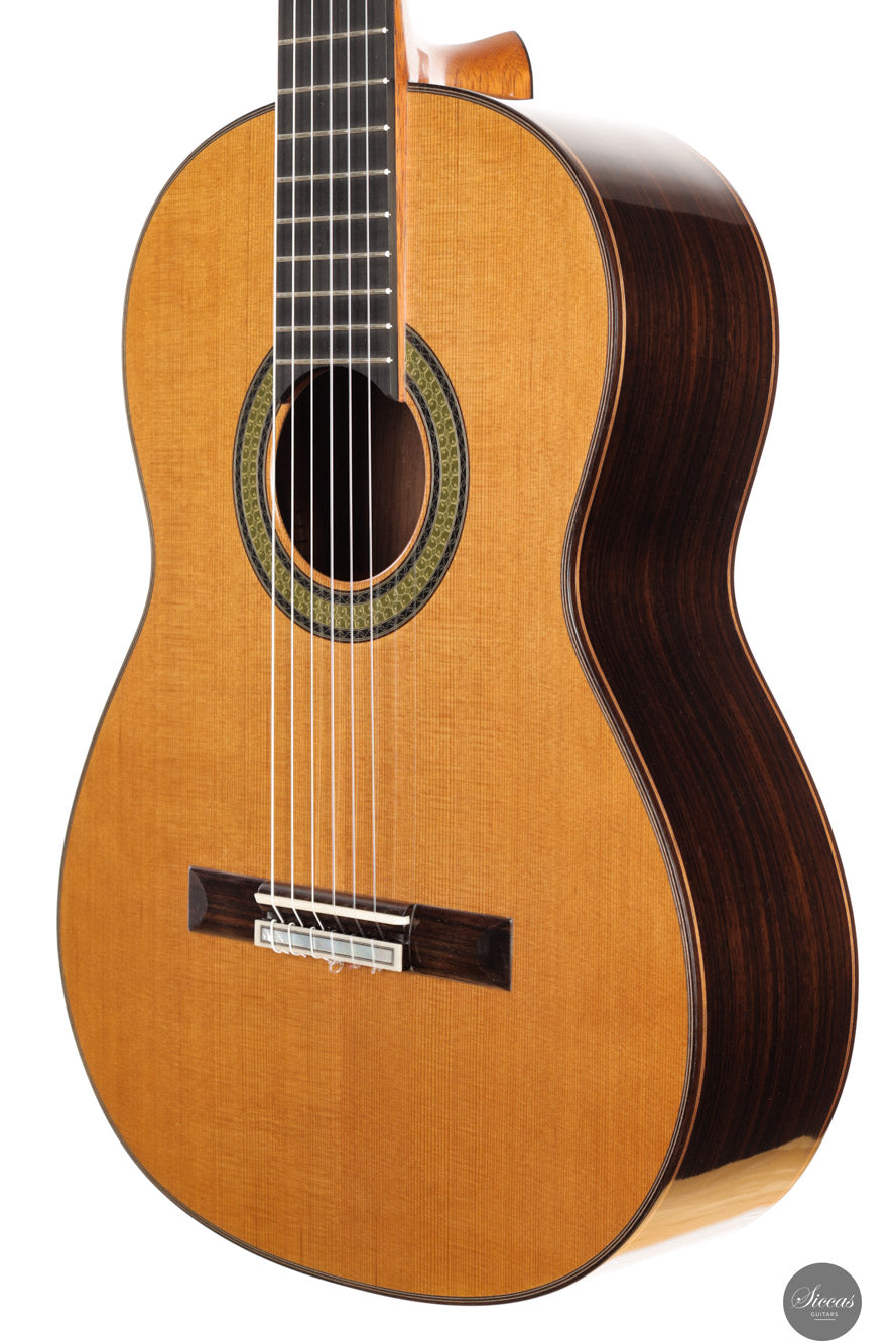 This 2025 double-top model by Reza Safavian exemplifies his mature and distinctive approach to modern concert guitar building. Featuring a cedar top and Indian rosewood back and sides, the guitar integrates the hallmark attributes of a world-class double-top, including lightweight construction, excellent acoustic efficiency, and finely tuned dynamic response. The tonal balance is impressive: the basses are deep and clearly defined, while the trebles are articulate, projecting with both brilliance and warmth. Each note carries full-bodied sustain and a refined timbre that invites expressive phrasing across the entire register. Polyphonic clarity is particularly notable, supporting complex harmonies without loss of detail. Whether at home, in solo performance, or chamber contexts, this highly refined guitar is ideally suited for players seeking projection without sacrificing nuance.