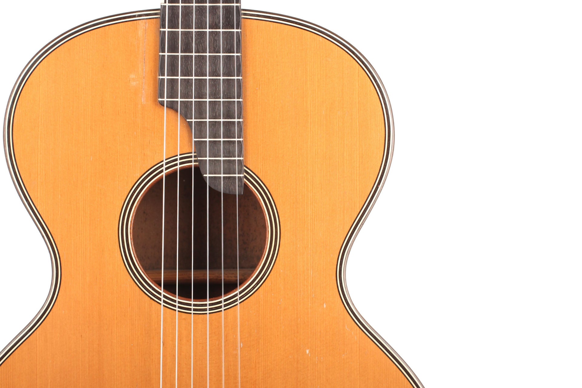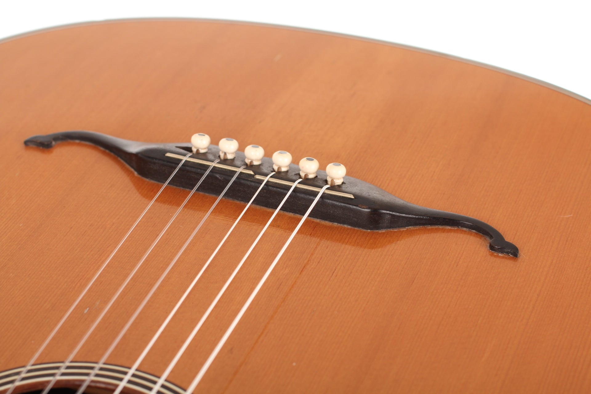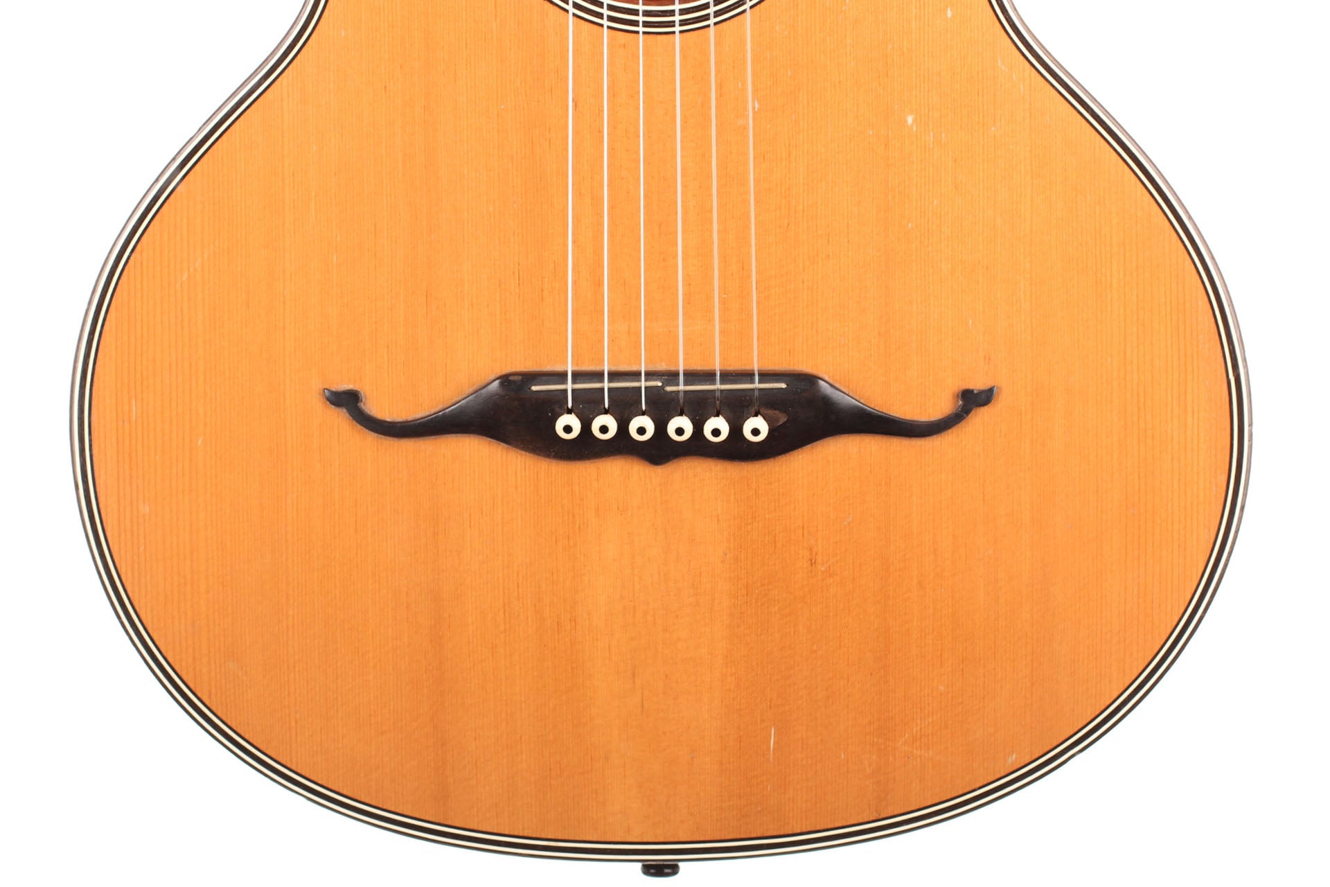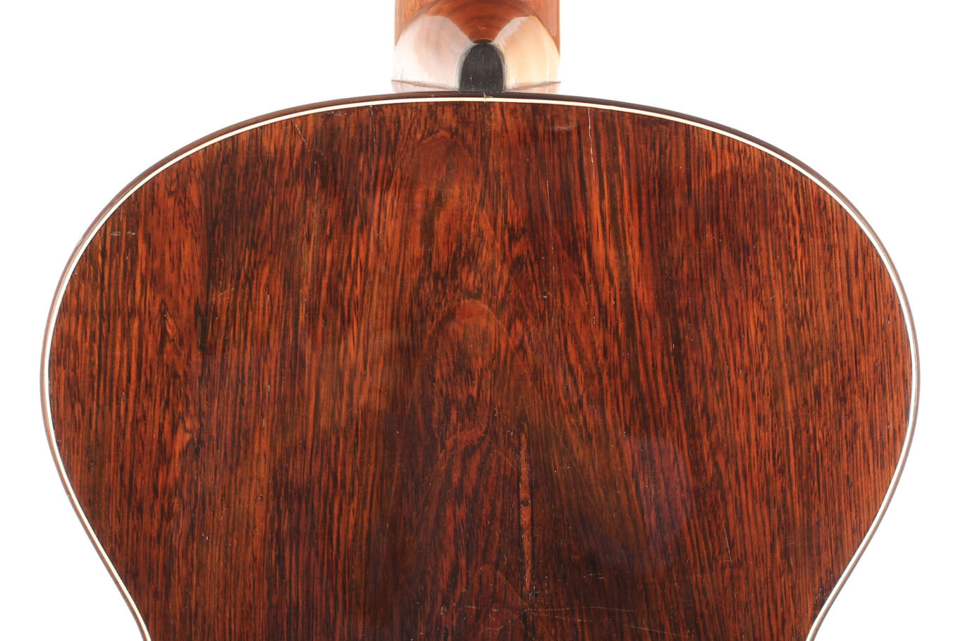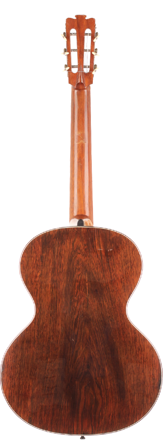 Die Decke ist zweiteilig und aus nussbraun gebeizter Fichte gefertigt. Umrahmt wird die Decke von weißen und schwarzen Einlagen die aus Knochen und vermutlich dunkel gebeiztem Birnenholz bestehen. Die Randeinlagen finden sich erneut in gleicher Anordnung um das Schallloch über das auch das Griffbrett ragt. Der Steg ist mit Ranken verziert und aus einem Stück gearbeitet. Der Boden ist zweiteilig, gewölbt und besteht wie auch die Zargen aus Palisander. Der Kopf ist mit dem Hals verzapft und der Hals ist mit dem Korpus verschraubt. Das Griffbrett, das bis über das Schallloch reicht, ist gekehlt. Auf der Decke, links neben dem Griffbrett befindet sich ein reparierter Riss. Ebenso auf dem Boden sind kleine feine stabile Haarrisse sichtbar.