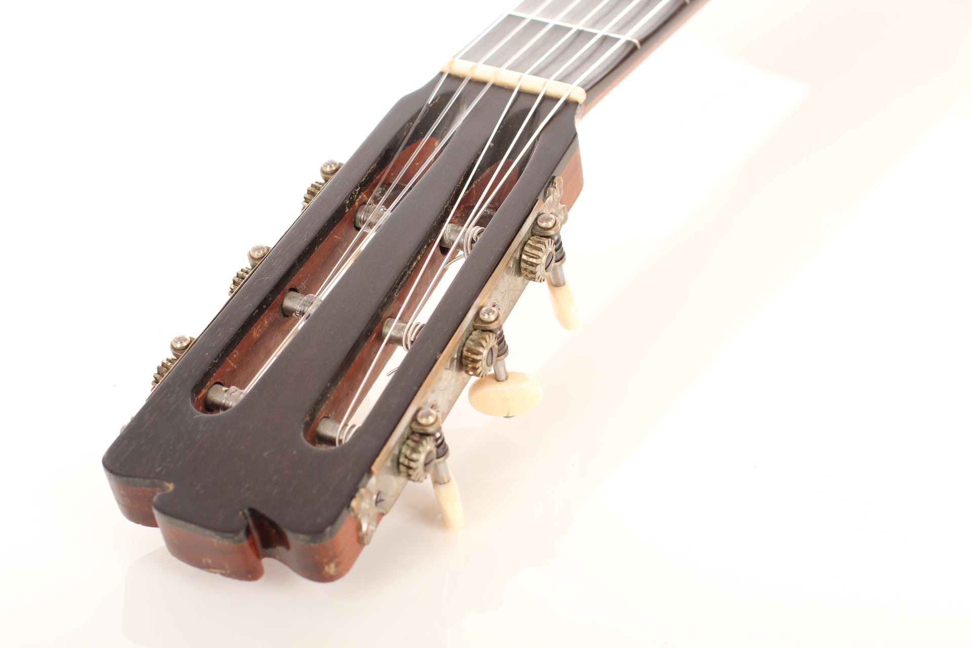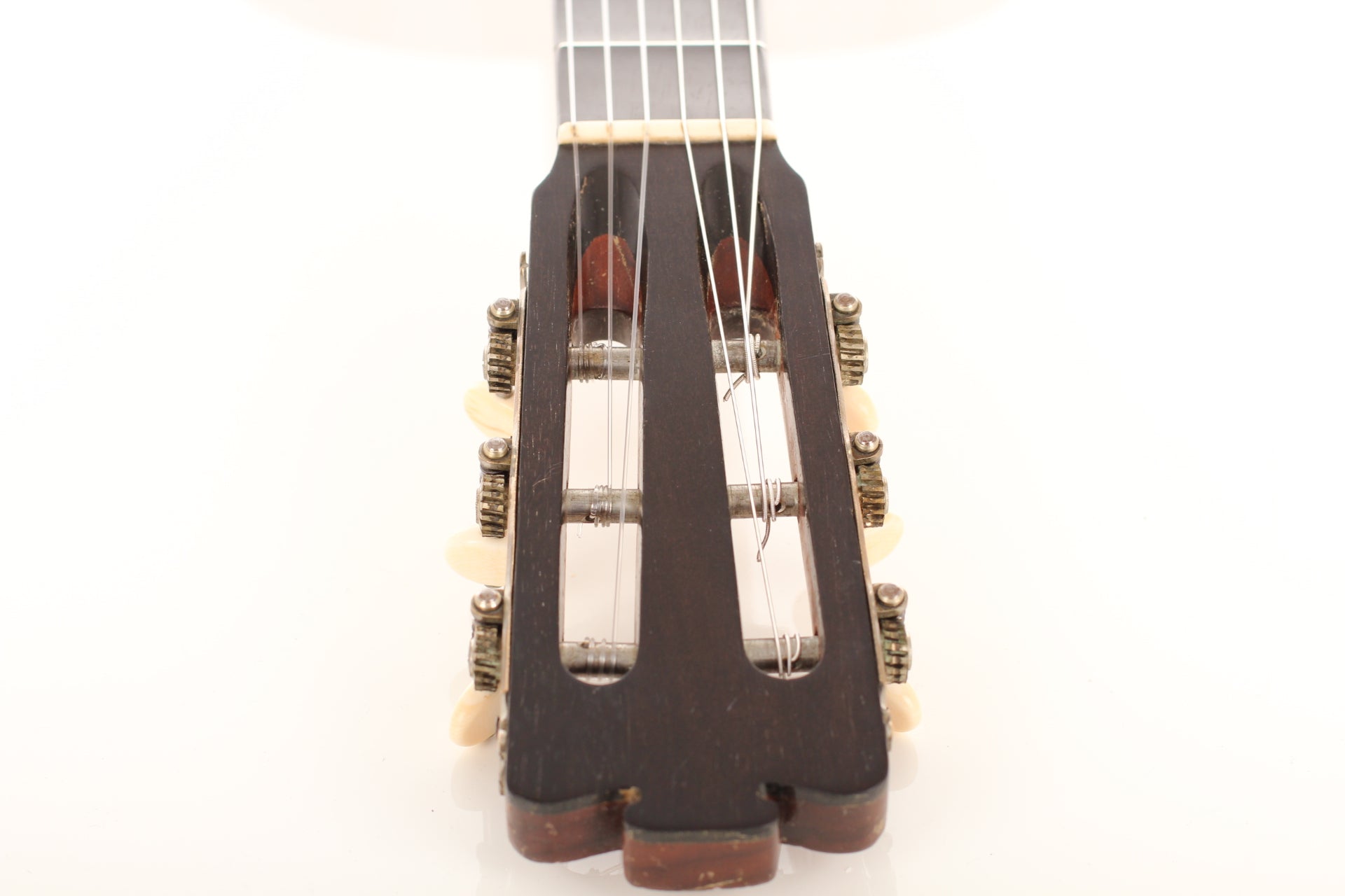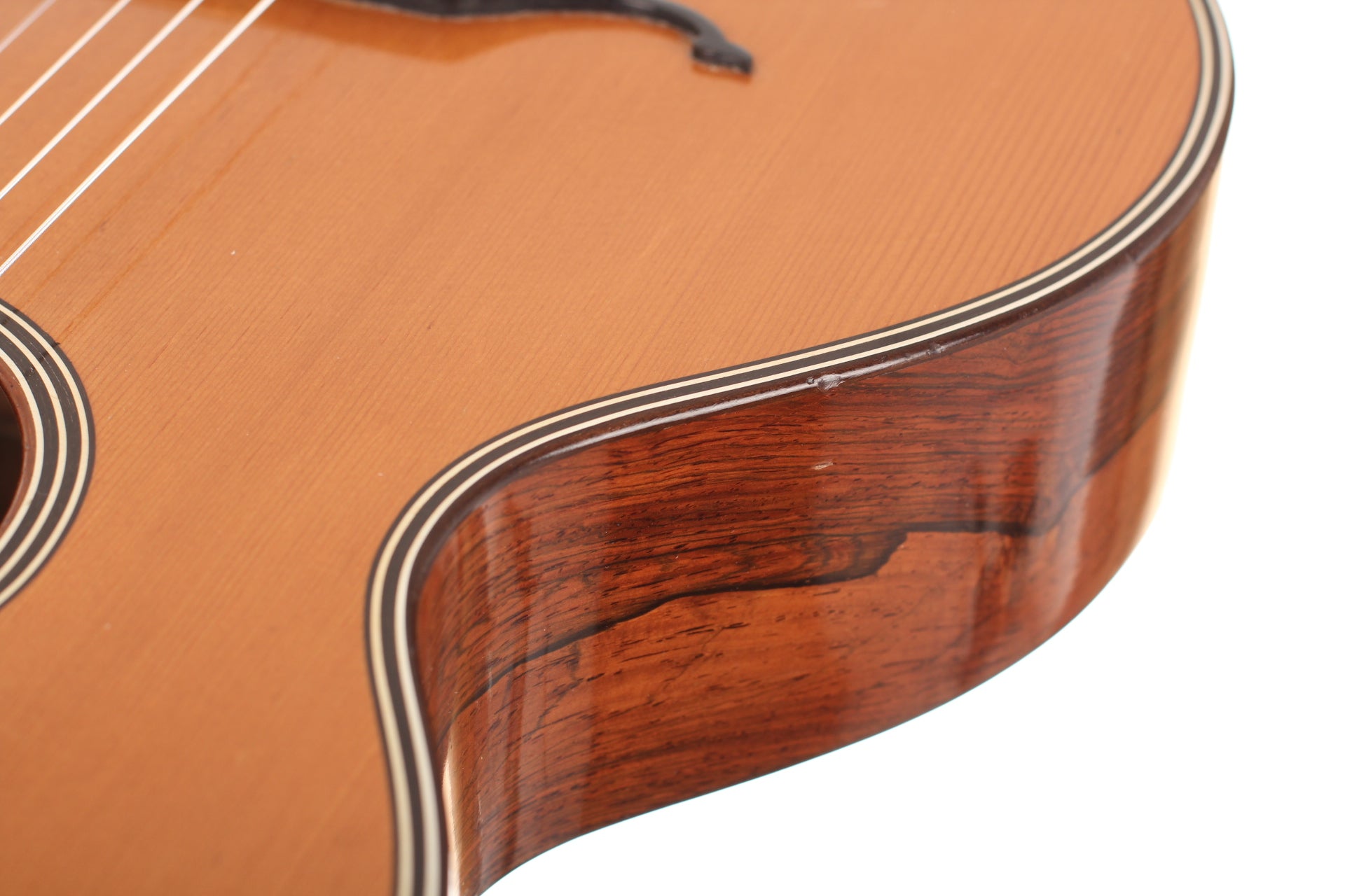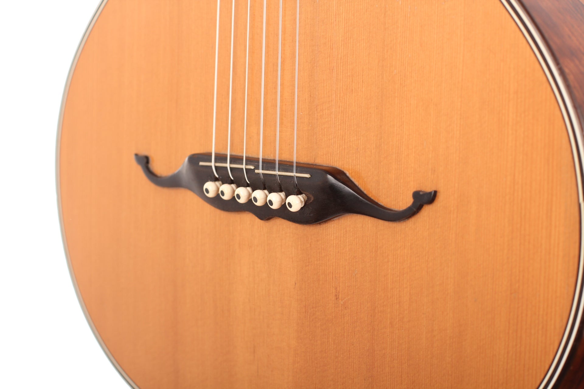 Die Decke ist zweiteilig und aus nussbraun gebeizter Fichte gefertigt. Umrahmt wird die Decke von weißen und schwarzen Einlagen die aus Knochen und vermutlich dunkel gebeiztem Birnenholz bestehen. Die Randeinlagen finden sich erneut in gleicher Anordnung um das Schallloch über das auch das Griffbrett ragt. Der Steg ist mit Ranken verziert und aus einem Stück gearbeitet. Der Boden ist zweiteilig, gewölbt und besteht wie auch die Zargen aus Palisander. Der Kopf ist mit dem Hals verzapft und der Hals ist mit dem Korpus verschraubt. Das Griffbrett, das bis über das Schallloch reicht, ist gekehlt. Auf der Decke, links neben dem Griffbrett befindet sich ein reparierter Riss. Ebenso auf dem Boden sind kleine feine stabile Haarrisse sichtbar.