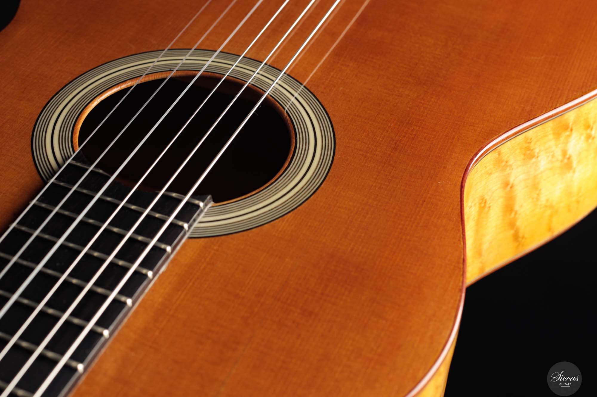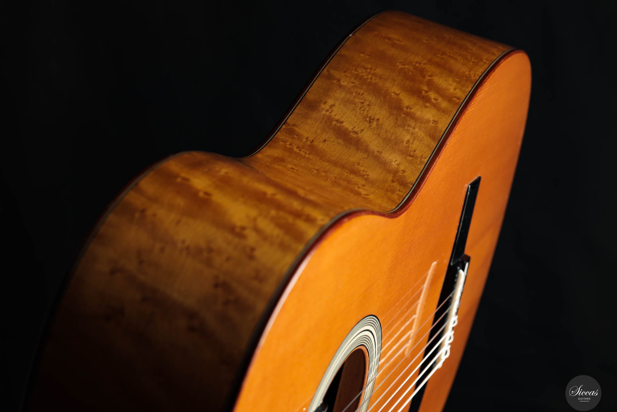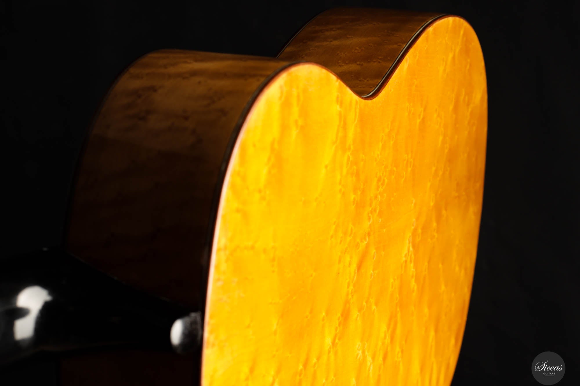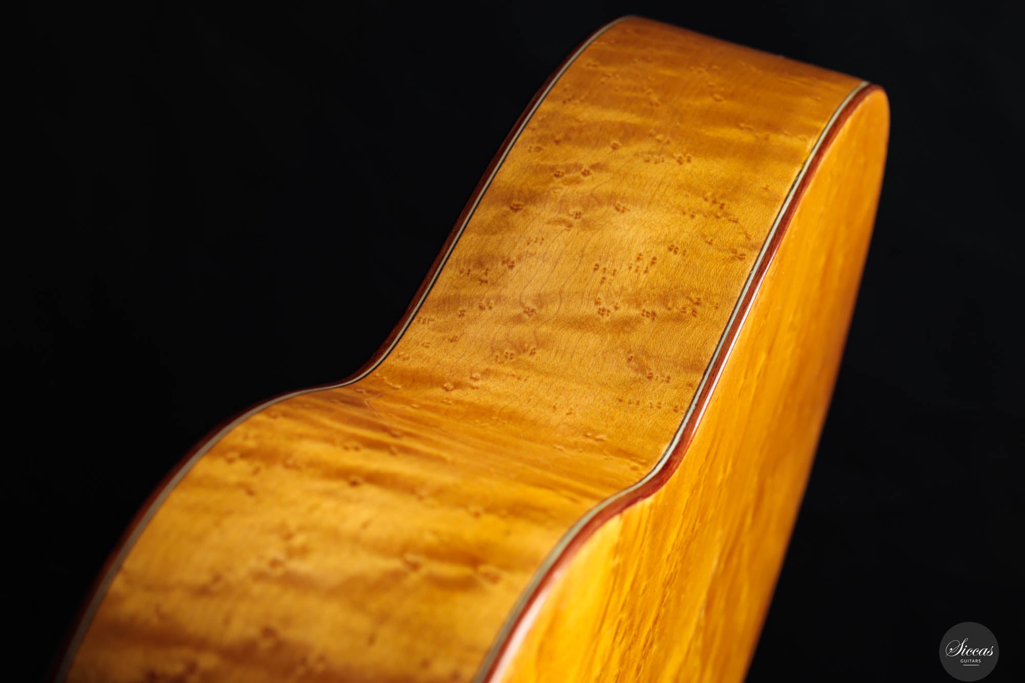 Diese außergewöhnliche Gitarre ist ein eindrucksvolles Zeugnis von Weissgerbers Kunstfertigkeit. Sie verfügt über eine fein gealterte Fichtendecke, kombiniert mit atemberaubendem Vogelaugenahorn für Boden und Zargen – eine elegante Wahl, die sowohl die visuelle Ästhetik als auch die klanglichen Eigenschaften der Gitarre bereichert. Das Instrument ist mit einer filigranen Schelllackpolitur versehen, die nicht nur seine natürliche Schönheit bewahrt, sondern auch das freie Schwingen des Holzes ermöglicht und so zu seinem reichen und ausdrucksstarken Klang beiträgt. Klanglich bietet diese Gitarre einen hellen, direkten und präzisen Ton mit einer beeindruckenden Ausgewogenheit über alle Register hinweg. Die Luftresonanz bei G/G# in Kombination mit dem Ahorn sorgt für eine äußerst angenehme Brillanz sowohl in den Bässen als auch in den Höhen. Die Bässe haben dennoch Tiefe und eine gute Projektion. Die Gitarre verfügt über eine außergewöhnliche Tragfähigkeit und ein breites dynamisches Spektrum. Das Instrument ist mit den originalen Landstorfer-Mechaniken ausgestattet und wird im originalen Koffer geliefert. Es befindet sich in sehr gutem Zustand und weist nur minimale Spielspuren auf der Decke auf. Auf der Rückseite gibt es einen markanten Riss, der fachgerecht repariert und als stabil angesehen wird. Als hervorragend erhaltenes Beispiel von Weissgerbers Handwerkskunst ist diese Gitarre eine seltene Entdeckung, die historische Bedeutung, ästhetische Schönheit und herausragende klangliche Eigenschaften vereint.Regelmäßige Pflege verlängert die Lebensdauer des Instruments