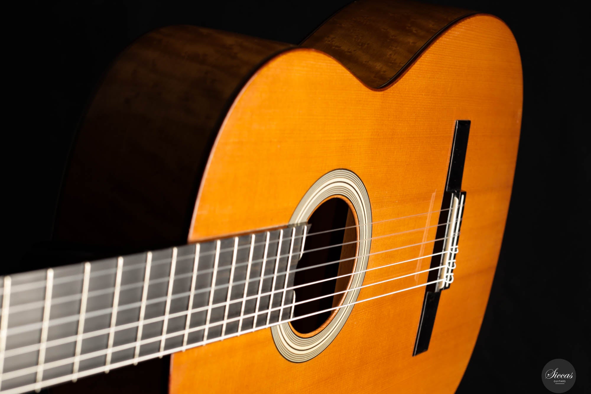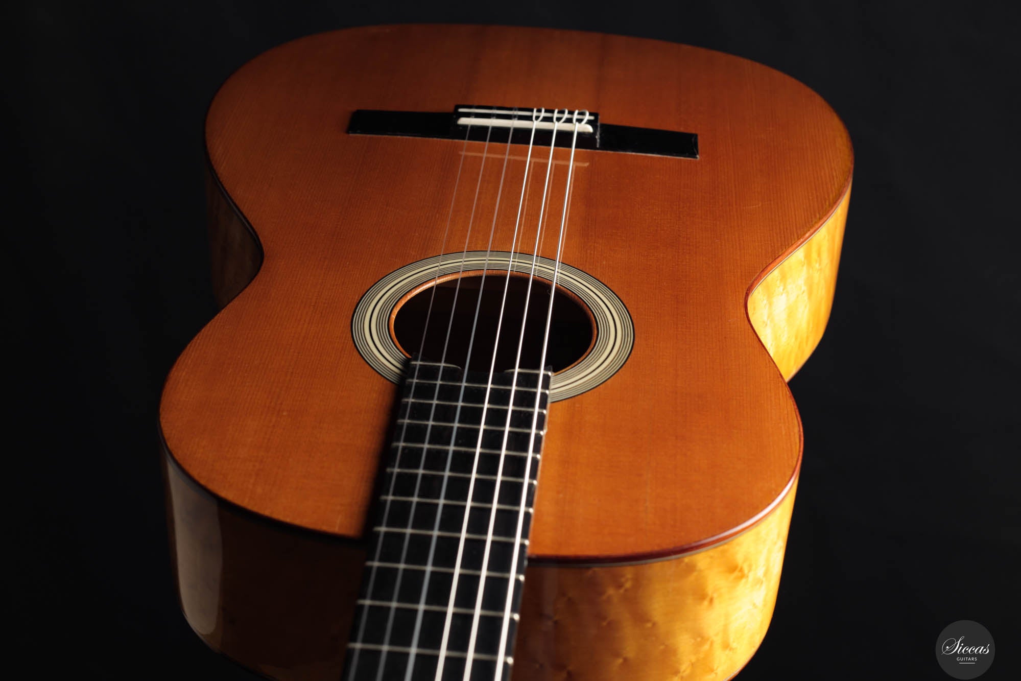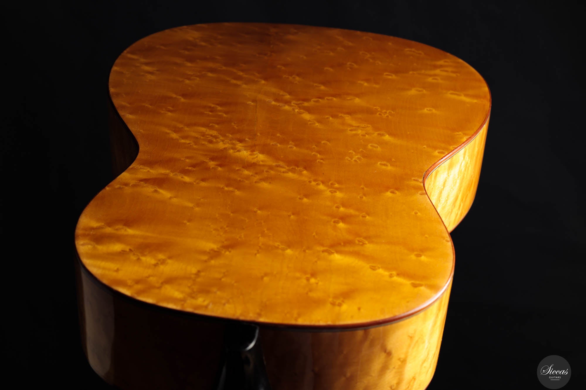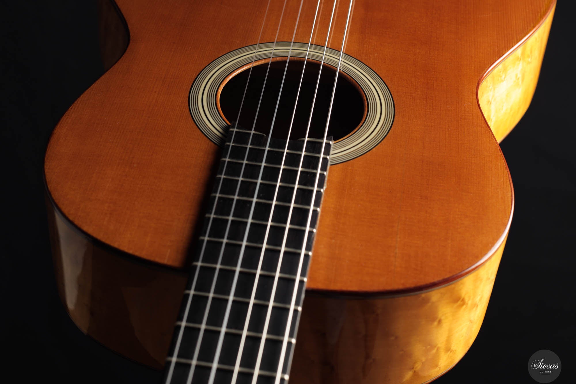 Diese außergewöhnliche Gitarre ist ein eindrucksvolles Zeugnis von Weissgerbers Kunstfertigkeit. Sie verfügt über eine fein gealterte Fichtendecke, kombiniert mit atemberaubendem Vogelaugenahorn für Boden und Zargen – eine elegante Wahl, die sowohl die visuelle Ästhetik als auch die klanglichen Eigenschaften der Gitarre bereichert. Das Instrument ist mit einer filigranen Schelllackpolitur versehen, die nicht nur seine natürliche Schönheit bewahrt, sondern auch das freie Schwingen des Holzes ermöglicht und so zu seinem reichen und ausdrucksstarken Klang beiträgt. Klanglich bietet diese Gitarre einen hellen, direkten und präzisen Ton mit einer beeindruckenden Ausgewogenheit über alle Register hinweg. Die Luftresonanz bei G/G# in Kombination mit dem Ahorn sorgt für eine äußerst angenehme Brillanz sowohl in den Bässen als auch in den Höhen. Die Bässe haben dennoch Tiefe und eine gute Projektion. Die Gitarre verfügt über eine außergewöhnliche Tragfähigkeit und ein breites dynamisches Spektrum. Das Instrument ist mit den originalen Landstorfer-Mechaniken ausgestattet und wird im originalen Koffer geliefert. Es befindet sich in sehr gutem Zustand und weist nur minimale Spielspuren auf der Decke auf. Auf der Rückseite gibt es einen markanten Riss, der fachgerecht repariert und als stabil angesehen wird. Als hervorragend erhaltenes Beispiel von Weissgerbers Handwerkskunst ist diese Gitarre eine seltene Entdeckung, die historische Bedeutung, ästhetische Schönheit und herausragende klangliche Eigenschaften vereint.Regelmäßige Pflege verlängert die Lebensdauer des Instruments