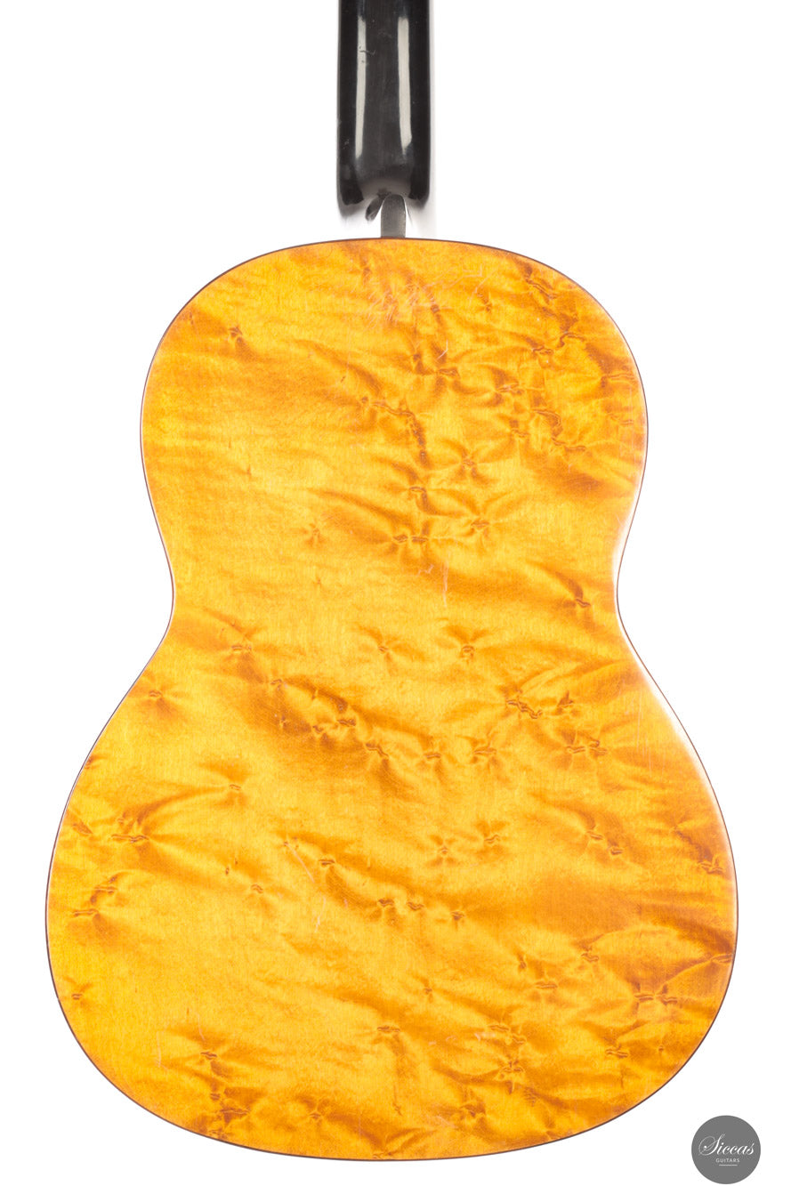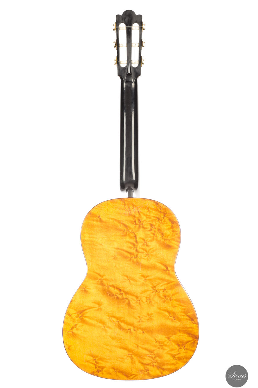 This instrument is known as the Damen model, characterized by its 62 cm scale length and smaller body dimensions. However, it is based on Weissgerber’s Torres model. Despite its more compact size, the guitar delivers an impressive volume and projects remarkably well. It is also exceptionally responsive and very easy to play. The back is made from a single piece of beautifully figured birdseye maple. This guitar is not only a highly collectible piece of guitar-making history but also a true concert instrument that can meet the demands of any performance setting.