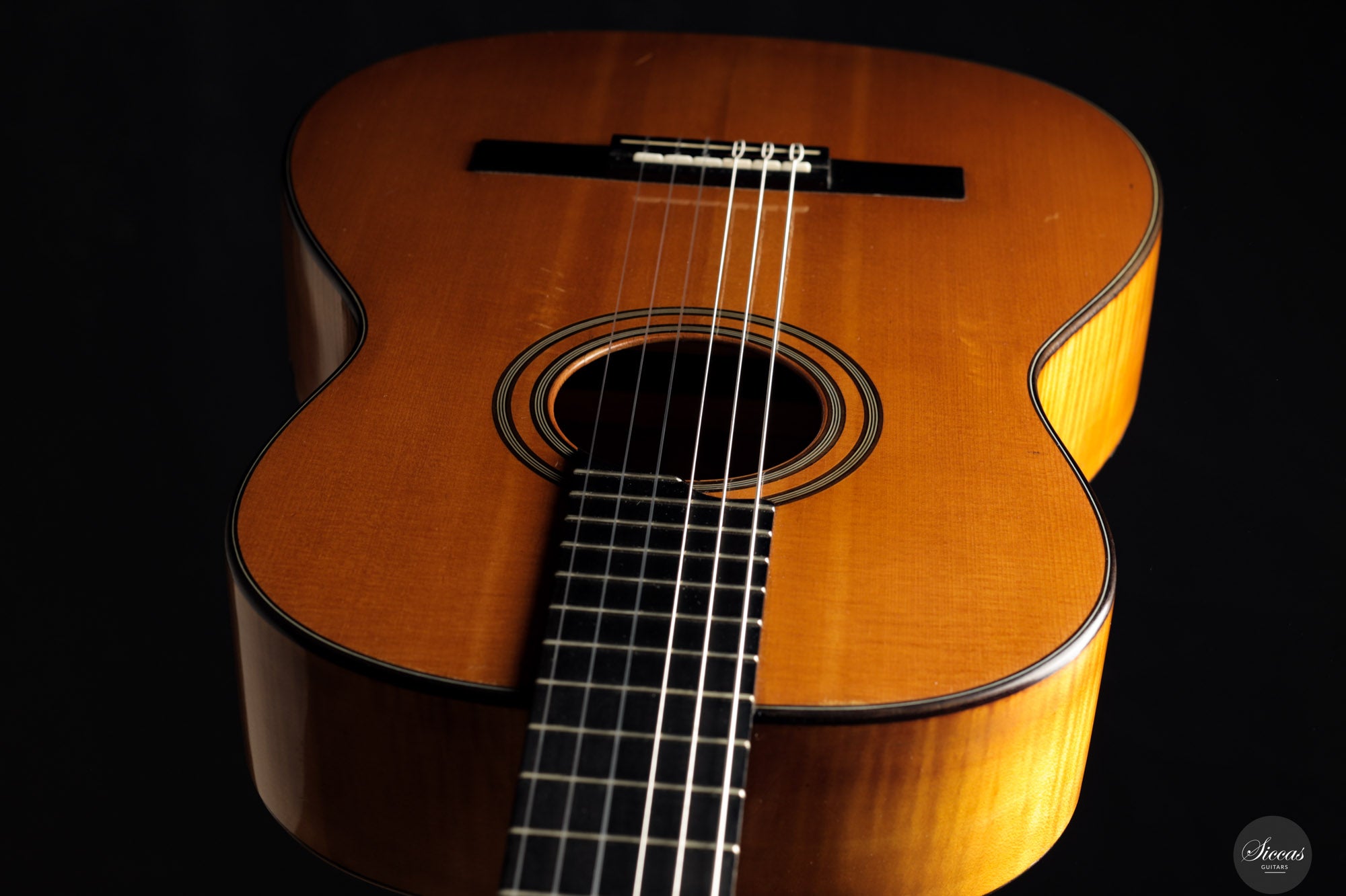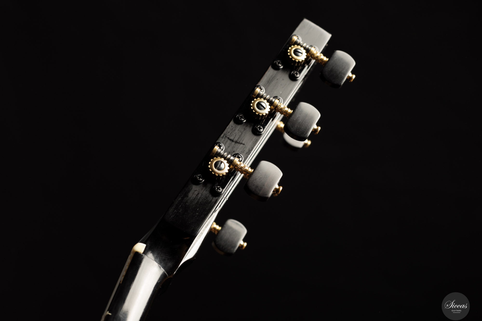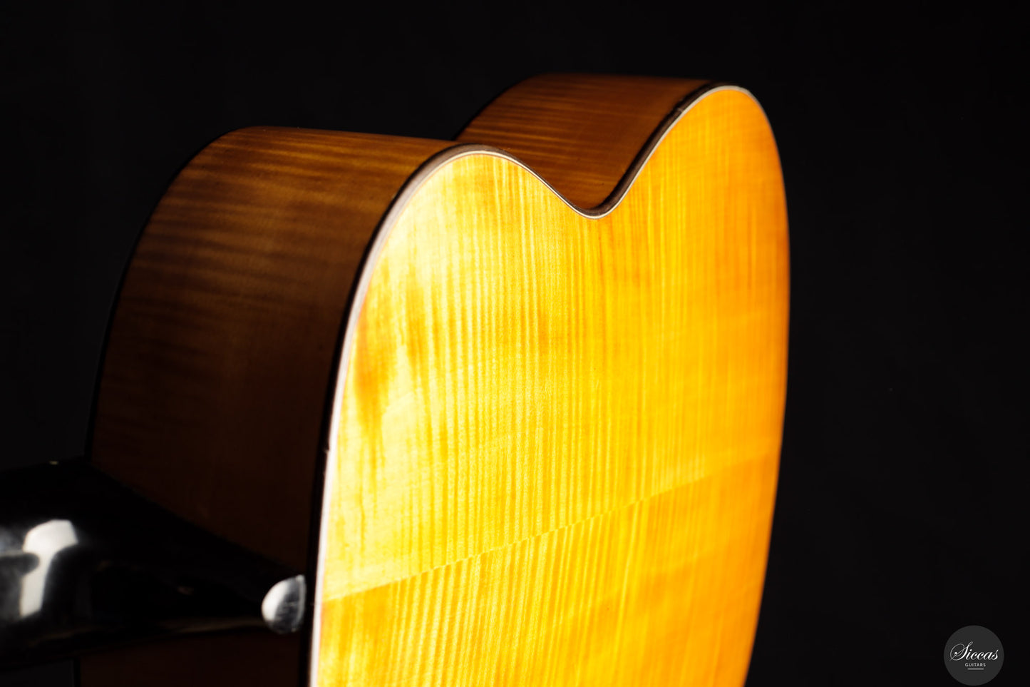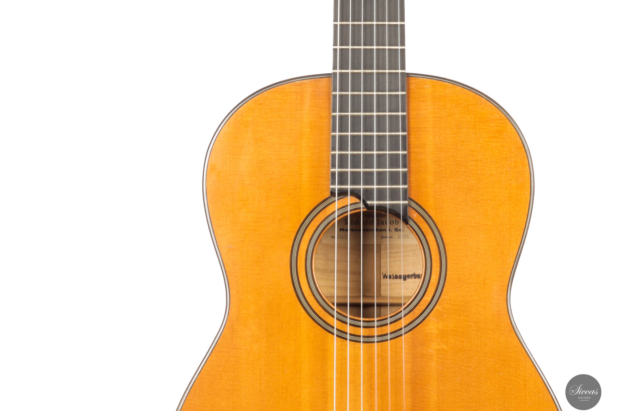 Dieses von Simplicio inspirierte Modell entstand 1936 in der späteren Schaffensperiode von Weissgerber. Es zeigt eindrucksvoll seine Fähigkeit, spanische Klangästhetik mit deutscher Handwerkskunst zu vereinen. Der spanische Gitarrist Miguel Llobet äußerte einst, dass Weissgerbers Instrumente zu den wenigen deutschen Gitarren mit einem wahrhaft spanischen Klang gehören – ein bemerkenswertes Zeugnis für die Bedeutung seines Schaffens. Typisch für die Instrumente aus dieser Zeit ist die charakteristische Rosette aus Ebenholz und Galalith, die in konzentrischen Ringmustern gestaltet ist. Die Decke besteht aus Fichte, während Boden und Zargen aus geflammtem Ahorn gefertigt sind und so Helligkeit und Tiefe vereinen. Der Mahagonihals ist schwarz eingefärbt und verleiht Stabilität sowie eine elegante Erscheinung, die auch im Kopfstück mit einer vorgesetzten Kopfplatte aufgegriffen wird. Mit einem moderaten Gewicht von 1310 Gramm und einer Eigenresonanz im Bereich von A bis Ais bietet diese Gitarre eine schnelle Ansprache und eine ausgewogene klangliche Balance. Das Instrument weist einige Reparaturen an den Zargen auf, an Stellen, an denen einst Leisten durchgedrungen waren. Insgesamt befindet es sich jedoch in sehr gutem Zustand. Mit ihrer an Torres und Simplicio angelehnten Gestaltung und ihrer klaren, lyrischen Klangsprache stellt diese Weissgerber ein bedeutendes Beispiel des Gitarrenbaus des 20. Jahrhunderts dar und ist für Spieler wie auch für Sammler von großem Interesse.Zustand