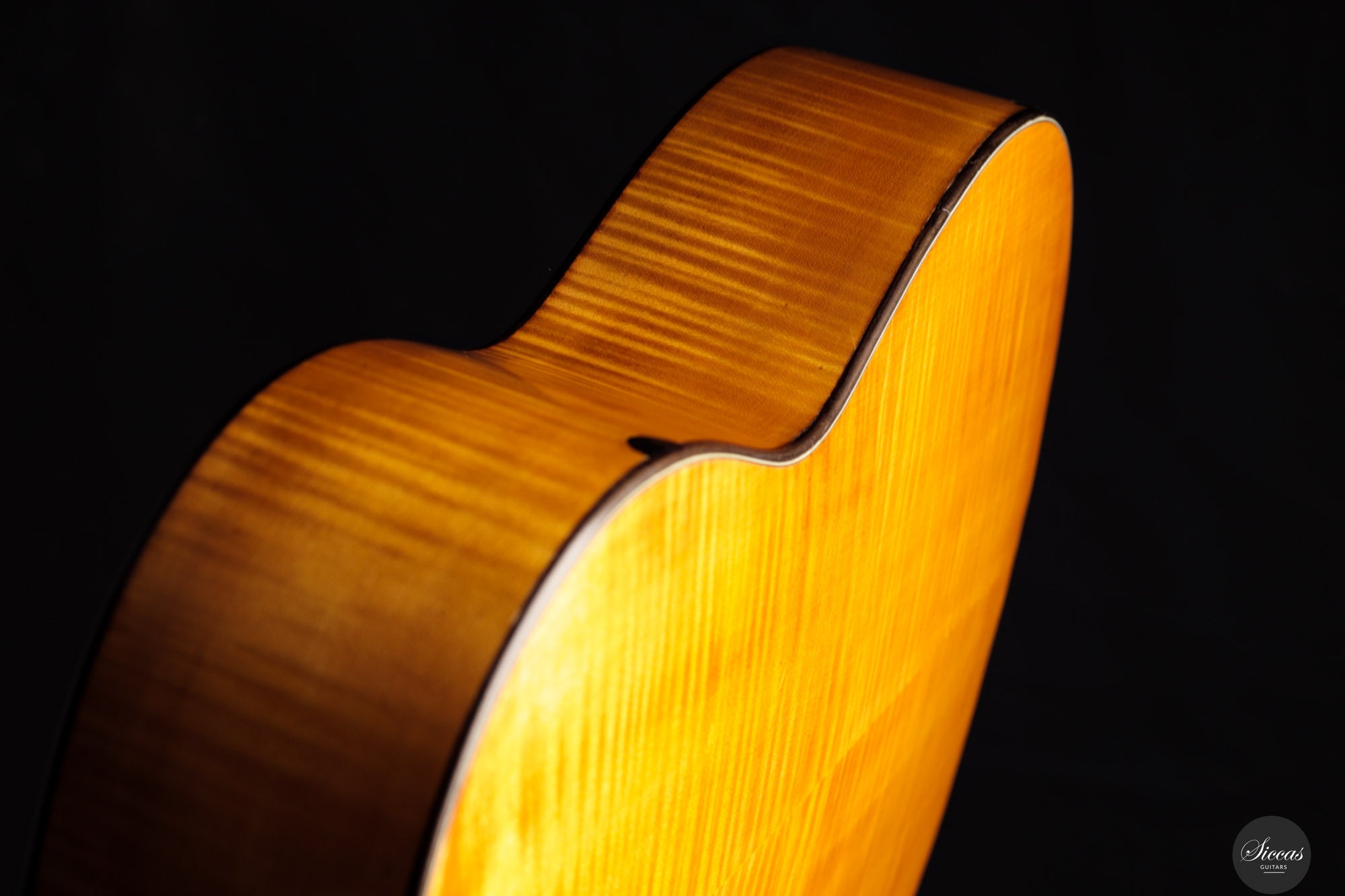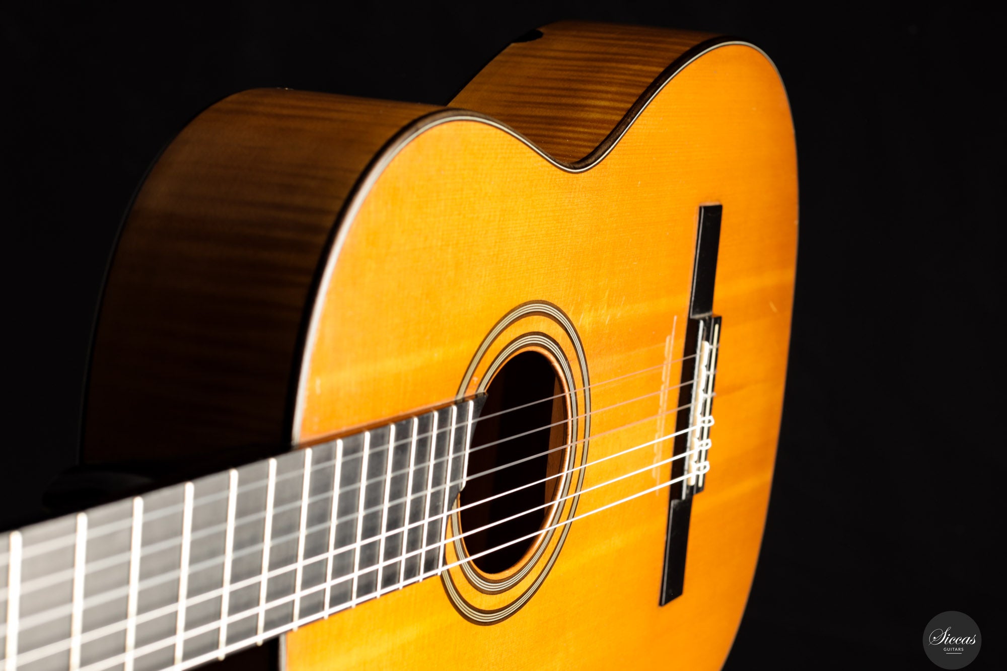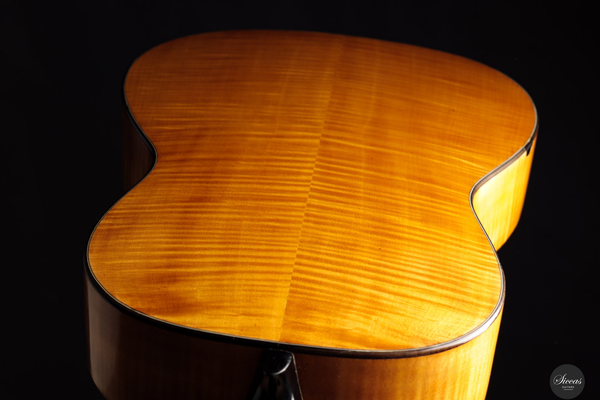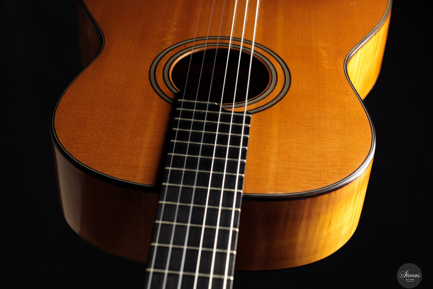 Dieses von Simplicio inspirierte Modell entstand 1936 in der späteren Schaffensperiode von Weissgerber. Es zeigt eindrucksvoll seine Fähigkeit, spanische Klangästhetik mit deutscher Handwerkskunst zu vereinen. Der spanische Gitarrist Miguel Llobet äußerte einst, dass Weissgerbers Instrumente zu den wenigen deutschen Gitarren mit einem wahrhaft spanischen Klang gehören – ein bemerkenswertes Zeugnis für die Bedeutung seines Schaffens. Typisch für die Instrumente aus dieser Zeit ist die charakteristische Rosette aus Ebenholz und Galalith, die in konzentrischen Ringmustern gestaltet ist. Die Decke besteht aus Fichte, während Boden und Zargen aus geflammtem Ahorn gefertigt sind und so Helligkeit und Tiefe vereinen. Der Mahagonihals ist schwarz eingefärbt und verleiht Stabilität sowie eine elegante Erscheinung, die auch im Kopfstück mit einer vorgesetzten Kopfplatte aufgegriffen wird. Mit einem moderaten Gewicht von 1310 Gramm und einer Eigenresonanz im Bereich von A bis Ais bietet diese Gitarre eine schnelle Ansprache und eine ausgewogene klangliche Balance. Das Instrument weist einige Reparaturen an den Zargen auf, an Stellen, an denen einst Leisten durchgedrungen waren. Insgesamt befindet es sich jedoch in sehr gutem Zustand. Mit ihrer an Torres und Simplicio angelehnten Gestaltung und ihrer klaren, lyrischen Klangsprache stellt diese Weissgerber ein bedeutendes Beispiel des Gitarrenbaus des 20. Jahrhunderts dar und ist für Spieler wie auch für Sammler von großem Interesse.Zustand