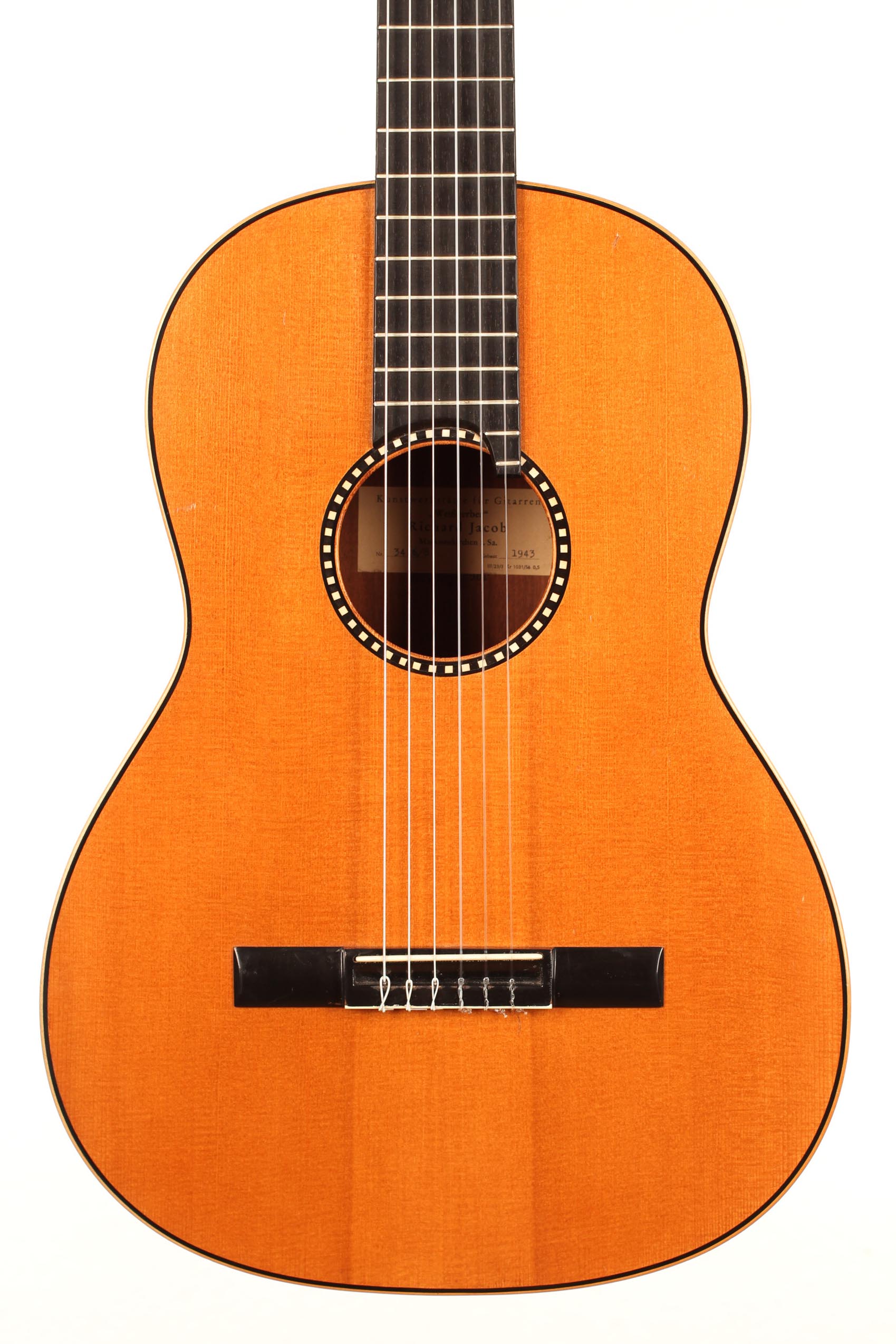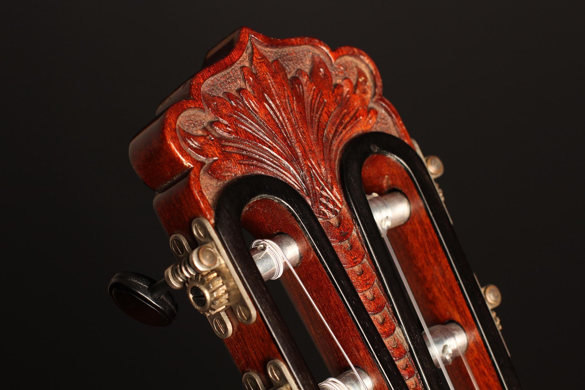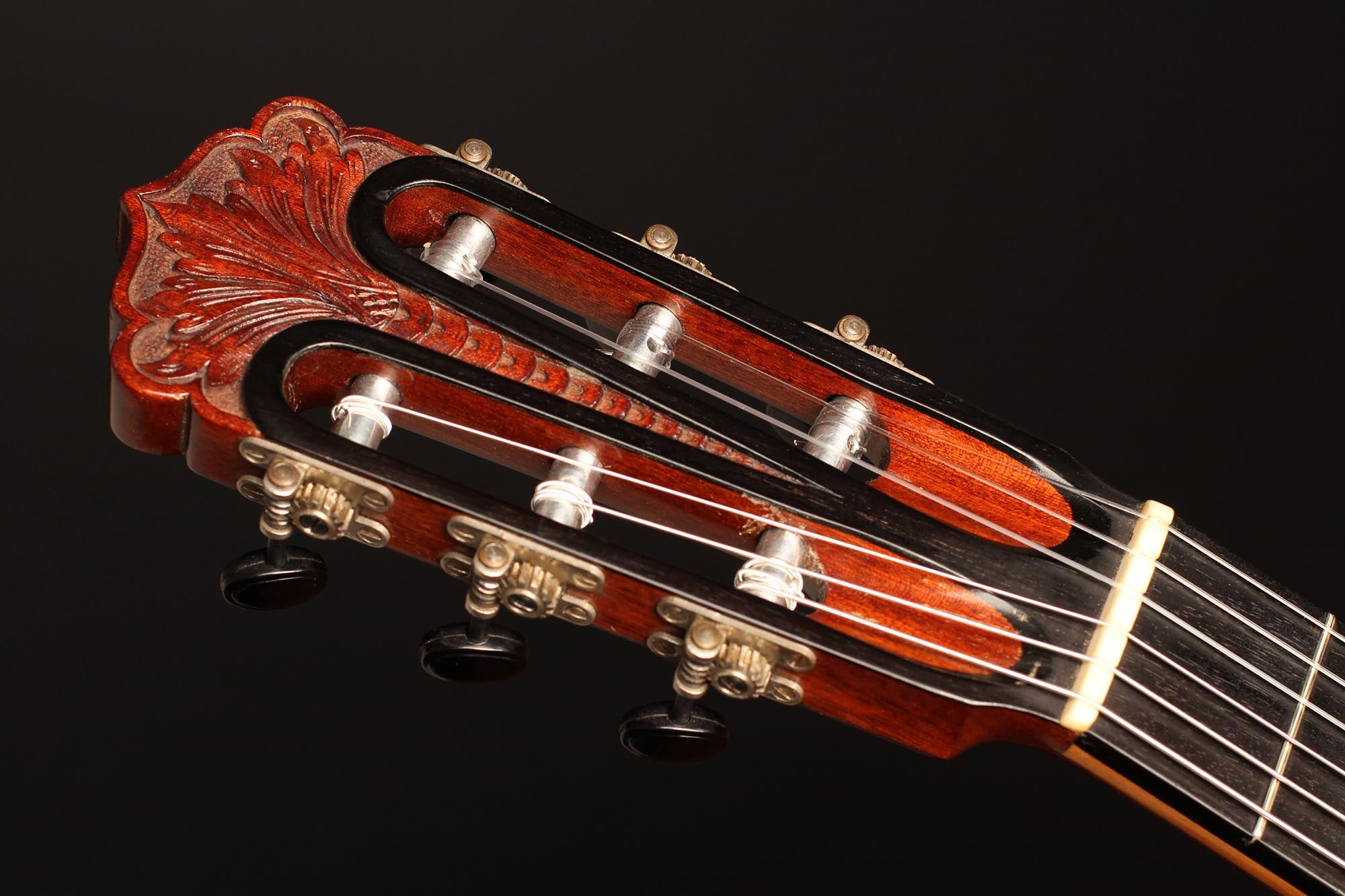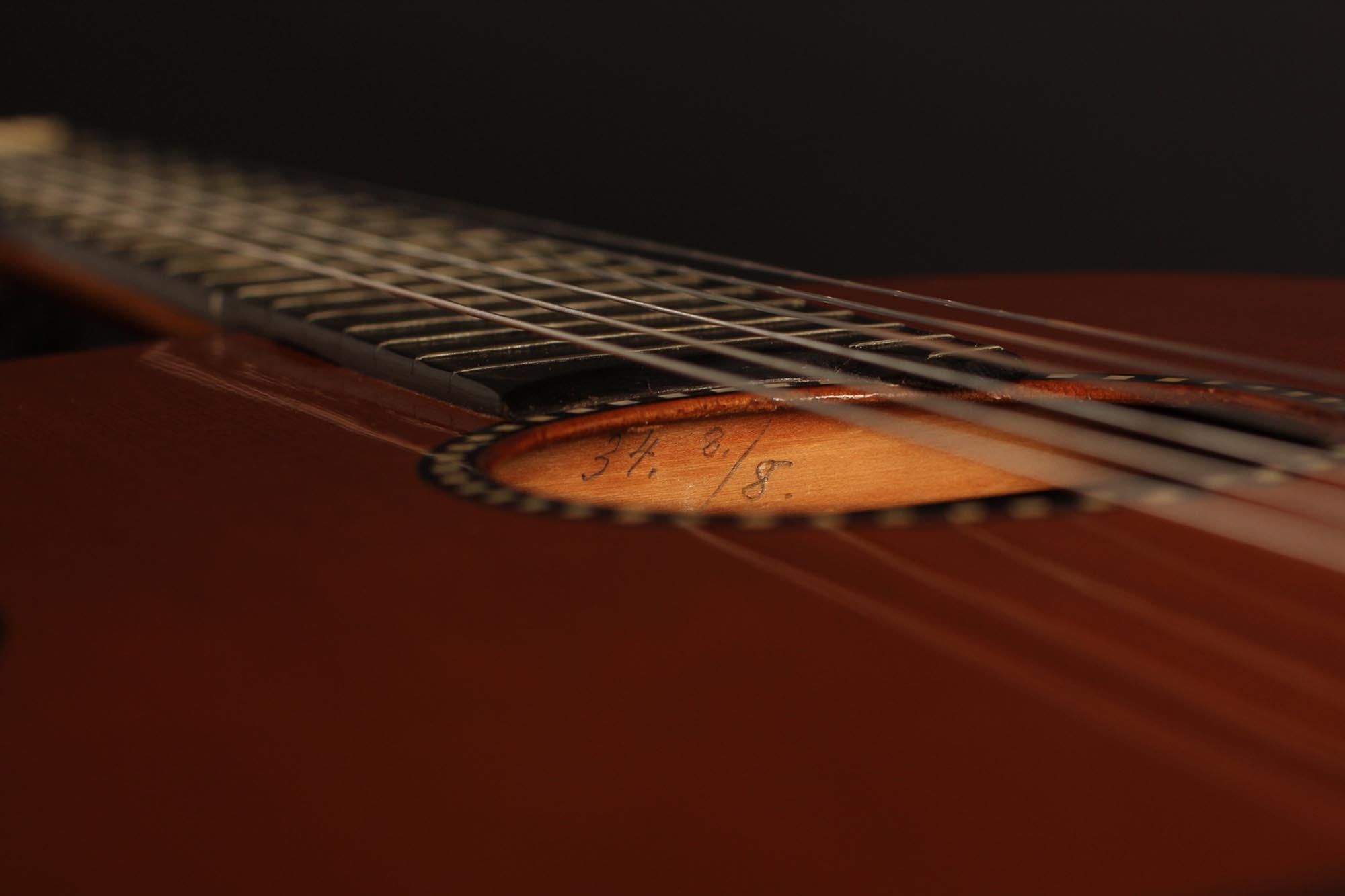 This beautiful Richard Jacob “Weissgerber” Spanish concert model was built in 1943. It has an elegant carved head-plate in the style of Francisco Simplicio, as well as a carved Ebony back plate. The top is free from cracks and has still its original varnish. The fluted one-piece Mahogany back has only one very small repaired crack at the bottom and four discreet repaired hairline cracks can be found on the sides. This guitar is very spontaneous and has a clear sweet tone. It is very fine and comfortable to play, very sensitive to the player’s stroke. This highly collectable guitar is definitely ready to be picked up and played.