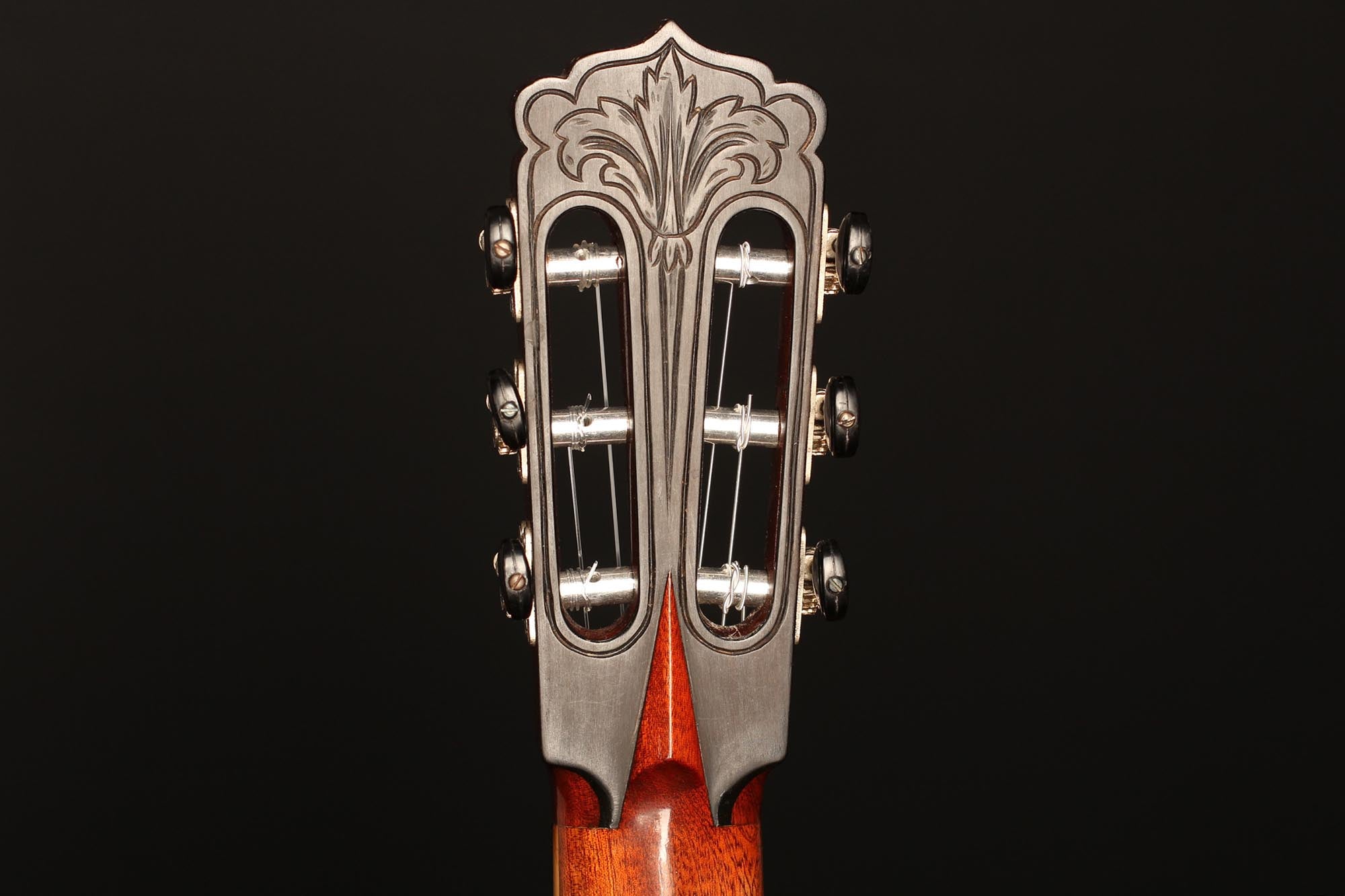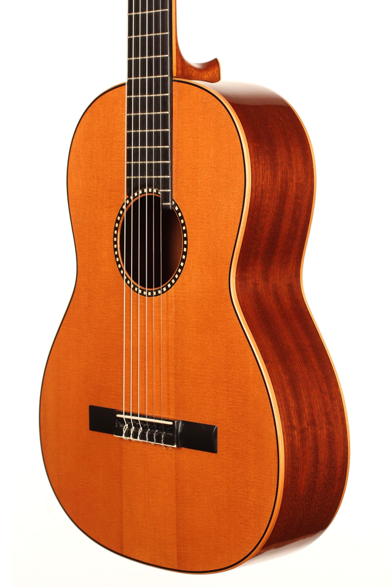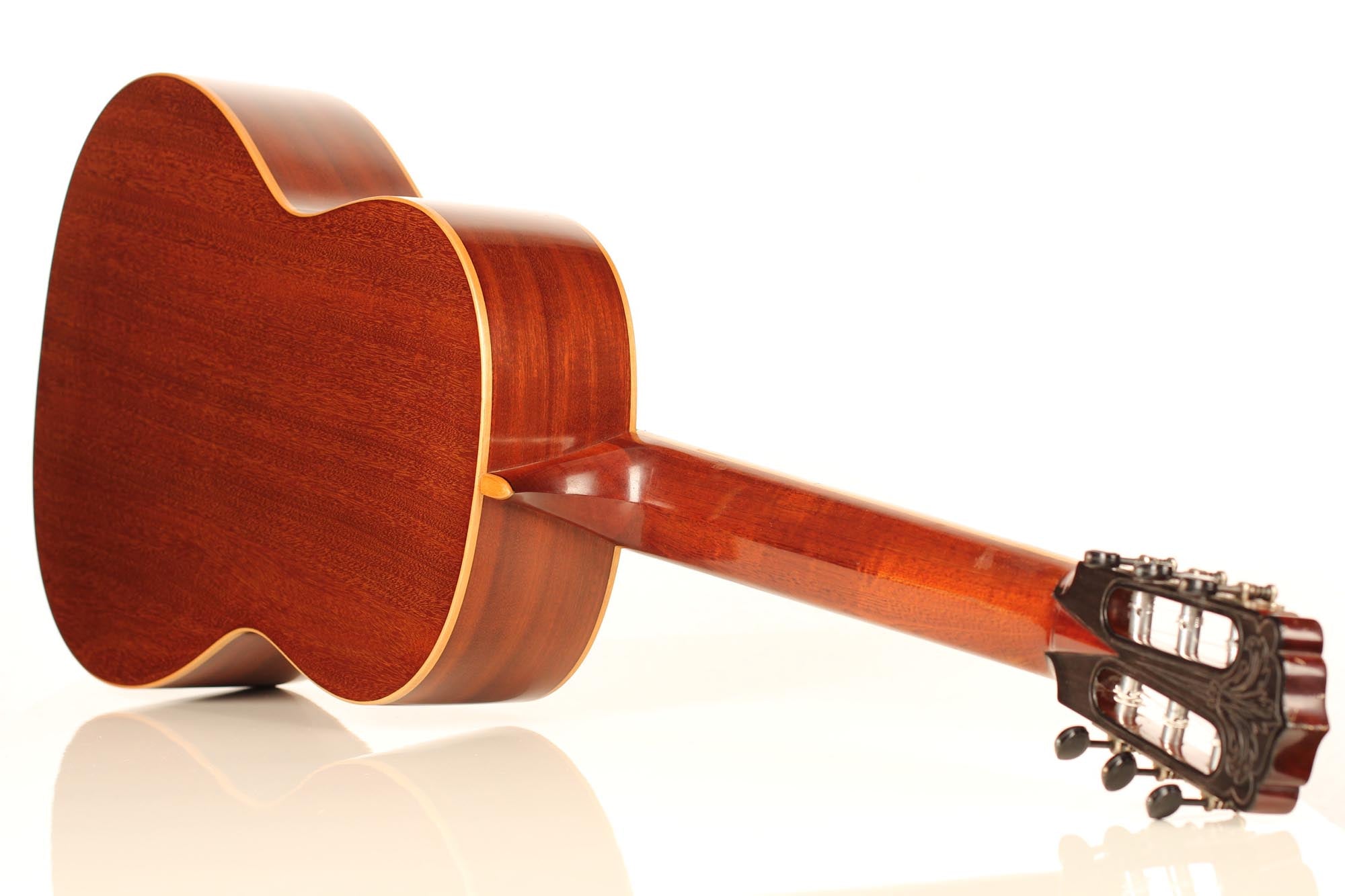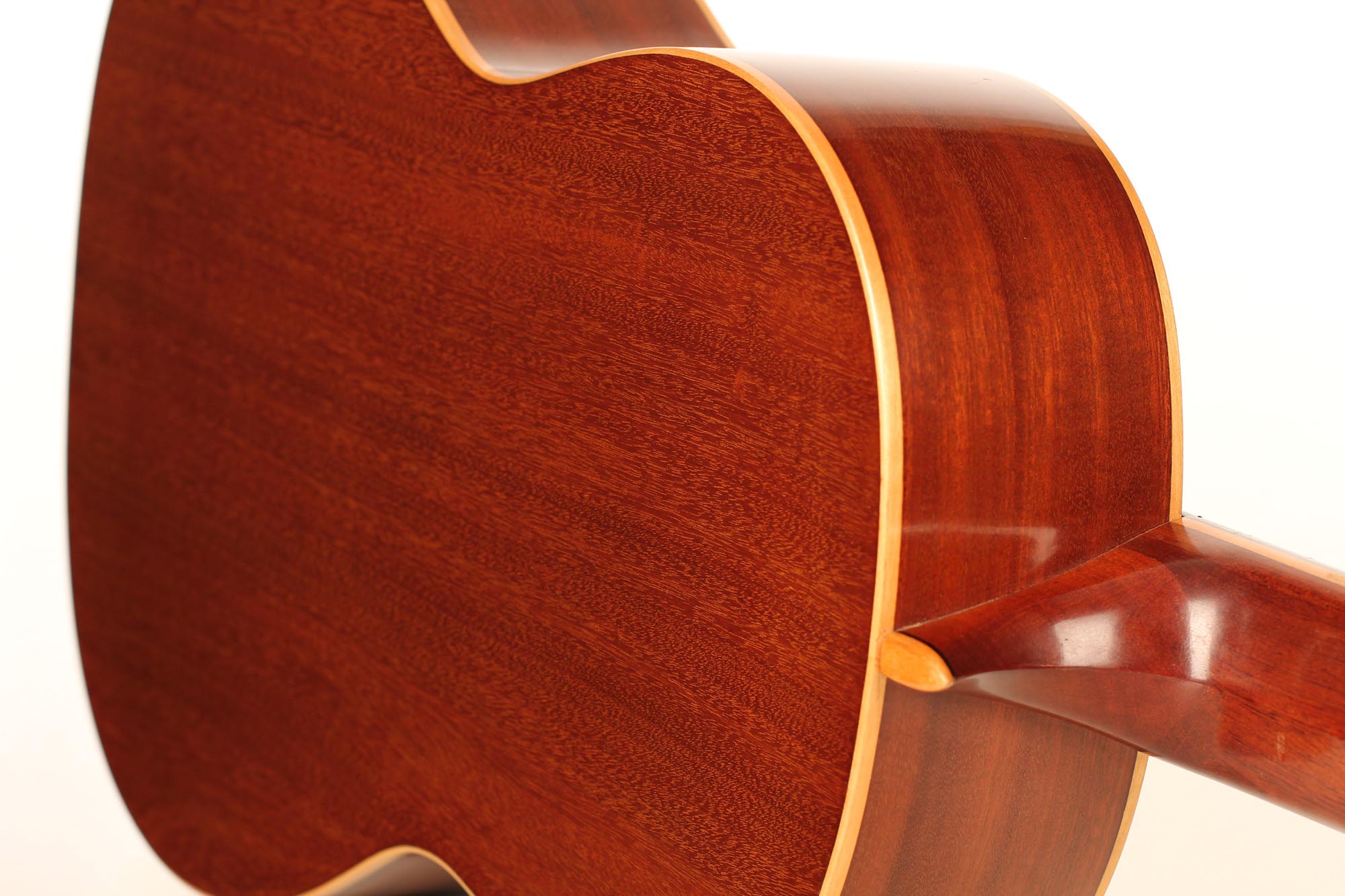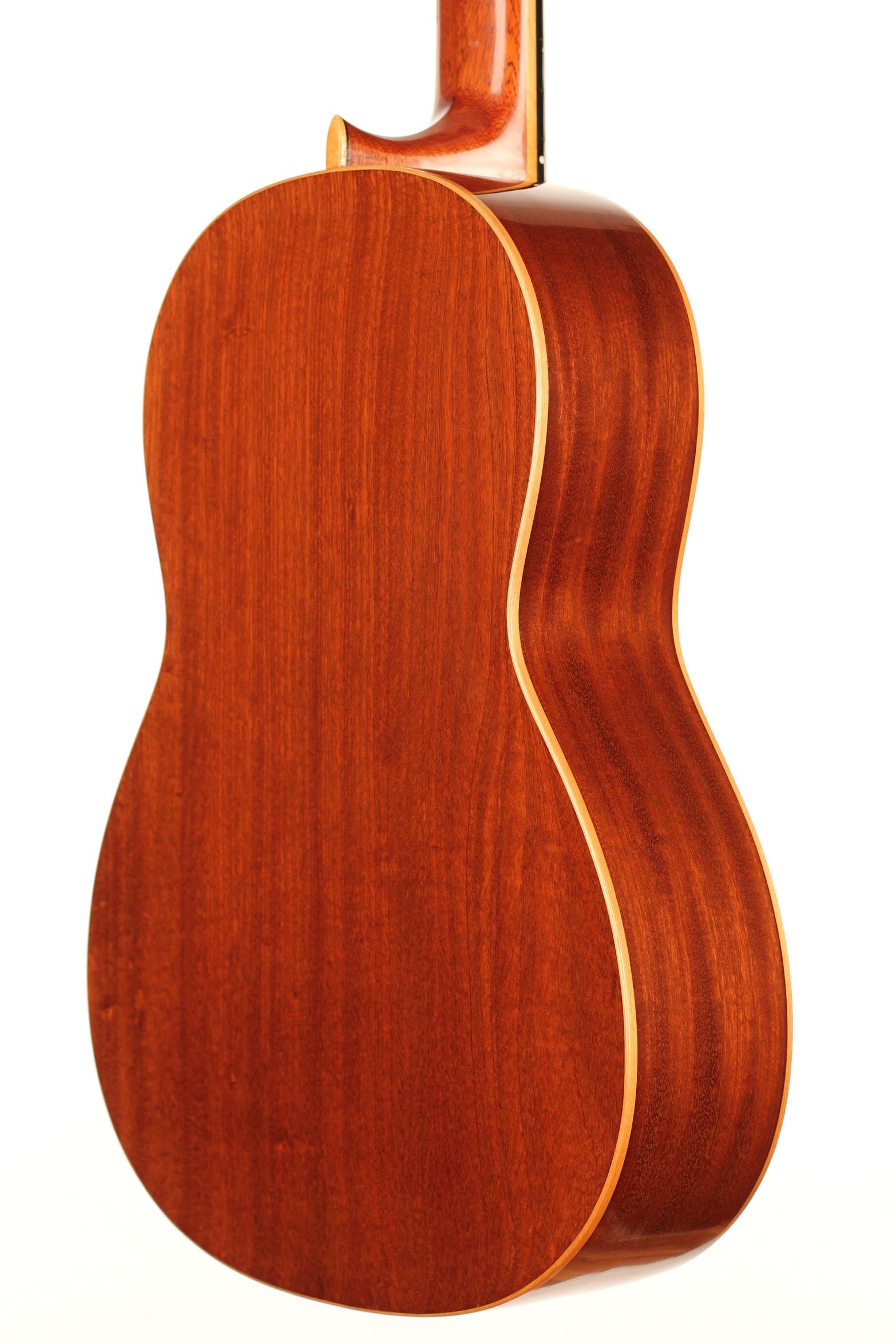This beautiful Richard Jacob “Weissgerber” Spanish concert model was built in 1943. It has an elegant carved head-plate in the style of Francisco Simplicio, as well as a carved Ebony back plate. The top is free from cracks and has still its original varnish. The fluted one-piece Mahogany back has only one very small repaired crack at the bottom and four discreet repaired hairline cracks can be found on the sides. This guitar is very spontaneous and has a clear sweet tone. It is very fine and comfortable to play, very sensitive to the player’s stroke. This highly collectable guitar is definitely ready to be picked up and played.