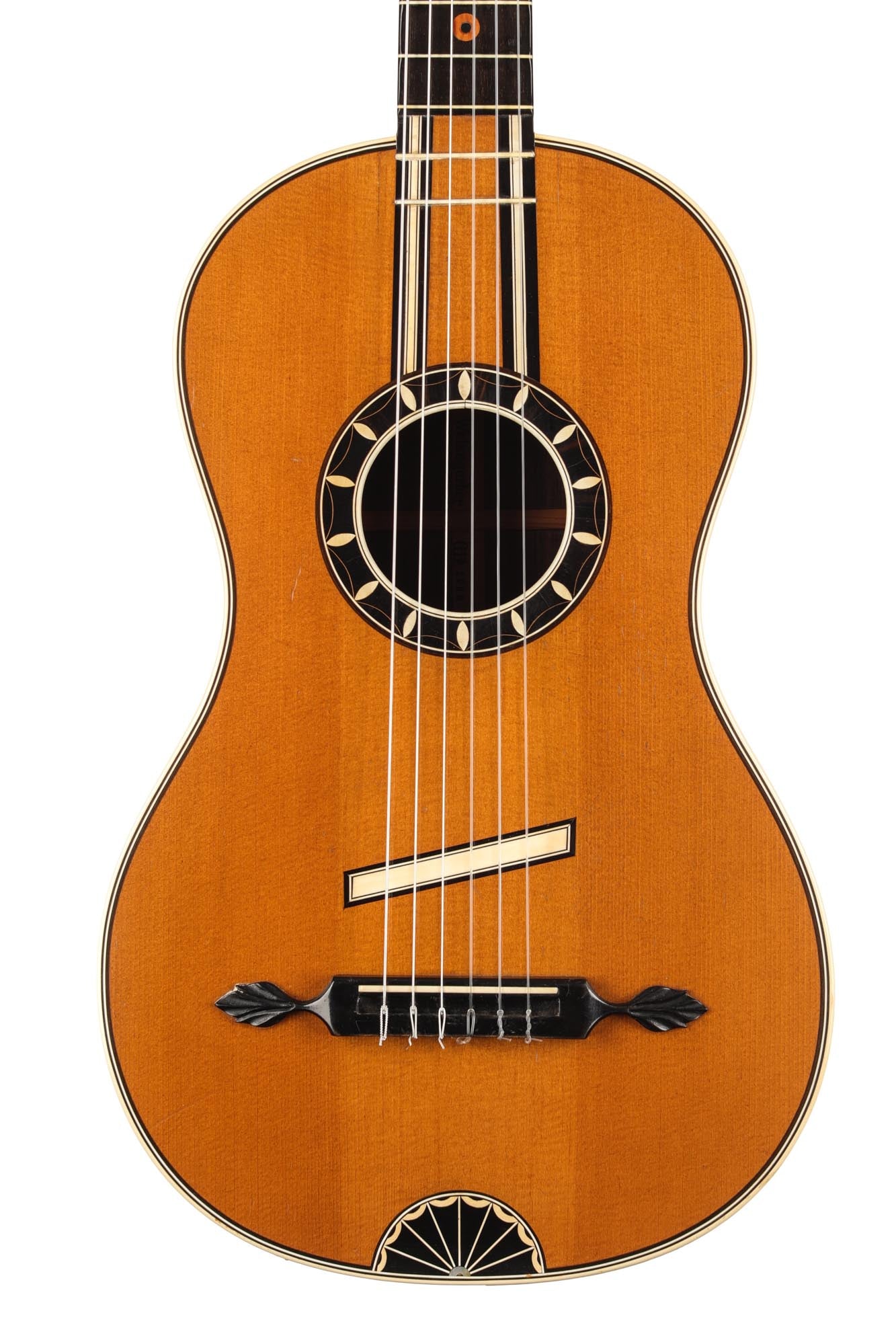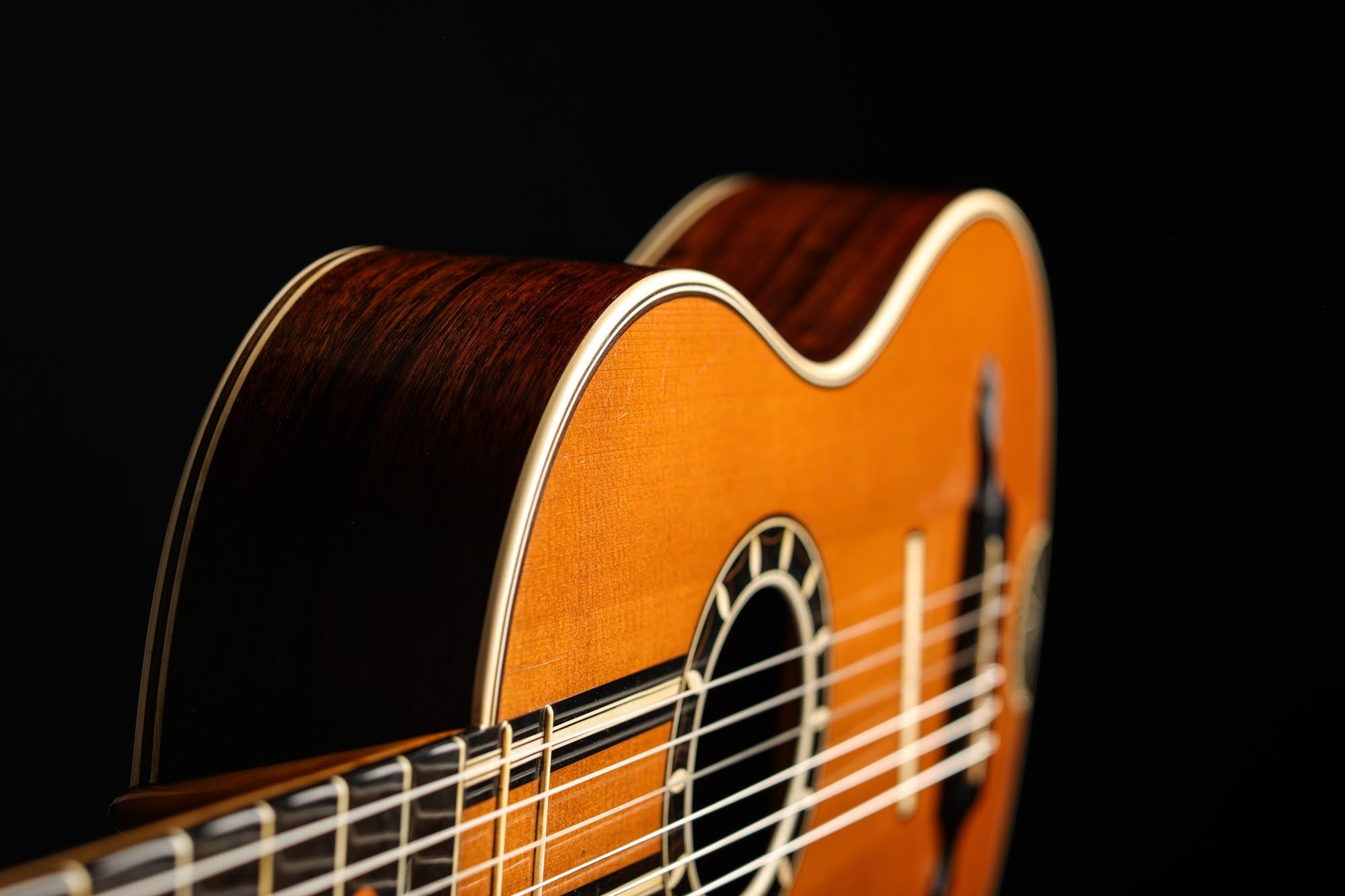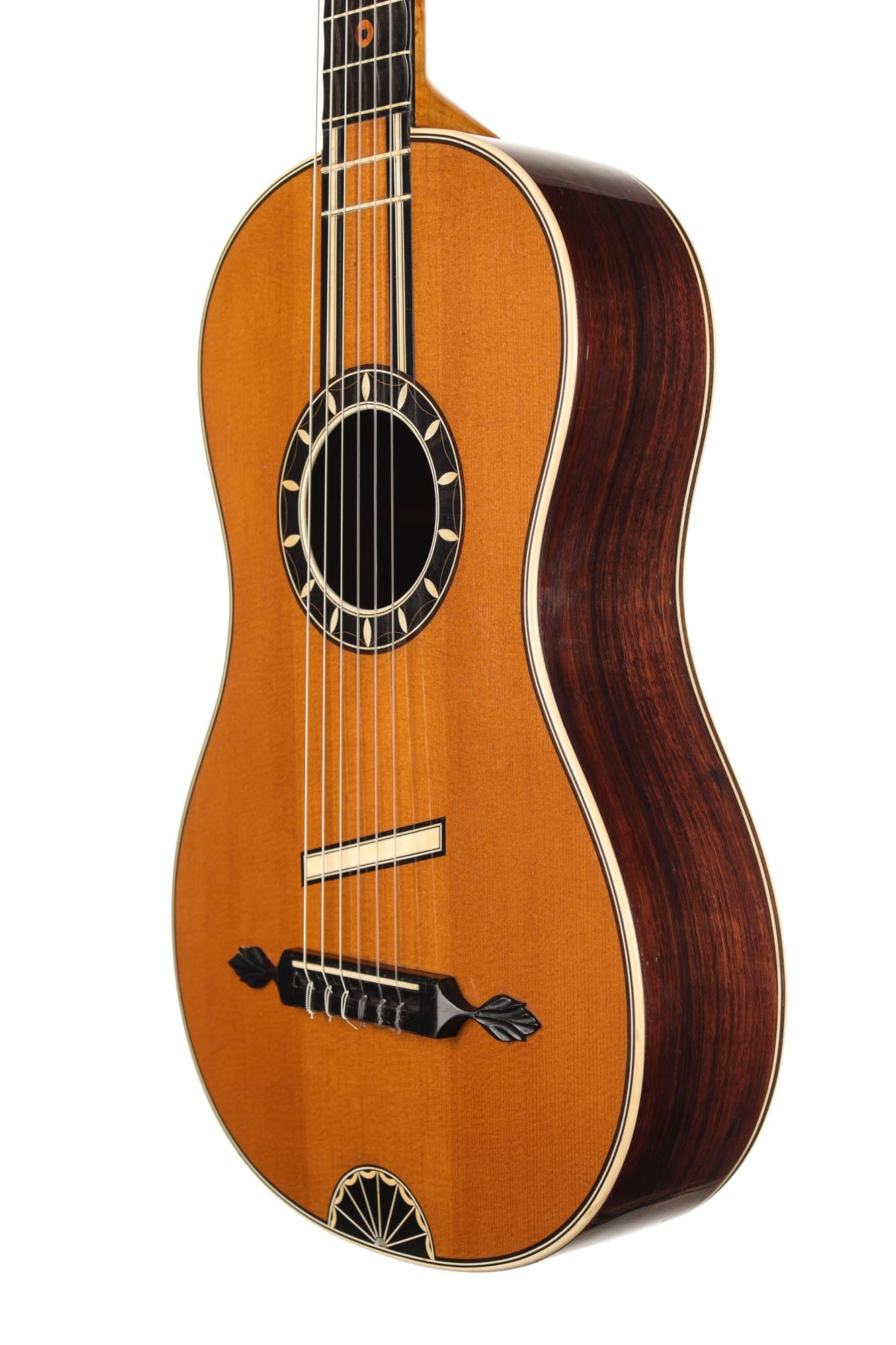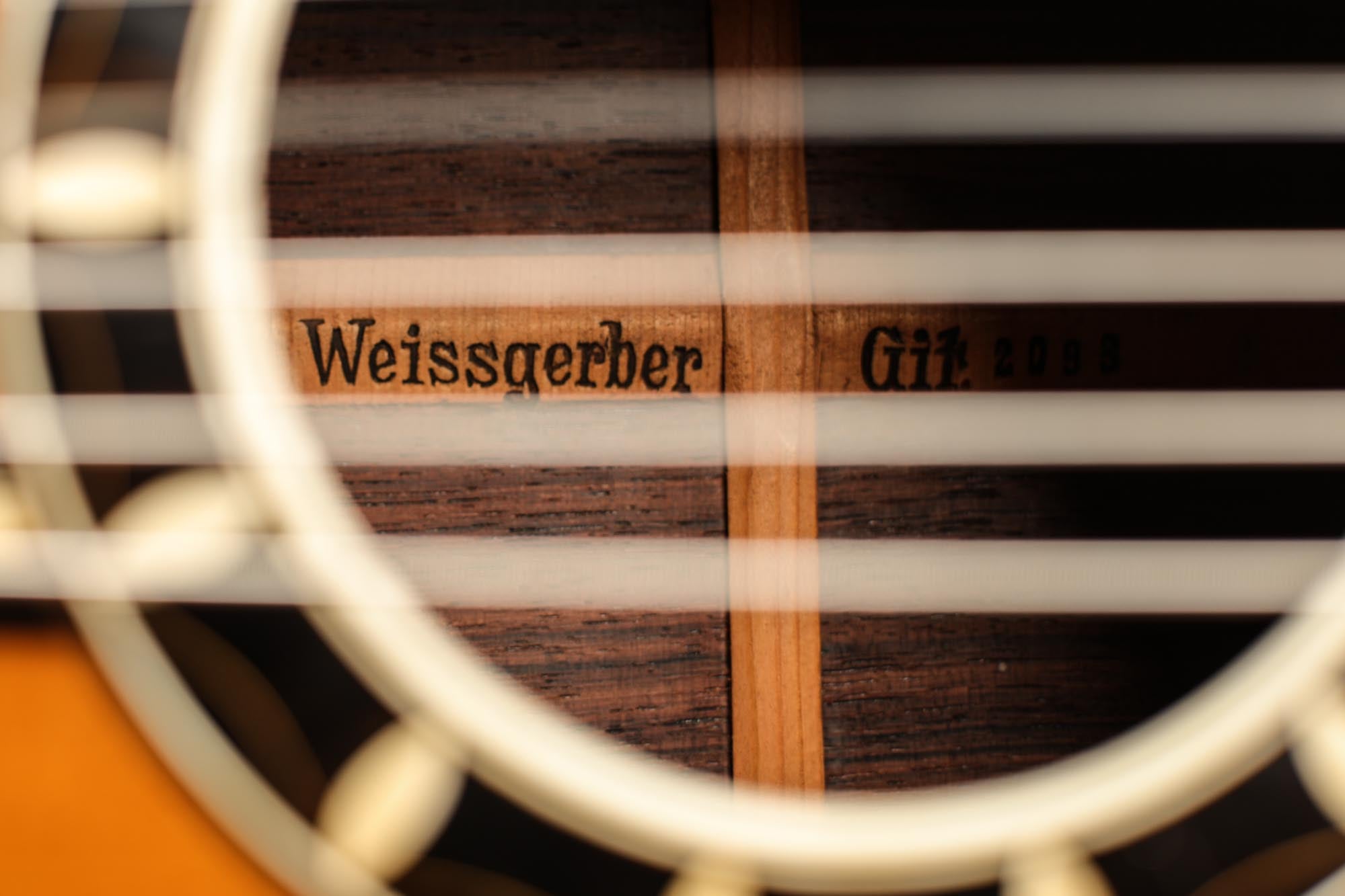 Richard Jacob Weissgerber baute diese prächtige Gitarre 1920 nach dem Vorbild eines 1804 von Johann Knößing gebauten Modells. Er verwendete für dieses Gitarre die besten Materialien, wählte ein wunderschönes Fichtenholz für die Decke und herrliches Palisanderholz für den Boden und die Zargen. Dieses sehr reich verzierte Modell weist eine Fülle subtiler Details auf, die es absolut einzigartig und wertig machen.