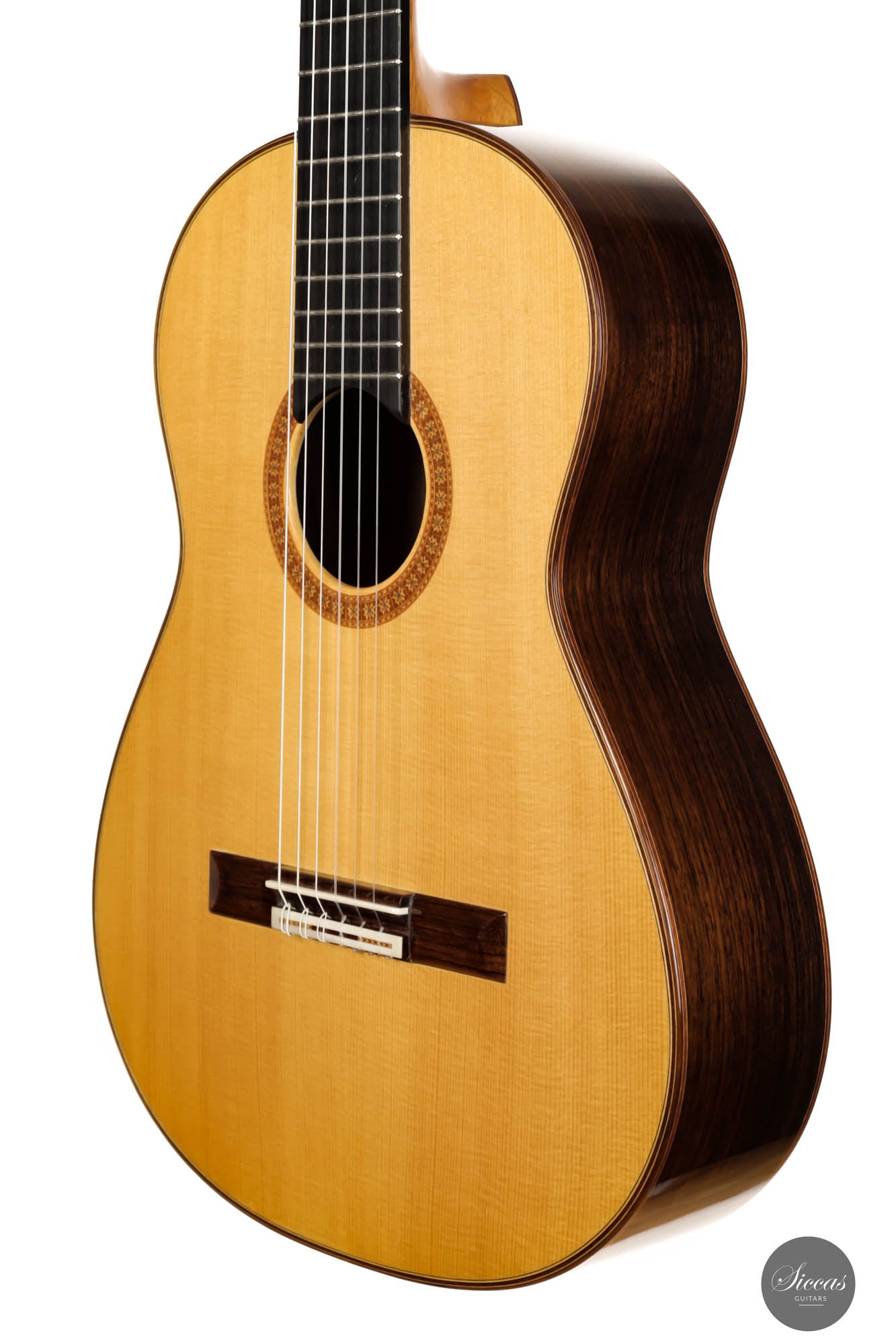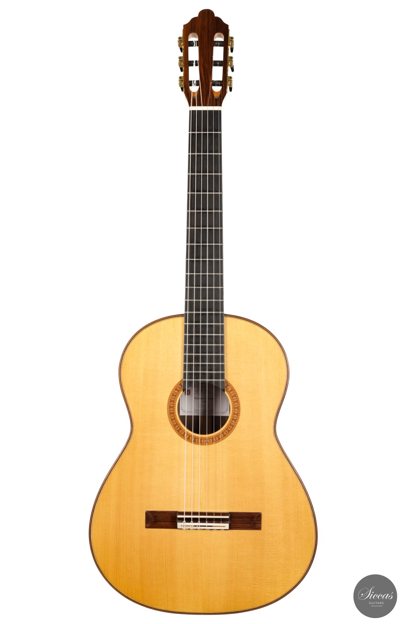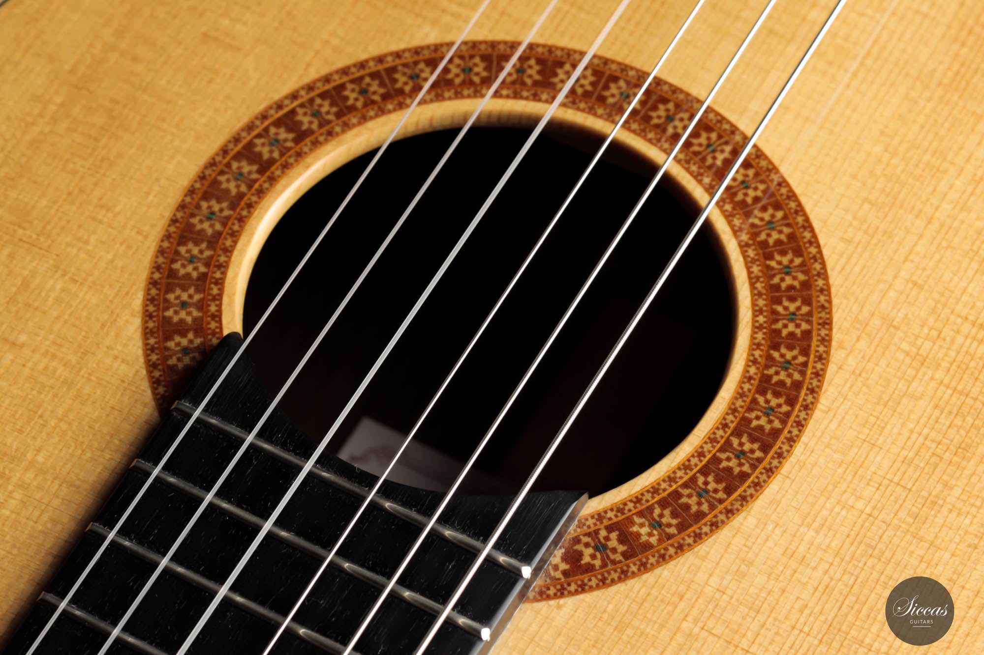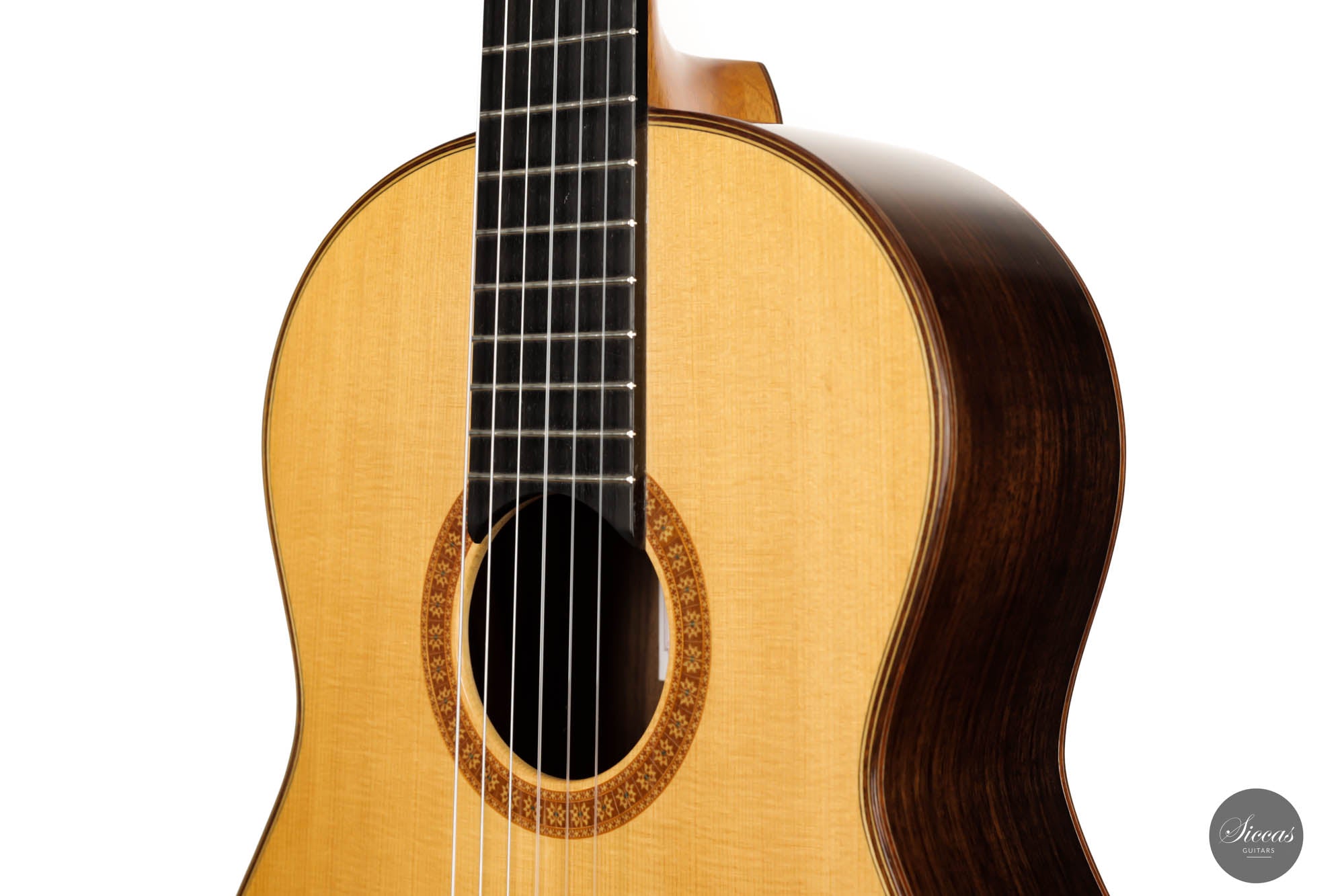 This instrument from 2015 was named Mirlo. It is in excellent condition as a pre-loved guitar with only superficial playing marks. This fine guitar has a honey-colored spruce soundboard decorated with a classy floral pattern rosette design. Moreover, Indian rosewood is the timber choice for the back and sides. Acoustically, this instrument has developed over the years, making it very open and responsive to the player's touch. Moreover, the outstanding balance, the richness of the timbre, the deepness of the basses, and the very satisfying volume provide the player with all the tools to approach any repertoire with great facility and pleasure.
