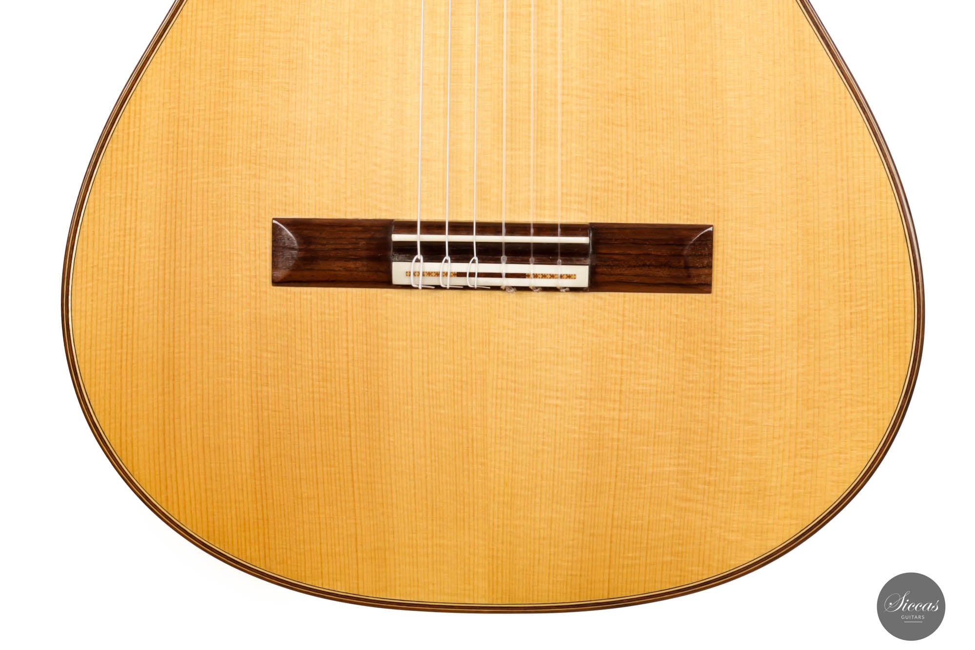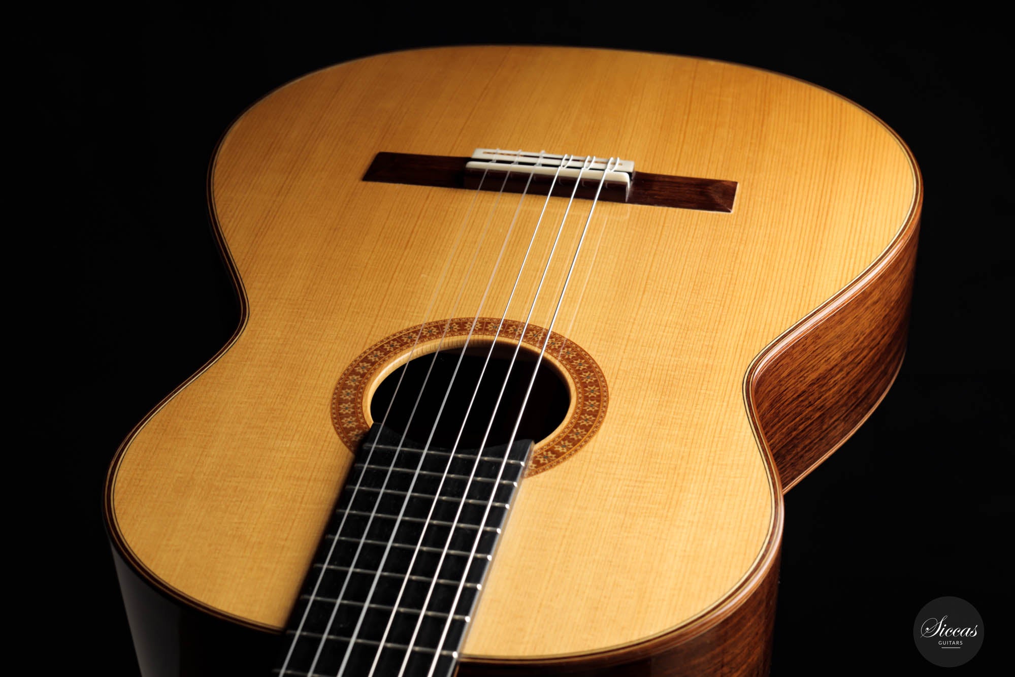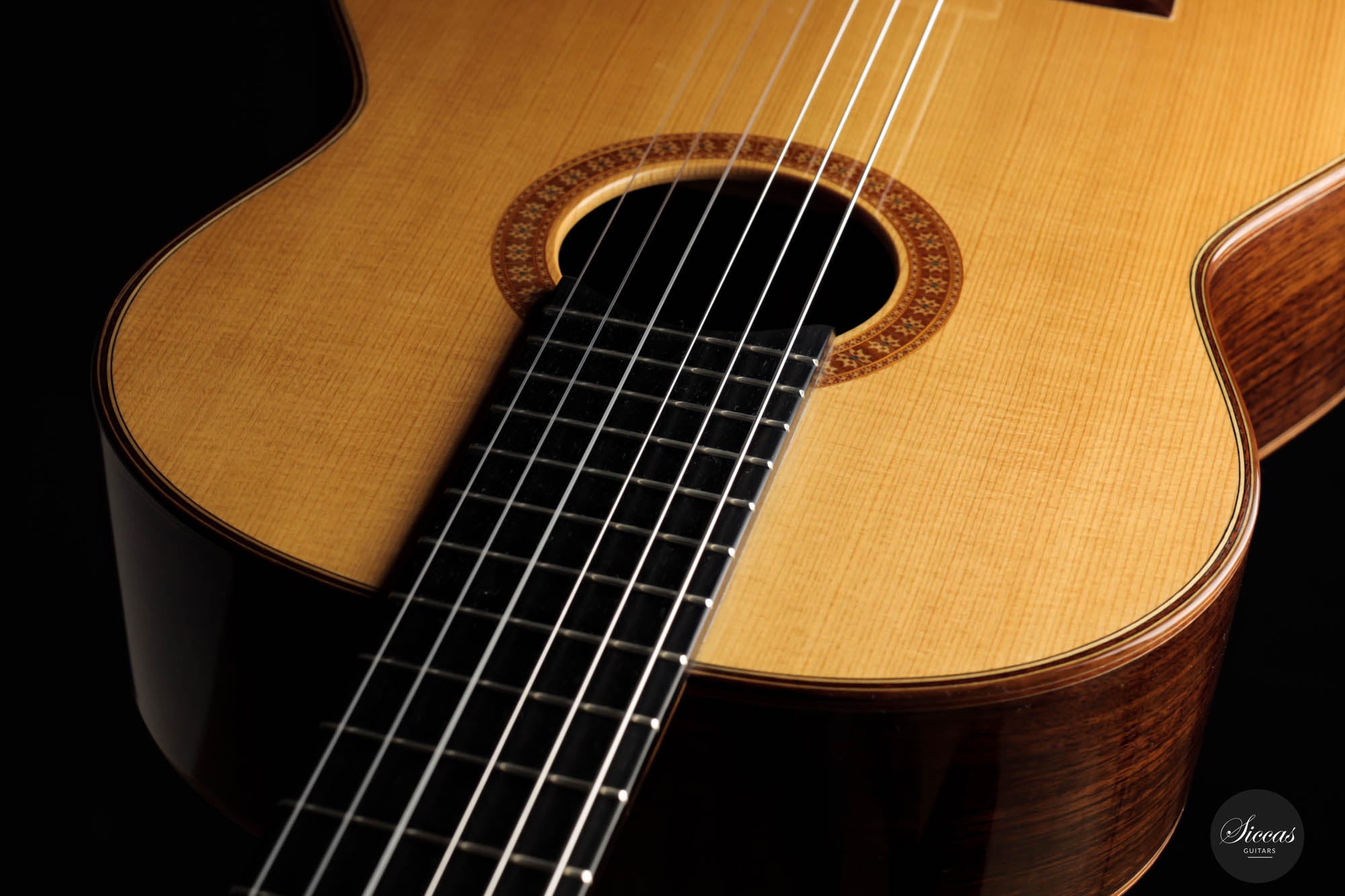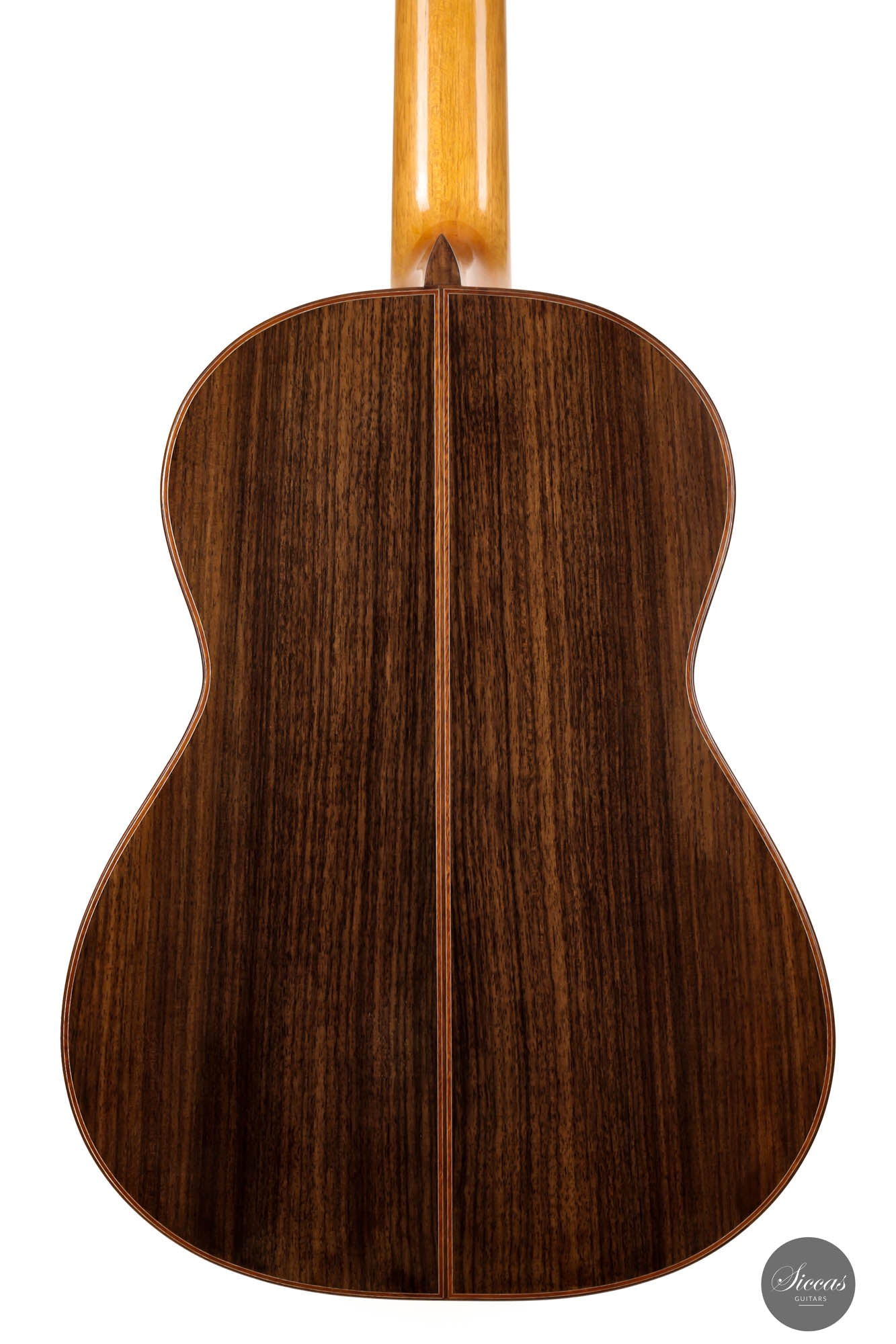 This instrument from 2015 was named Mirlo. It is in excellent condition as a pre-loved guitar with only superficial playing marks. This fine guitar has a honey-colored spruce soundboard decorated with a classy floral pattern rosette design. Moreover, Indian rosewood is the timber choice for the back and sides. Acoustically, this instrument has developed over the years, making it very open and responsive to the player's touch. Moreover, the outstanding balance, the richness of the timbre, the deepness of the basses, and the very satisfying volume provide the player with all the tools to approach any repertoire with great facility and pleasure.