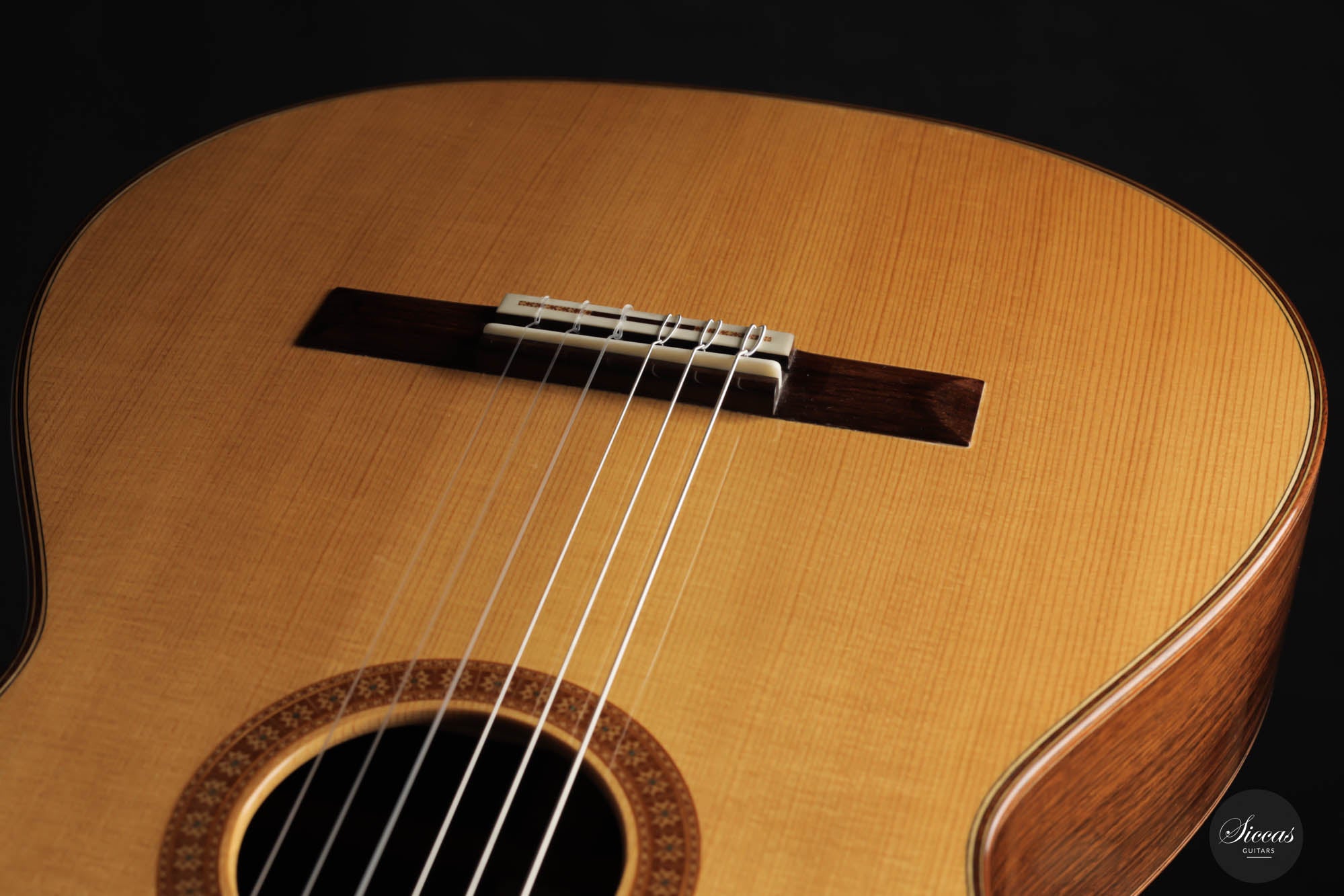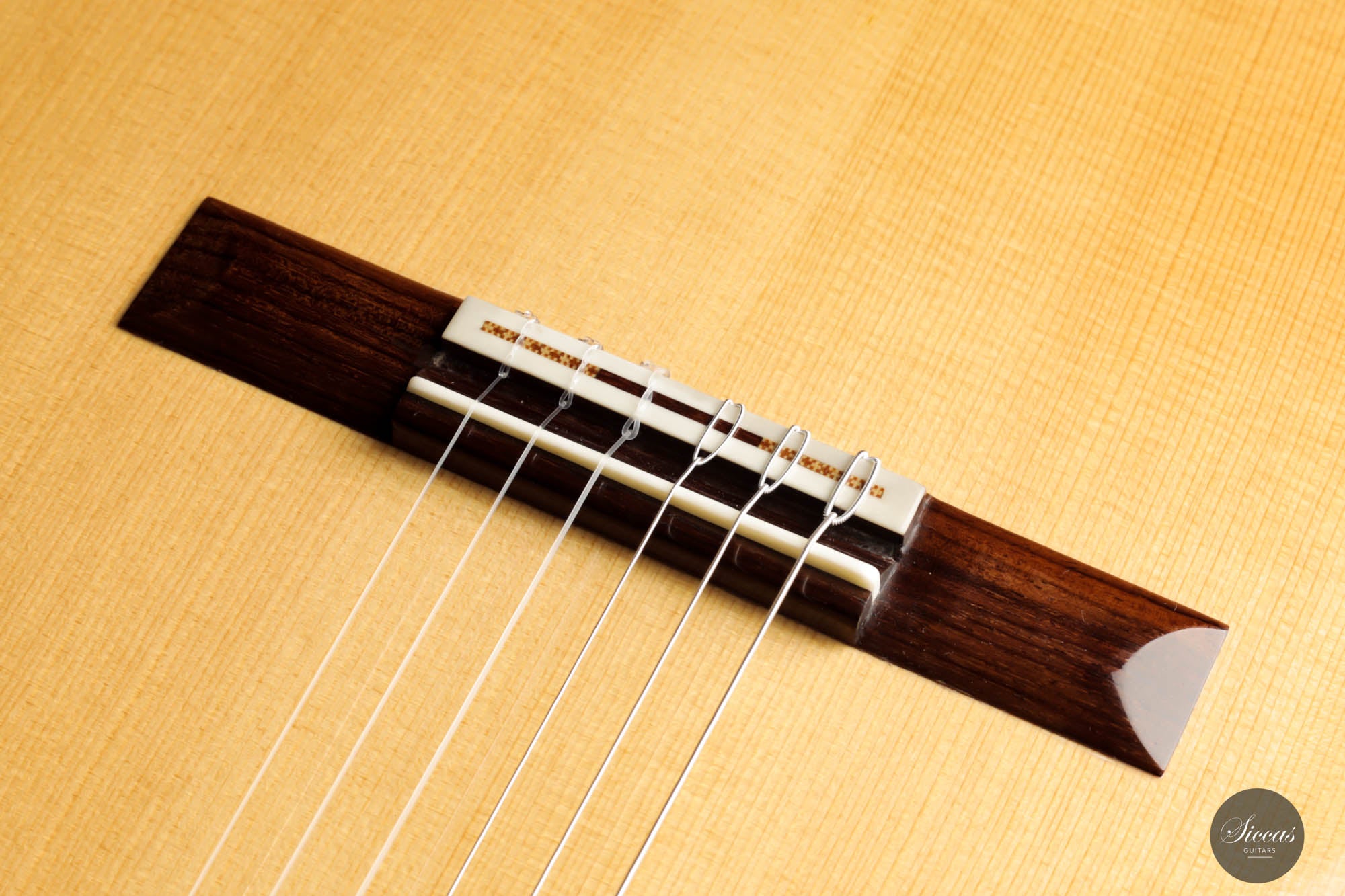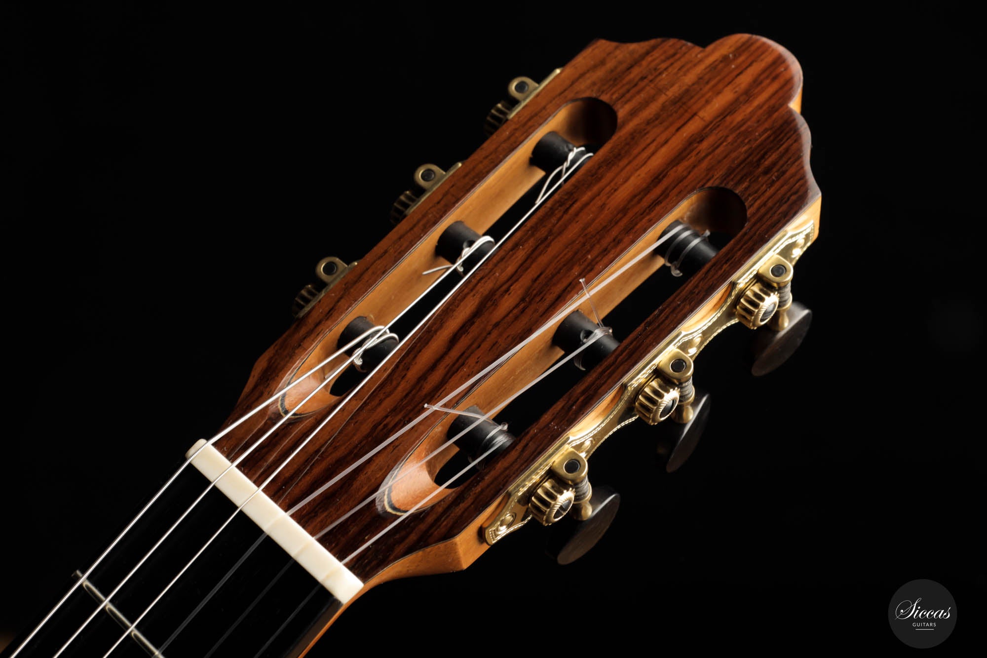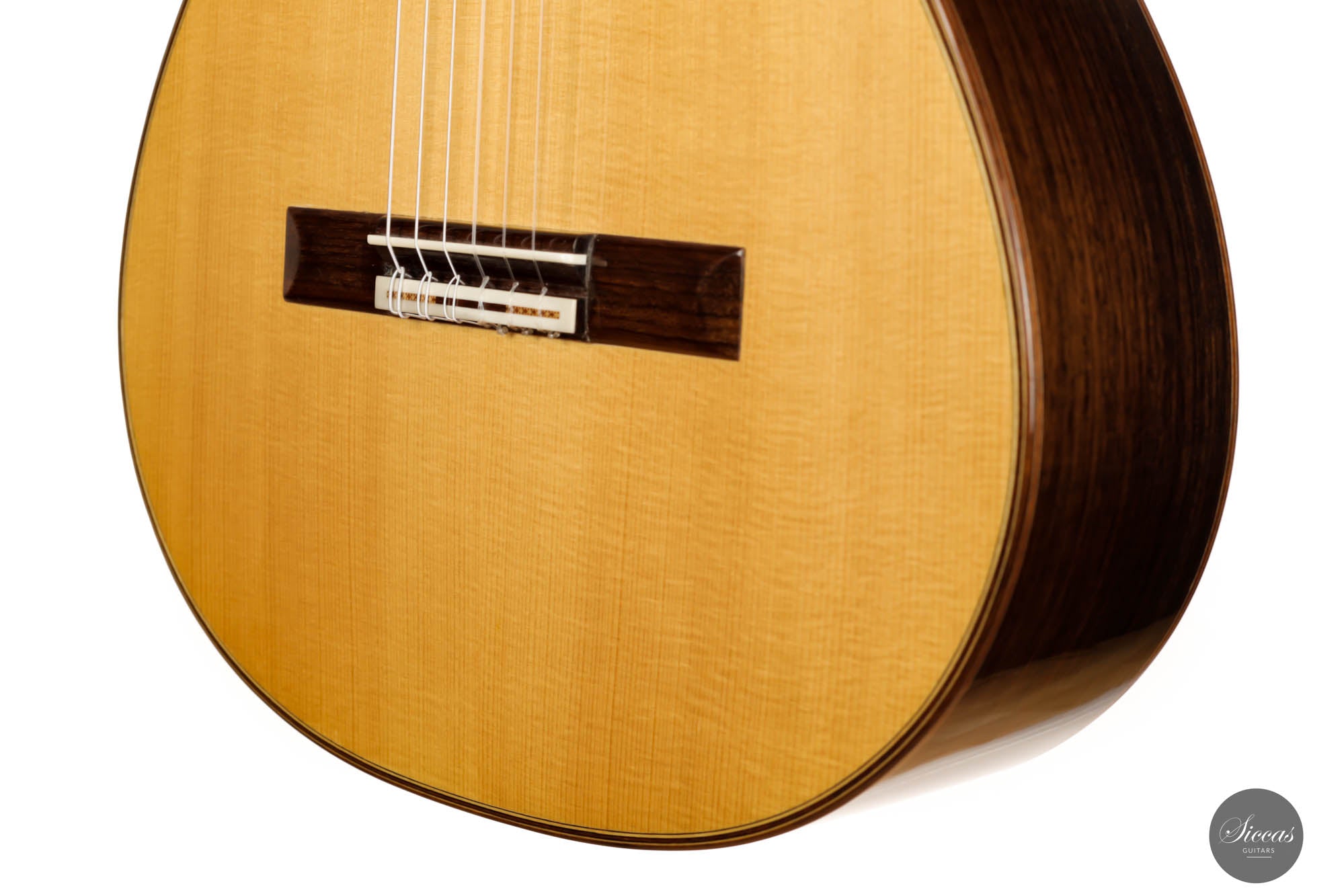 This instrument from 2015 was named Mirlo. It is in excellent condition as a pre-loved guitar with only superficial playing marks. This fine guitar has a honey-colored spruce soundboard decorated with a classy floral pattern rosette design. Moreover, Indian rosewood is the timber choice for the back and sides. Acoustically, this instrument has developed over the years, making it very open and responsive to the player's touch. Moreover, the outstanding balance, the richness of the timbre, the deepness of the basses, and the very satisfying volume provide the player with all the tools to approach any repertoire with great facility and pleasure.
