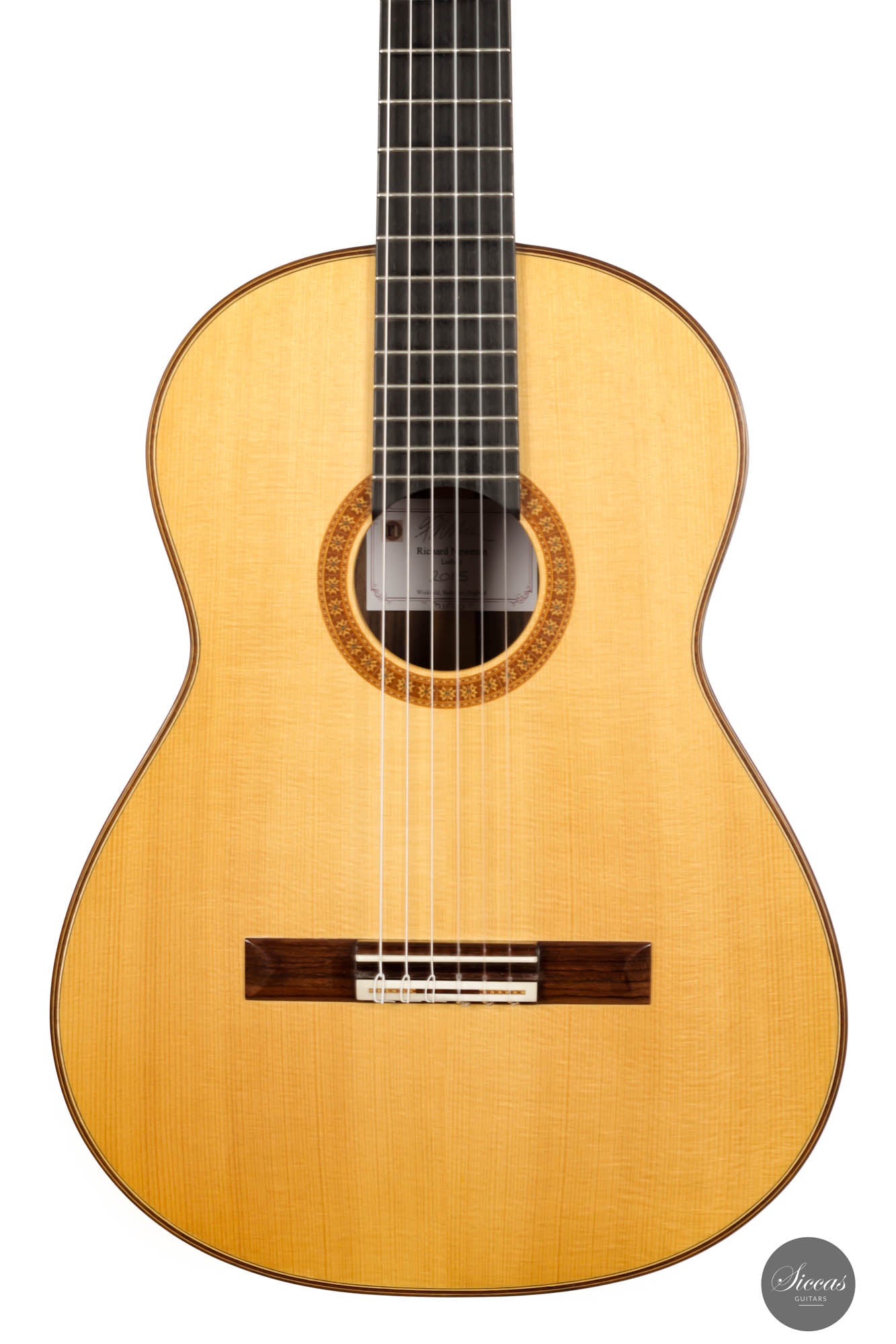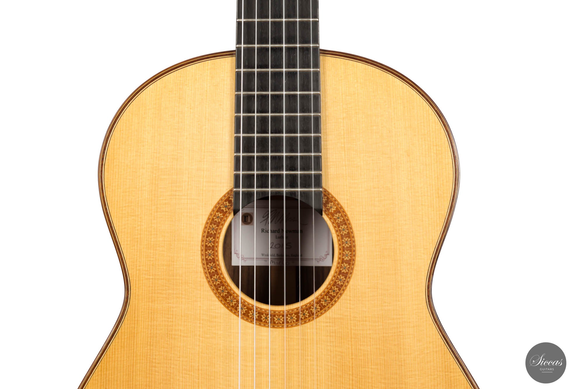 Richard Newman was born in 1964 and studied classical guitar in the mid ’90s under the guidance of Richard Wright (now head of the guitar section at the Yehudi Menuhin school of music). During his studies, he learned a lot about sound production and set out to find a good guitar with a traditional “old-world sound”. Failing to find the desired instrument, Richard enthusiastically decided, as he had worked with wood for many years as a tree surgeon, to try to build his guitar. With much encouragement from players, Richard built a handful of guitars and left his job and enrolled in a full-time guitar-making course at the London Guildhall University in 2001. After completing the course, Richard set up a workshop in Ascot, Berkshire, where he builds around twelve guitars a year. Richard makes using minimal machinery, concentrating on using traditional hand tools and glues, as he feels it is essential to be in touch with the materials to maintain control over his work. Richard has also received a lot of guidance and advice from professional players and other makers over the years. He also studied many master guitars, which has helped him evolve as a maker and produce well-balanced guitars with a low body resonance and fine projection. Richard continues creating guitars with great passion and enthusiasm.