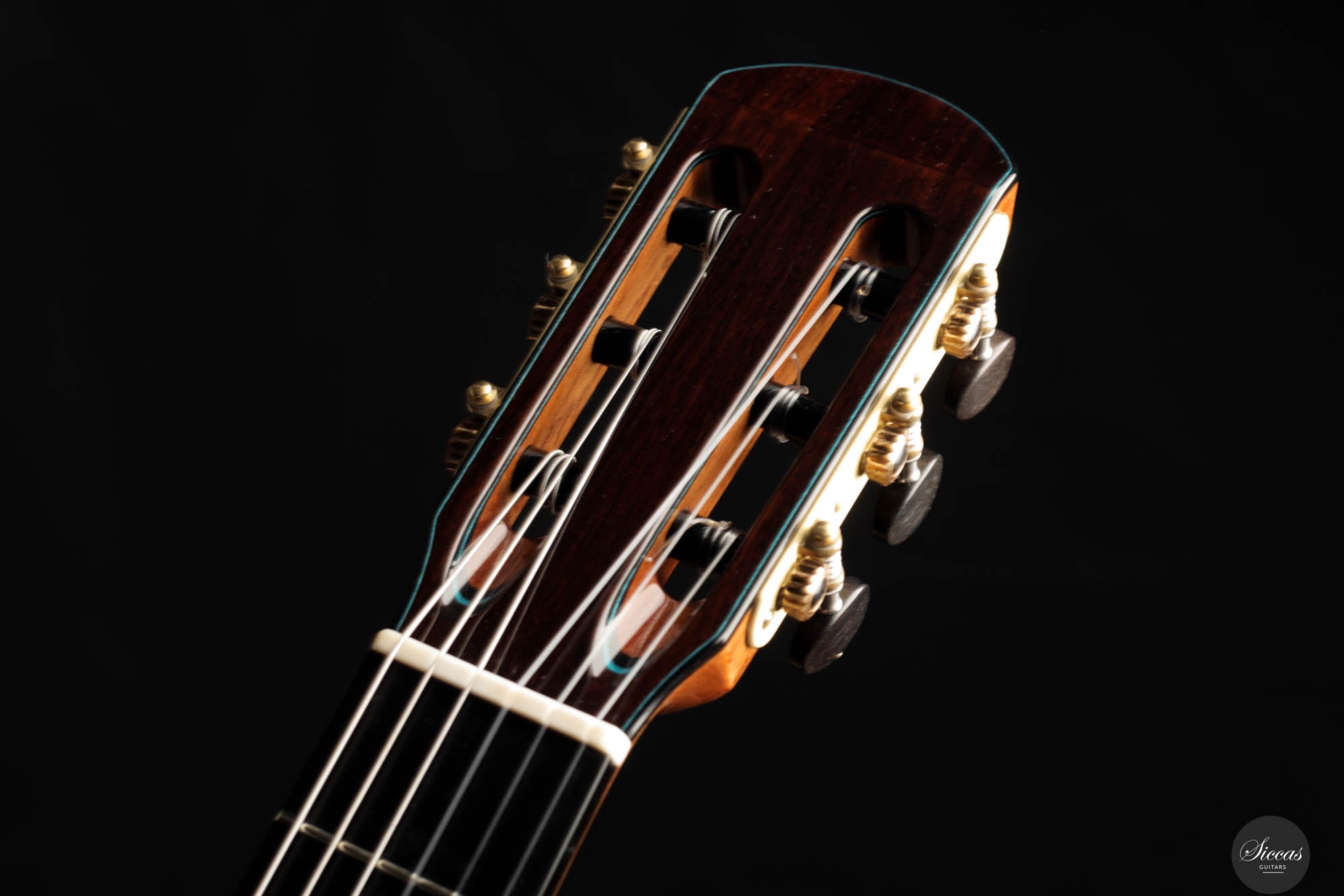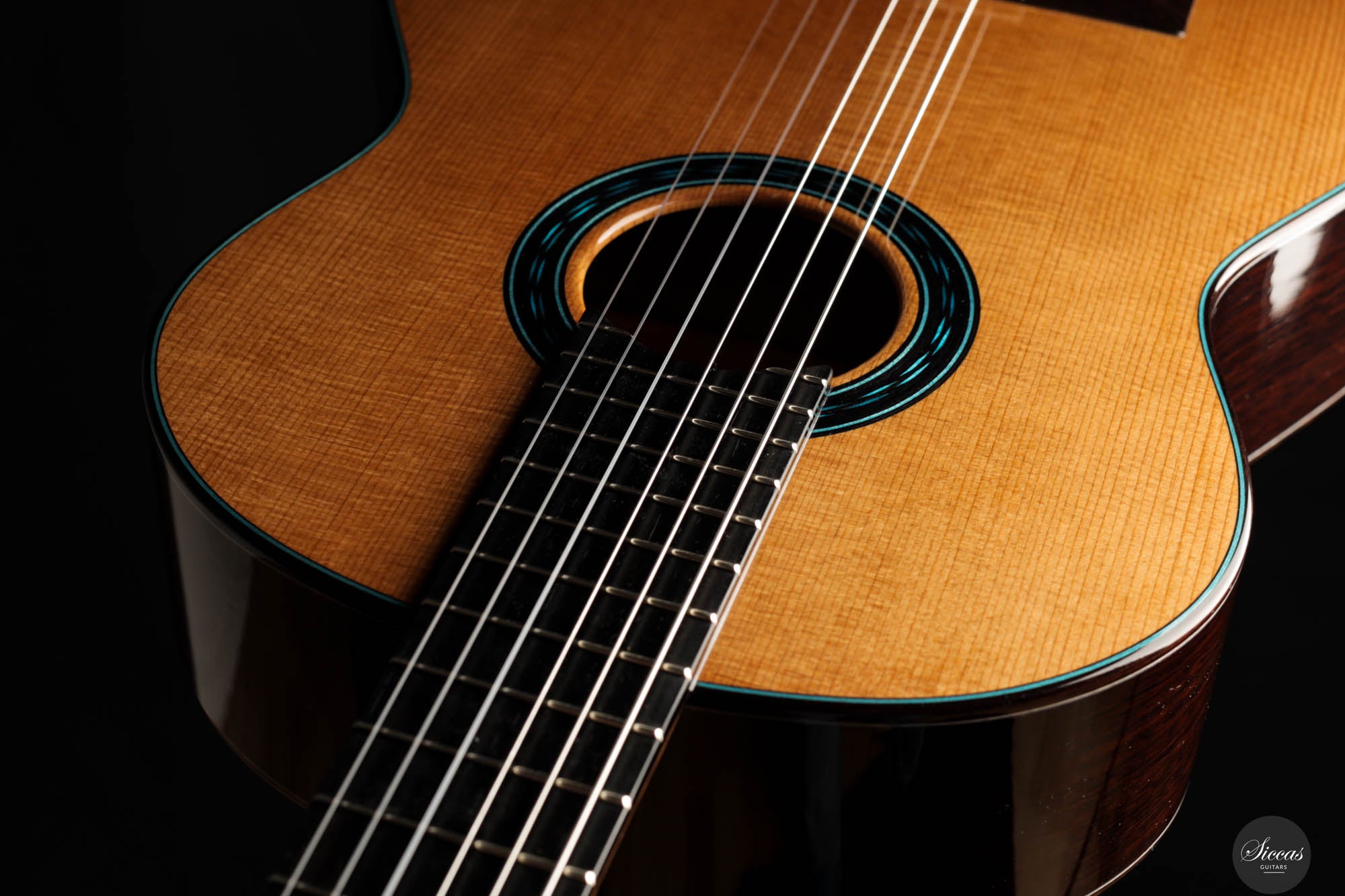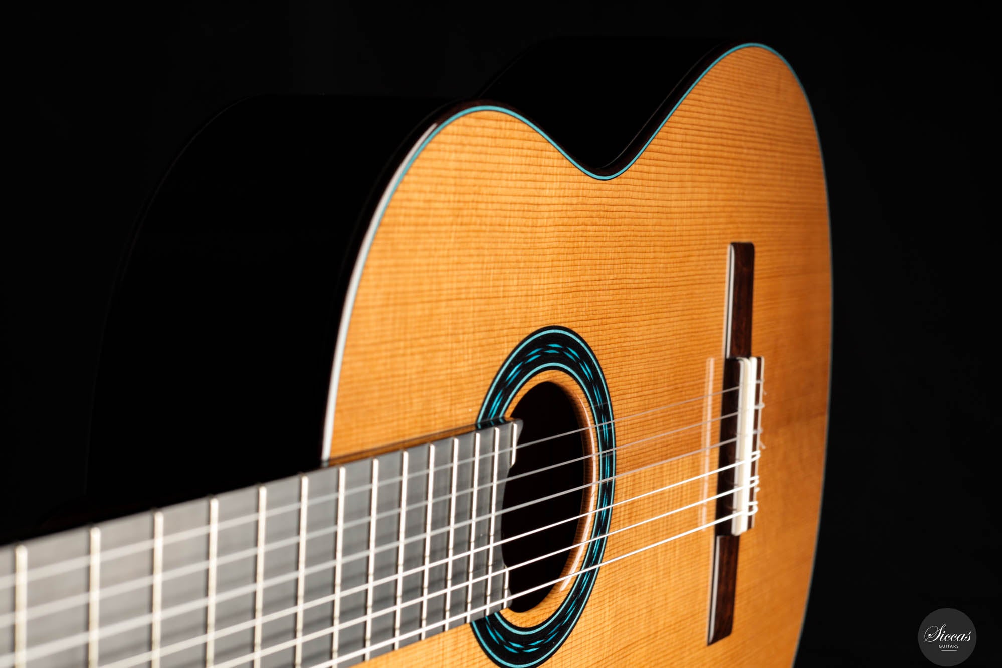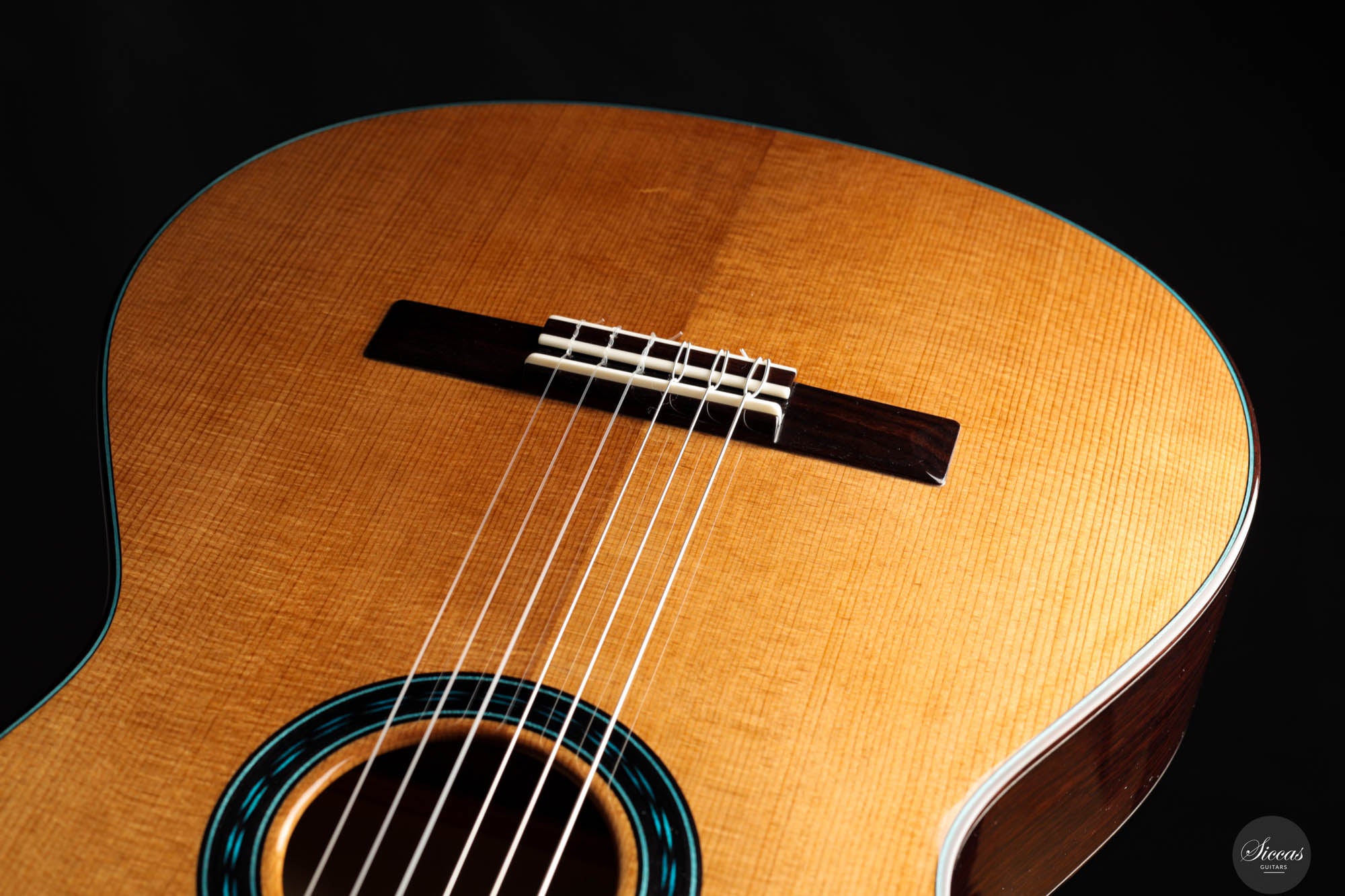 Die Ästhetik dieser Gitarre wird durch ihre Spielbarkeit ergänzt, wobei die Mensurlänge von 64 cm ein komfortables und ergonomisches Erlebnis für Gitarristen aller Stile bietet. Die durchdachte Konstruktion ermöglicht eine mühelose Navigation über das Griffbrett und erleichtert eine breite Palette musikalischer Ausdrücke, von zartem Fingerpicking bis zu robusten Schlagmustern. Die Lackierung erhöht nicht nur die Widerstandsfähigkeit der Gitarre gegen die Strapazen häufigen Gebrauchs, sondern dient auch dazu, ihre Schönheit und akustische Integrität über die Zeit zu bewahren. Für Musiker, die eine Mischung aus traditionellem Handwerk, außergewöhnlicher Klangqualität und einfacher Spielbarkeit suchen, sticht die Gitarre von Rinaldo Vacca aus dem Jahr 2024 als ein Instrument hervor, das Kreativität inspiriert und die Grenzen musikalischer Erkundung erweitert. Sie ist ein Zeugnis für Vaccas Können und Hingabe und bietet eine nahtlose Fusion aus Kunstfertigkeit und Funktionalität, die zweifellos das Repertoire jedes ernsthaften Gitarristen bereichern wird.