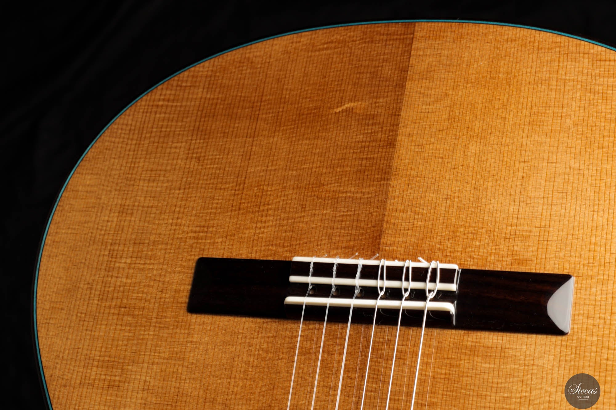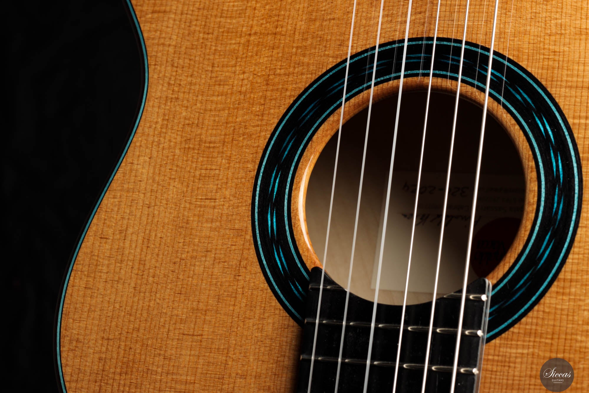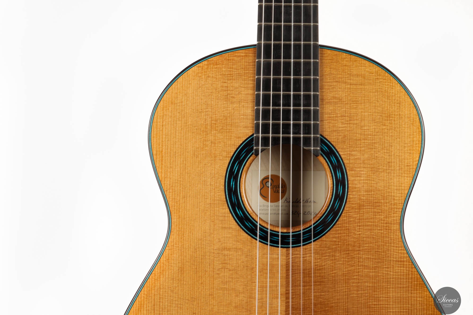 Die Gitarre von Rinaldo Vacca aus dem Jahr 2024, mit einer Mensurlänge von 64 cm, erweist sich als herausragendes Beispiel der renommierten italienischen Gitarrenbautradition und vereint das reiche Erbe des Handwerks mit der Präzision modernen akustischen Designs. Rinaldo Vacca, ein Meistergitarrenbauer mit weltweiter Anerkennung, bringt dieses vollständig aus Holz gefertigte Instrument mit Gitterverstrebung zum Leben, wobei er moderne Materialien wie Kohlenstoff oder Balsa meidet, um sich auf die natürliche Resonanz und Kraft des Holzes selbst zu konzentrieren. Das Ergebnis ist eine Gitarre mit einem überwältigenden Volumen und einer Reinheit des Tons, die die Seele des Zuhörers anspricht. Jeder Ton, der auf dieser Gitarre gespielt wird, resoniert mit einem reichen, authentischen Klang, ein Zeugnis für Vaccas akribischen Ansatz im Gitarrenbau. Die thermisch behandelte Fichtendecke der Gitarre fügt nicht nur einen Vintage-Appeal hinzu, sondern arbeitet auch in Harmonie mit dem indischen Palisander für Rücken und Seiten, die innen mit spanischem Zypressenholz verdoppelt sind, um einen Klang zu erzeugen, der sowohl warm als auch lebendig ist und die Echos des klassischen Gitarrenerbes trägt.