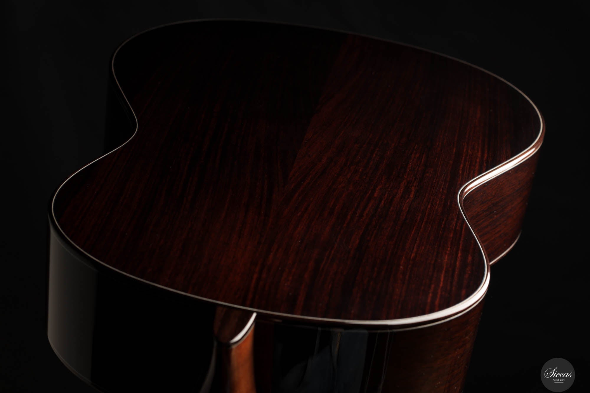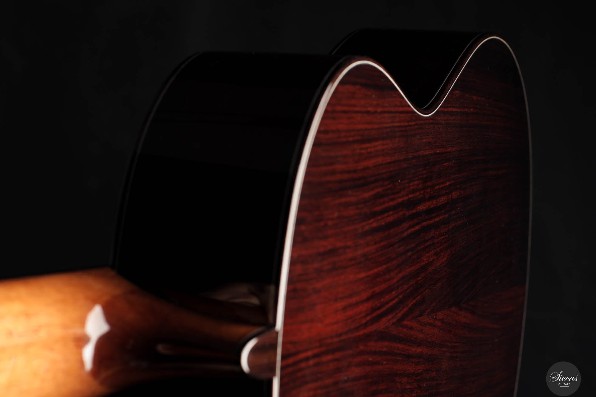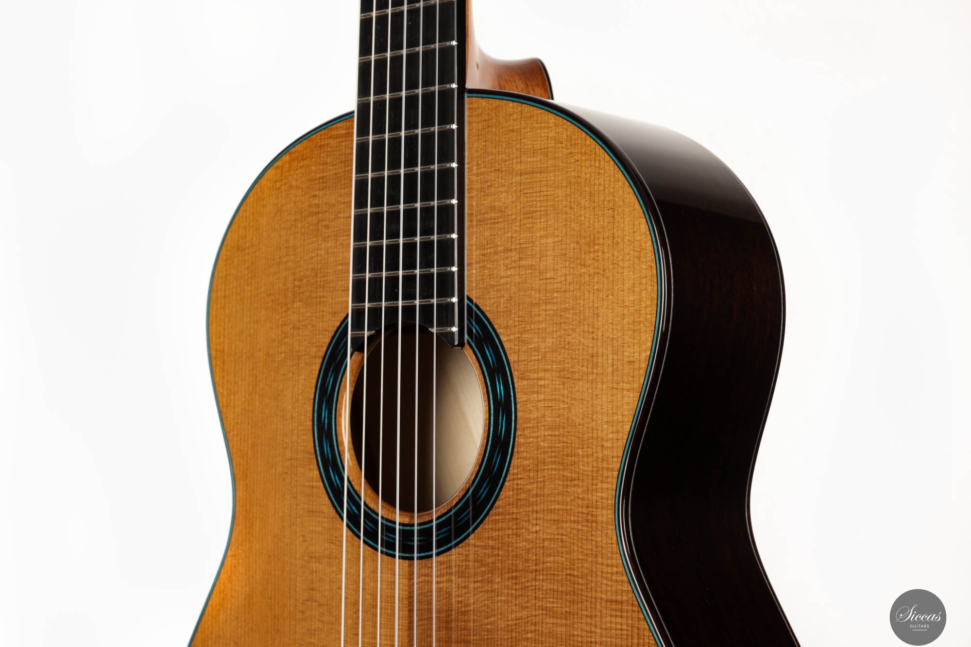 Die Gitarre von Rinaldo Vacca aus dem Jahr 2024, mit einer Mensurlänge von 64 cm, erweist sich als herausragendes Beispiel der renommierten italienischen Gitarrenbautradition und vereint das reiche Erbe des Handwerks mit der Präzision modernen akustischen Designs. Rinaldo Vacca, ein Meistergitarrenbauer mit weltweiter Anerkennung, bringt dieses vollständig aus Holz gefertigte Instrument mit Gitterverstrebung zum Leben, wobei er moderne Materialien wie Kohlenstoff oder Balsa meidet, um sich auf die natürliche Resonanz und Kraft des Holzes selbst zu konzentrieren. Das Ergebnis ist eine Gitarre mit einem überwältigenden Volumen und einer Reinheit des Tons, die die Seele des Zuhörers anspricht. Jeder Ton, der auf dieser Gitarre gespielt wird, resoniert mit einem reichen, authentischen Klang, ein Zeugnis für Vaccas akribischen Ansatz im Gitarrenbau. Die thermisch behandelte Fichtendecke der Gitarre fügt nicht nur einen Vintage-Appeal hinzu, sondern arbeitet auch in Harmonie mit dem indischen Palisander für Rücken und Seiten, die innen mit spanischem Zypressenholz verdoppelt sind, um einen Klang zu erzeugen, der sowohl warm als auch lebendig ist und die Echos des klassischen Gitarrenerbes trägt.