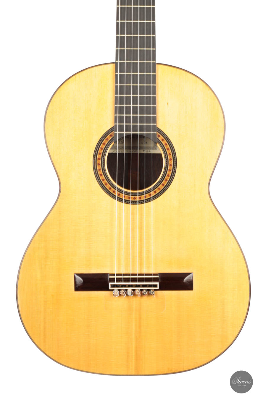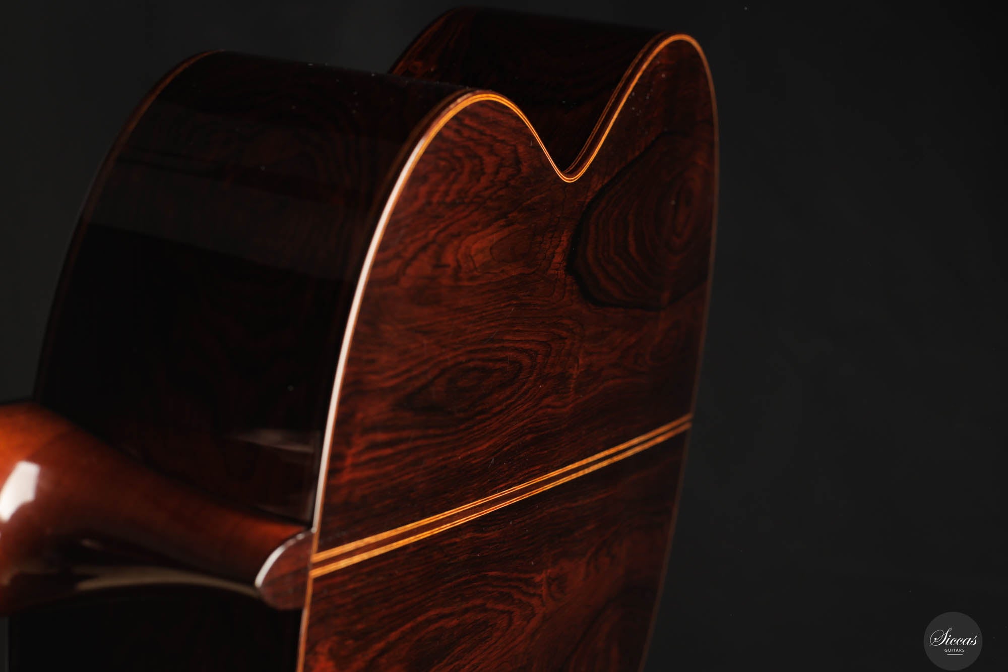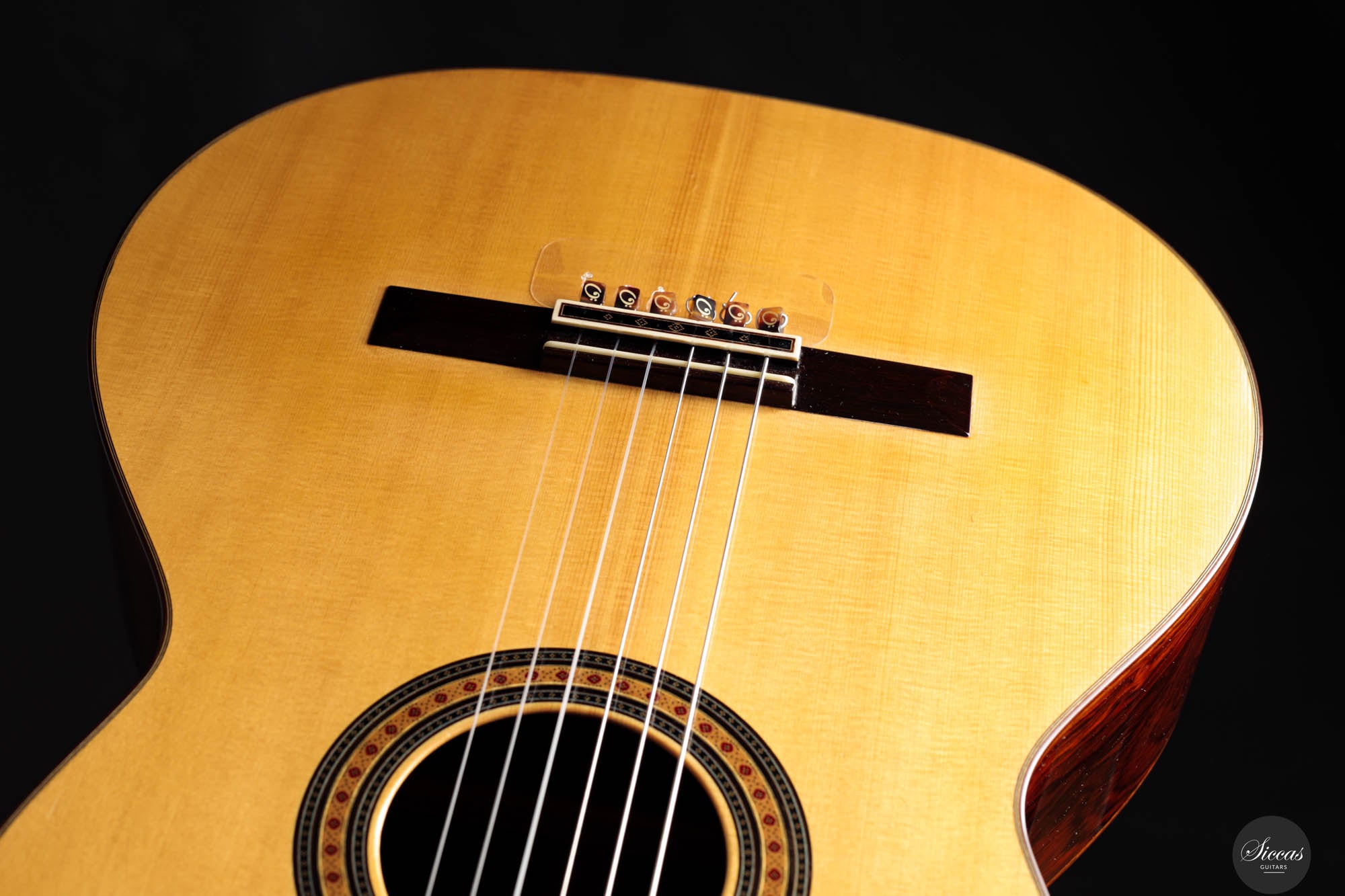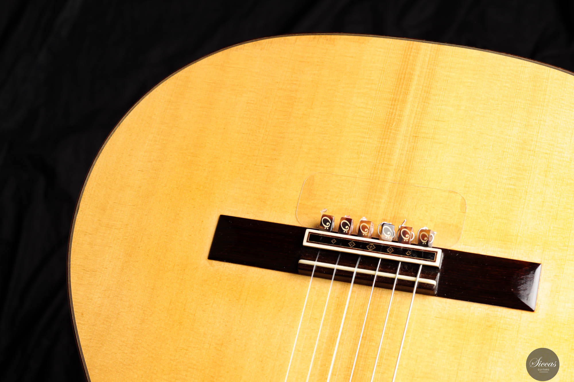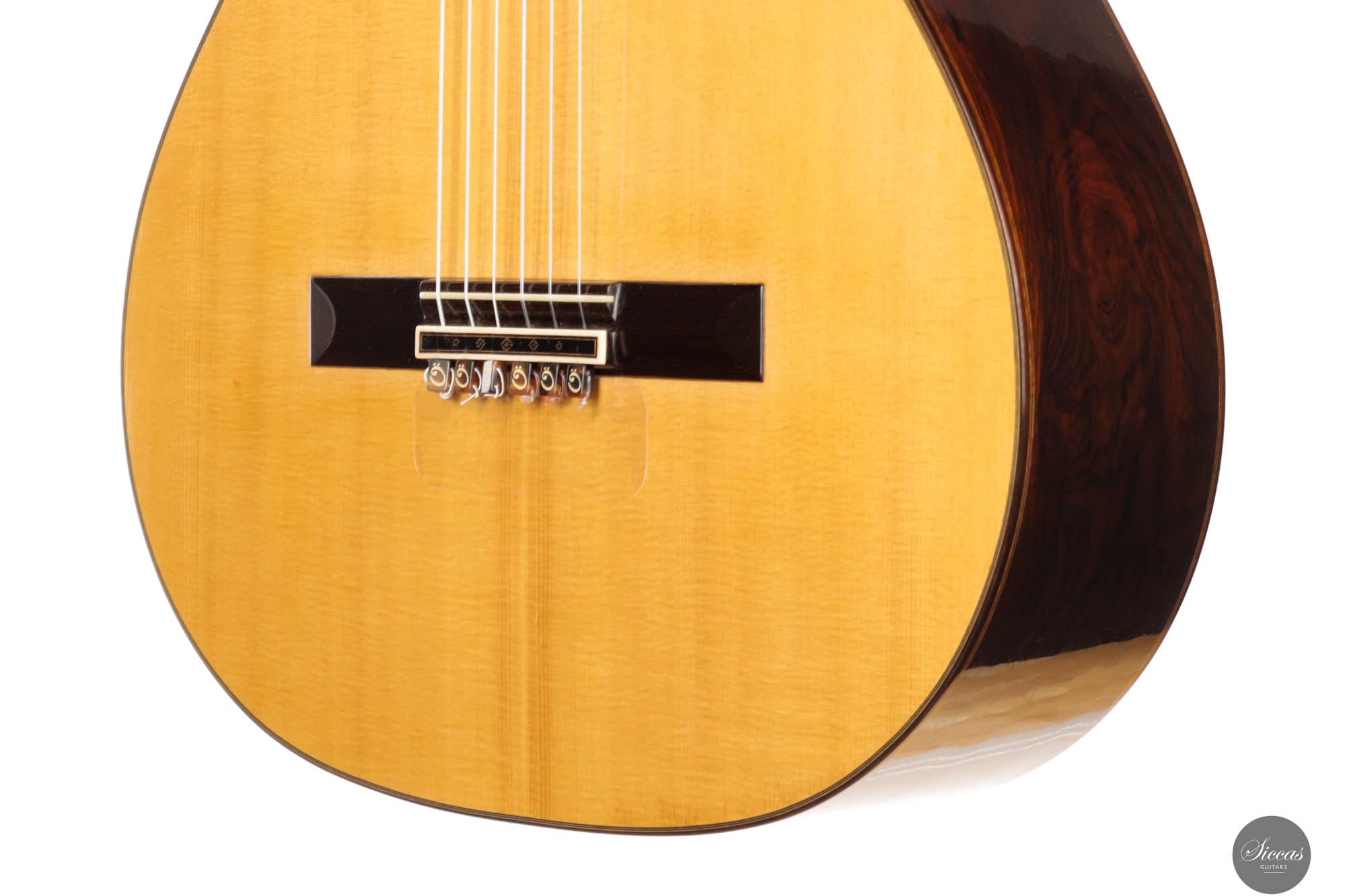 Die Fichtendecke hat mit der Zeit eine reiche, reife Farbe entwickelt, die einen auffälligen Kontrast zum dunklen brasilianischen Rosenholz bildet, das für Rücken und Zargen verwendet wurde. Doch diese Gitarre ist weit mehr als nur ein visuelles Meisterwerk oder ein Sammlerstück: Sie ist ein hervorragendes Konzertinstrument mit atemberaubenden Klangeigenschaften. Der Klang ist reif, perfekt ausgewogen und kraftvoll, mit nahezu endlosem Sustain. Tiefe, abgerundete Bässe verschmelzen nahtlos mit den reichen, obertonreichen Höhen und bieten einen Klang, der sowohl offen als auch voller Charakter ist. Trotz der langen Mensur ist die Gitarre dank ihres gut geformten Halsprofils und der reaktionsfreudigen Decke sehr angenehm zu spielen. Der Zustand dieser Gitarre ist ausgezeichnet und zeigt lediglich normale Gebrauchsspuren sowie leichte Spiel- und Nagelspuren auf der Decke und feine Kratzer auf dem Boden.