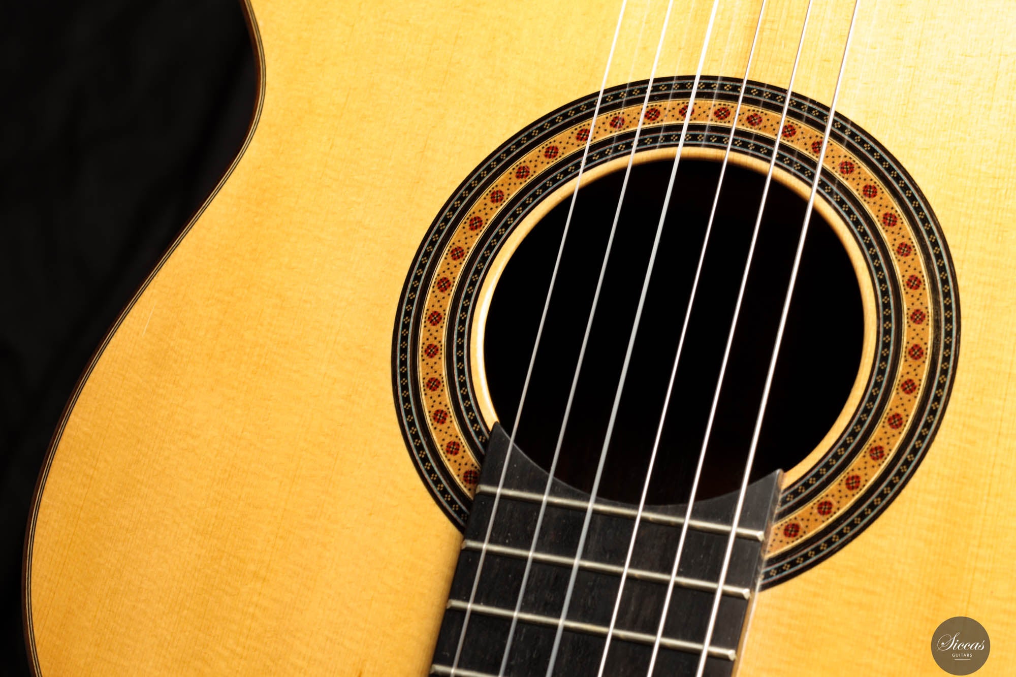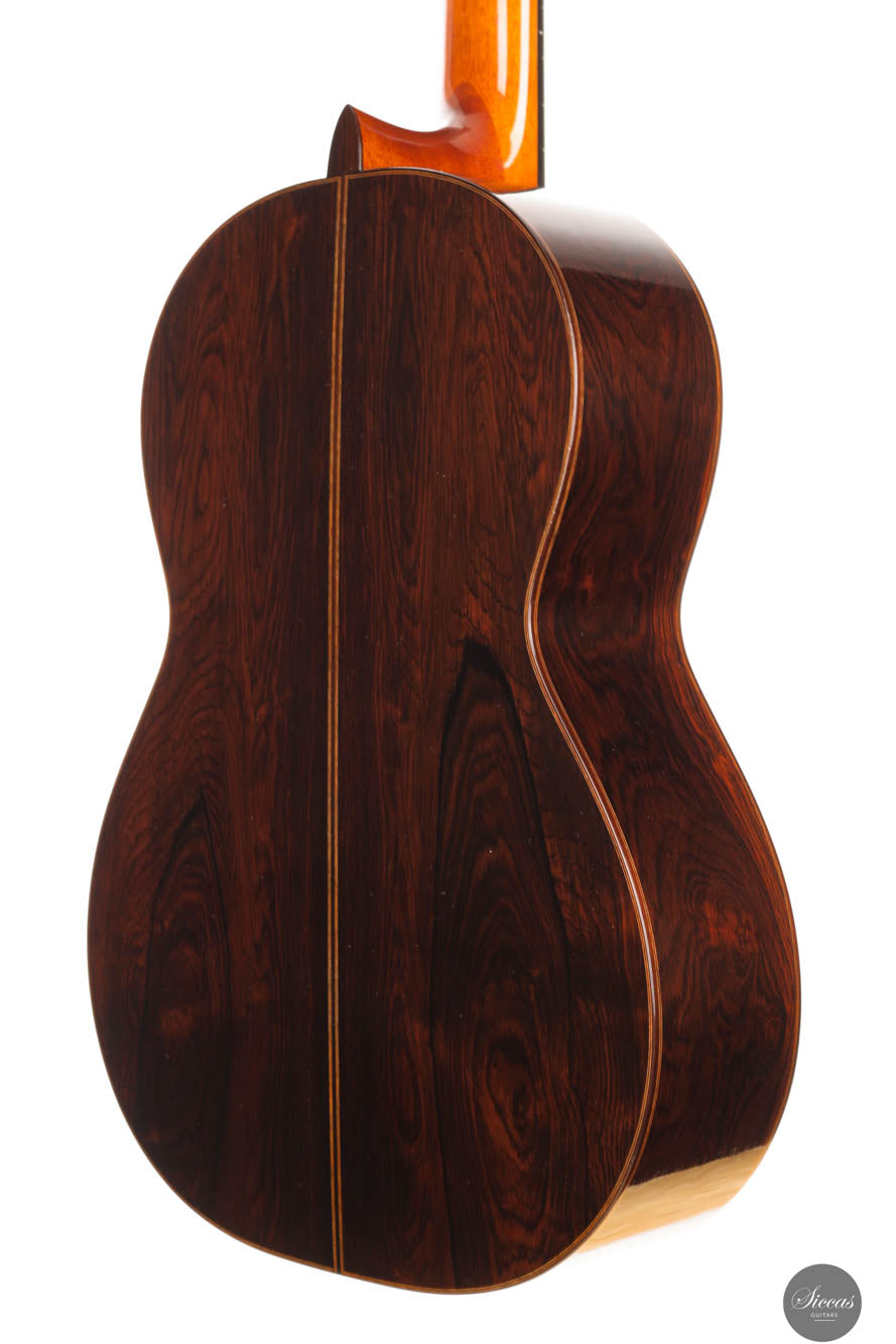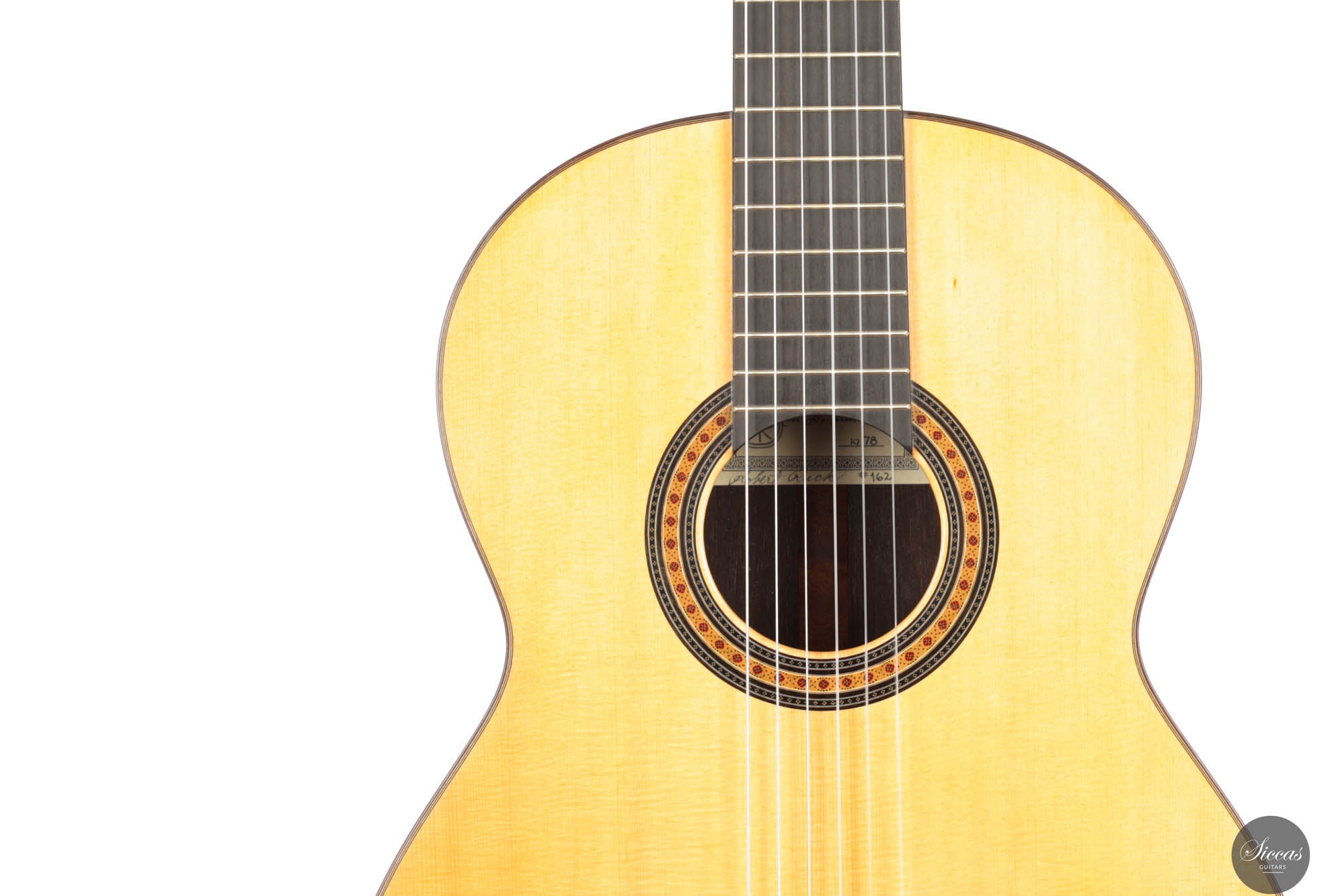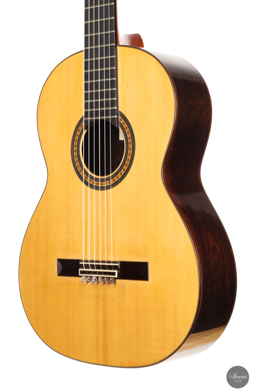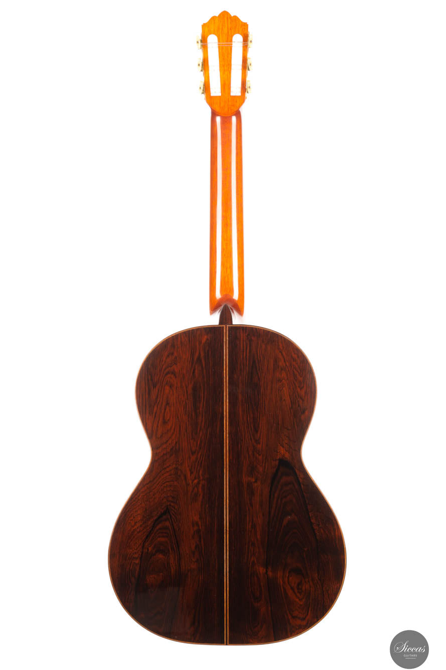 Die Fichtendecke hat mit der Zeit eine reiche, reife Farbe entwickelt, die einen auffälligen Kontrast zum dunklen brasilianischen Rosenholz bildet, das für Rücken und Zargen verwendet wurde. Doch diese Gitarre ist weit mehr als nur ein visuelles Meisterwerk oder ein Sammlerstück: Sie ist ein hervorragendes Konzertinstrument mit atemberaubenden Klangeigenschaften. Der Klang ist reif, perfekt ausgewogen und kraftvoll, mit nahezu endlosem Sustain. Tiefe, abgerundete Bässe verschmelzen nahtlos mit den reichen, obertonreichen Höhen und bieten einen Klang, der sowohl offen als auch voller Charakter ist. Trotz der langen Mensur ist die Gitarre dank ihres gut geformten Halsprofils und der reaktionsfreudigen Decke sehr angenehm zu spielen. Der Zustand dieser Gitarre ist ausgezeichnet und zeigt lediglich normale Gebrauchsspuren sowie leichte Spiel- und Nagelspuren auf der Decke und feine Kratzer auf dem Boden.