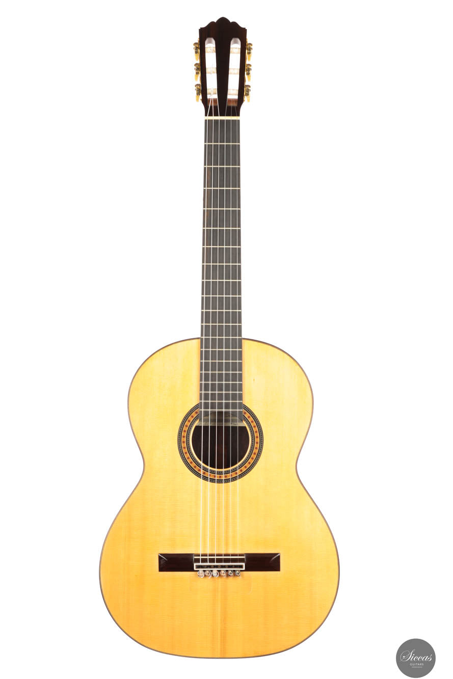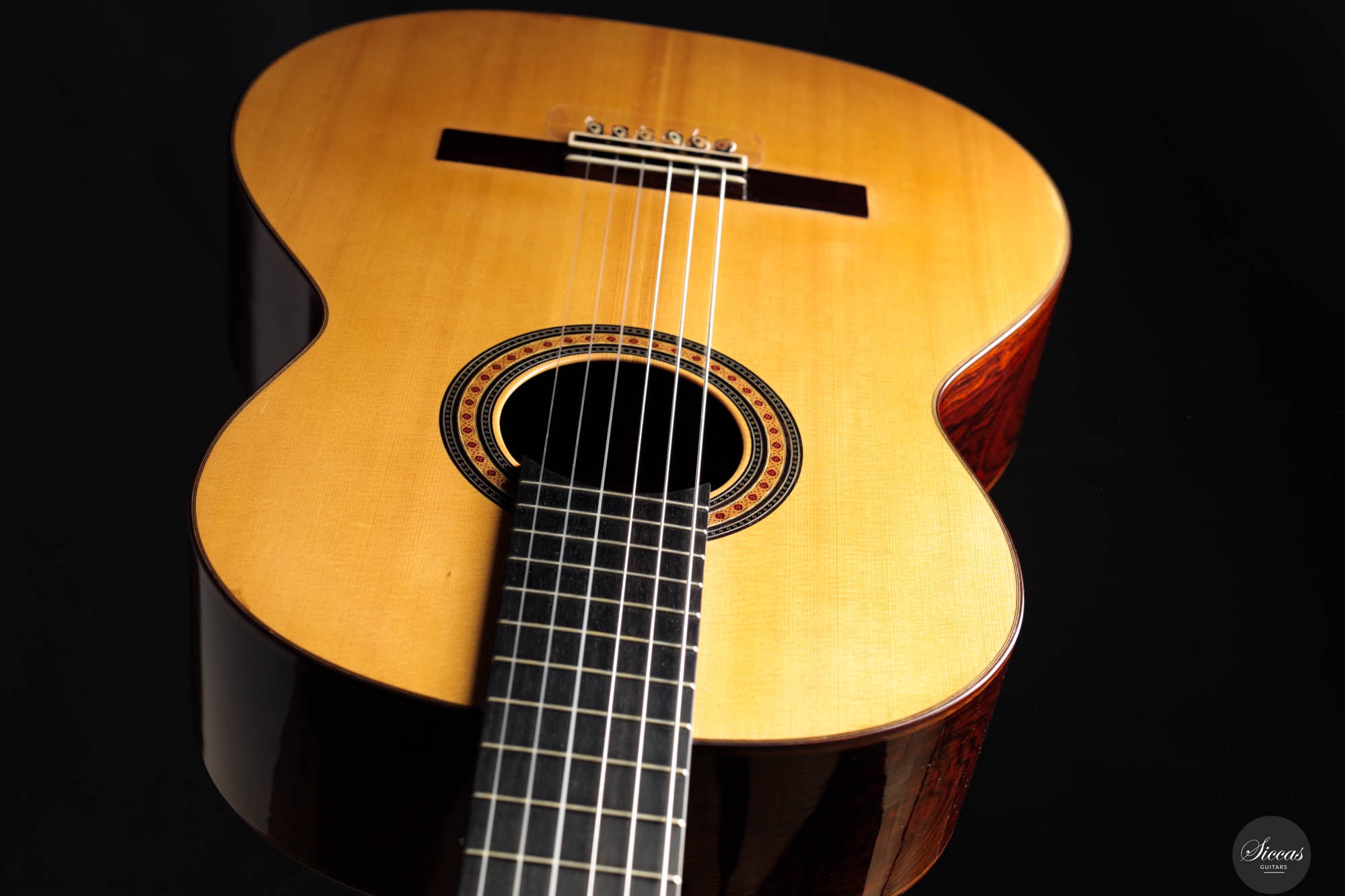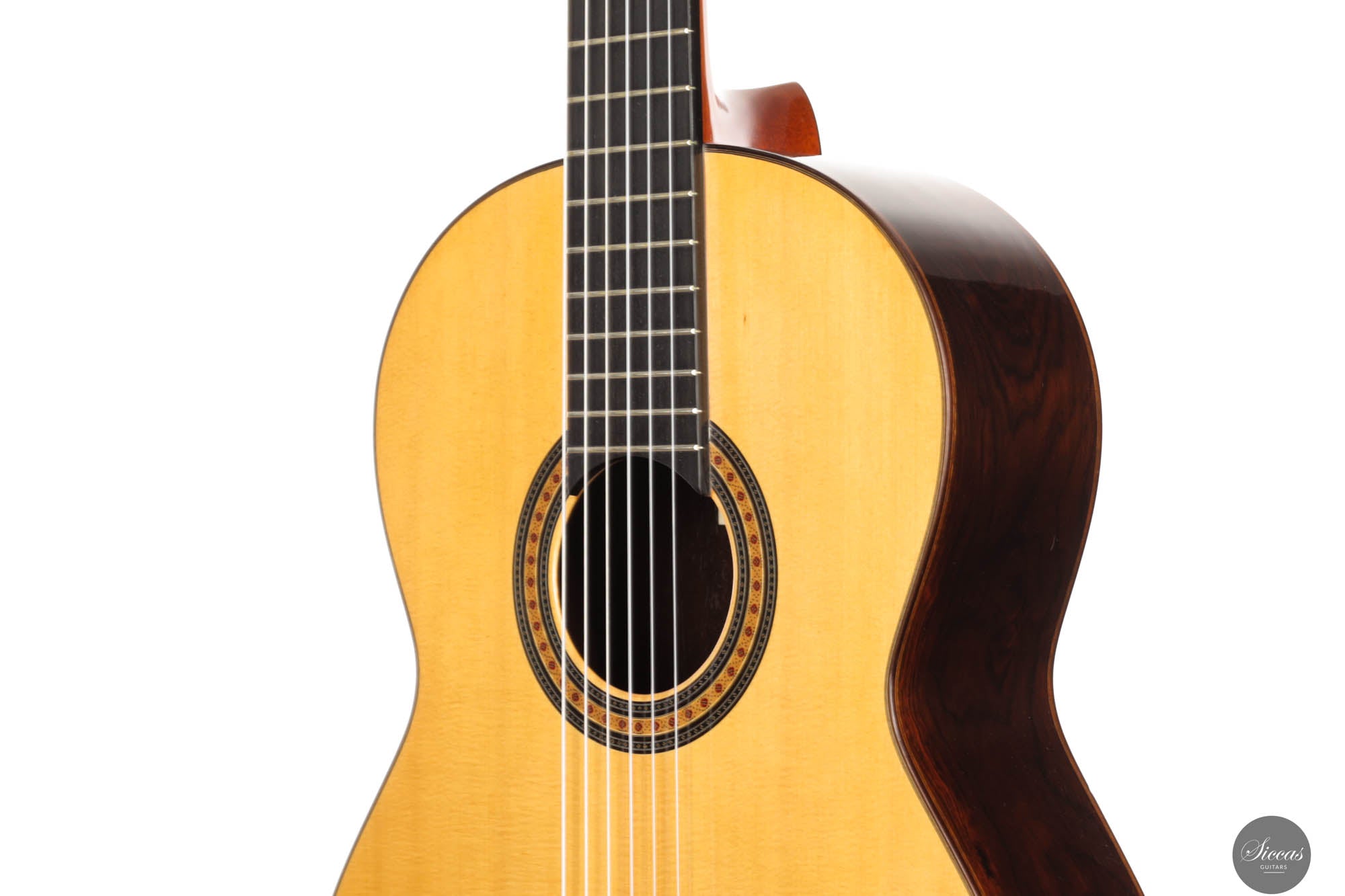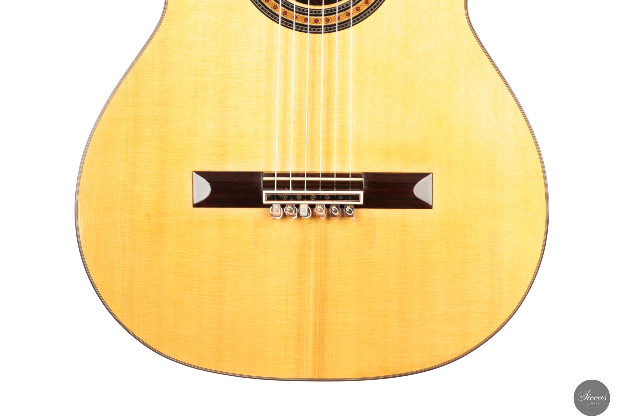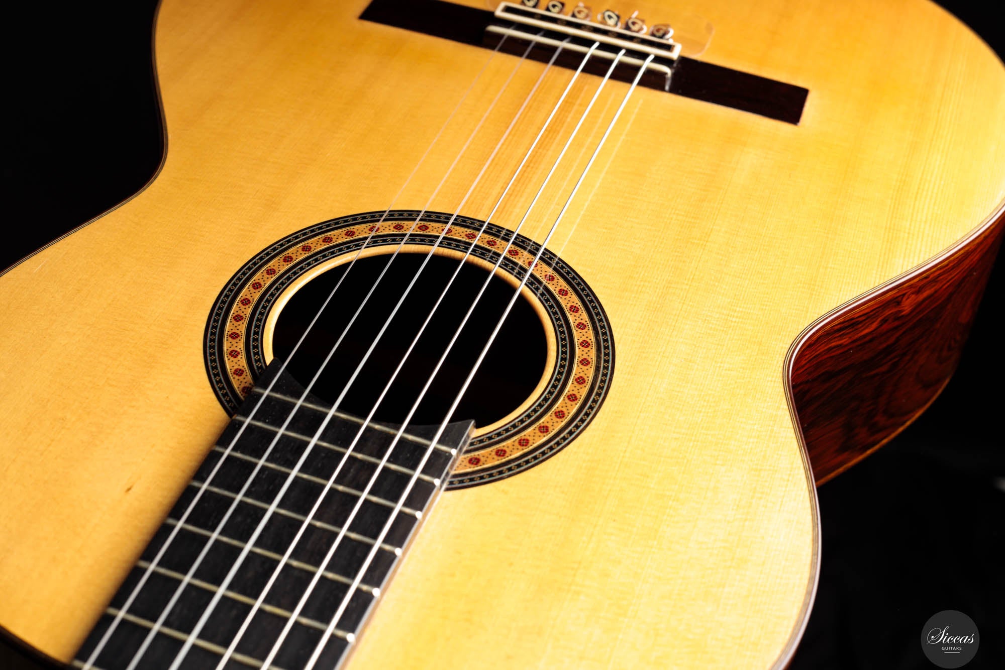 Die Fichtendecke hat mit der Zeit eine reiche, reife Farbe entwickelt, die einen auffälligen Kontrast zum dunklen brasilianischen Rosenholz bildet, das für Rücken und Zargen verwendet wurde. Doch diese Gitarre ist weit mehr als nur ein visuelles Meisterwerk oder ein Sammlerstück: Sie ist ein hervorragendes Konzertinstrument mit atemberaubenden Klangeigenschaften. Der Klang ist reif, perfekt ausgewogen und kraftvoll, mit nahezu endlosem Sustain. Tiefe, abgerundete Bässe verschmelzen nahtlos mit den reichen, obertonreichen Höhen und bieten einen Klang, der sowohl offen als auch voller Charakter ist. Trotz der langen Mensur ist die Gitarre dank ihres gut geformten Halsprofils und der reaktionsfreudigen Decke sehr angenehm zu spielen. Der Zustand dieser Gitarre ist ausgezeichnet und zeigt lediglich normale Gebrauchsspuren sowie leichte Spiel- und Nagelspuren auf der Decke und feine Kratzer auf dem Boden.