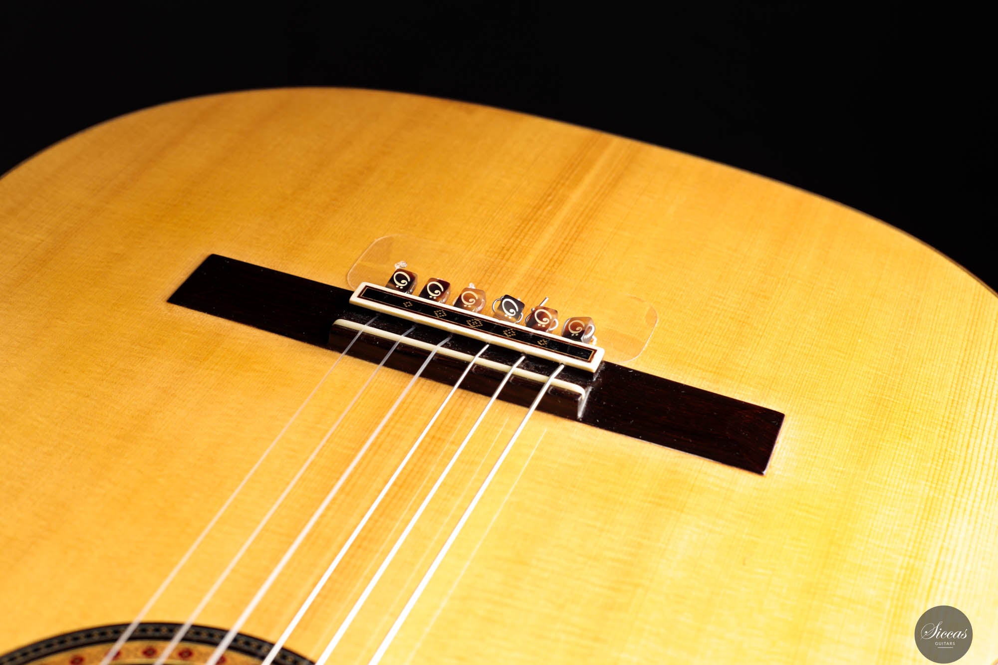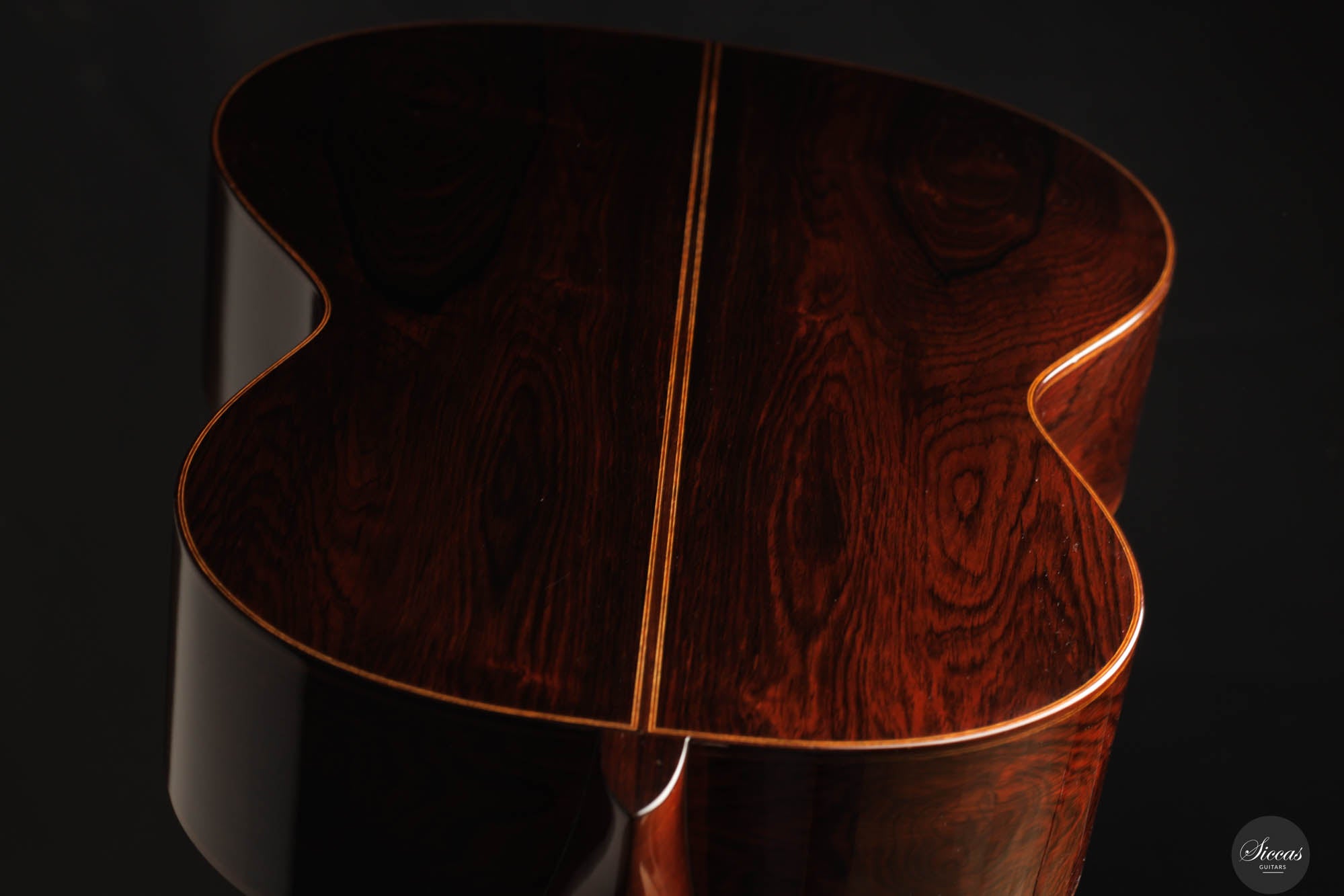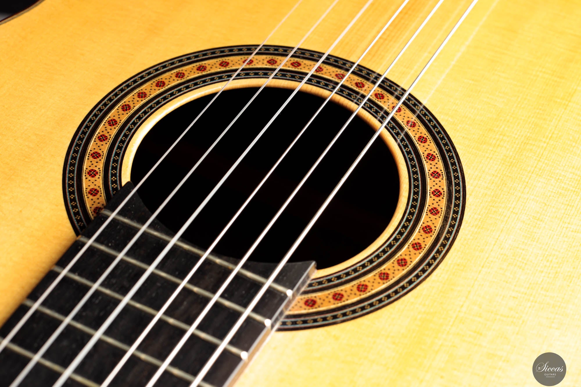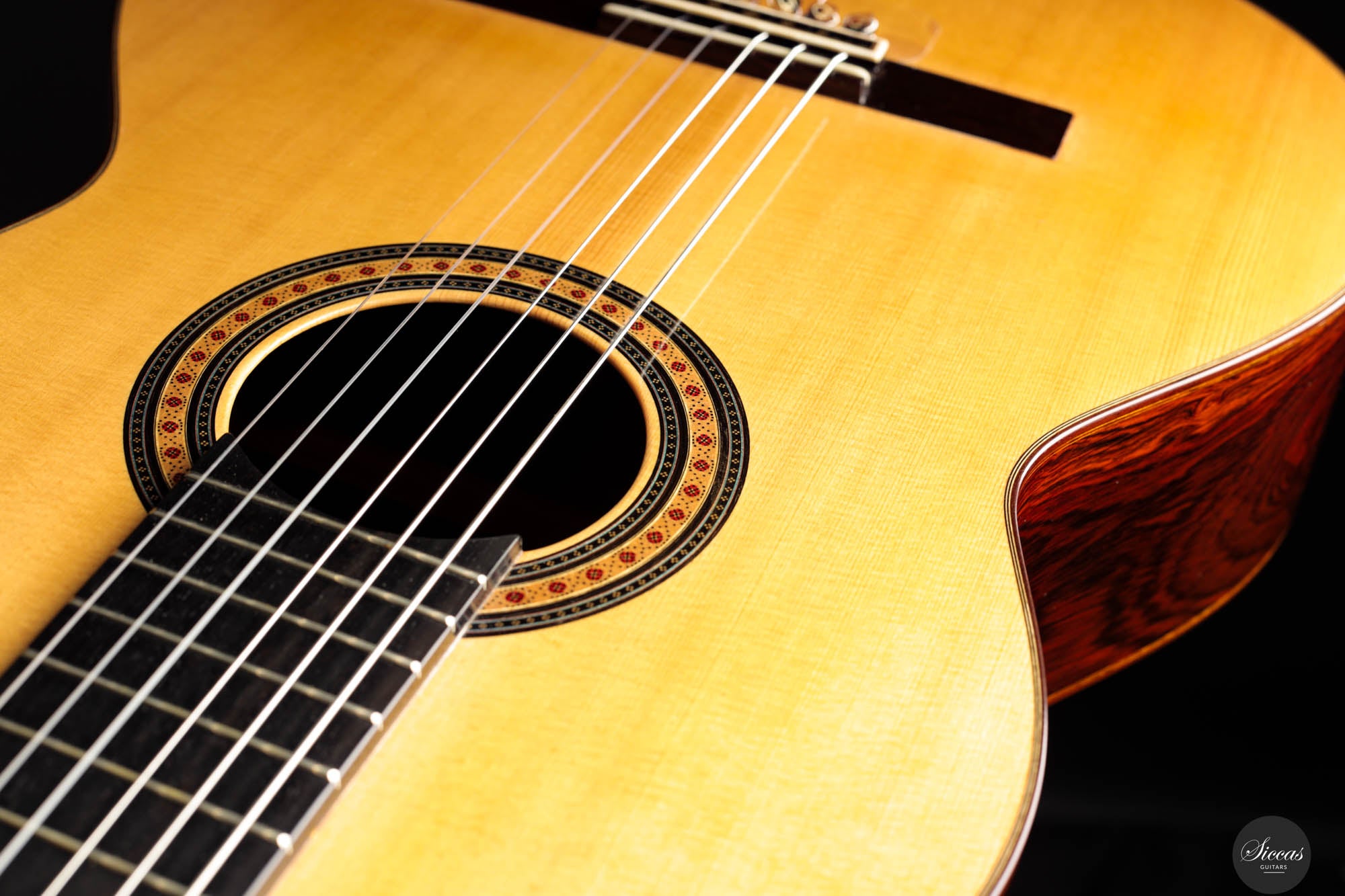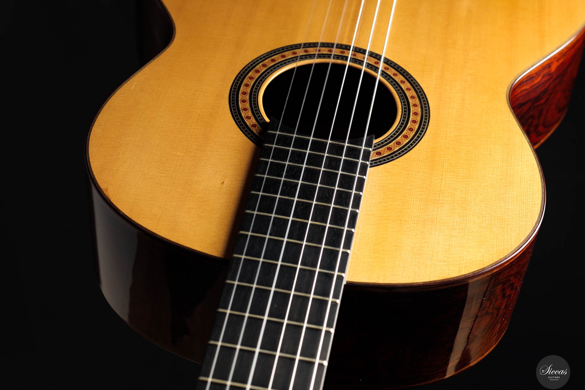 Die Fichtendecke hat mit der Zeit eine reiche, reife Farbe entwickelt, die einen auffälligen Kontrast zum dunklen brasilianischen Rosenholz bildet, das für Rücken und Zargen verwendet wurde. Doch diese Gitarre ist weit mehr als nur ein visuelles Meisterwerk oder ein Sammlerstück: Sie ist ein hervorragendes Konzertinstrument mit atemberaubenden Klangeigenschaften. Der Klang ist reif, perfekt ausgewogen und kraftvoll, mit nahezu endlosem Sustain. Tiefe, abgerundete Bässe verschmelzen nahtlos mit den reichen, obertonreichen Höhen und bieten einen Klang, der sowohl offen als auch voller Charakter ist. Trotz der langen Mensur ist die Gitarre dank ihres gut geformten Halsprofils und der reaktionsfreudigen Decke sehr angenehm zu spielen. Der Zustand dieser Gitarre ist ausgezeichnet und zeigt lediglich normale Gebrauchsspuren sowie leichte Spiel- und Nagelspuren auf der Decke und feine Kratzer auf dem Boden.