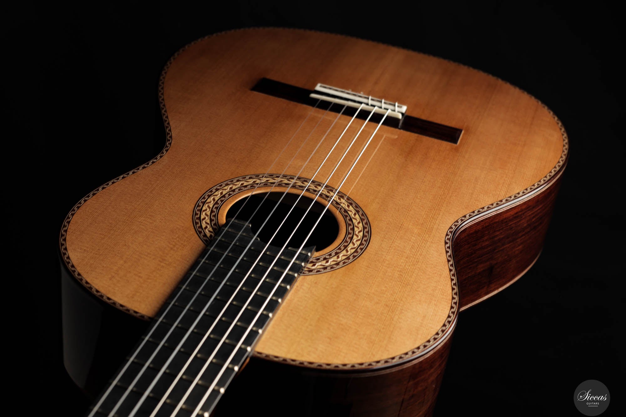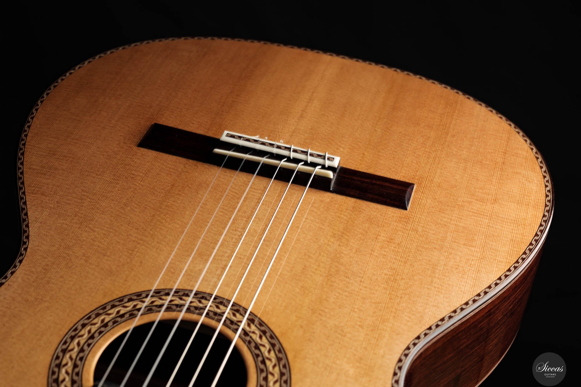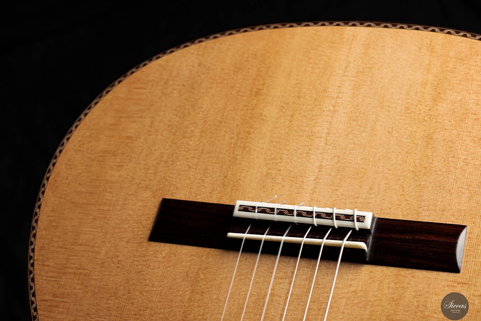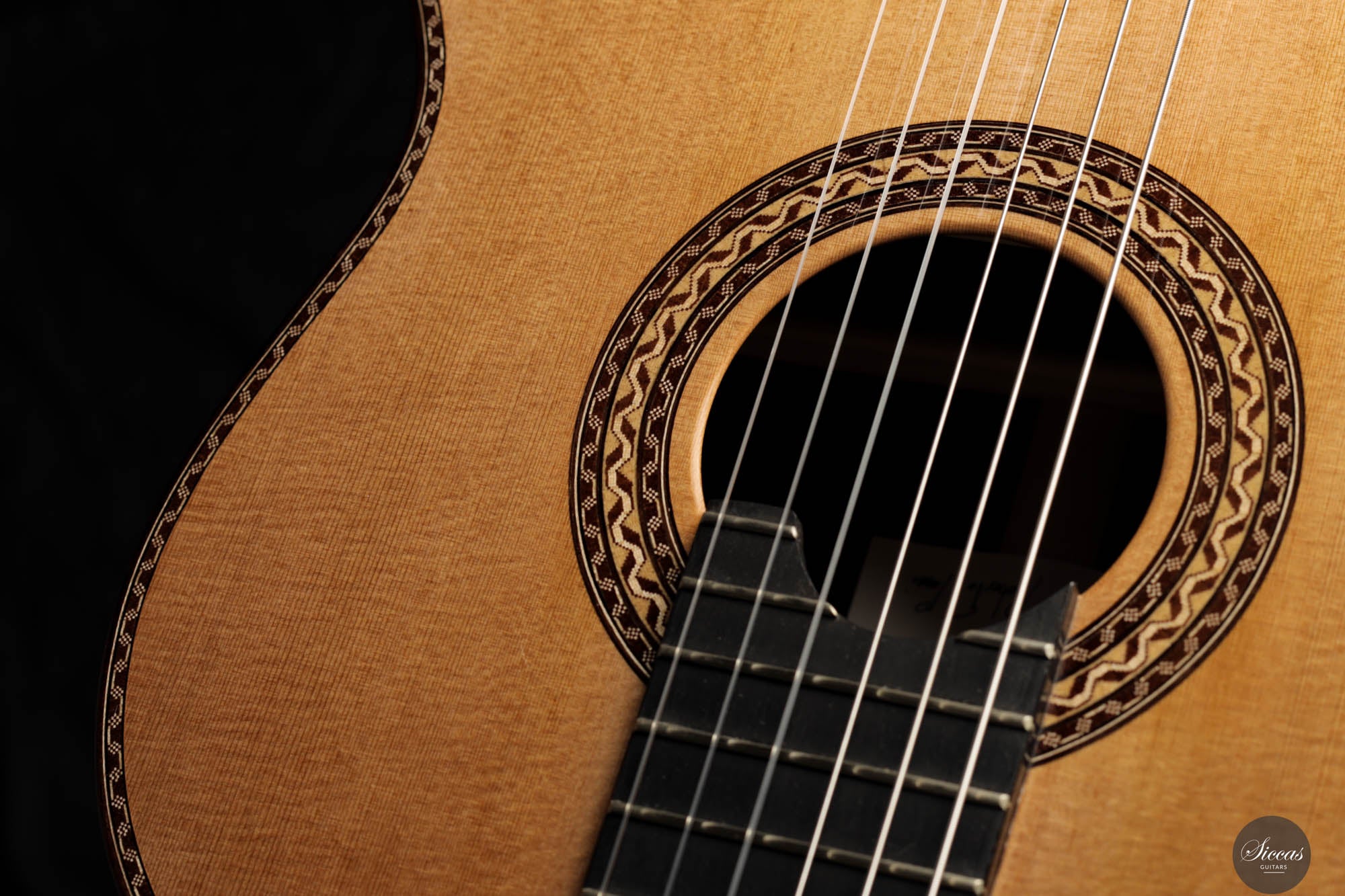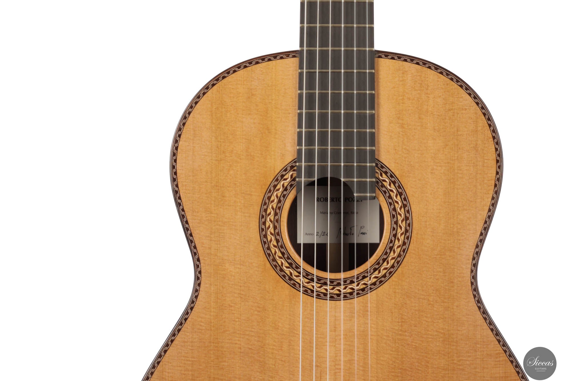Roberto Pozzi's brand-new guitar is a masterpiece of traditional craftsmanship, where attention to detail shines in every aspect of its construction. The guitar's design features striking decorative elements, each meticulously crafted to showcase Pozzi's dedication and skill. Acoustically, the instrument is exceptional, offering players silky smooth trebles that make each performance a delight. The basses and middle voices are expertly balanced, perfectly complementing the trebles to produce a harmonious and rich sound that resonates beautifully. This guitar not only demonstrates the artistry of its maker but also provides a superior musical experience, making it a cherished instrument for any guitarist.