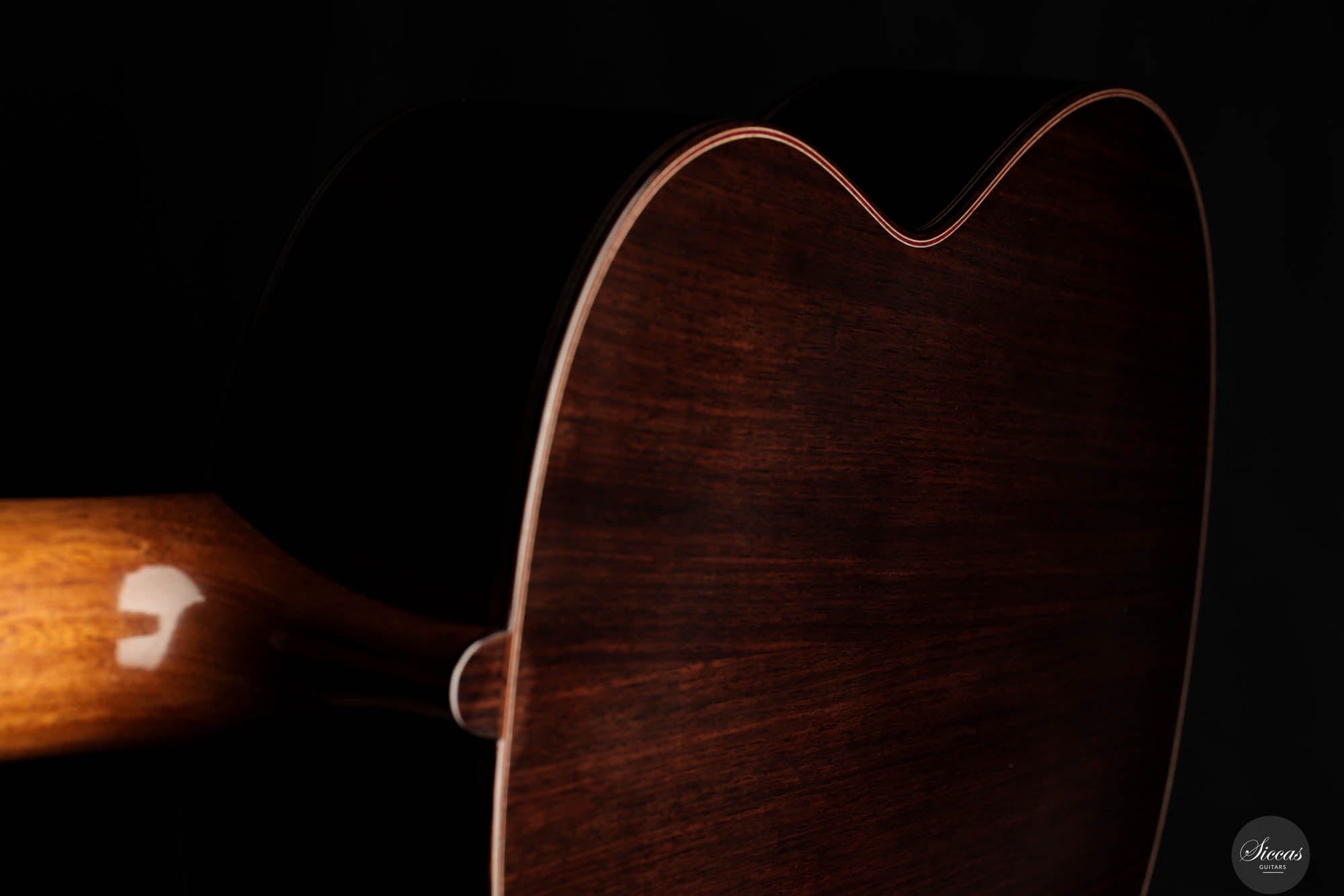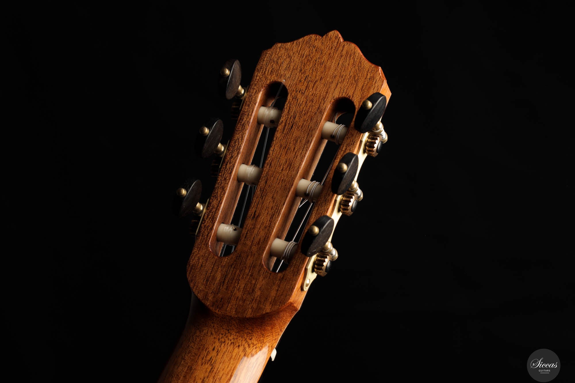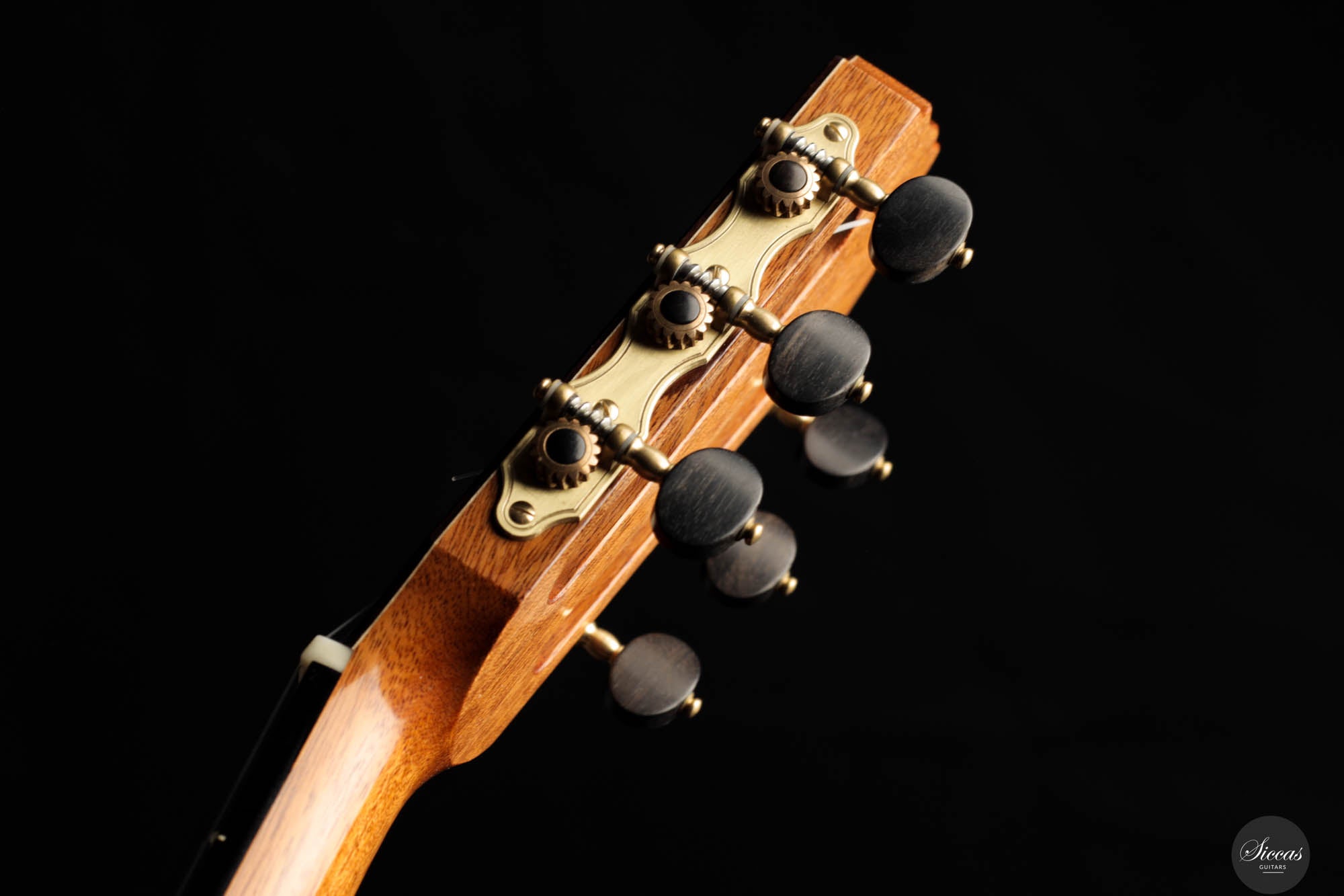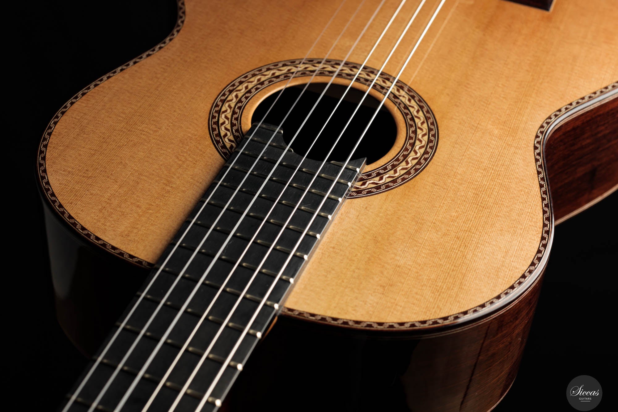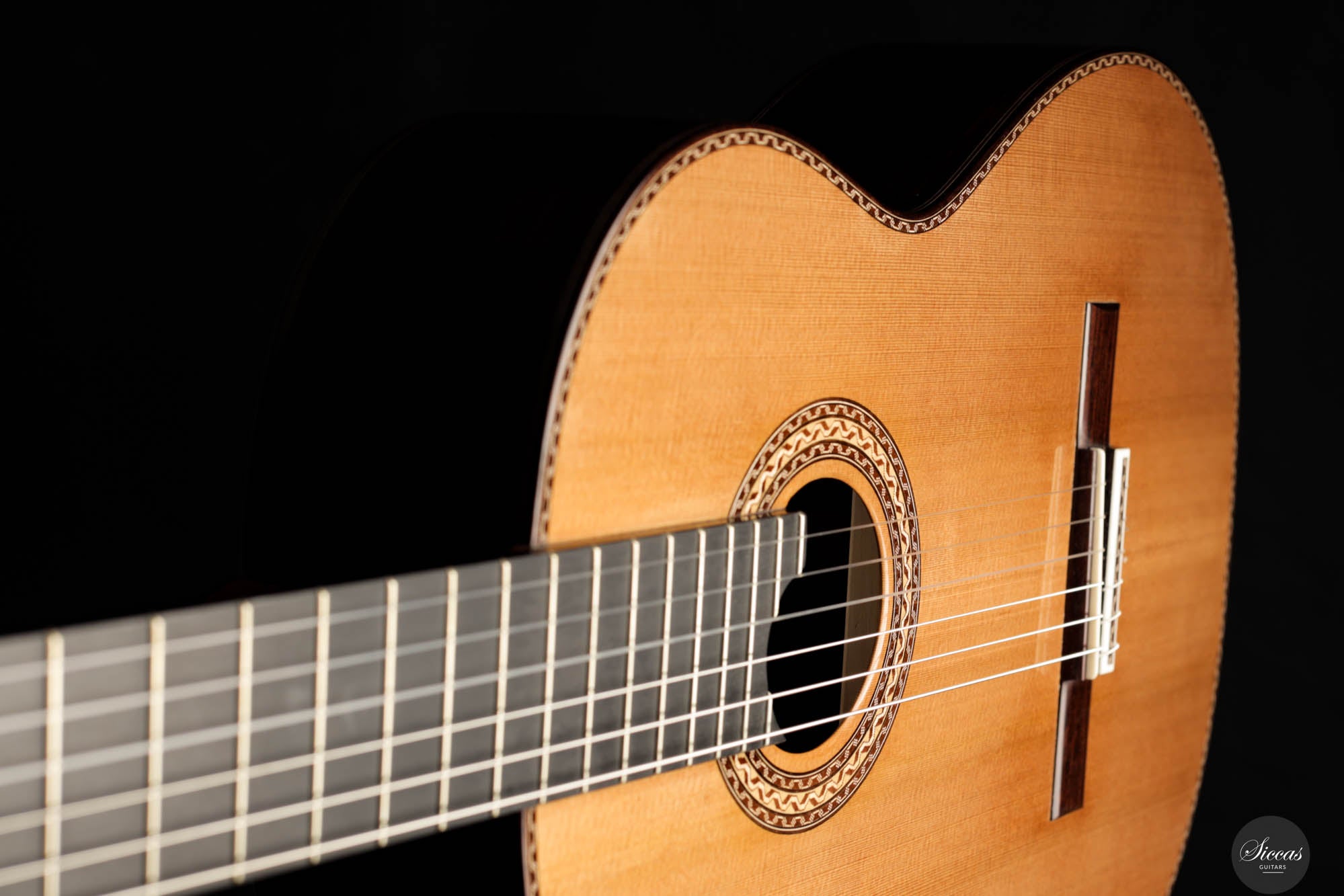 Roberto Pozzi's brand-new guitar is a masterpiece of traditional craftsmanship, where attention to detail shines in every aspect of its construction. The guitar's design features striking decorative elements, each meticulously crafted to showcase Pozzi's dedication and skill. Acoustically, the instrument is exceptional, offering players silky smooth trebles that make each performance a delight. The basses and middle voices are expertly balanced, perfectly complementing the trebles to produce a harmonious and rich sound that resonates beautifully. This guitar not only demonstrates the artistry of its maker but also provides a superior musical experience, making it a cherished instrument for any guitarist.