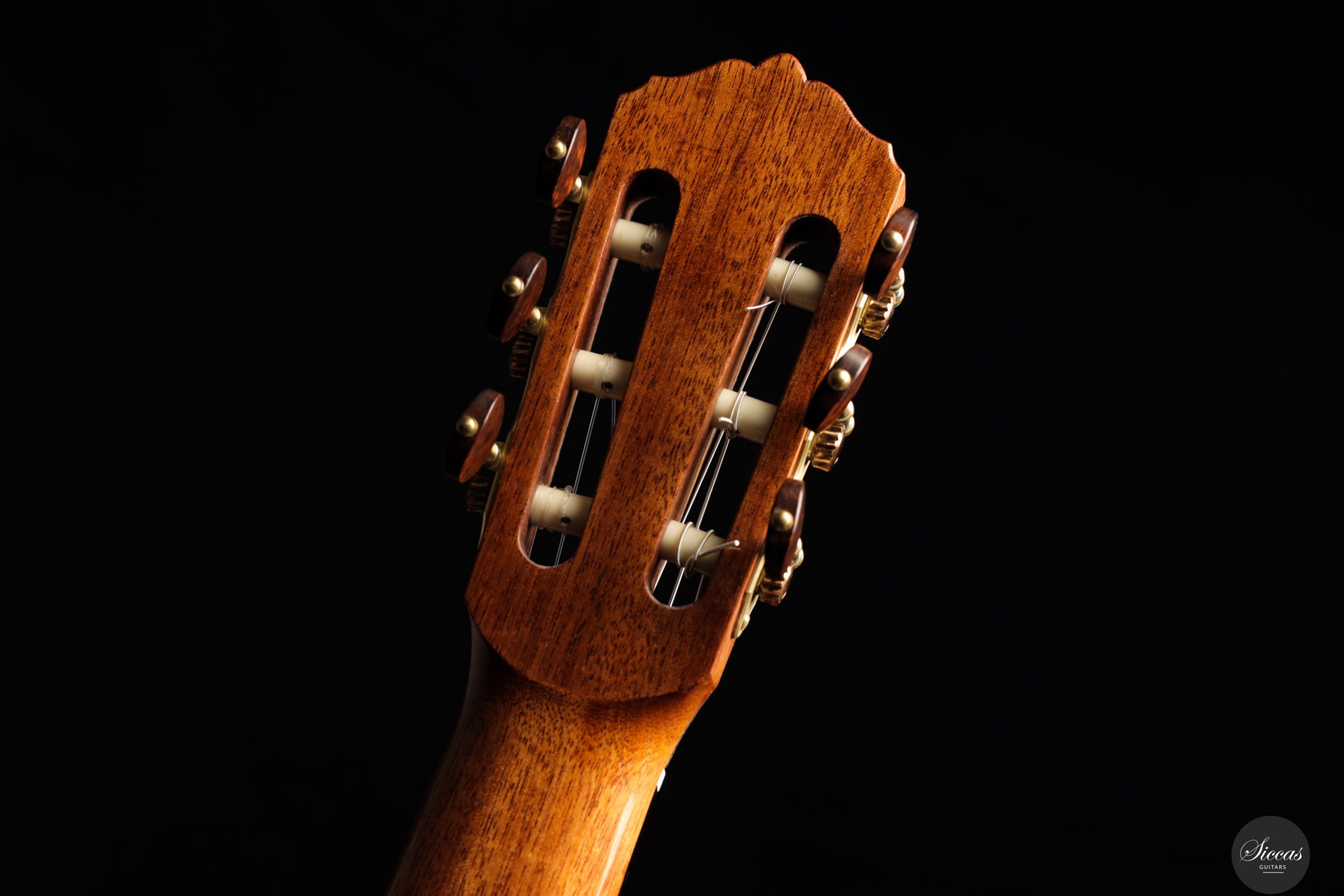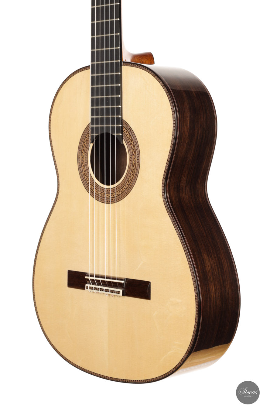 Diese Gitarre wurde im Rahmen der REG Limited Edition 2025 gefertigt und ist ein herausragendes Beispiel für Roberto Pozzis traditionelles Handwerk und seine klangliche Sensibilität. Sie ist mit einer minimalistischen siebenfächrigen Deckenbeleistung ohne zusätzliche Verstrebungen ausgestattet, die der Fichtendecke eine freie Schwingung und außergewöhnliche Ansprache verleiht. Der Hals besteht aus Mahagoni und trägt zur warmen Klangfarbe und Stabilität bei.