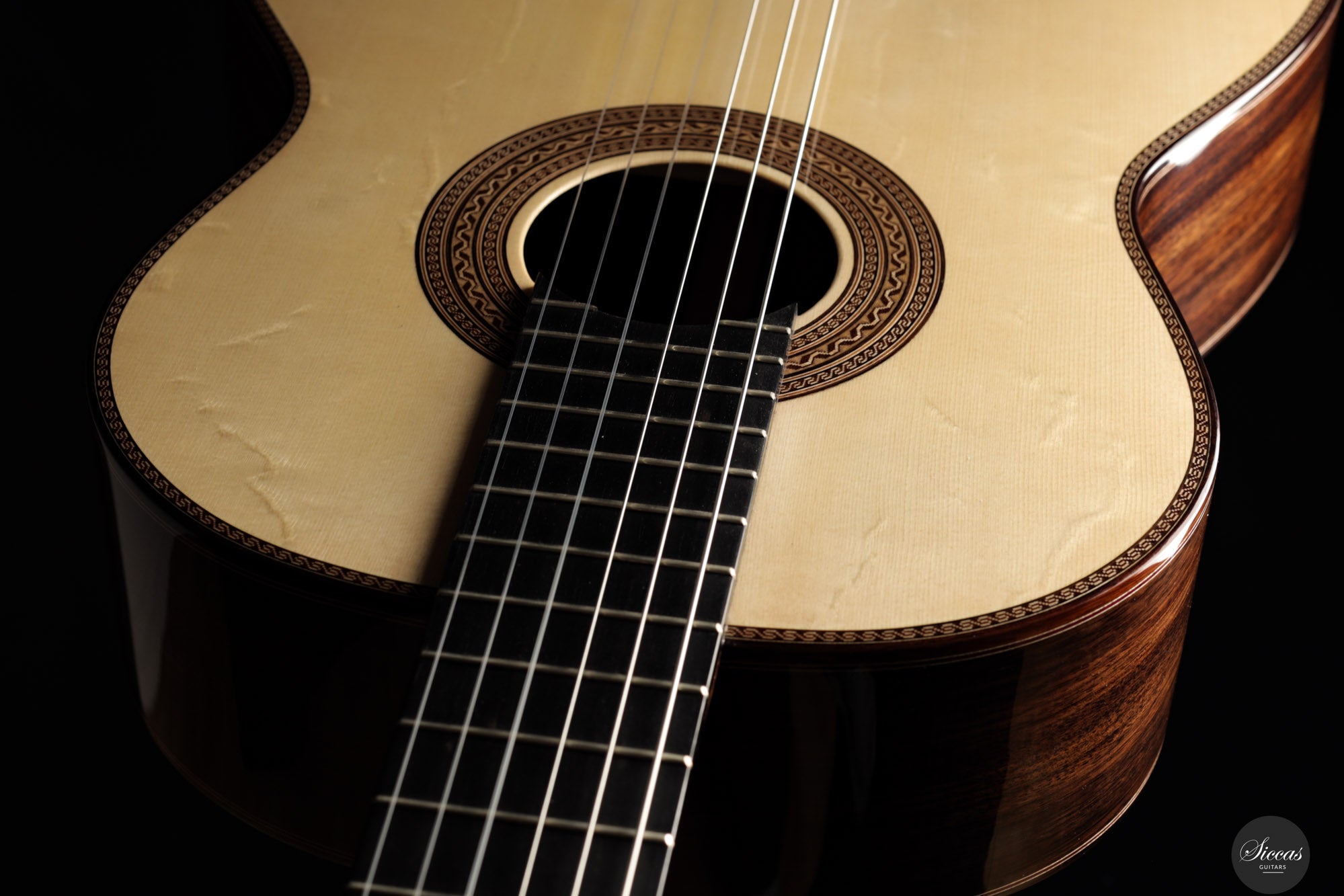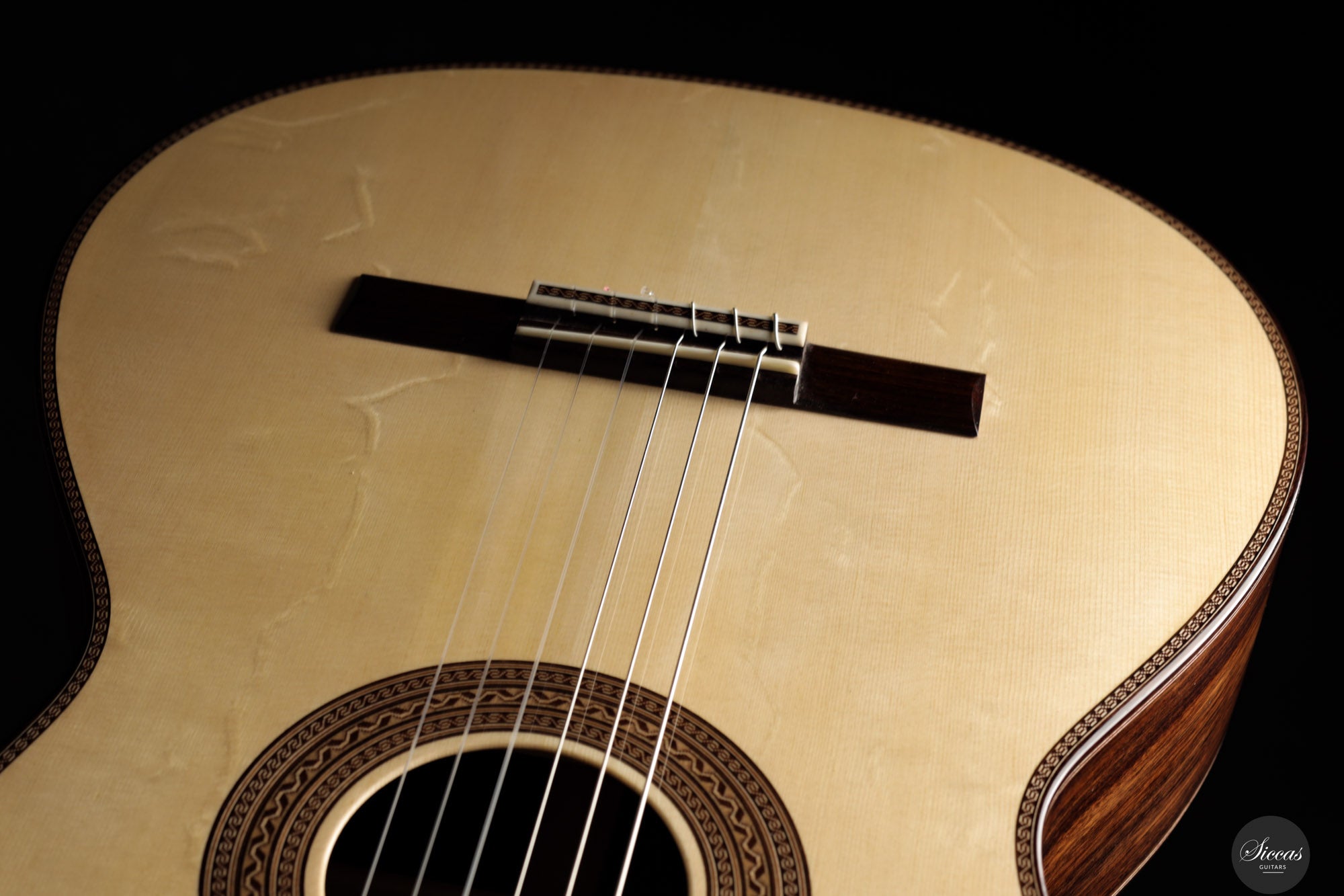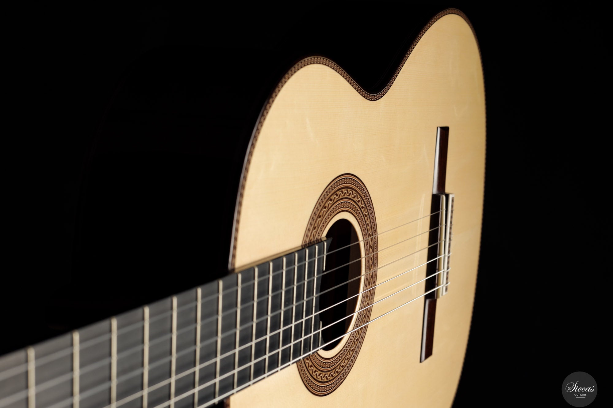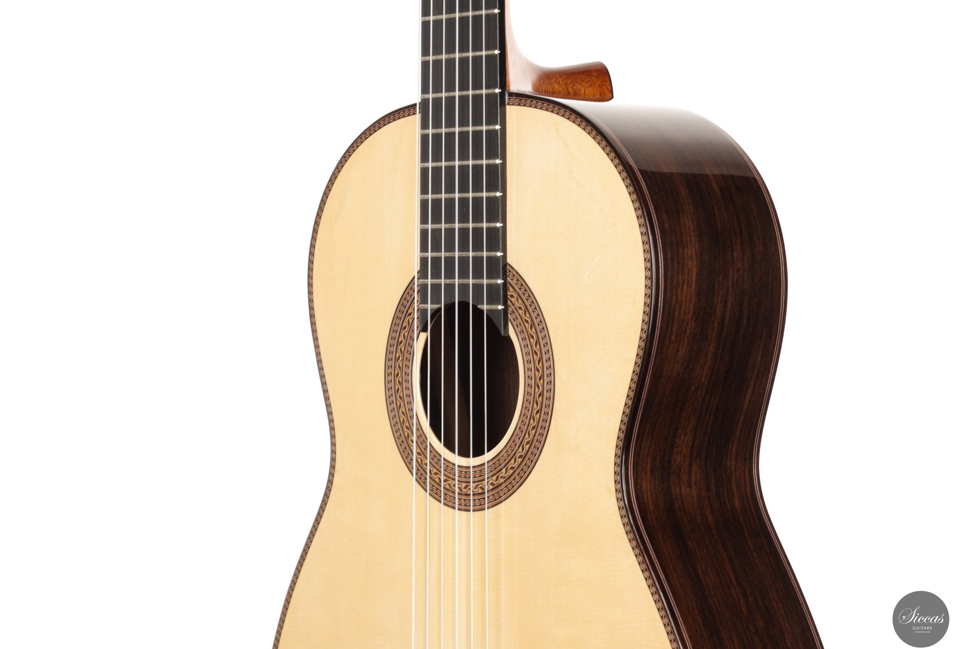 Besonders auffällig ist die charakteristische Rosette mit dreidimensionaler Wirkung, die in einem feinen Dialog mit der kunstvollen Einlegearbeit steht. Diese dekorativen Elemente verleihen der Gitarre eine klare Identität, ohne aufdringlich zu wirken. Verarbeitet wurden ausschließlich Hölzer von sehr hoher Qualität, darunter Palisander für Boden und Zargen. Das Instrument ist mit traditionellem Schellack-Finish versehen.