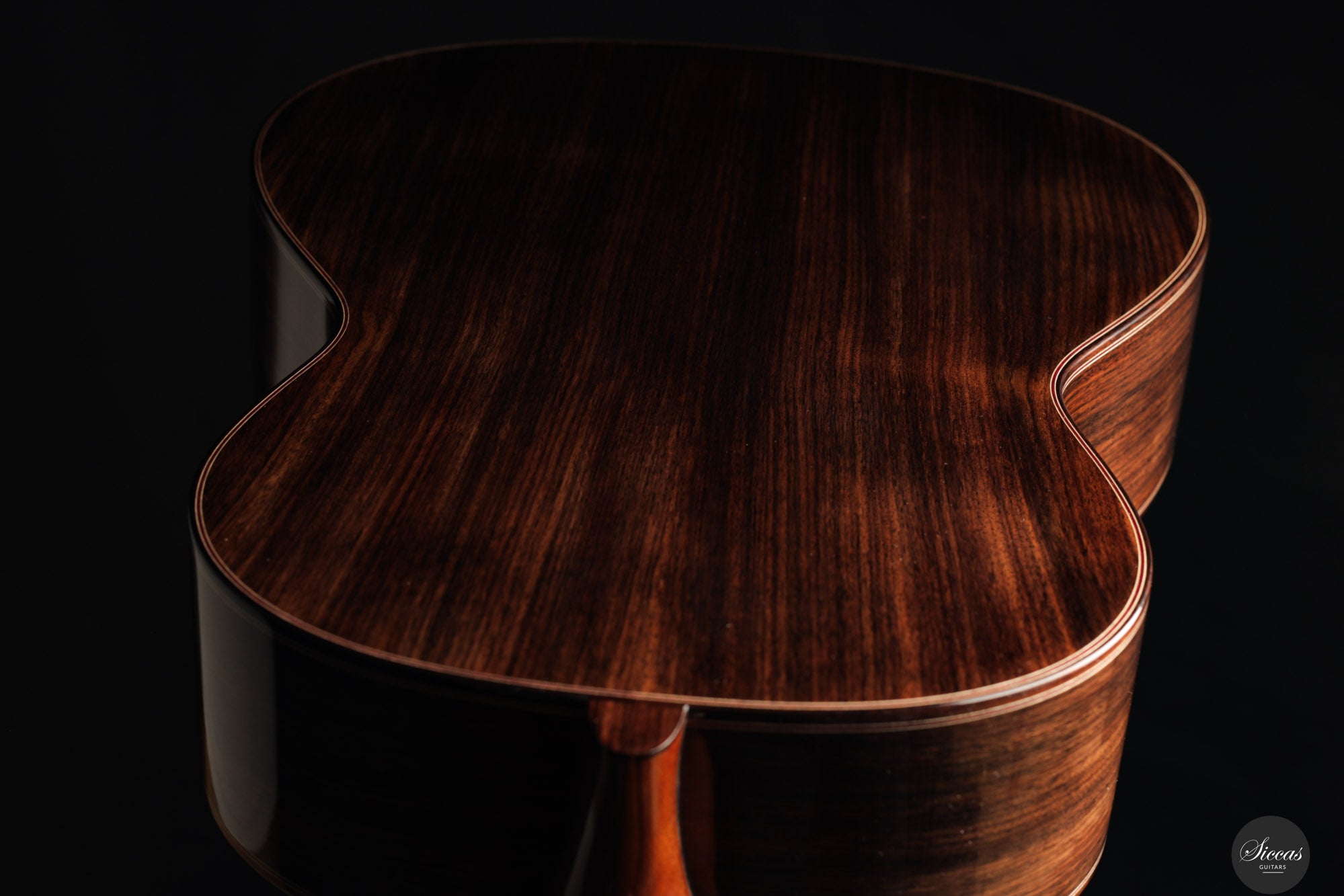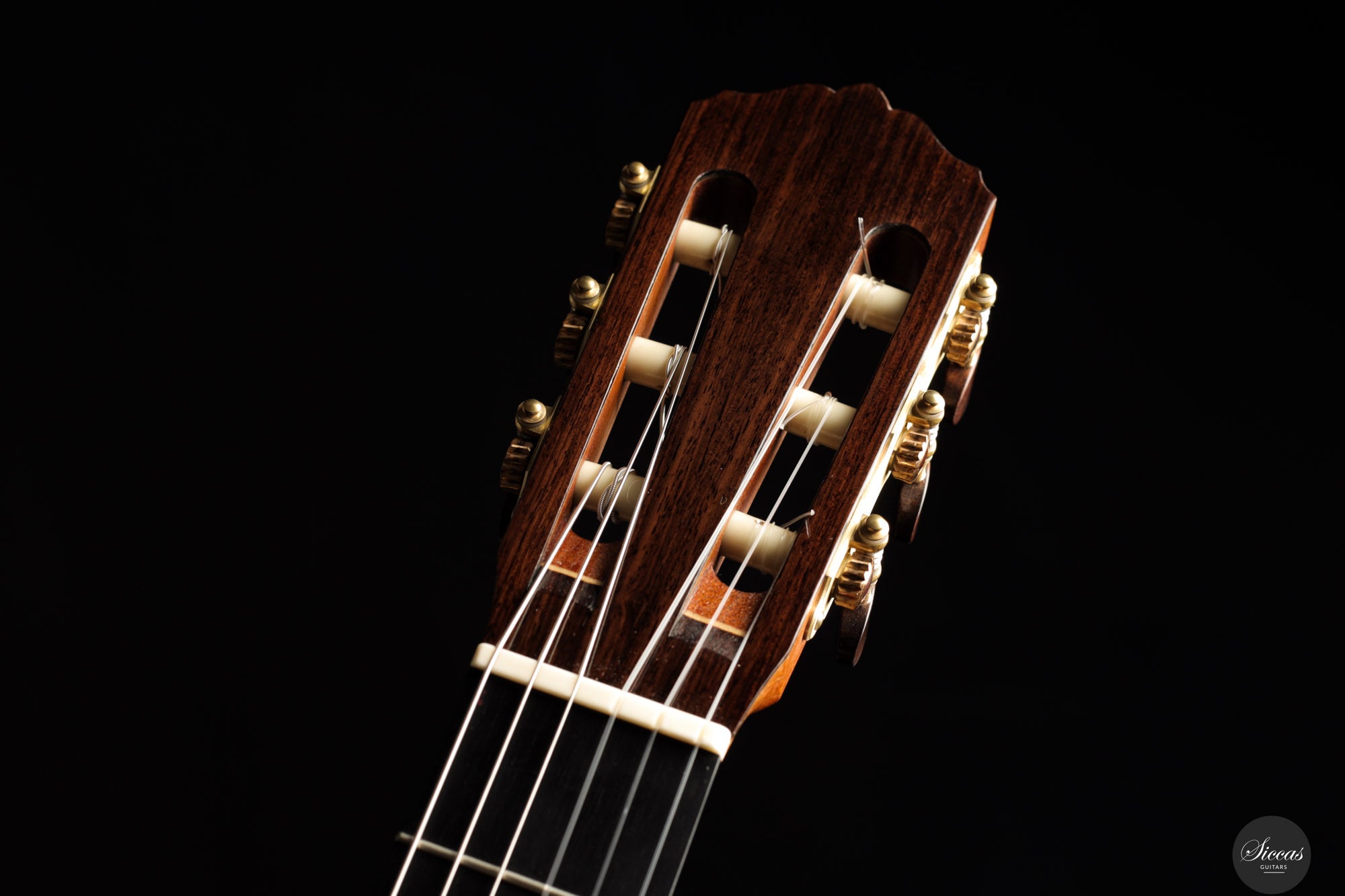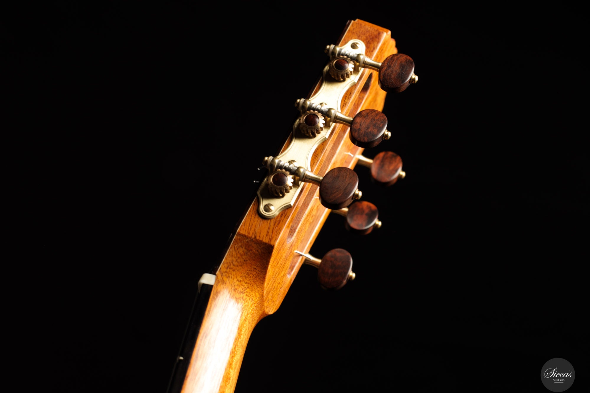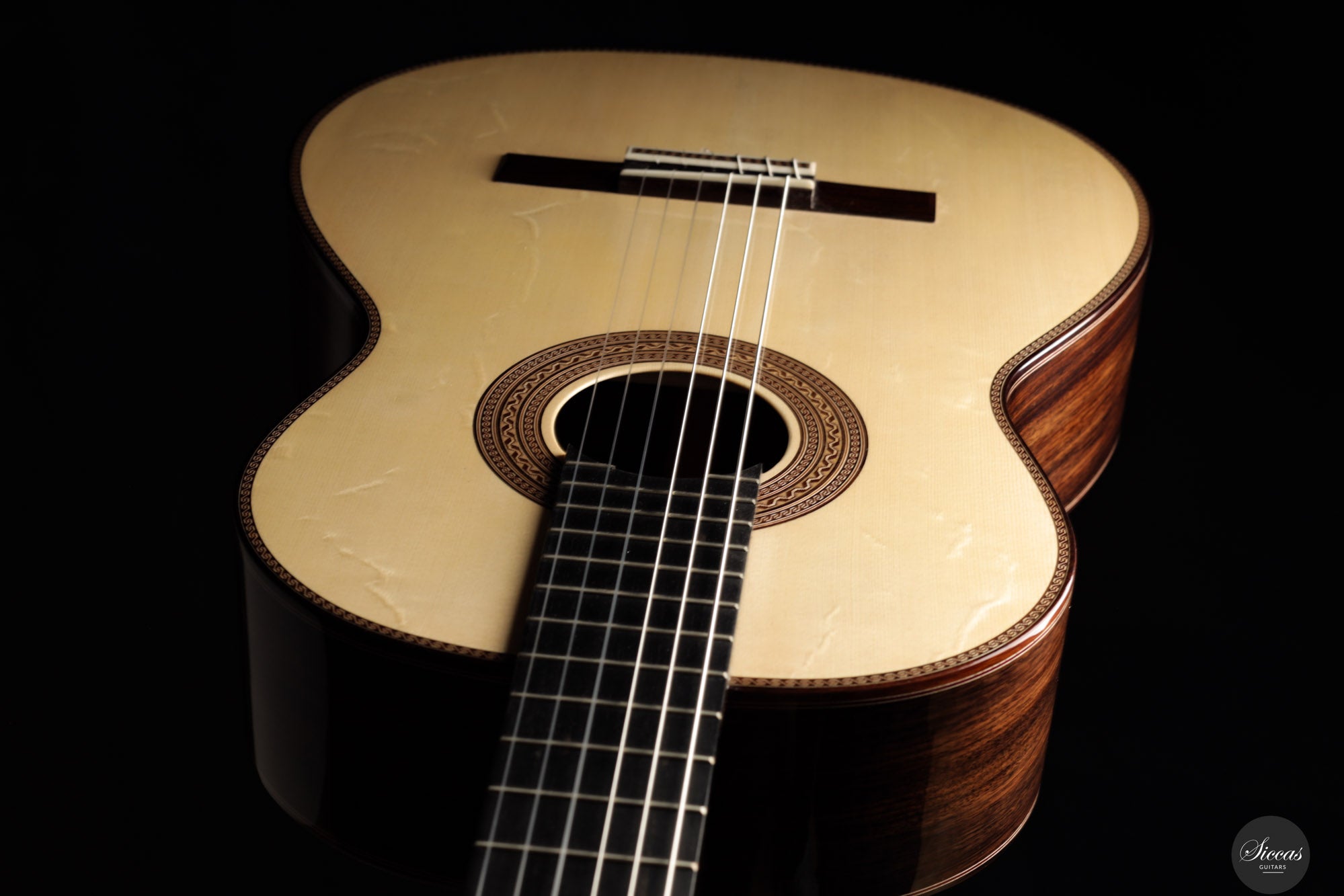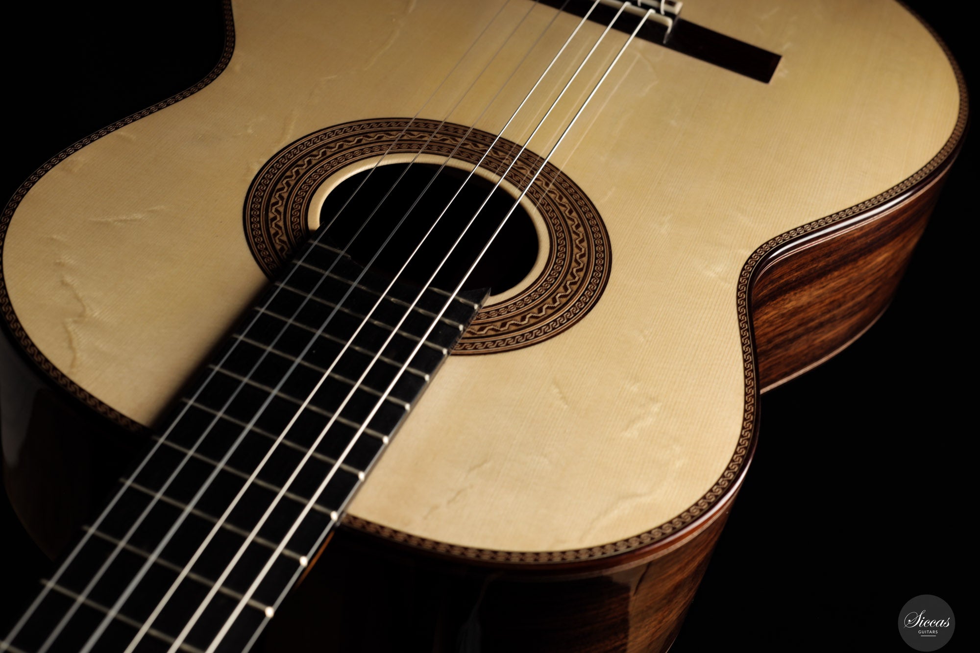 Besonders auffällig ist die charakteristische Rosette mit dreidimensionaler Wirkung, die in einem feinen Dialog mit der kunstvollen Einlegearbeit steht. Diese dekorativen Elemente verleihen der Gitarre eine klare Identität, ohne aufdringlich zu wirken. Verarbeitet wurden ausschließlich Hölzer von sehr hoher Qualität, darunter Palisander für Boden und Zargen. Das Instrument ist mit traditionellem Schellack-Finish versehen.